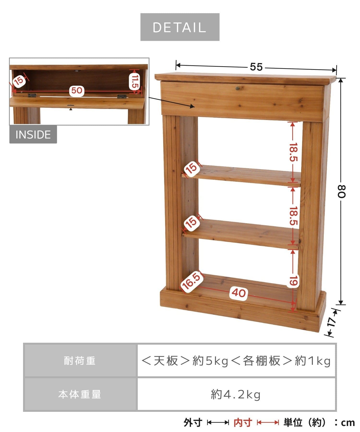 サイズ - 0 約高さ80×幅55×奥行き17cm <棚上段内寸>約高さ18.5×幅40×奥行き15cm
