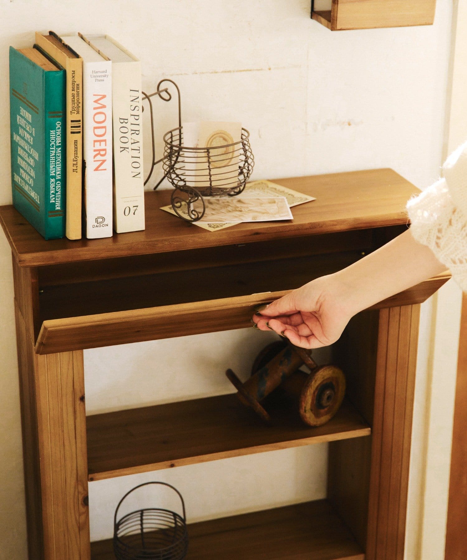 ●天板の上には写真立てやキャンドル、季節の花々をディスプレイして、お気に入りのコーナー作りに。