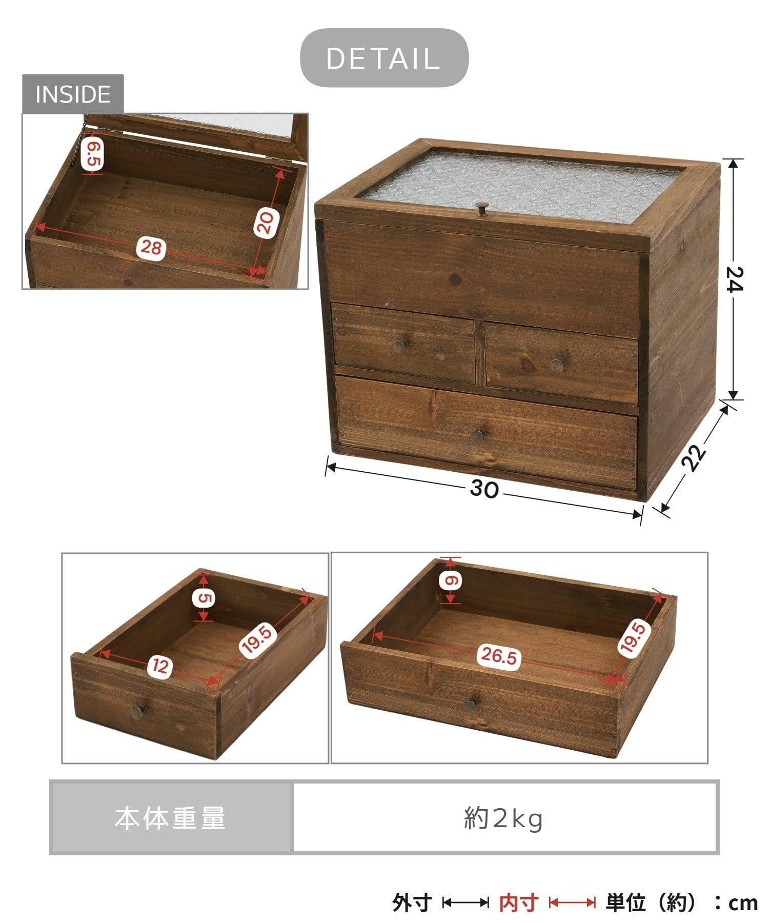 <引き出し大>約高さ6×幅26.5×奥行き19.5cm
