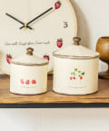 アルブル2段ディスプレイキャビネットの中にいちご小物入れ大小といちご耐熱ガラスマグと一緒に飾っています。