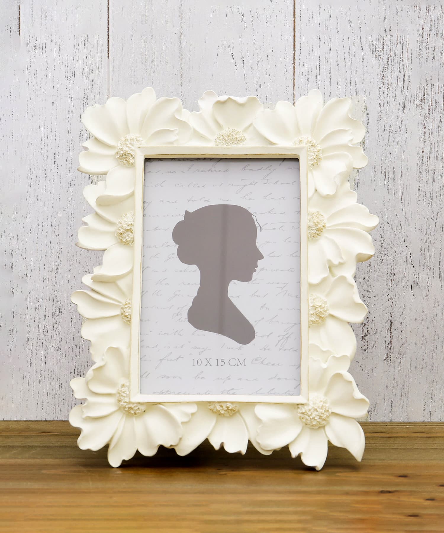 ●大きな花で縁取られ、エレガントな佇まいのフォトフレームです。