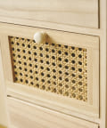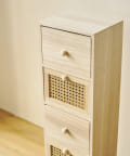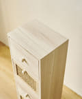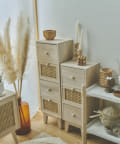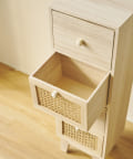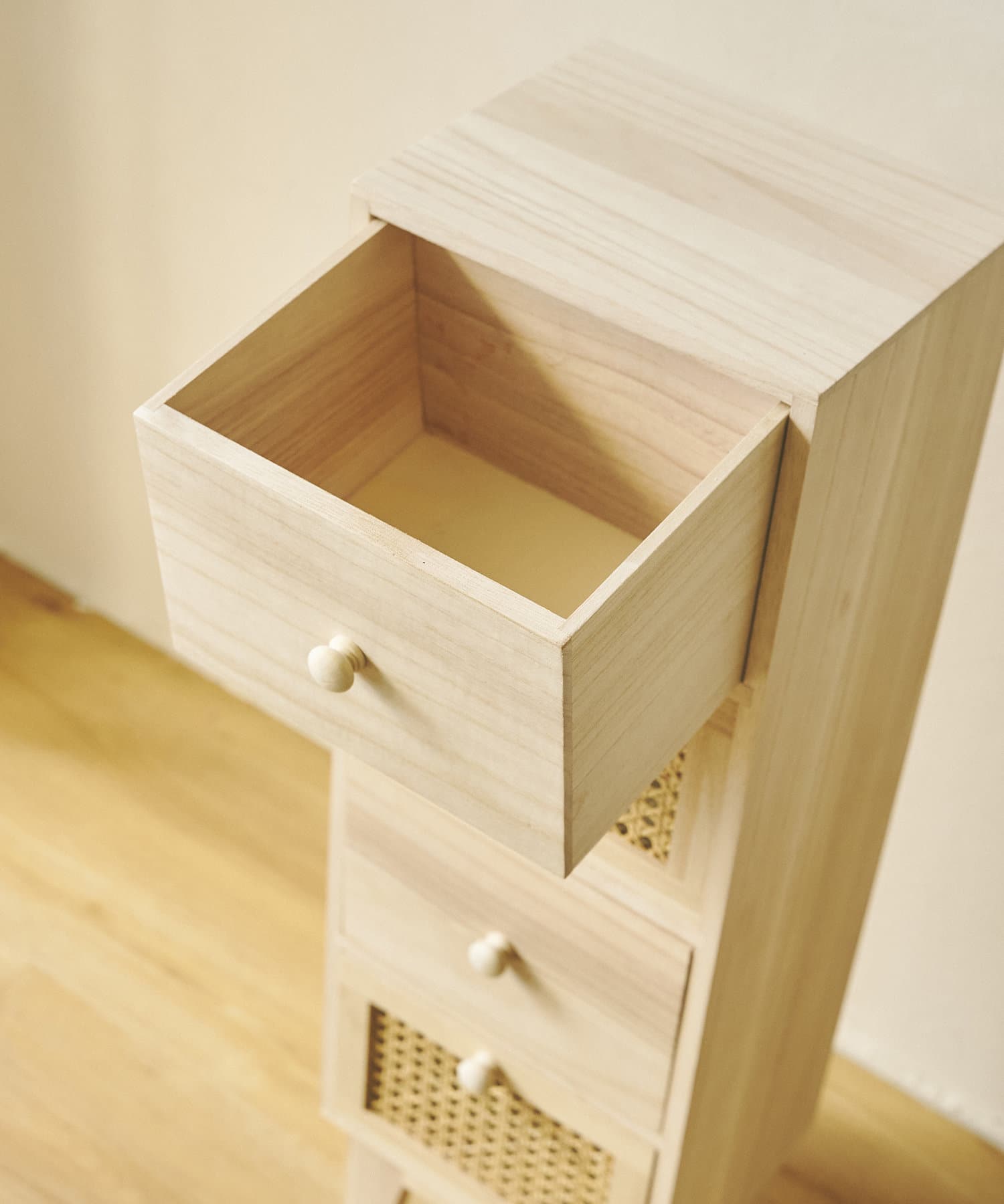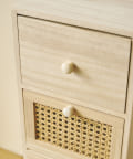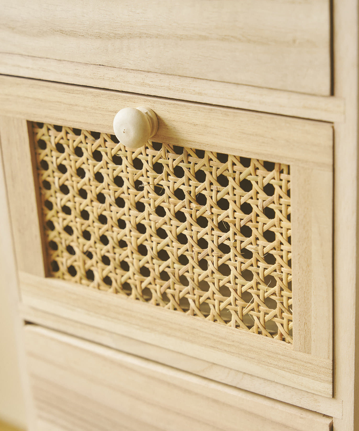 明るいカラーのウッドとラタンの引き出し面がナチュラルキレイめデザイン。