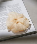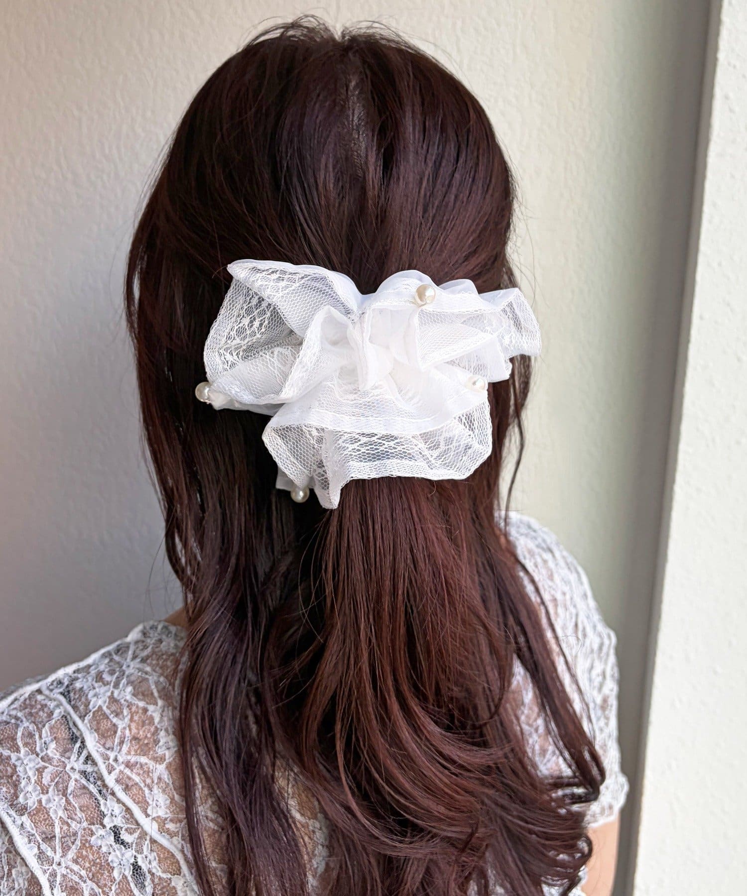 繊細なレース素材にパールをあしらった上品でフェミニンなシュシュ