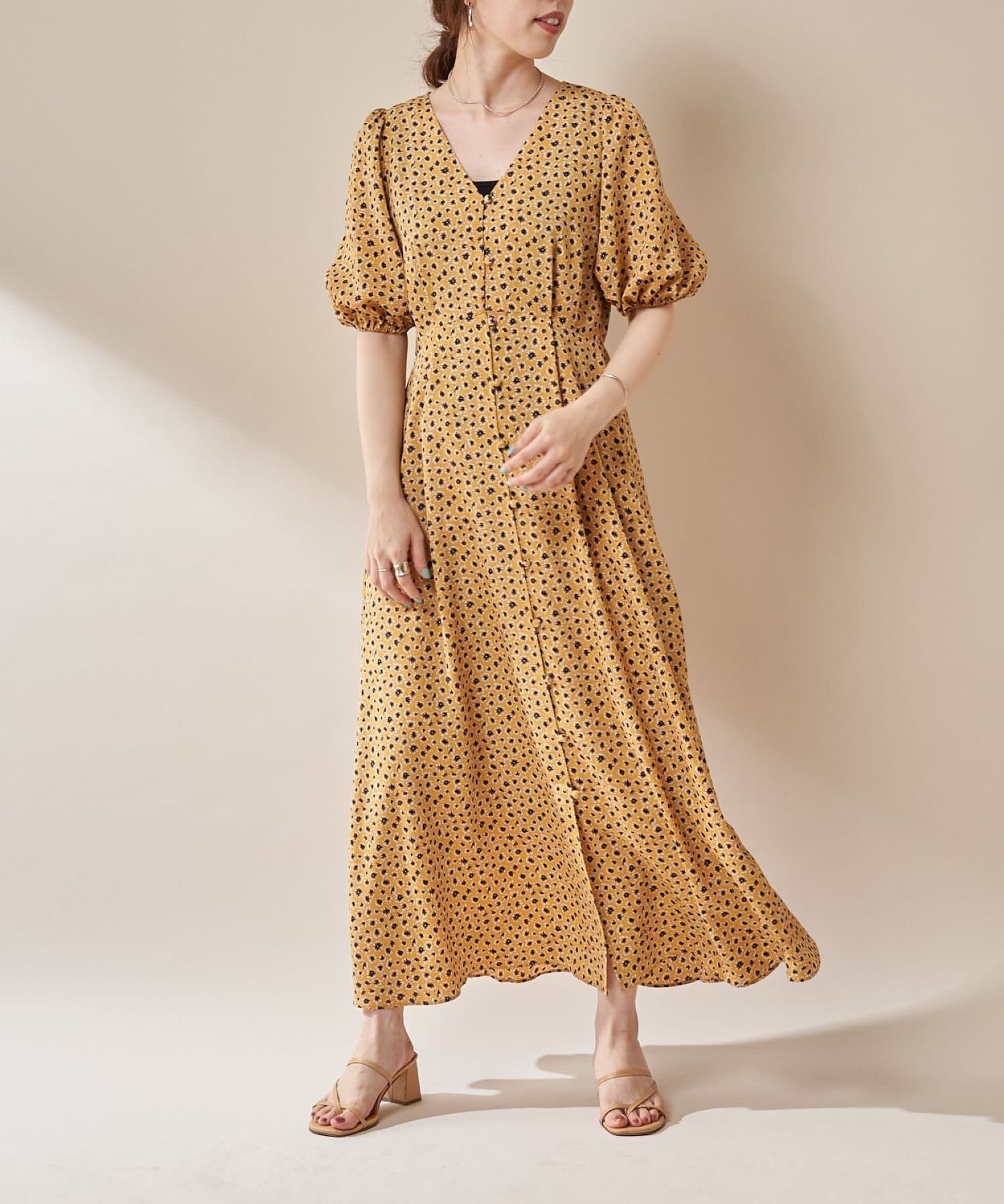袖はパフスリーブで可愛らしく、丈感はロング、シルエットはフレアなので