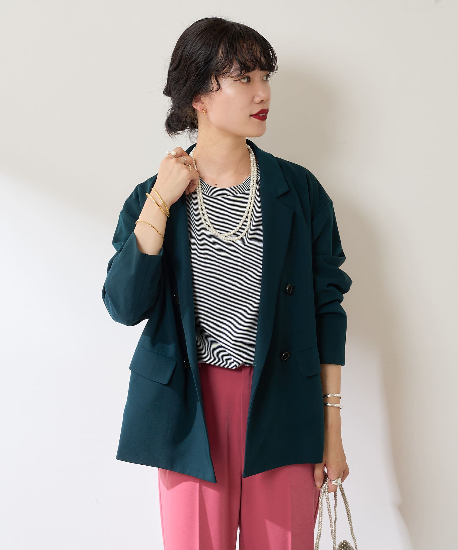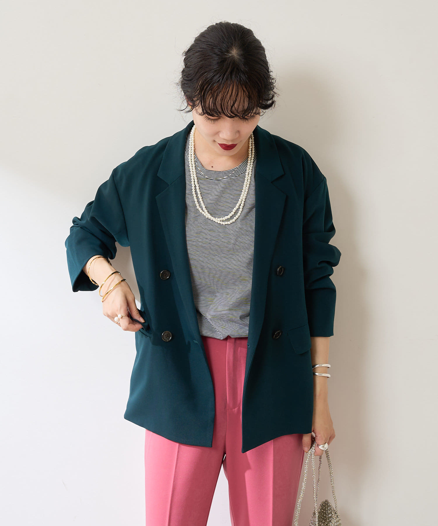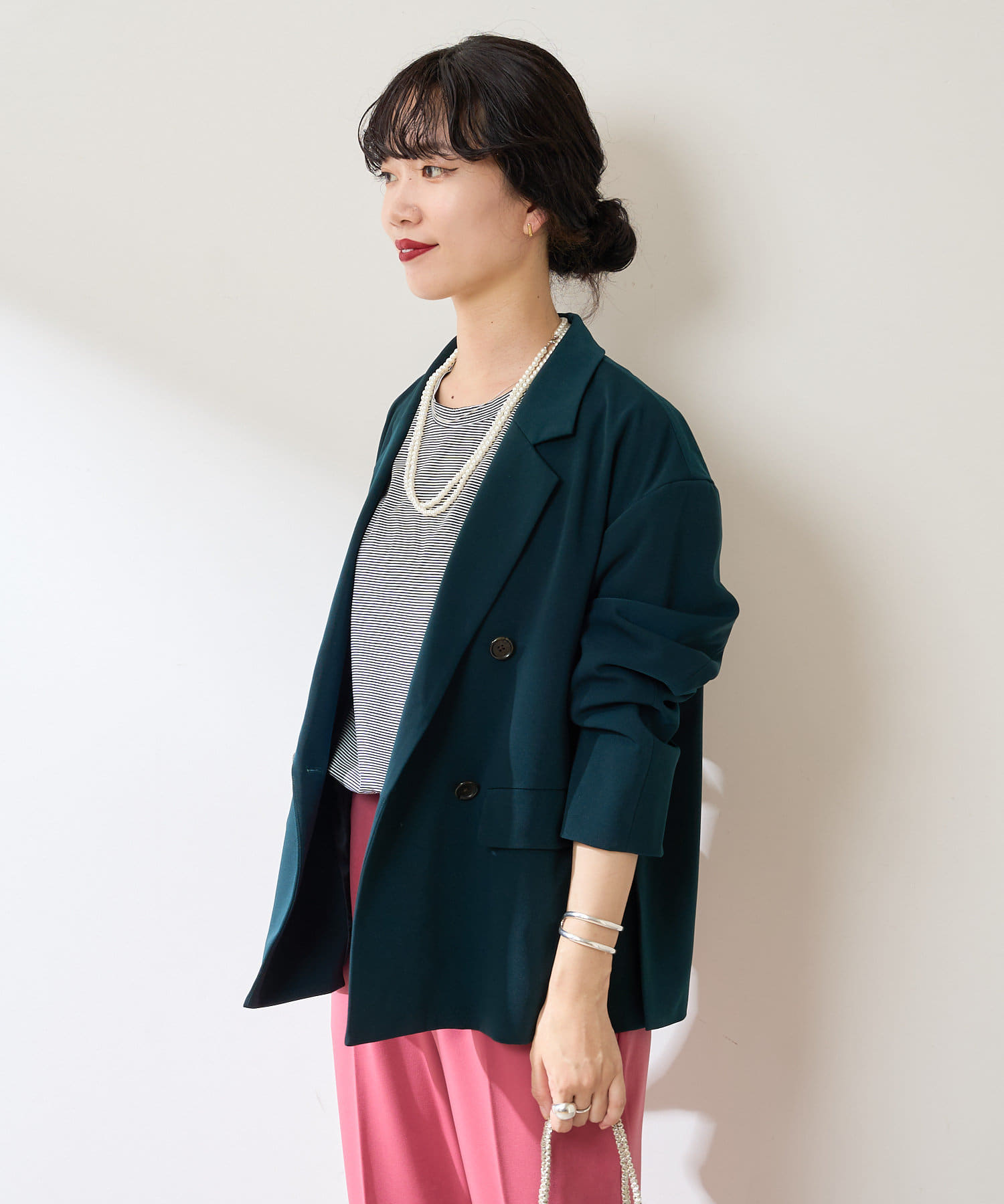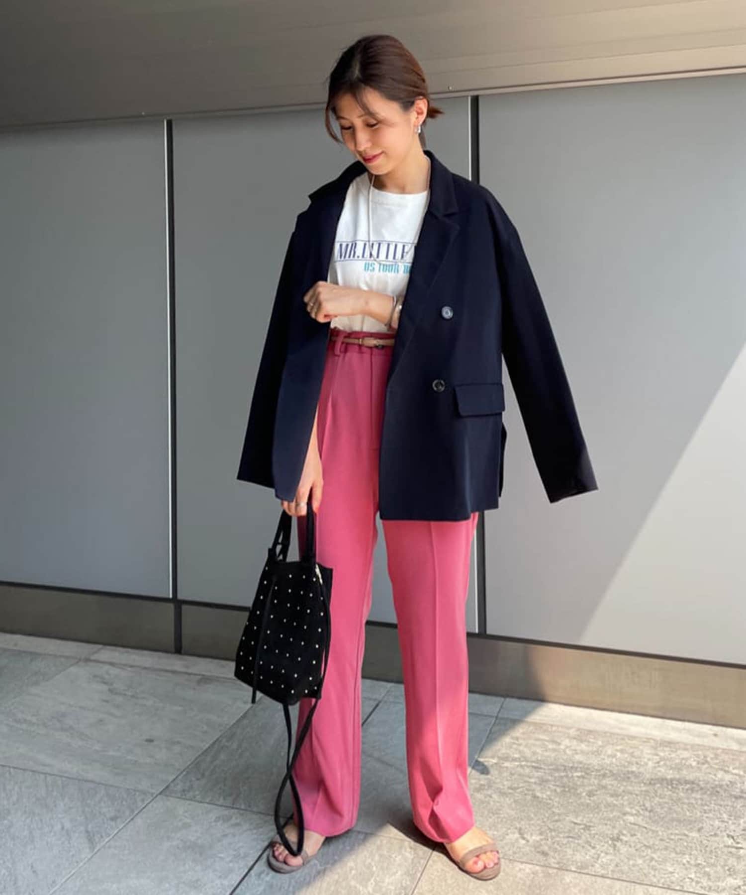異なる色同士で組み合わせて、配色のセットアップとして着るのもおすすめ◎