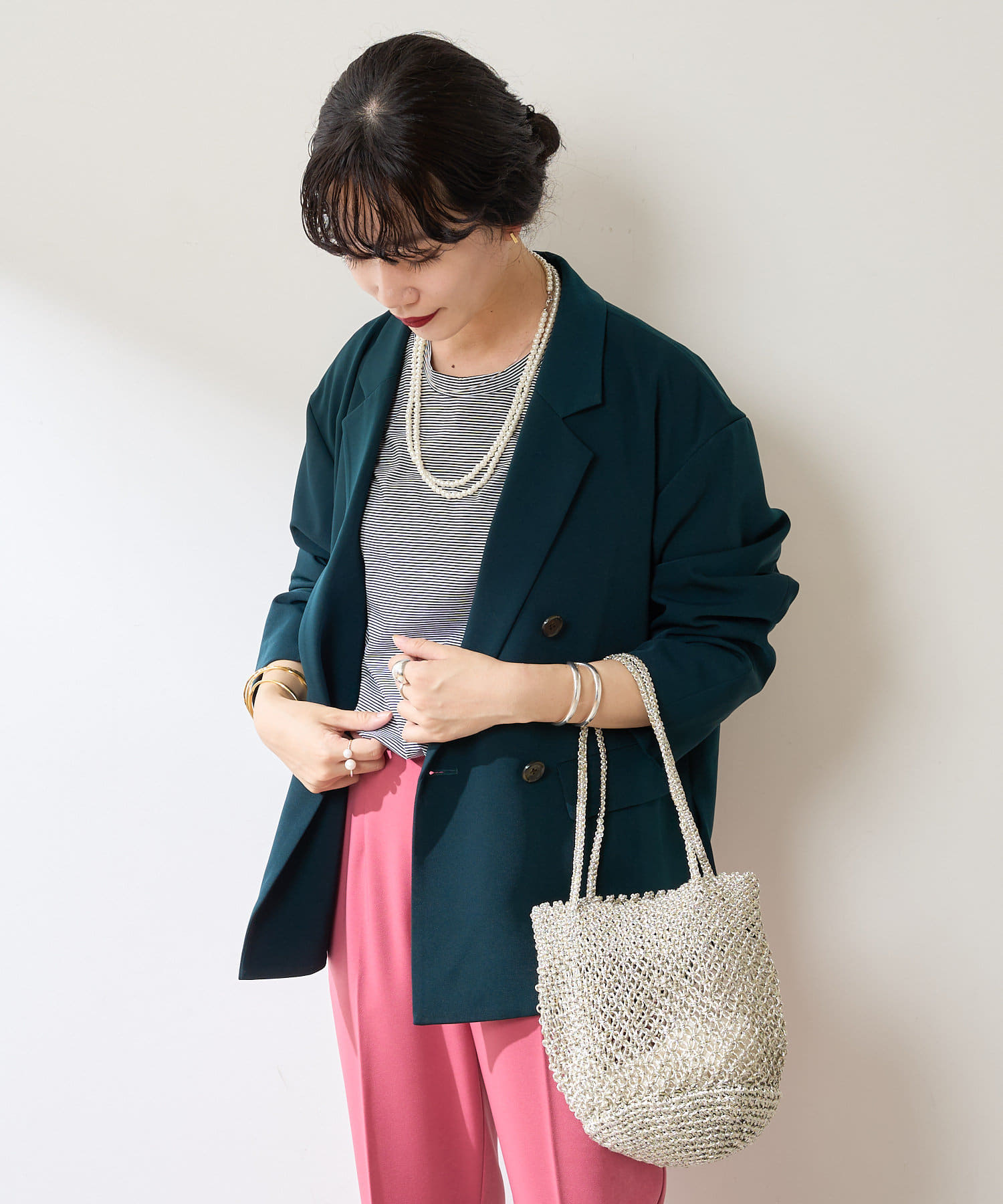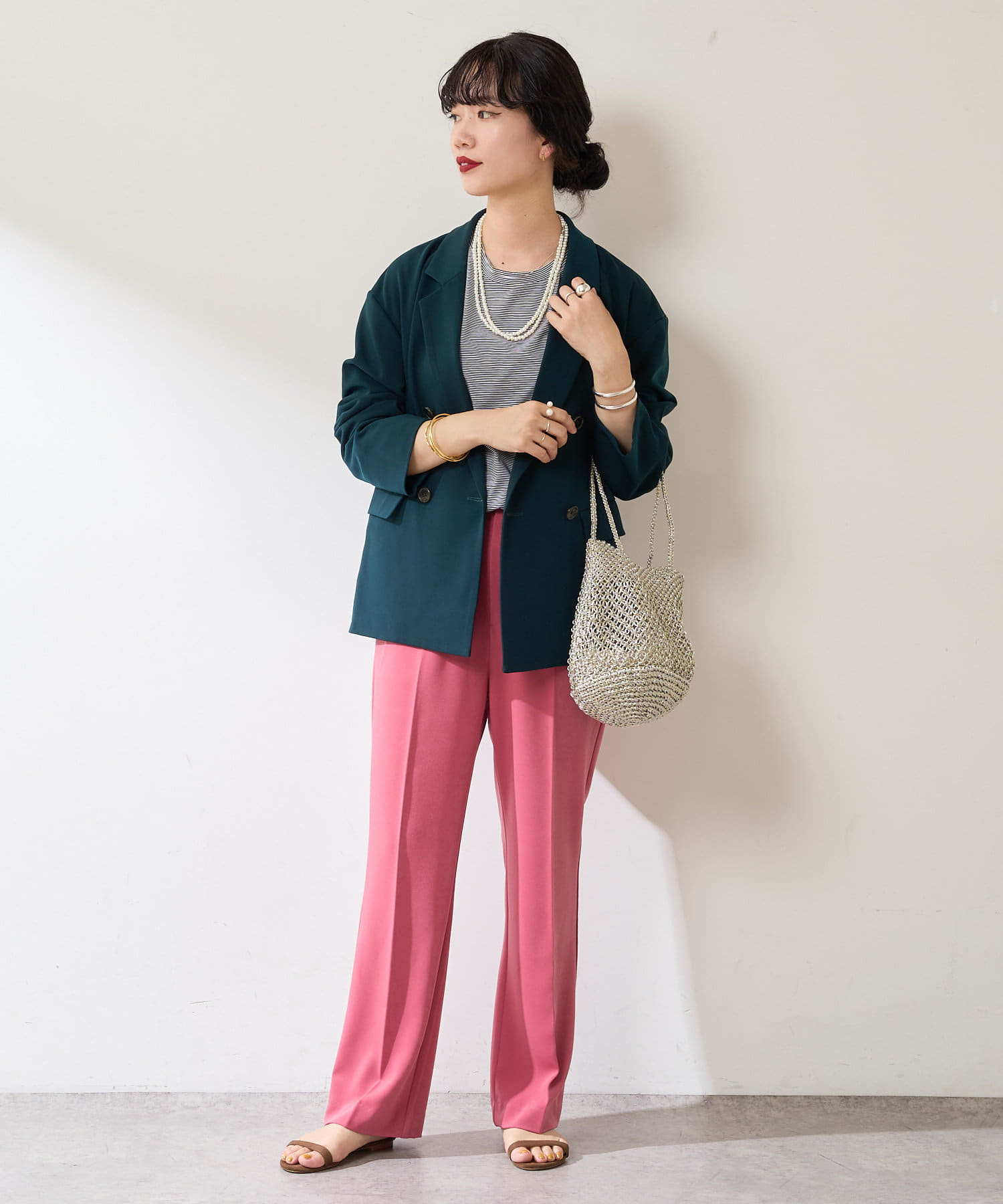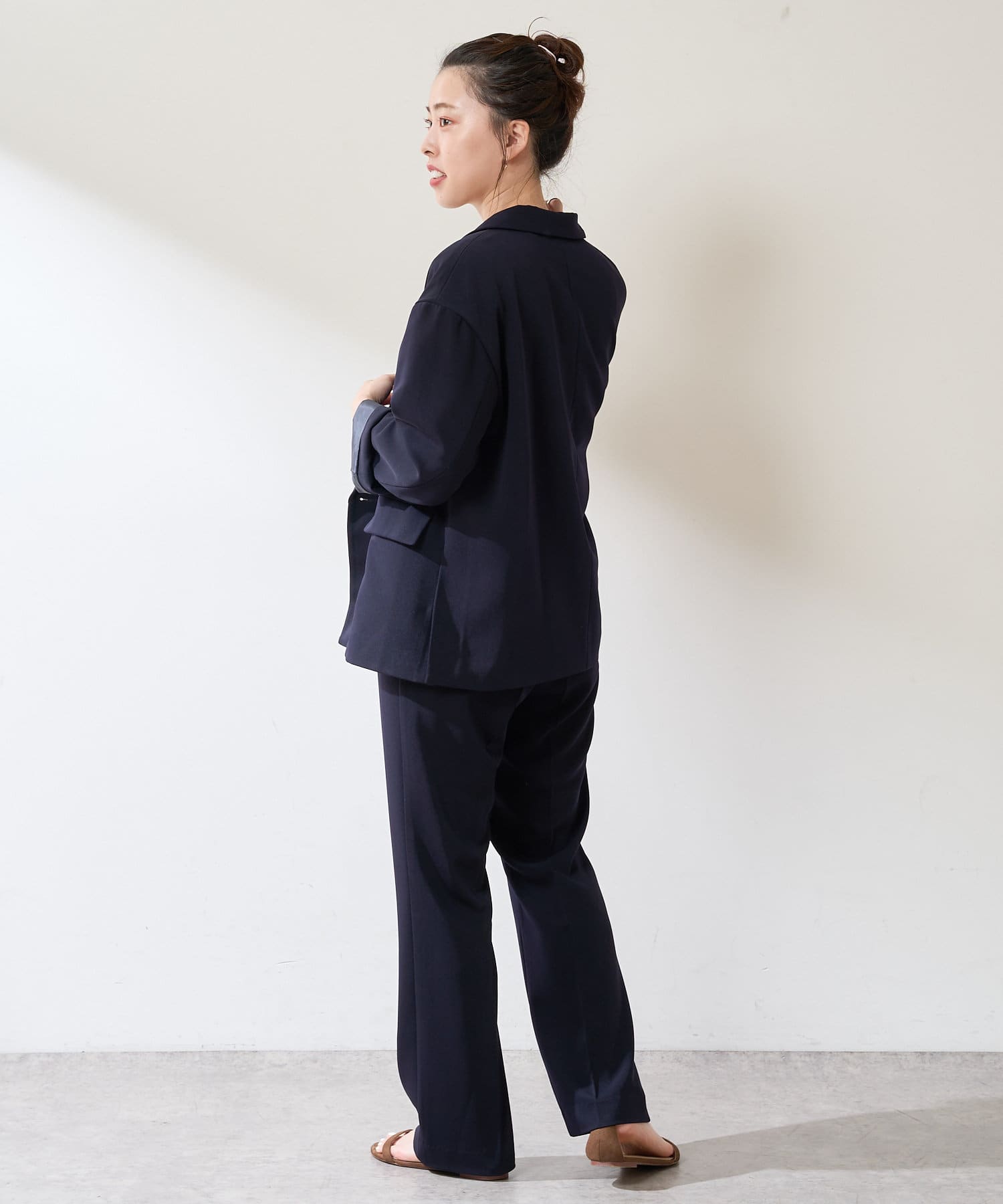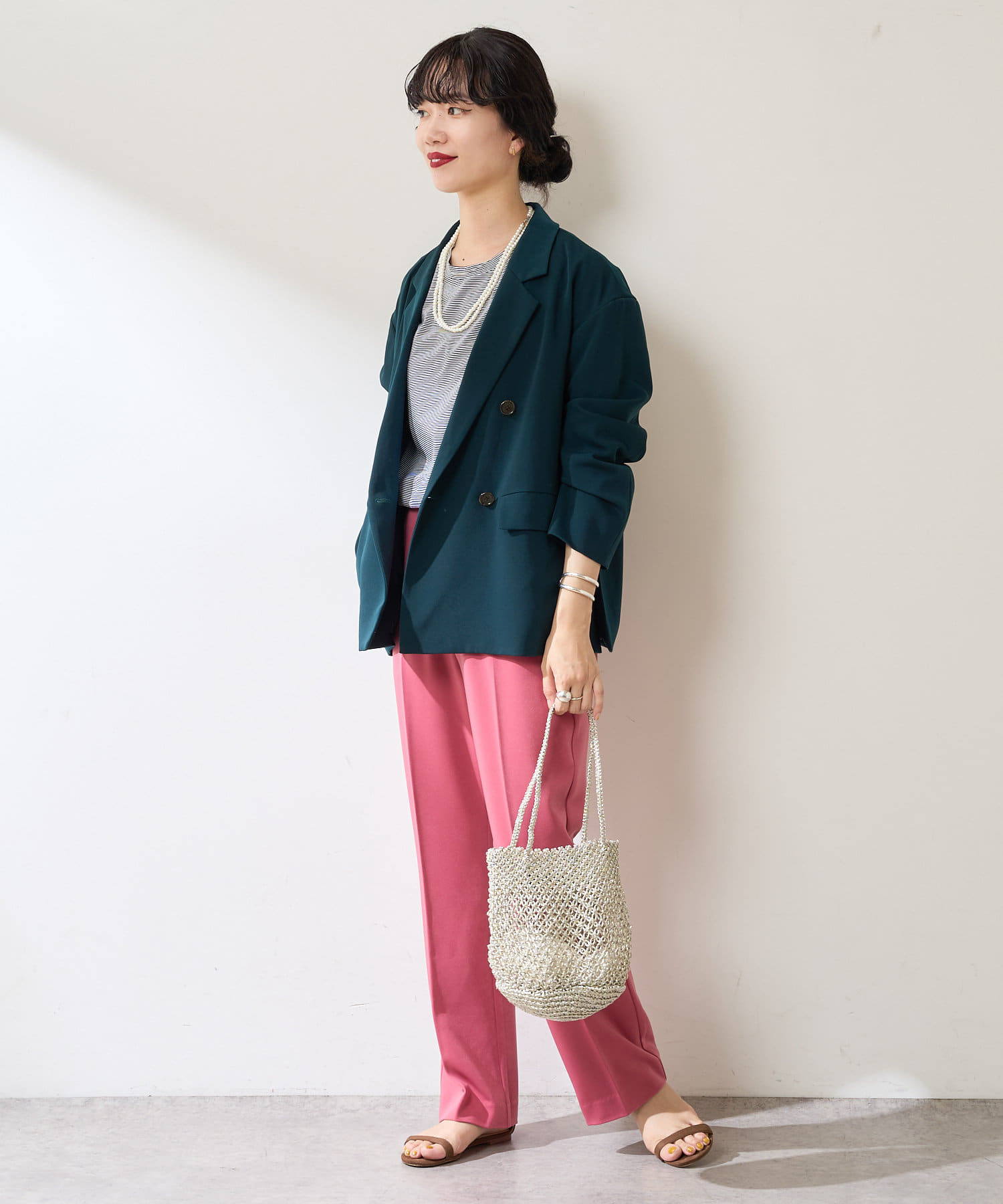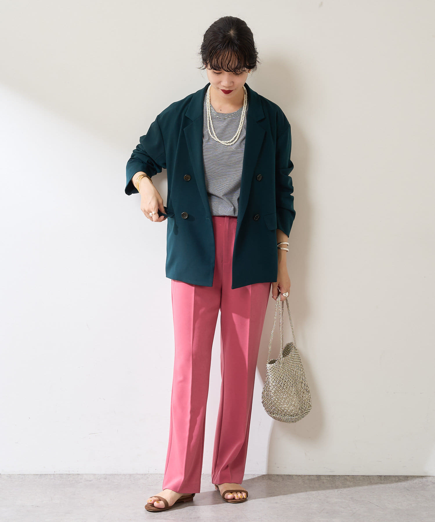 異なる色同士で組み合わせて、配色のセットアップとして着るのもおすすめ◎