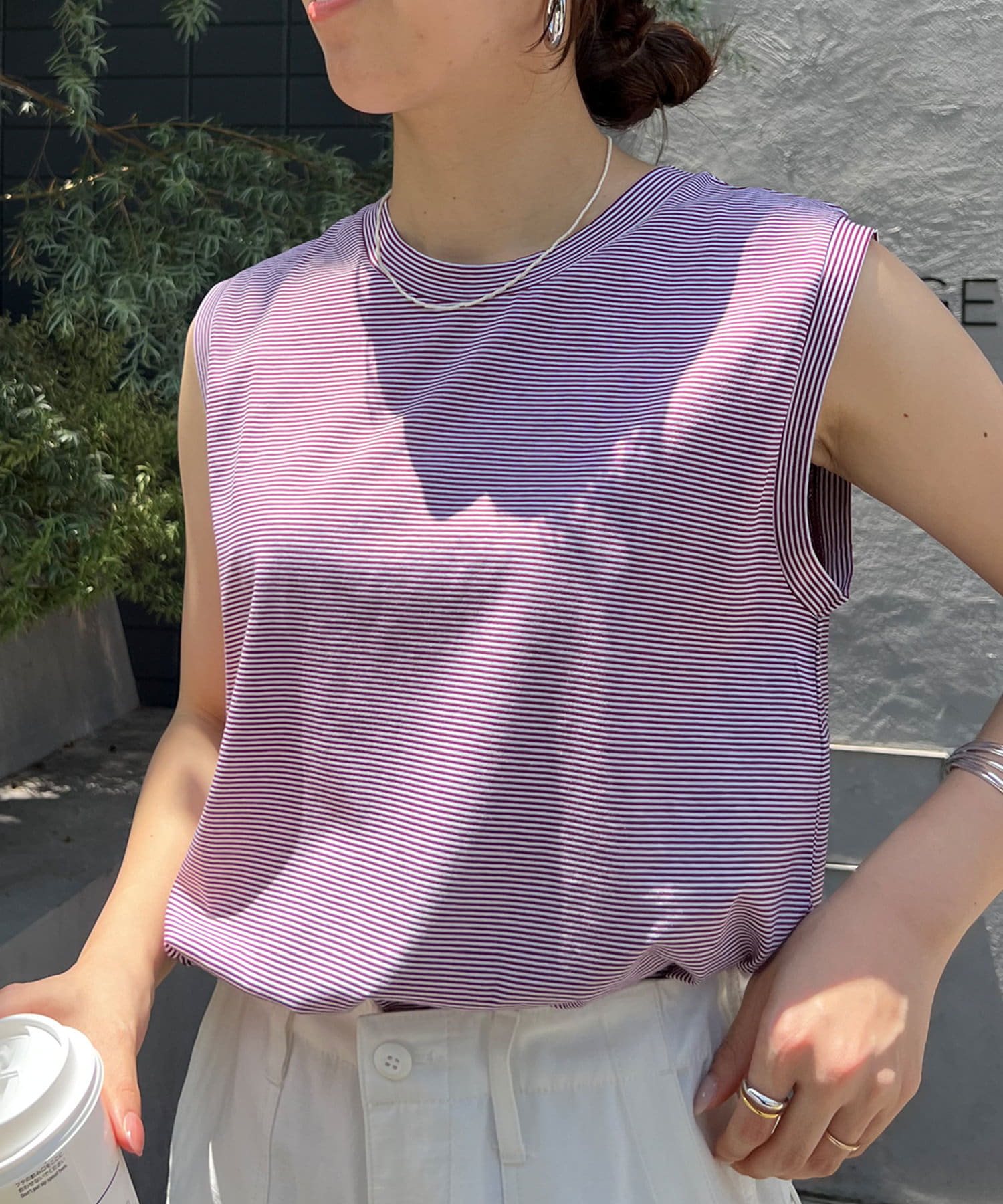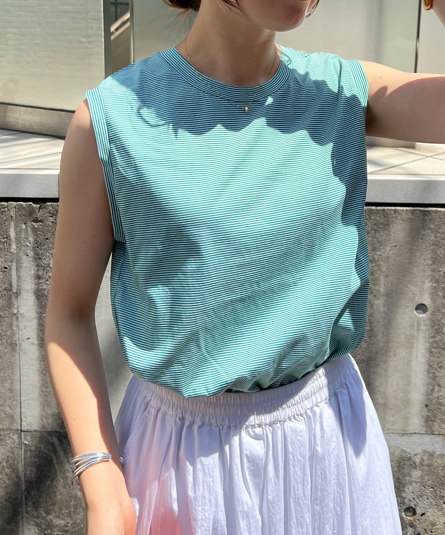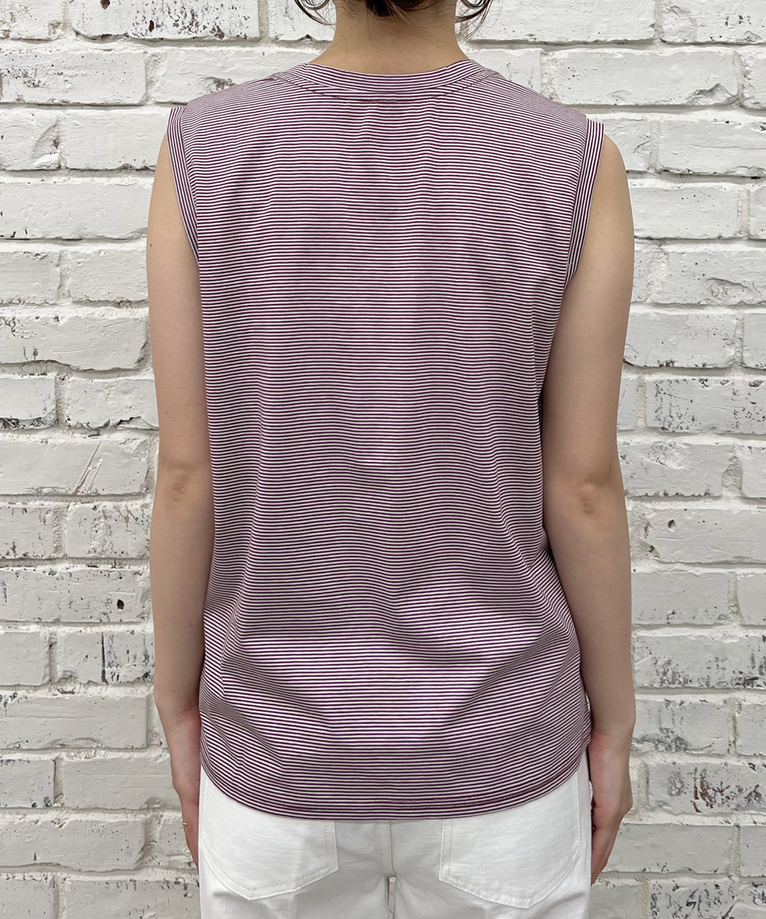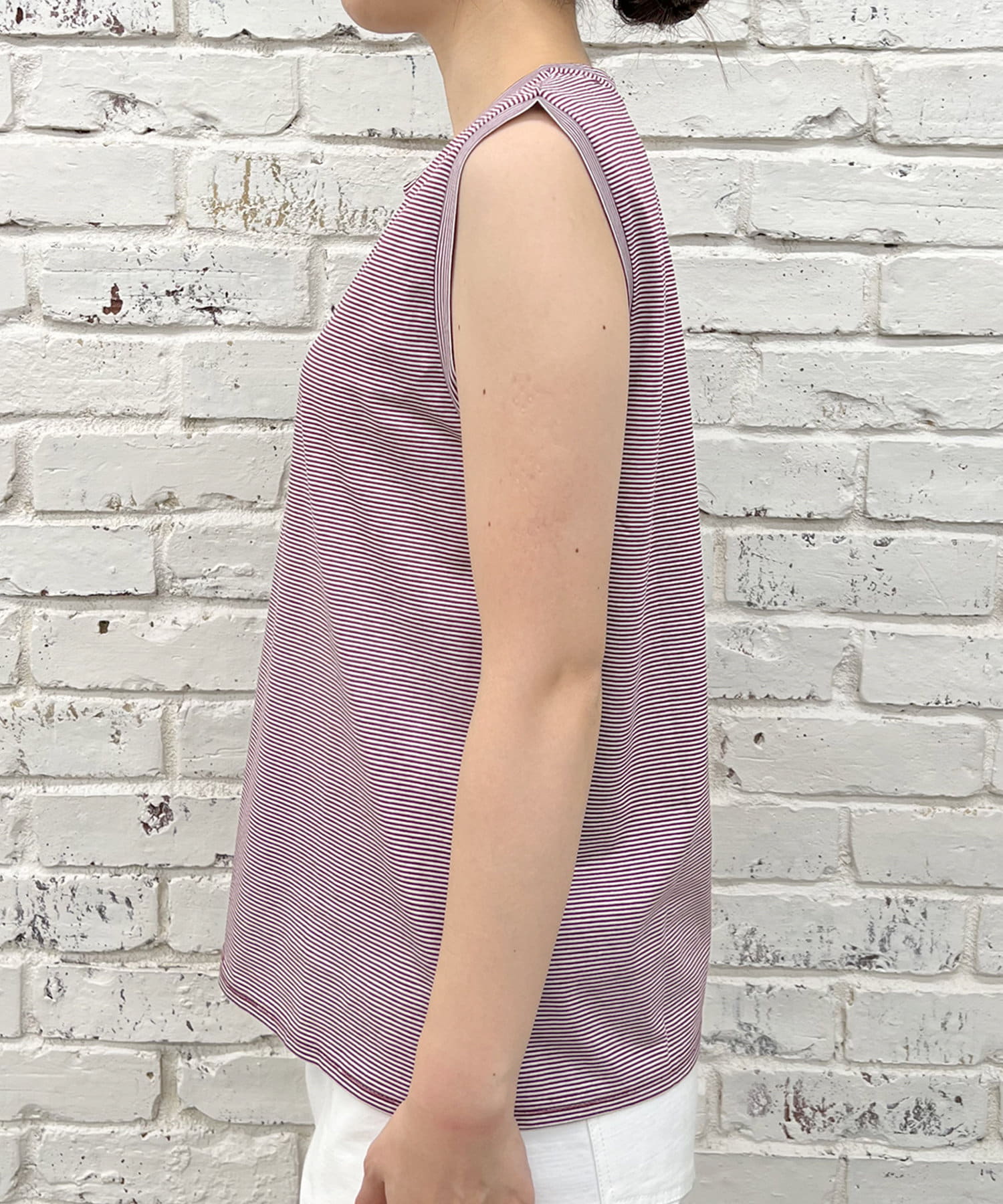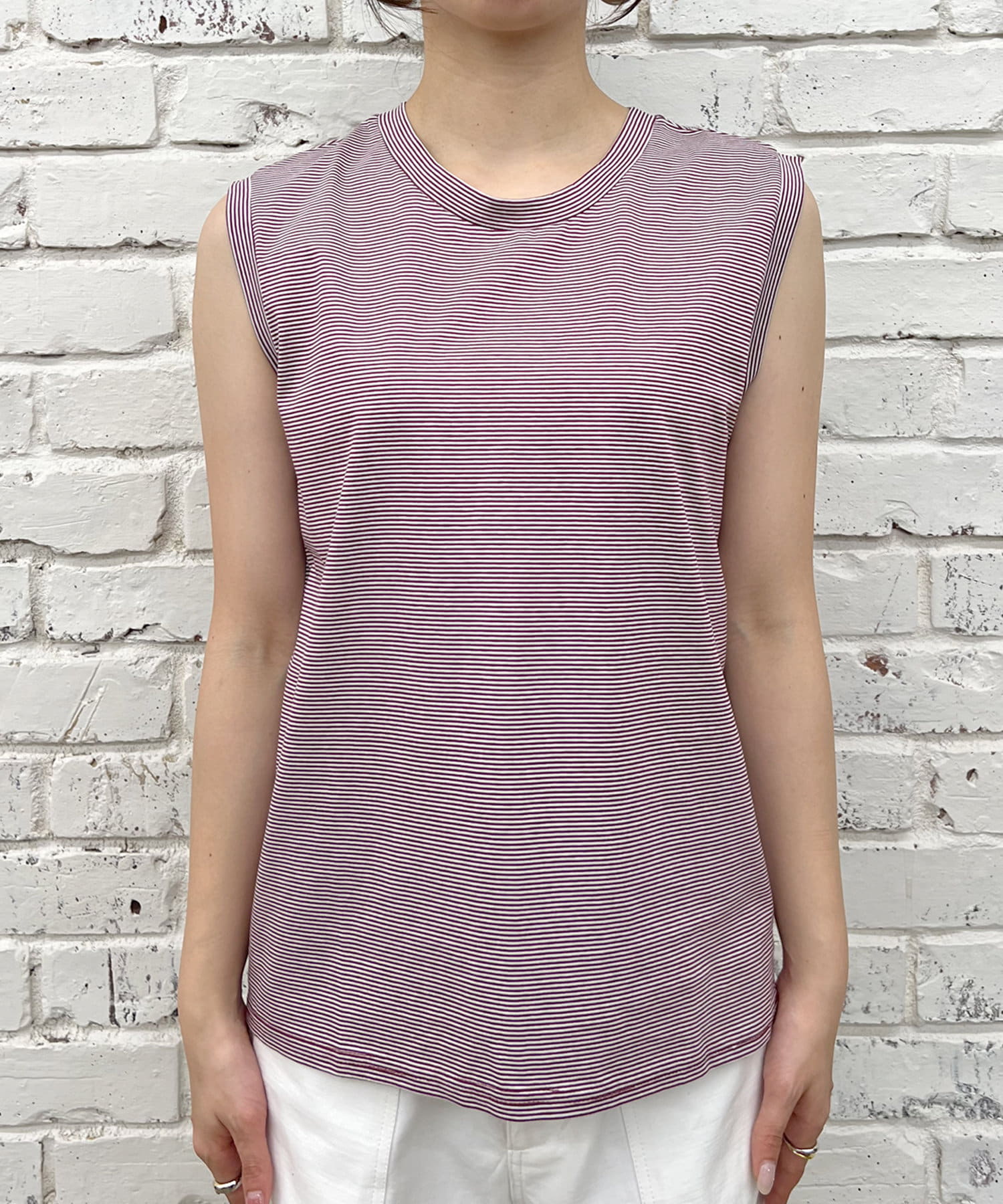 シンプルながらも使いやすいボーダーデザインのノースリーブ。