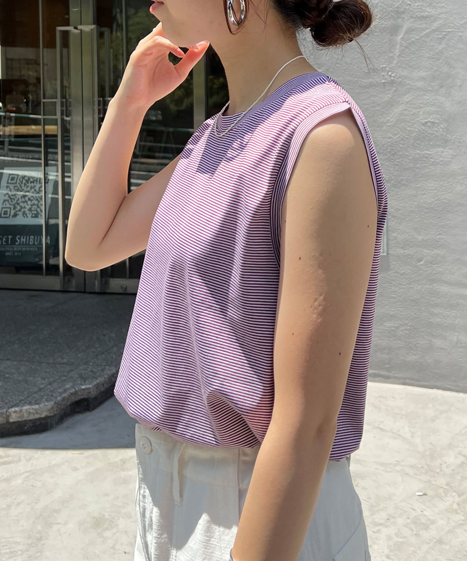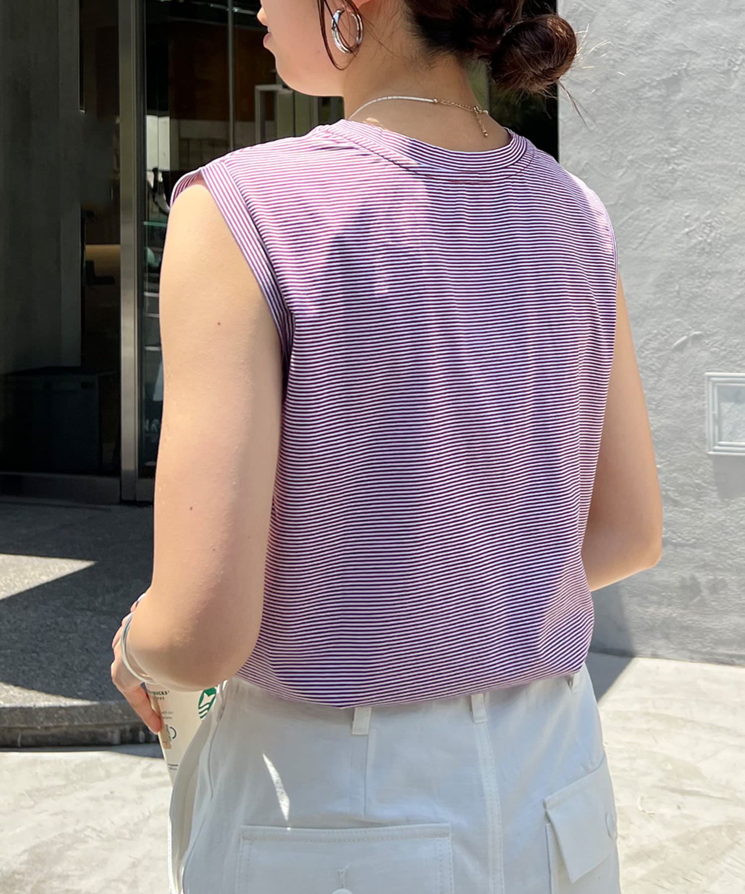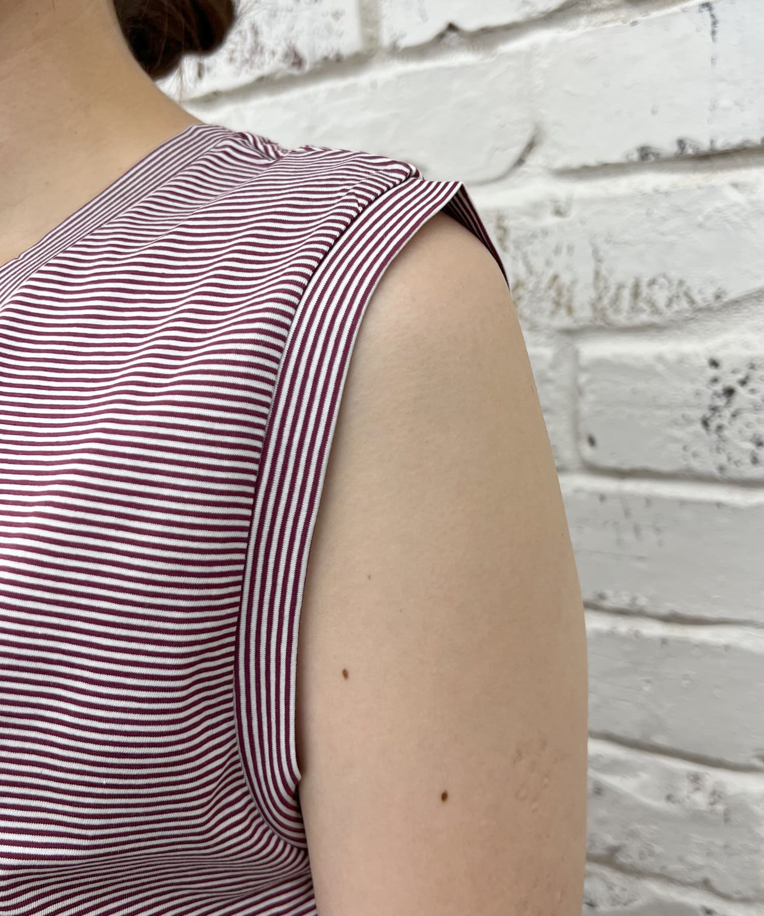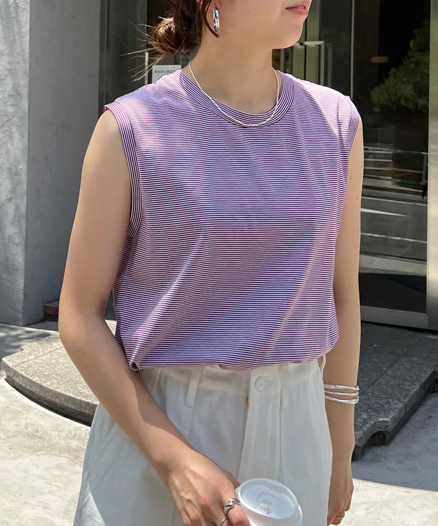 シンプルながらも使いやすいボーダーデザインのノースリーブ。