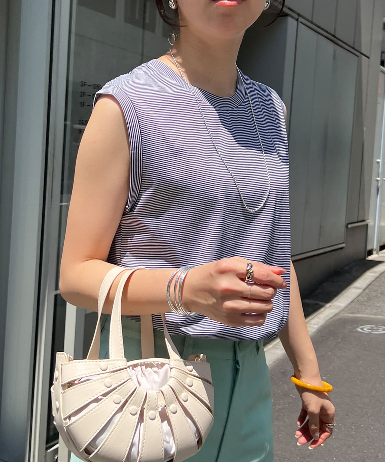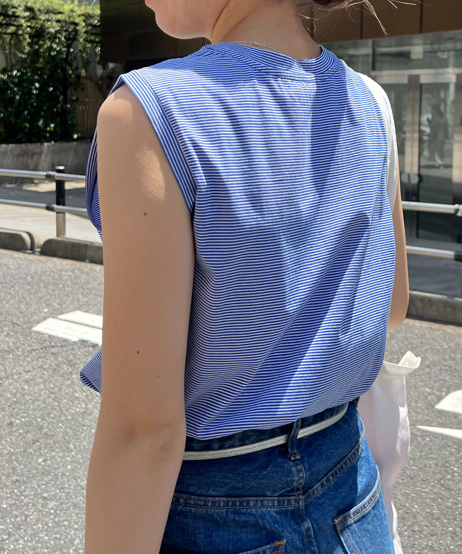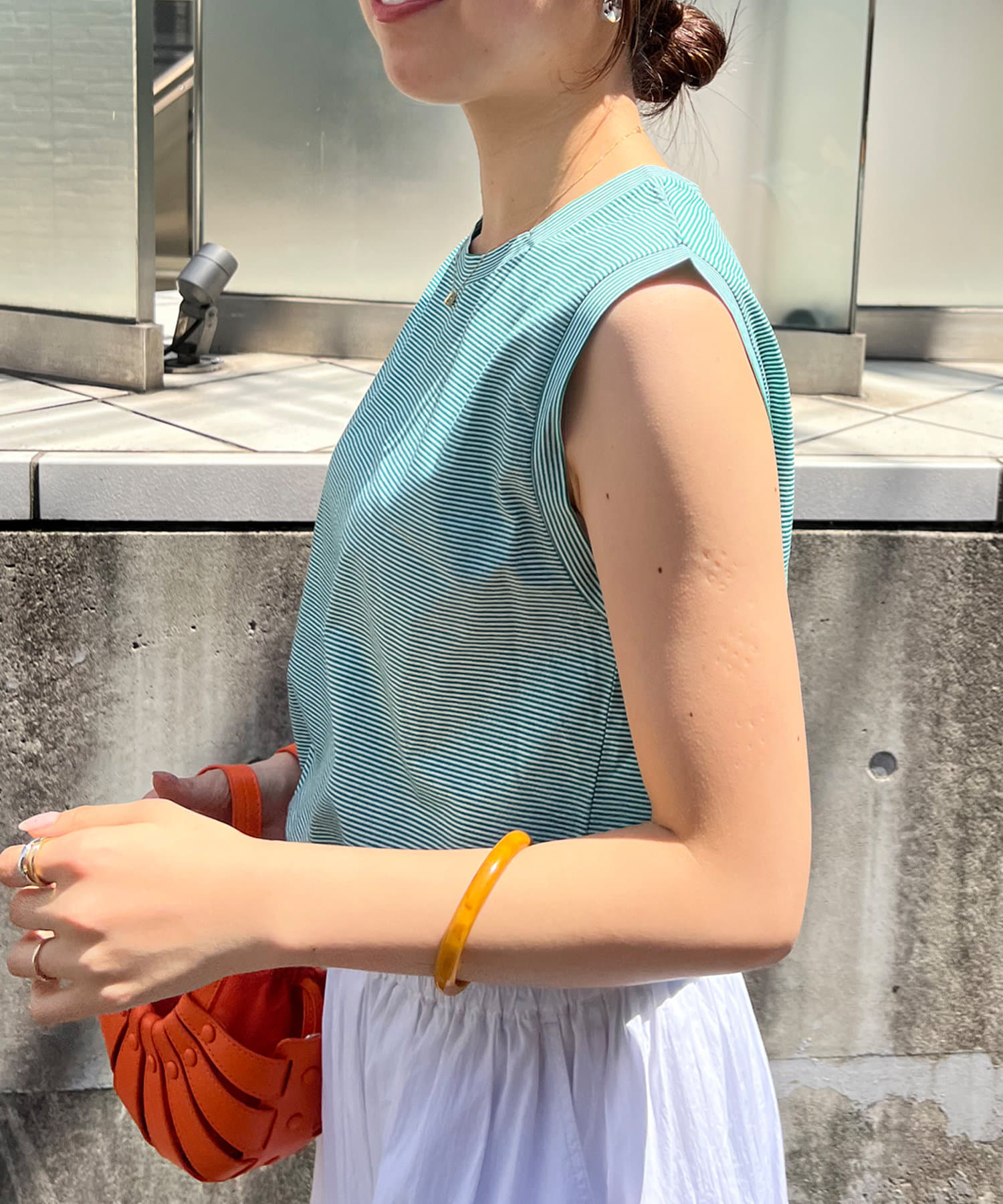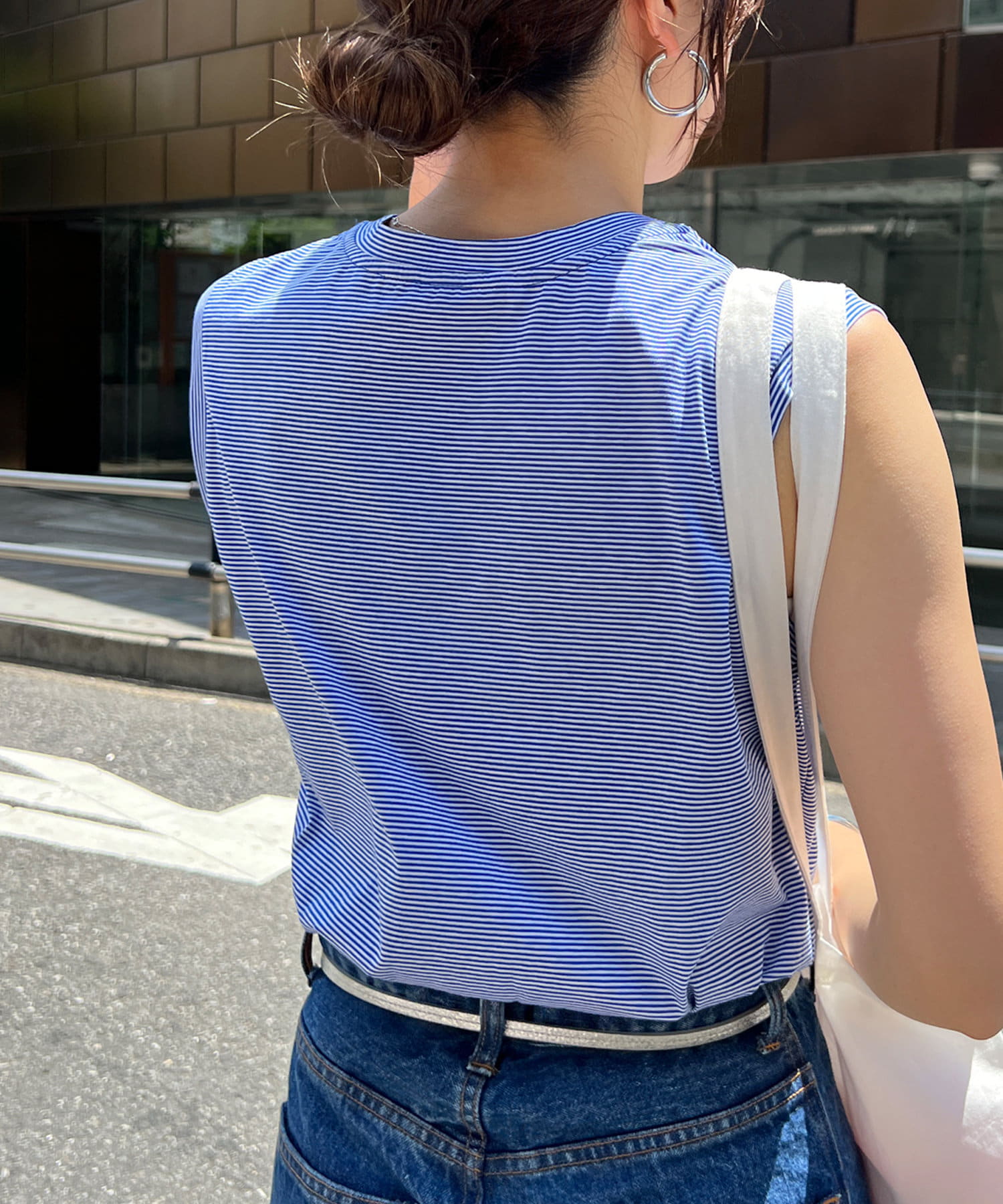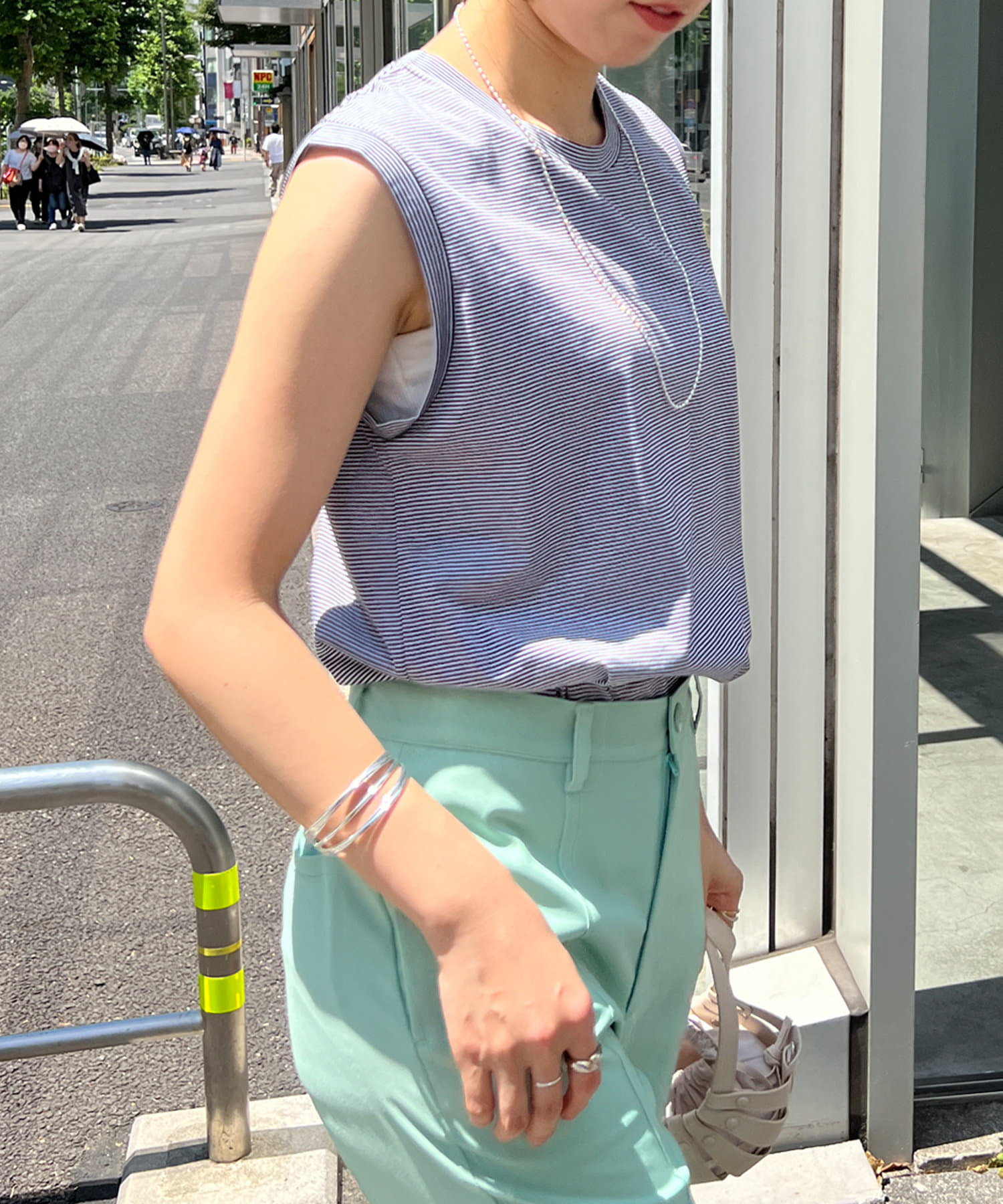 シンプルながらも使いやすいボーダーデザインのノースリーブ。