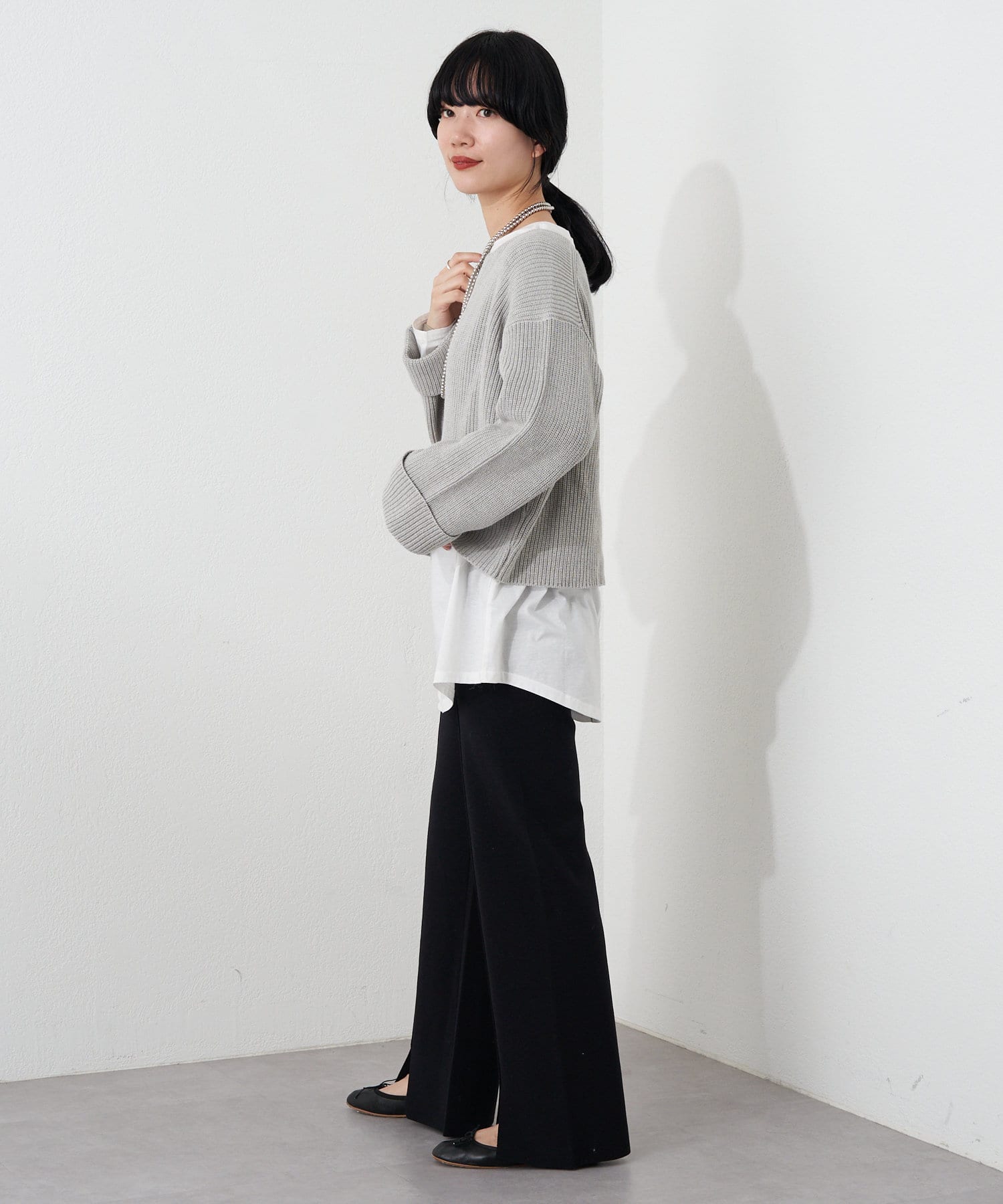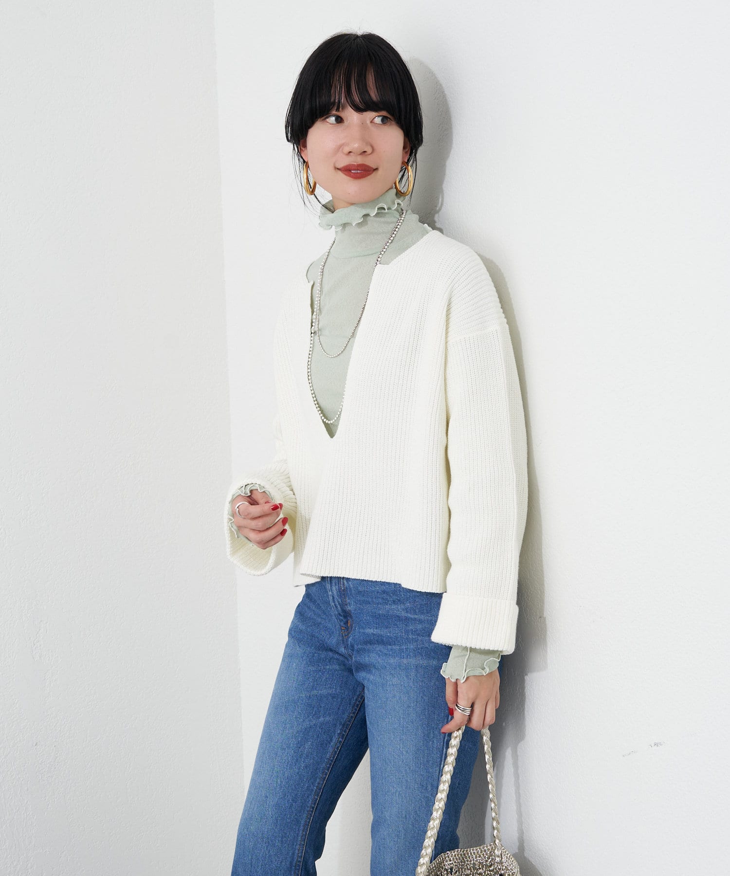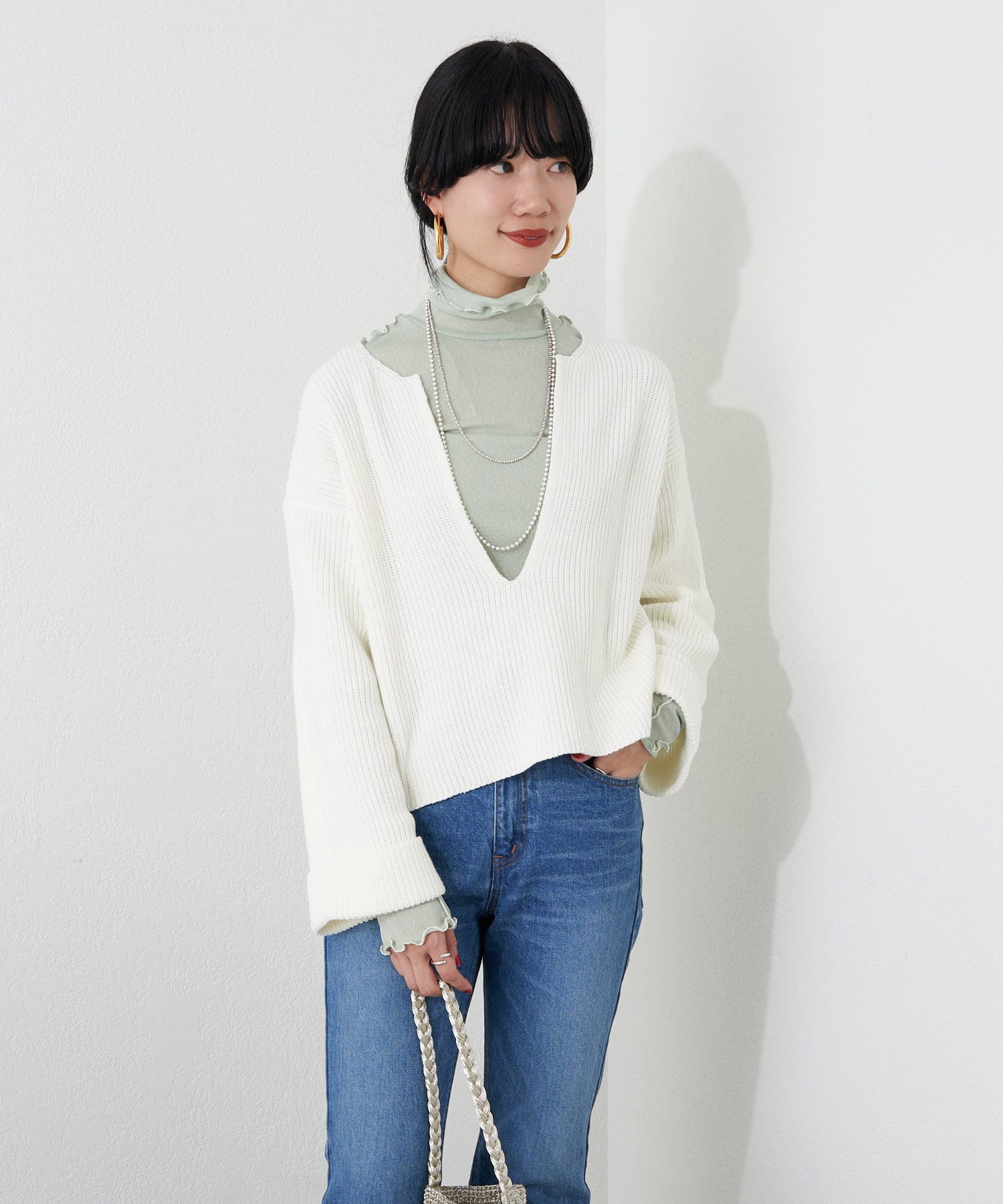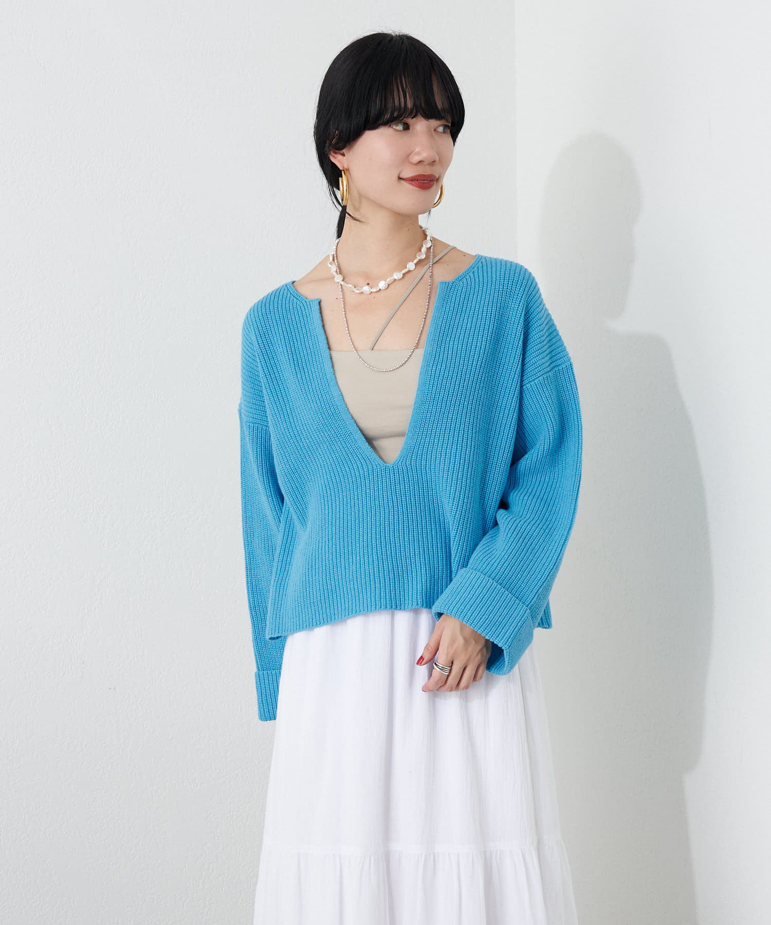 深めに開けたスリットネックは、デコルテラインを綺麗に見せてくれます。