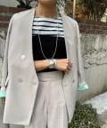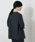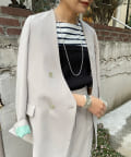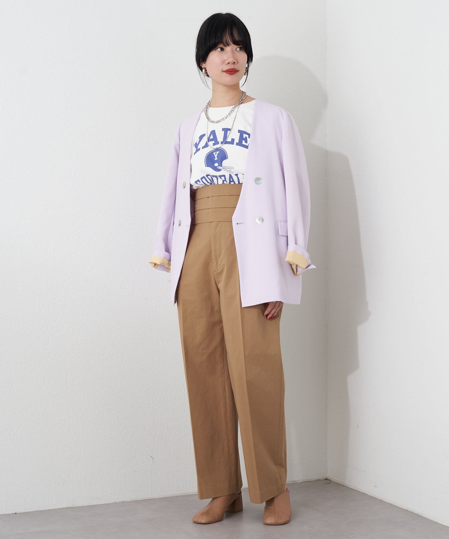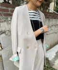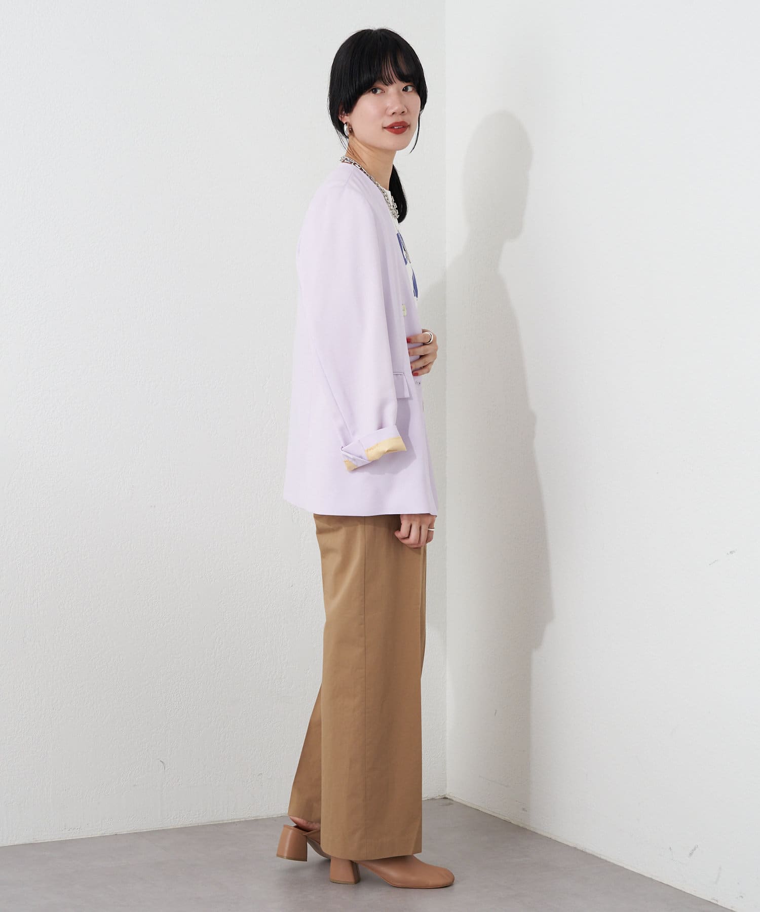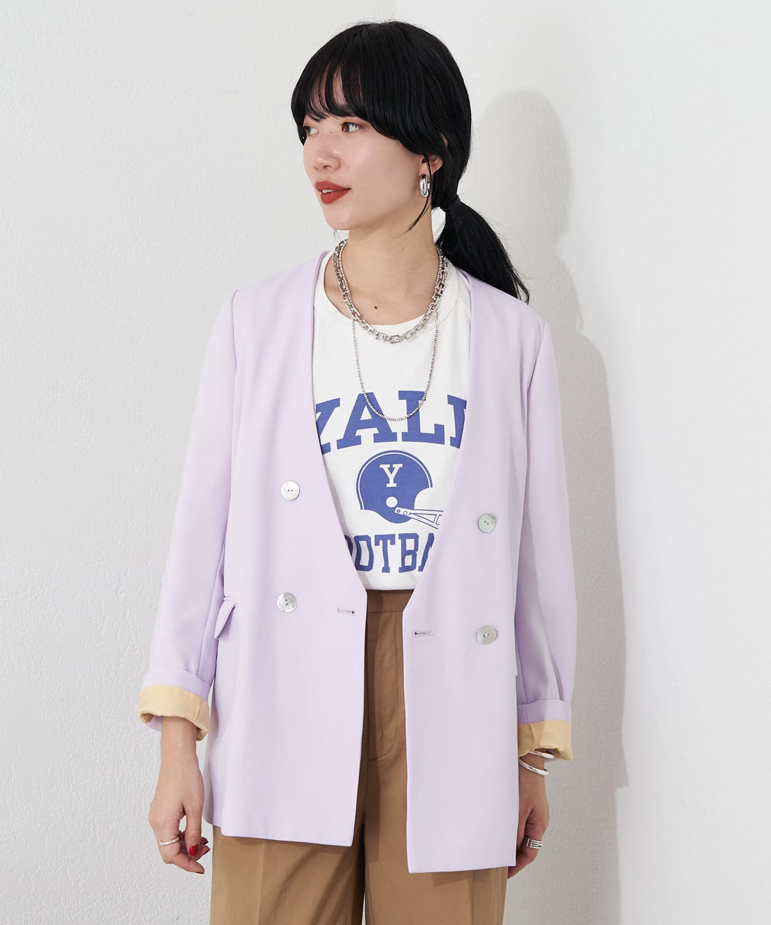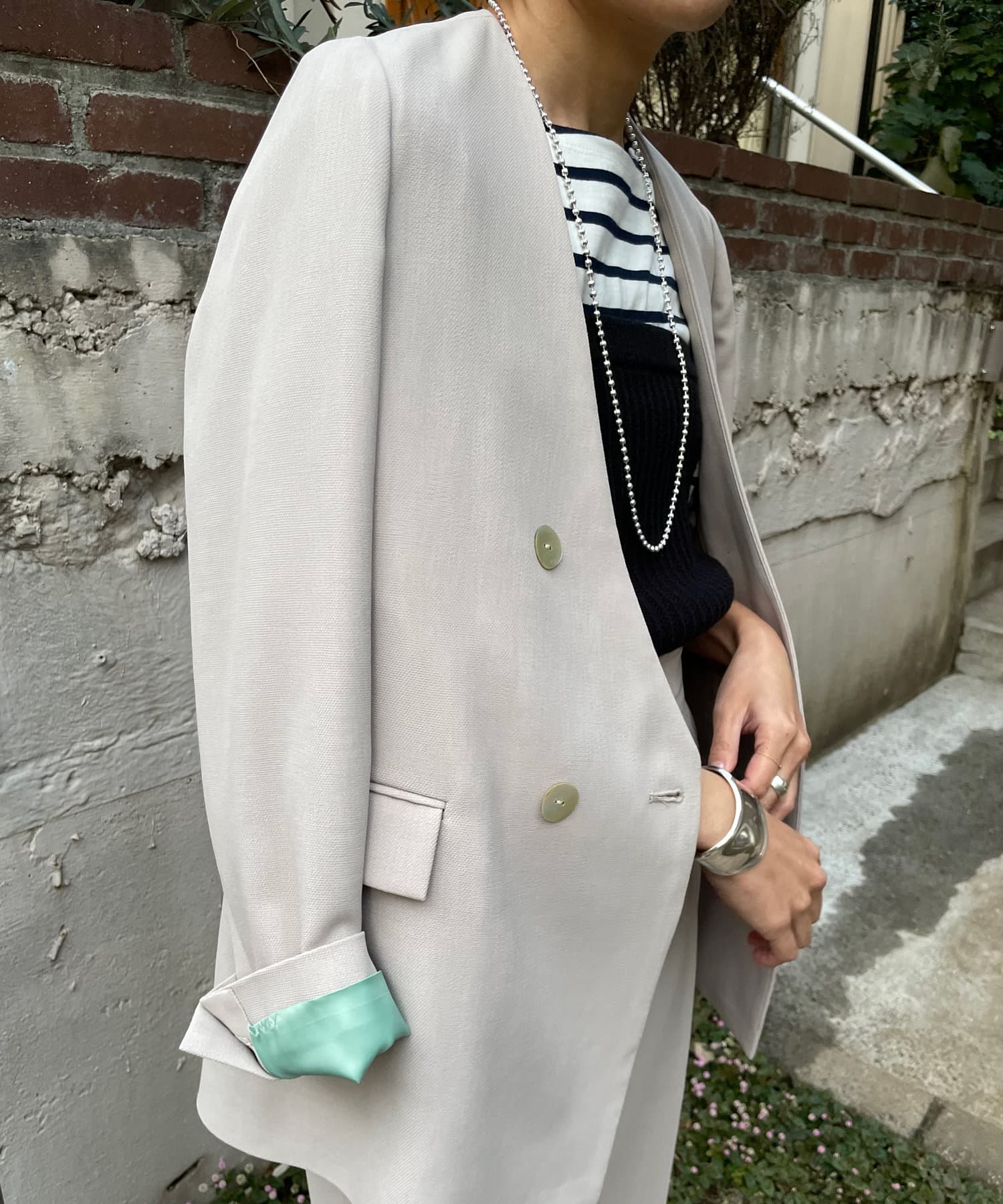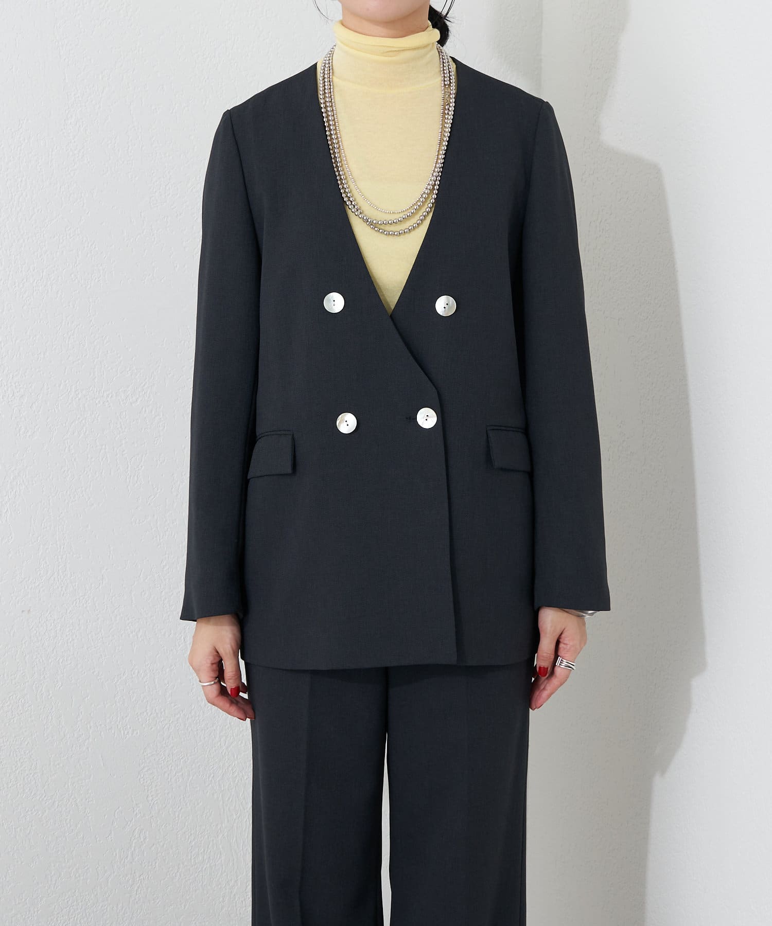 ♦オンオフ問わず着やすいノーカラータイプのダブルジャケット