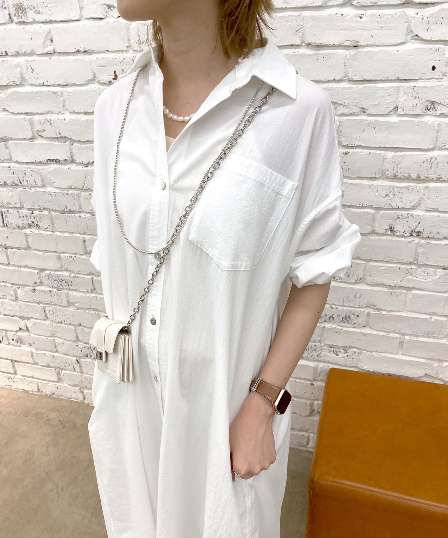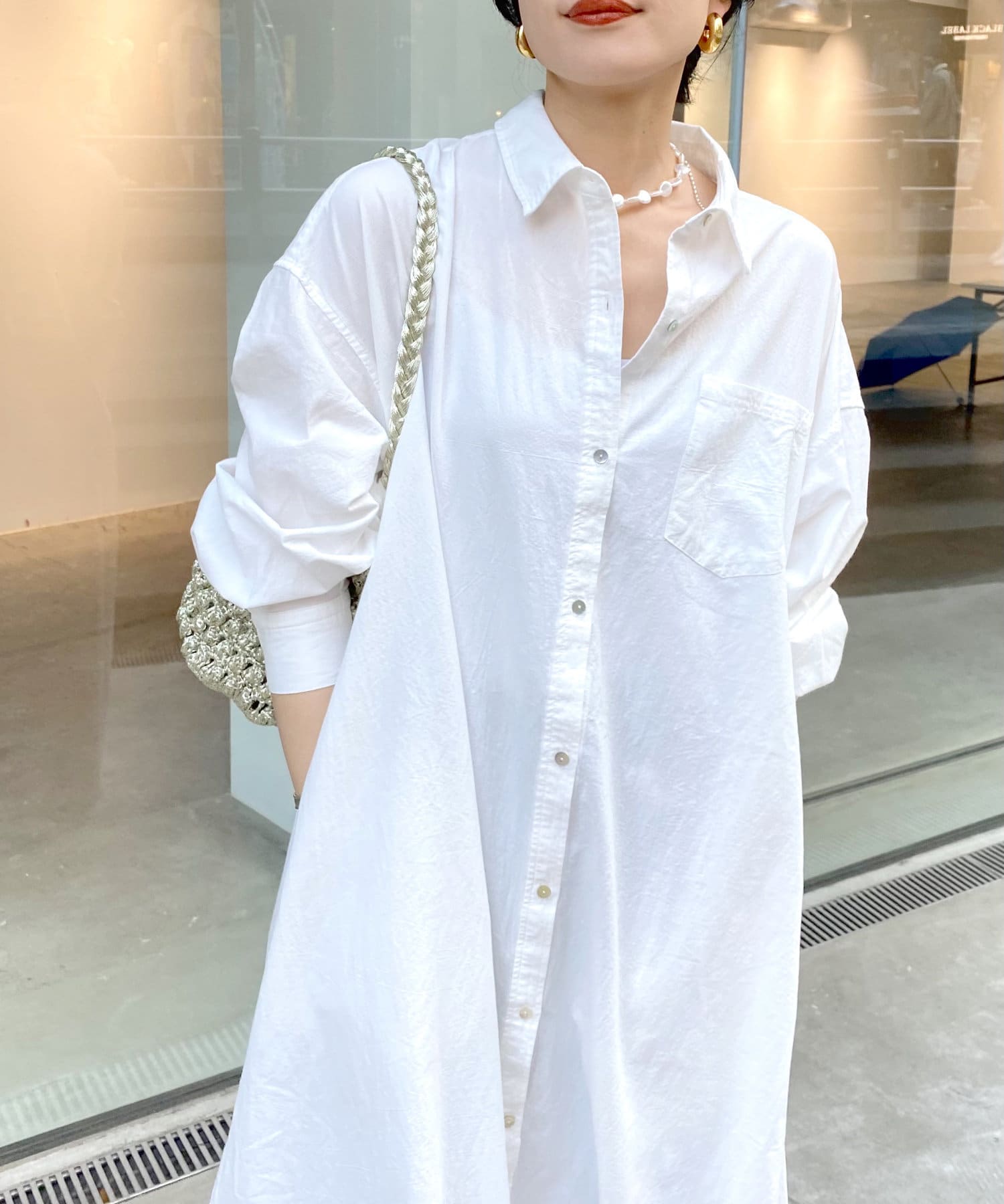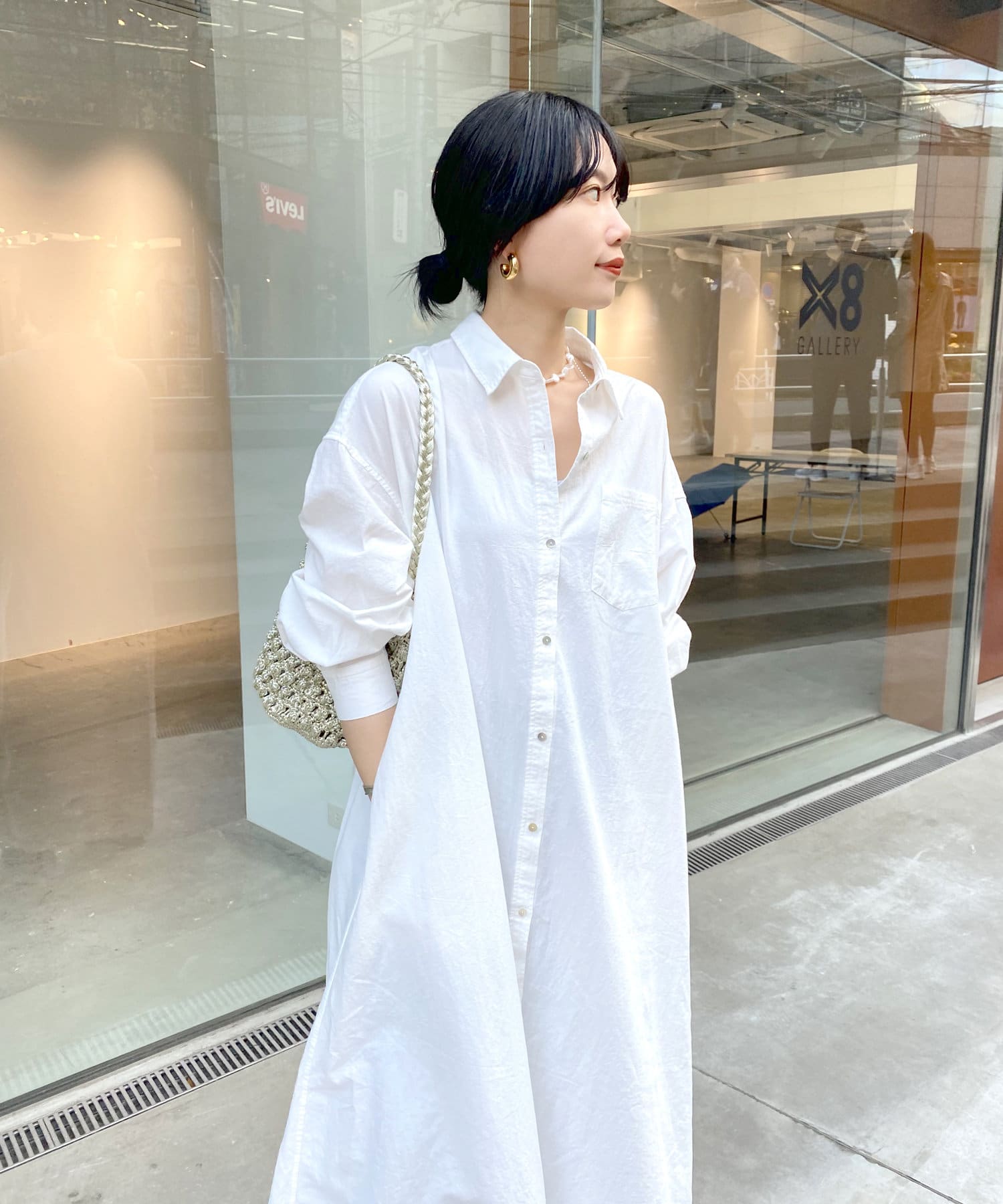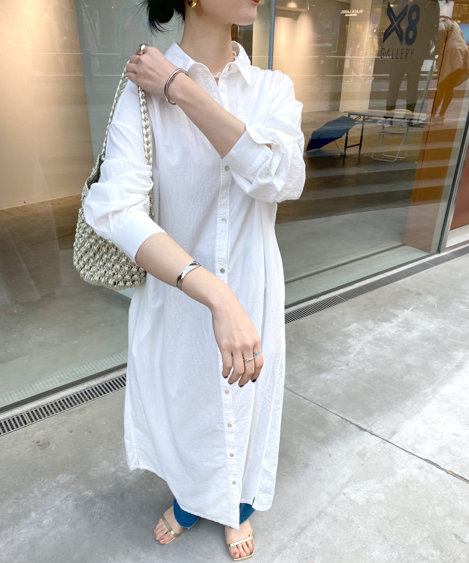 長袖ですが袖をまくったスタイリングがこなれ感もあり、シンプルなシャツドレスもひと際おしゃれに!