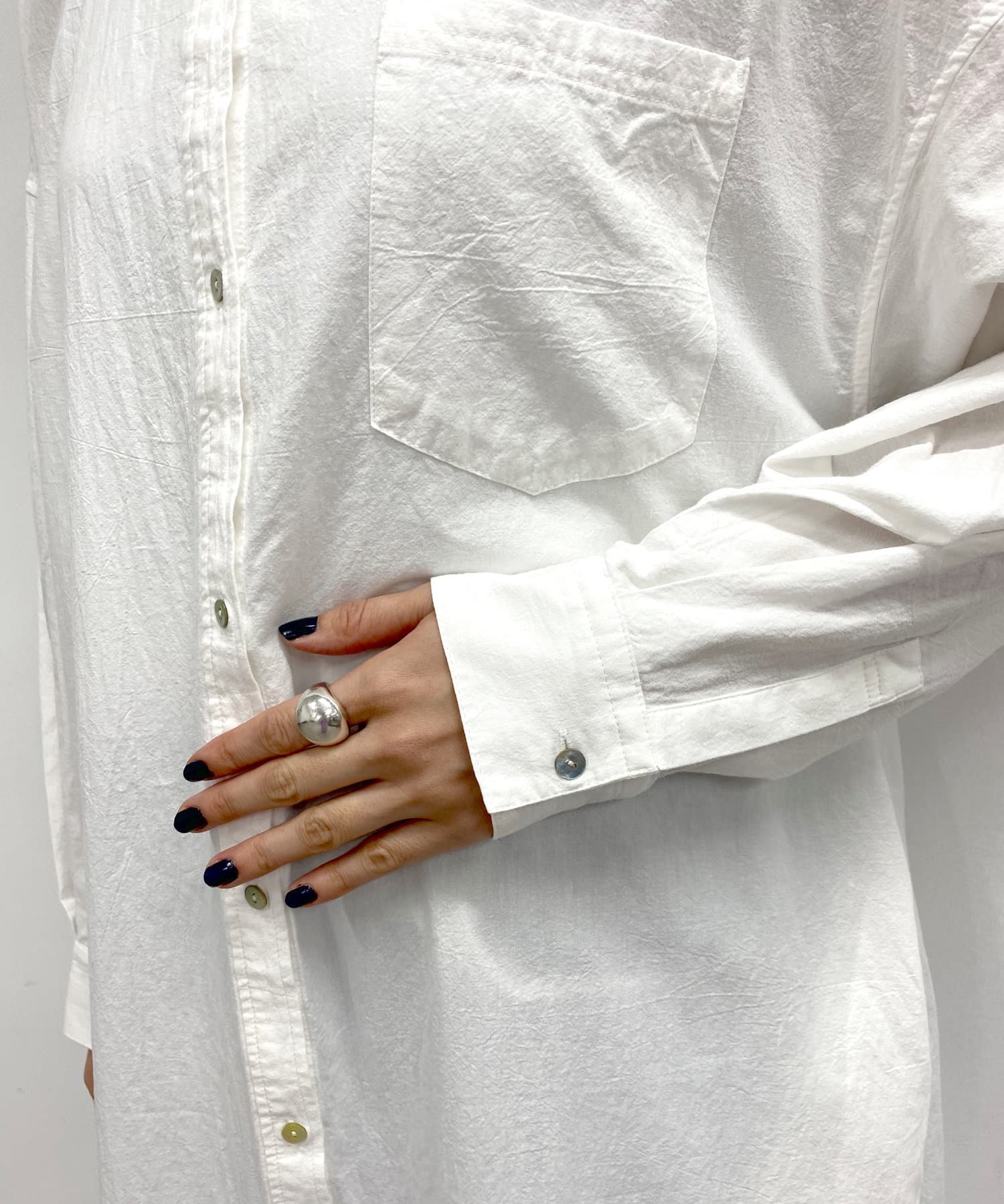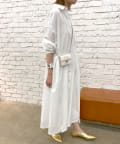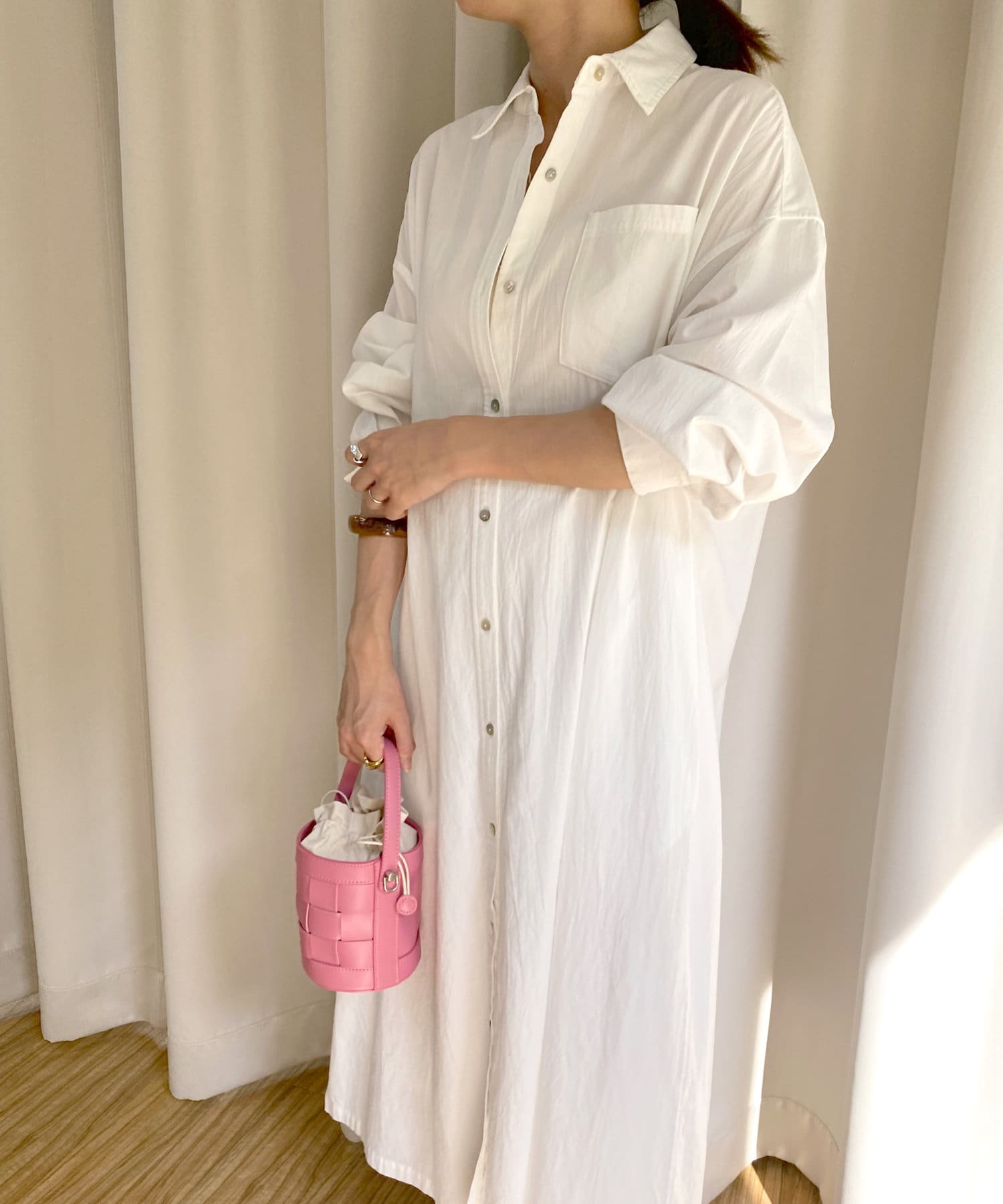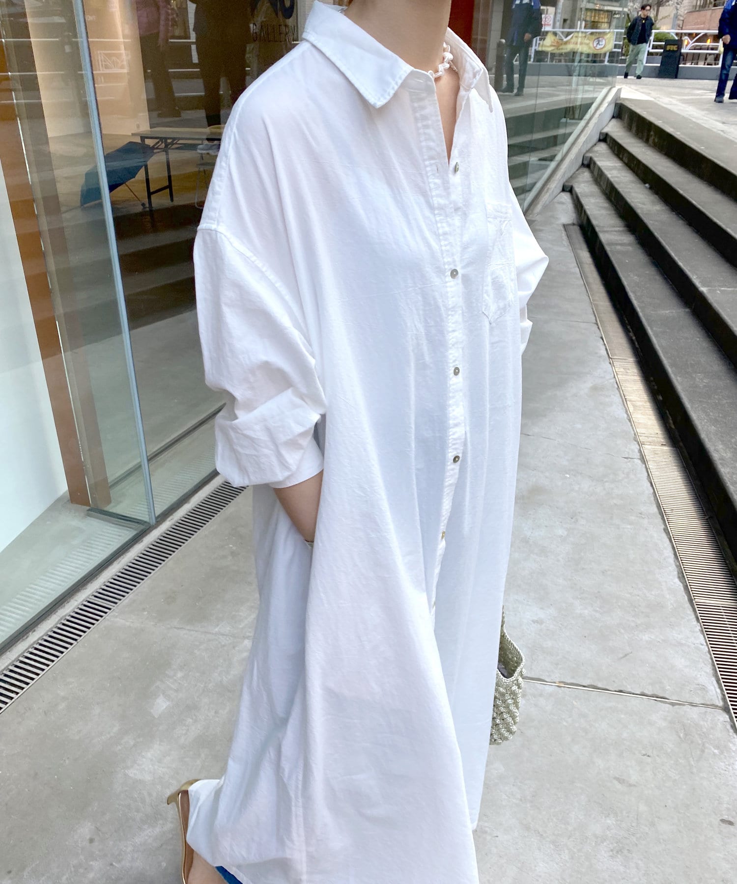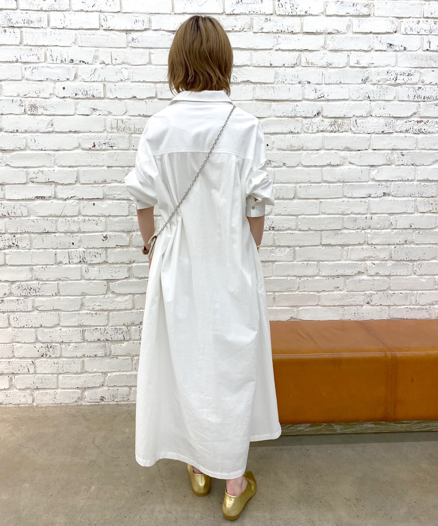 長袖ですが袖をまくったスタイリングがこなれ感もあり、シンプルなシャツドレスもひと際おしゃれに!