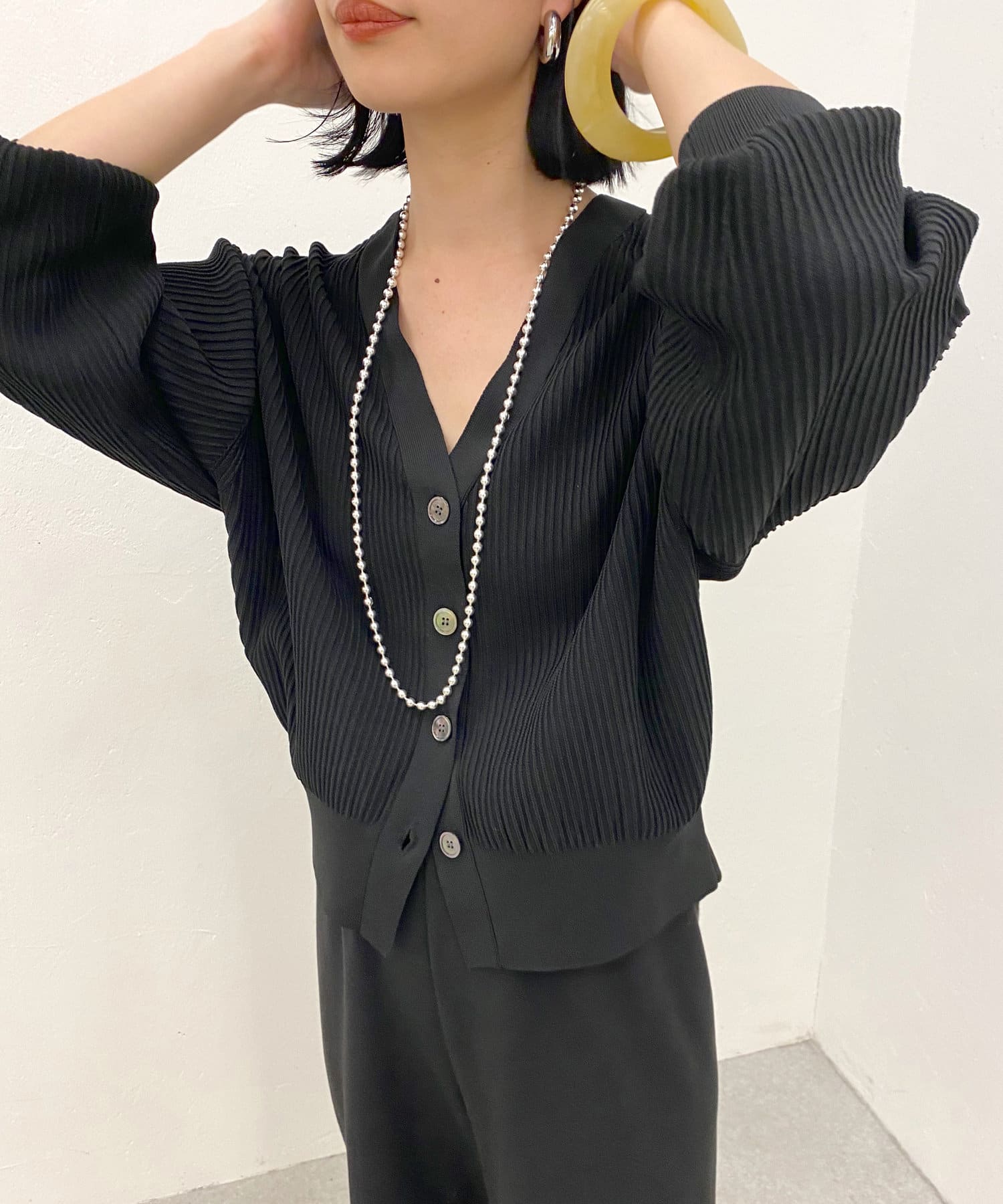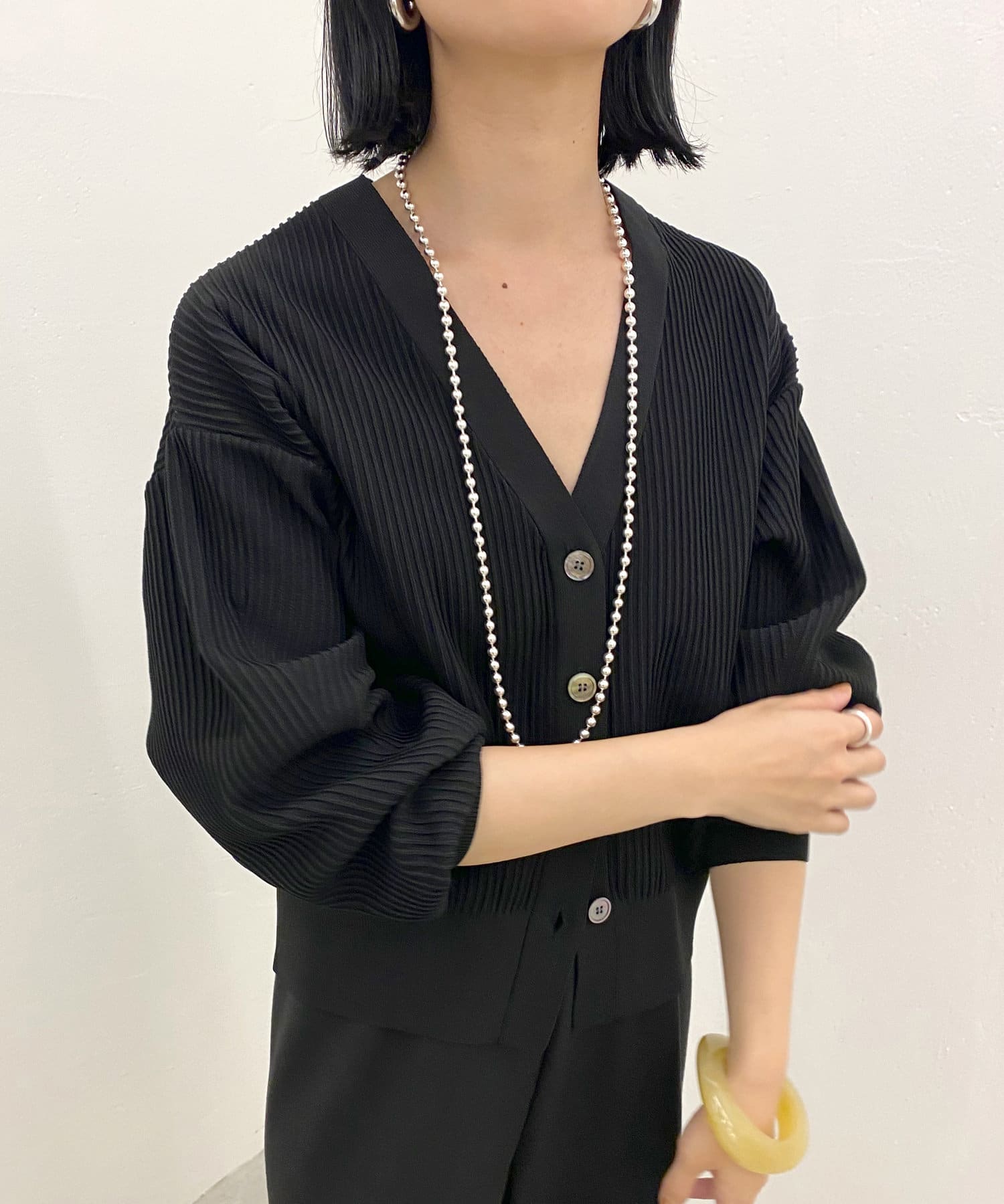 フロントのボタンを閉めてトップスとして着用していただくのもおすすめです。