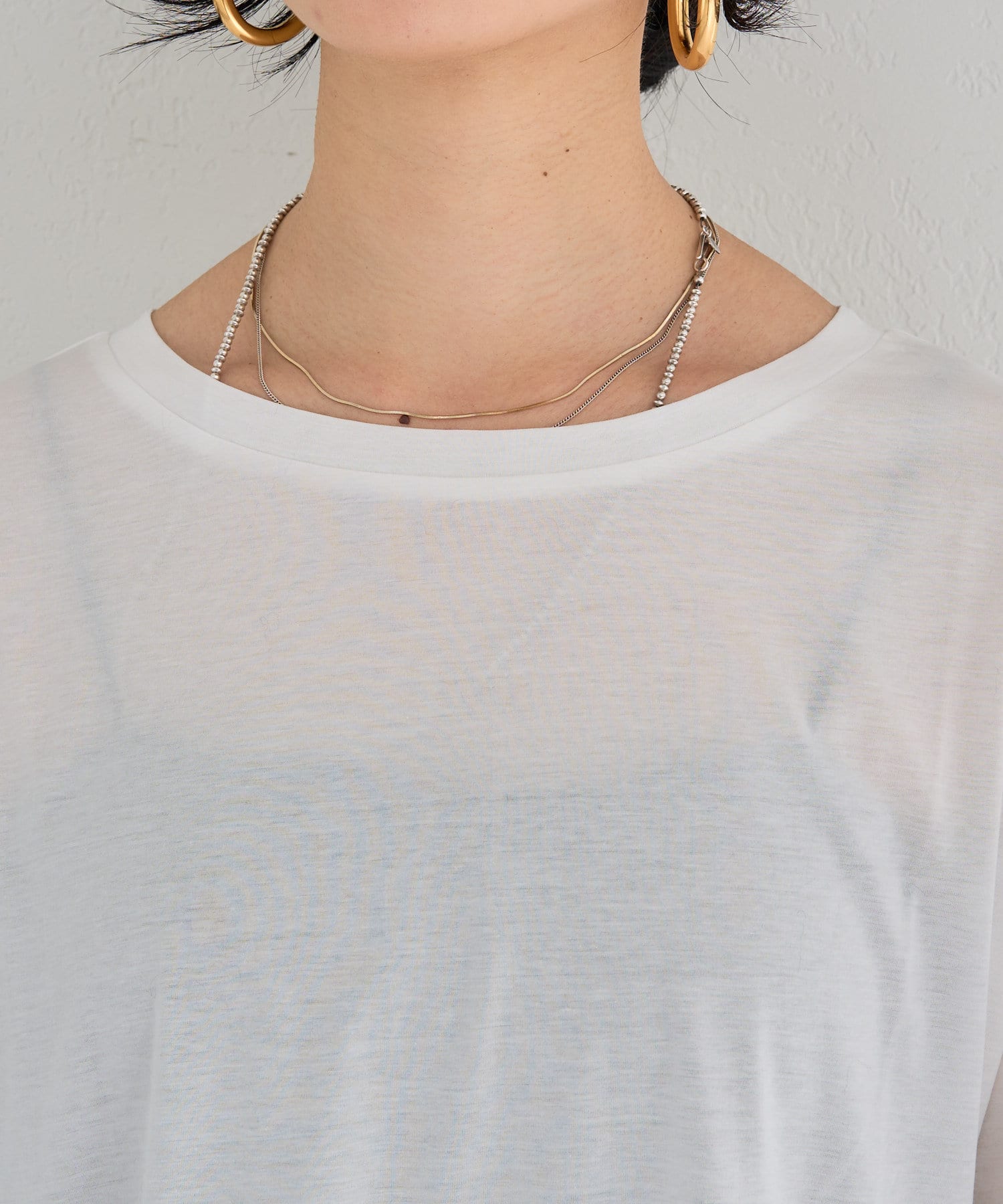 鎖骨がきれいに見えるすっきりとした首回りも上品な印象。