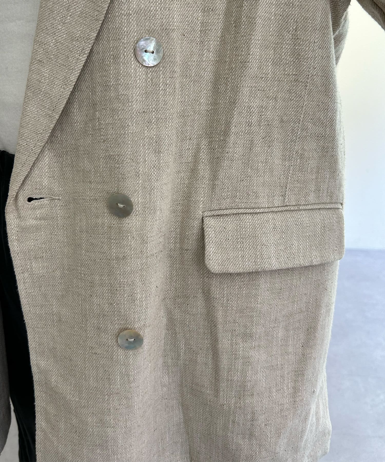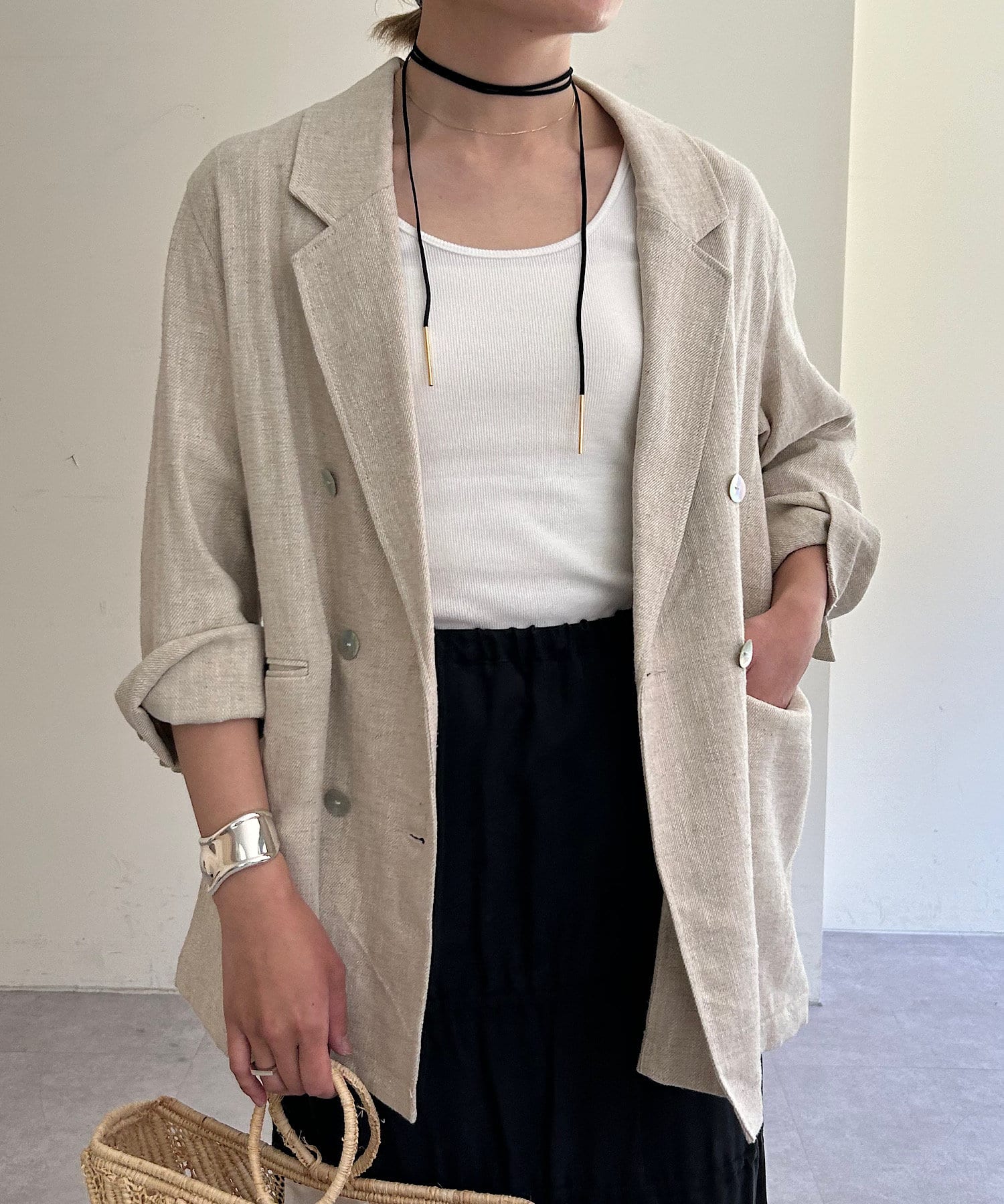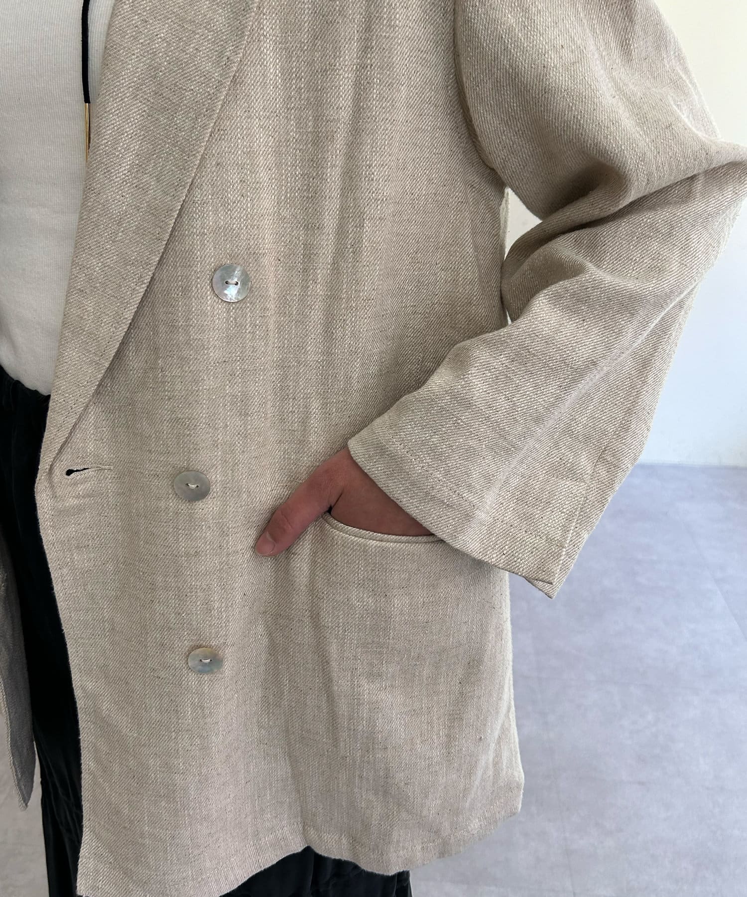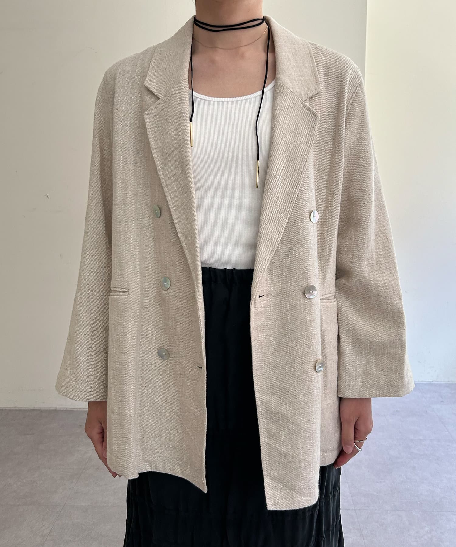 カッチリとしたマニッシュな印象があるダブルジャケットもリネン素材で柔らかい女性らしい雰囲気で着ていただけます。
