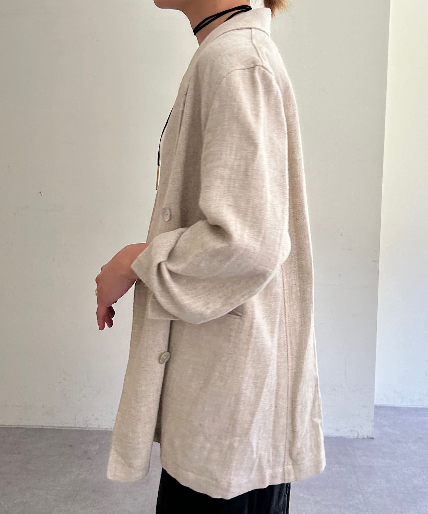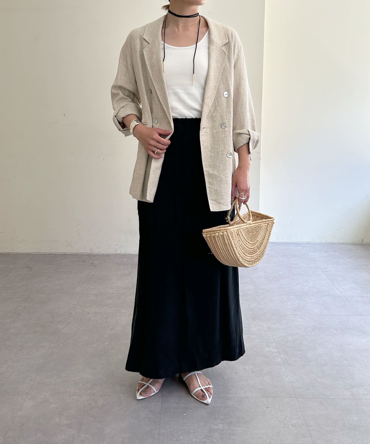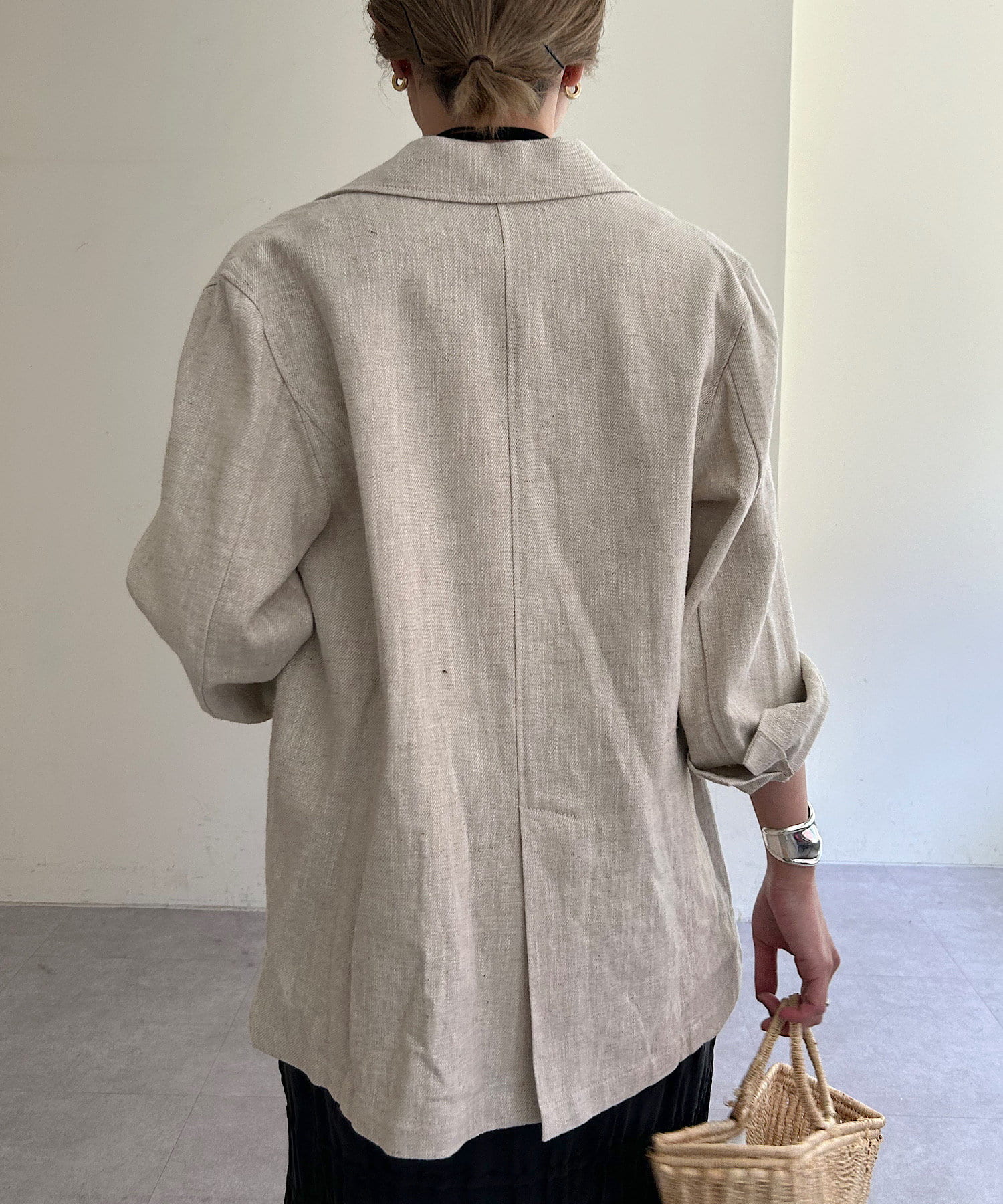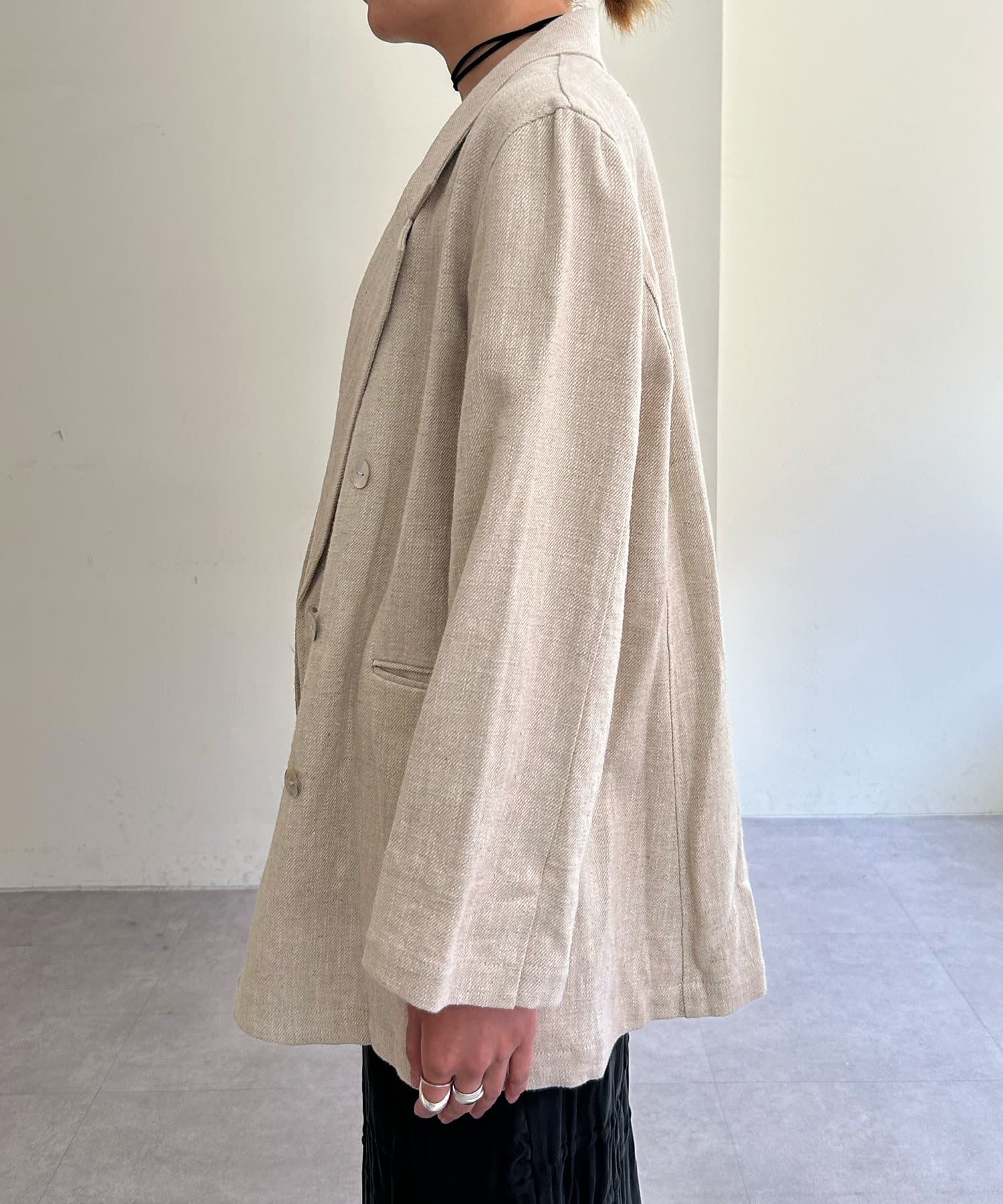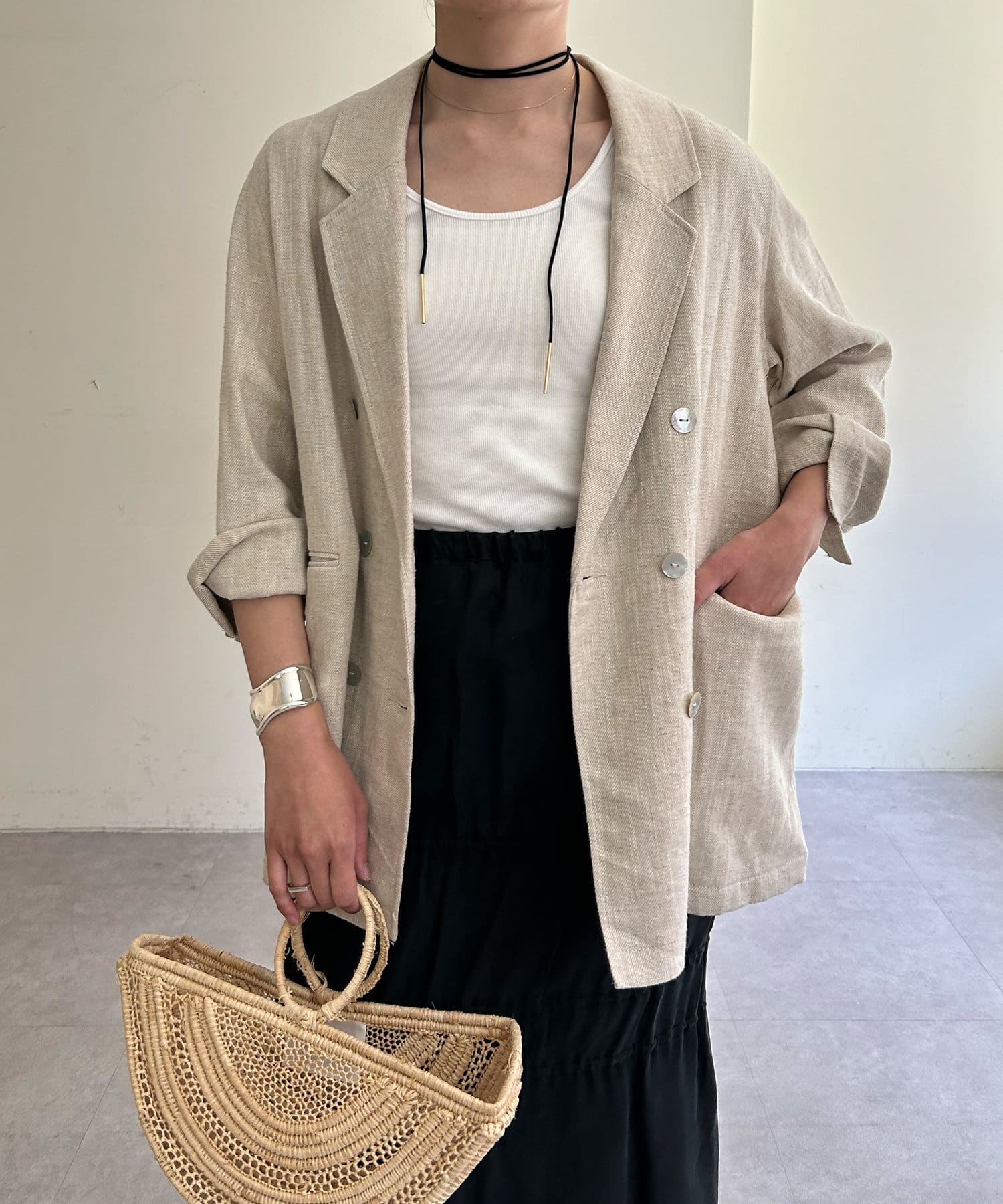 カッチリとしたマニッシュな印象があるダブルジャケットもリネン素材で柔らかい女性らしい雰囲気で着ていただけます。