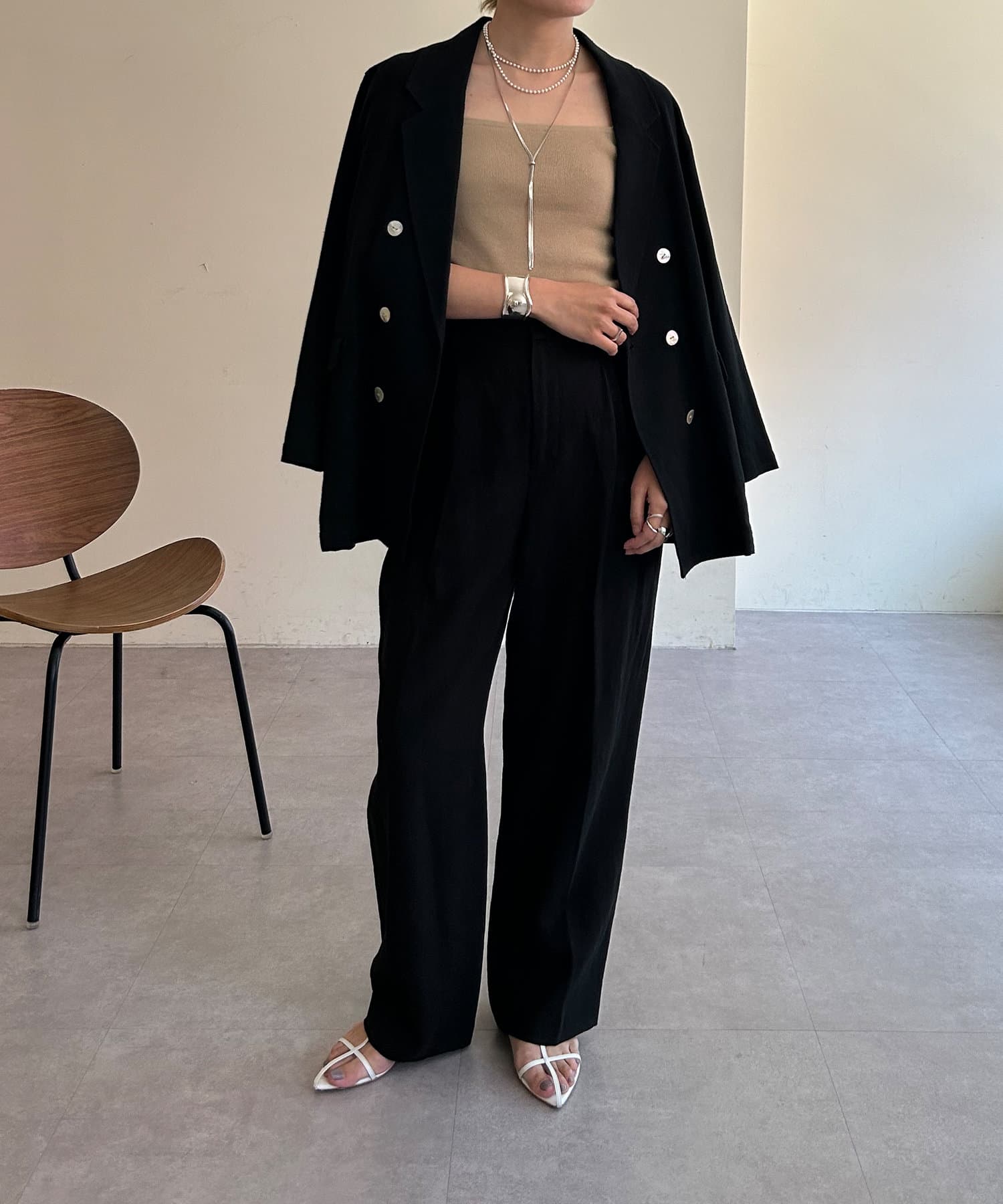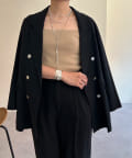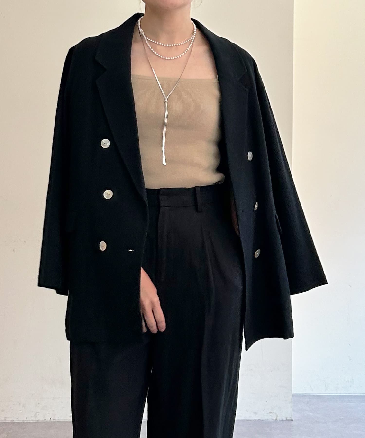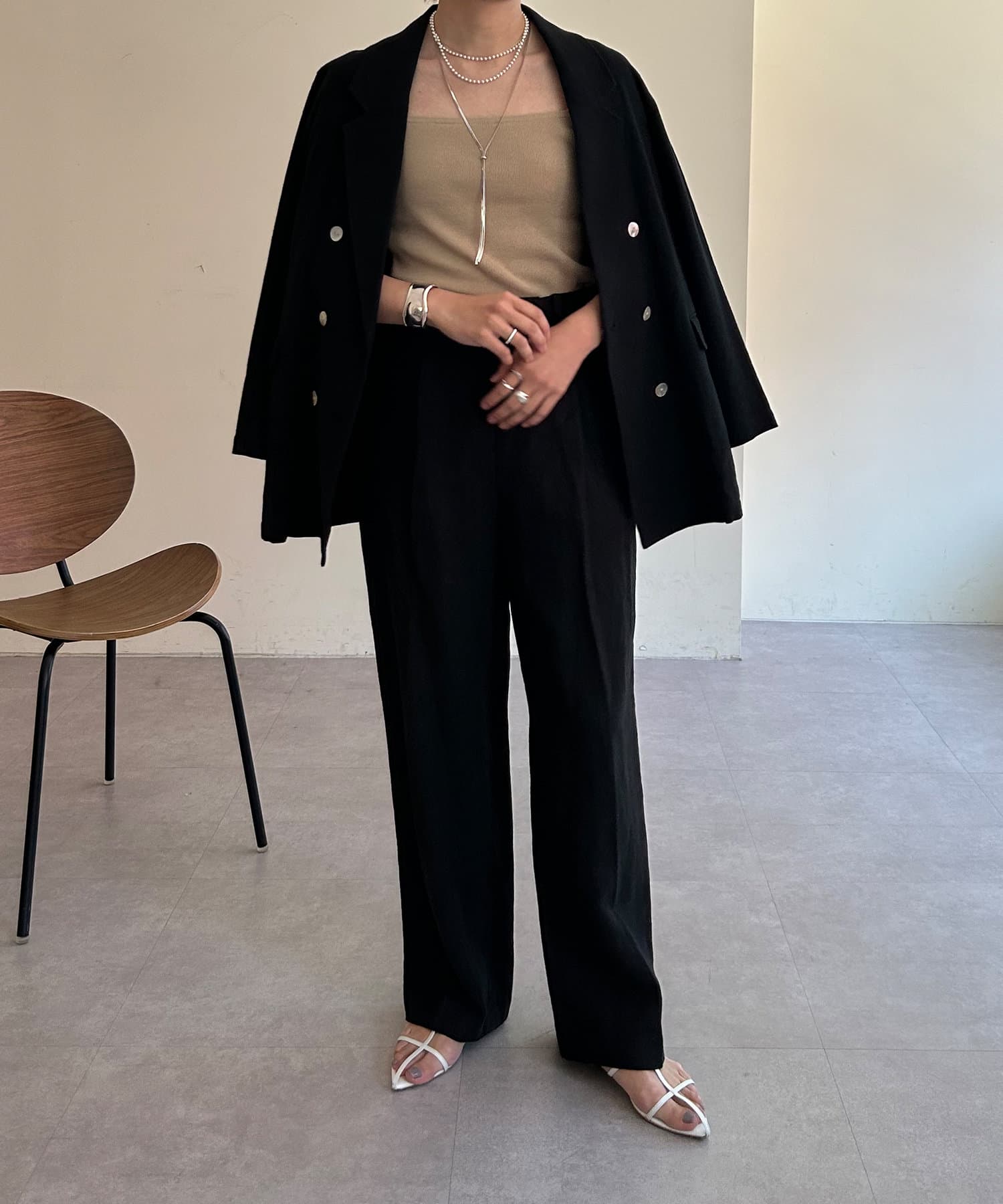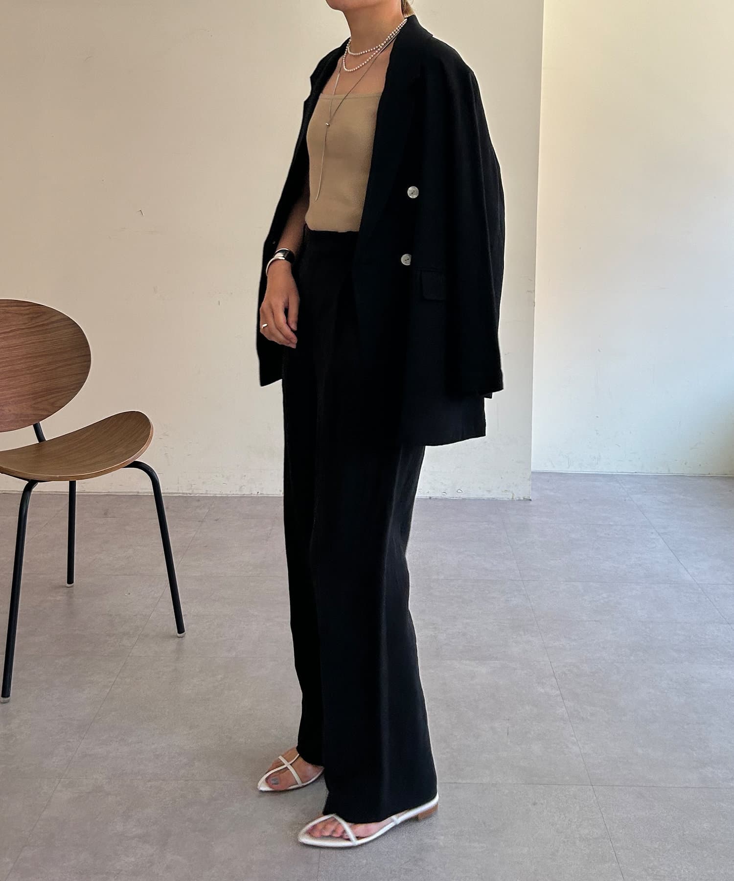 カッチリとしたマニッシュな印象があるダブルジャケットもリネン素材で柔らかい女性らしい雰囲気で着ていただけます。