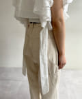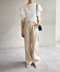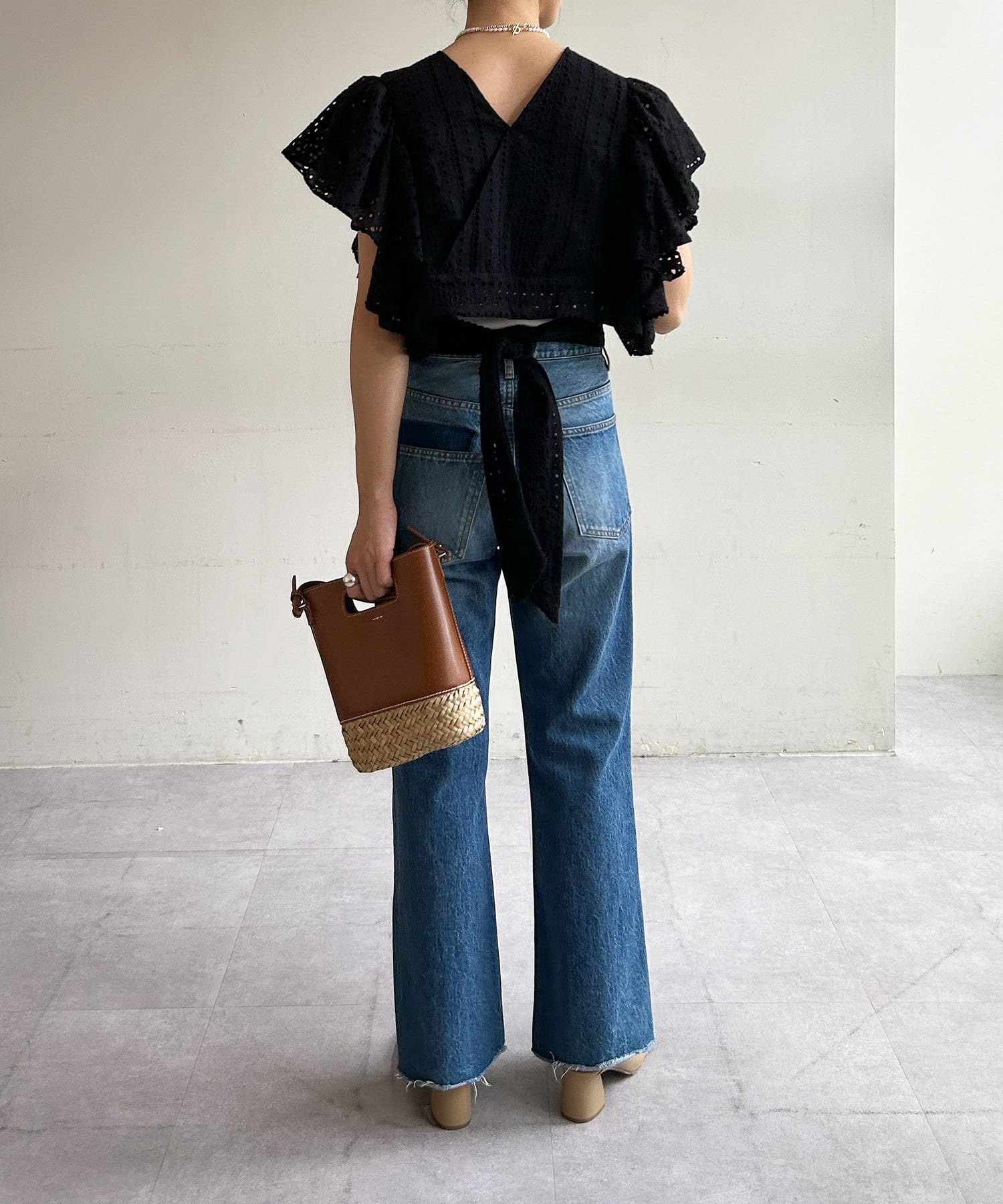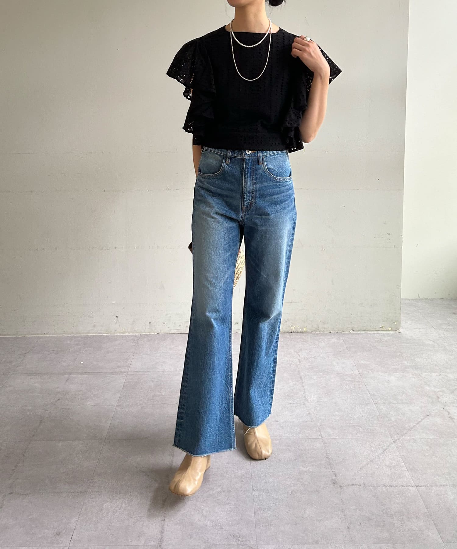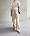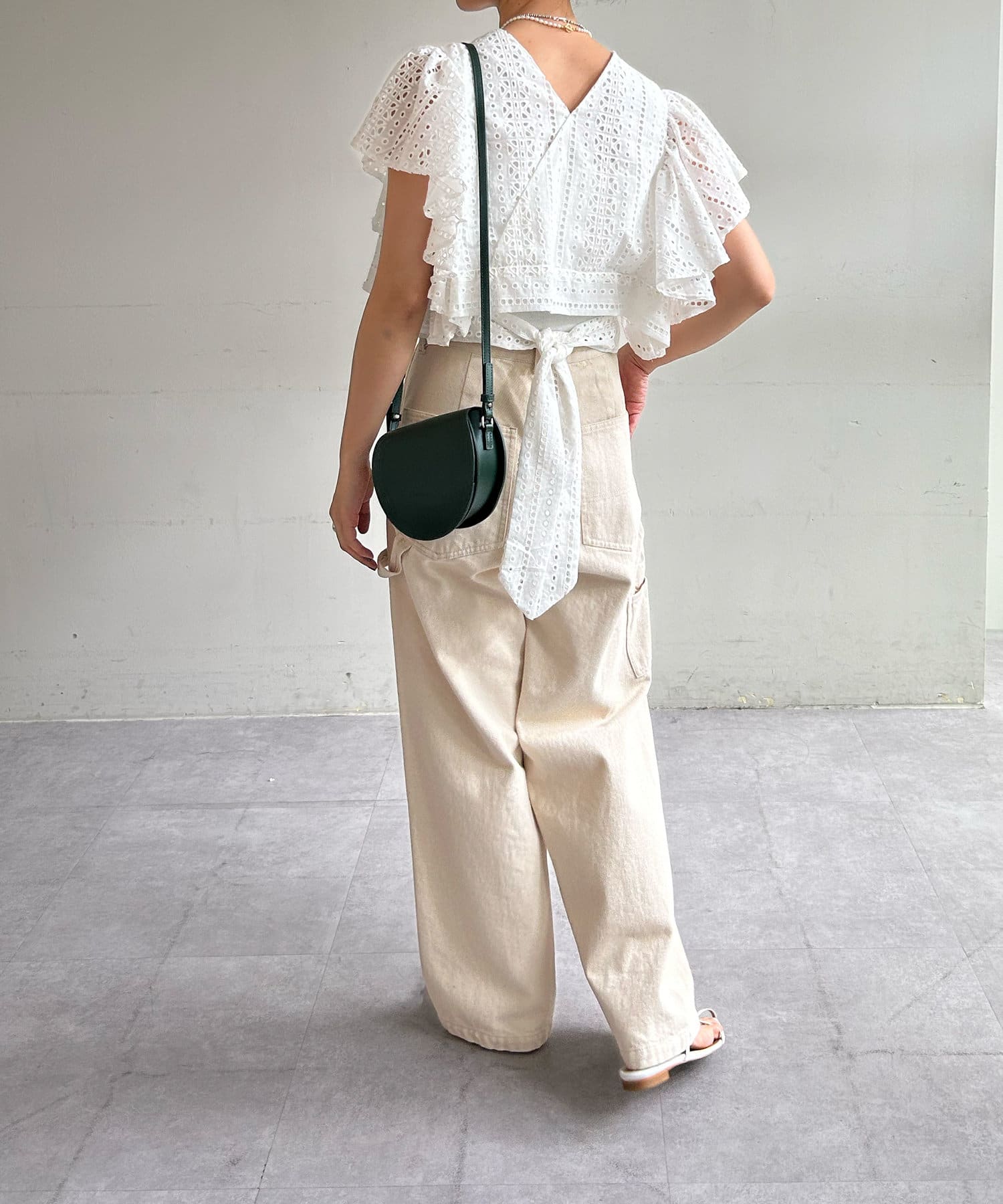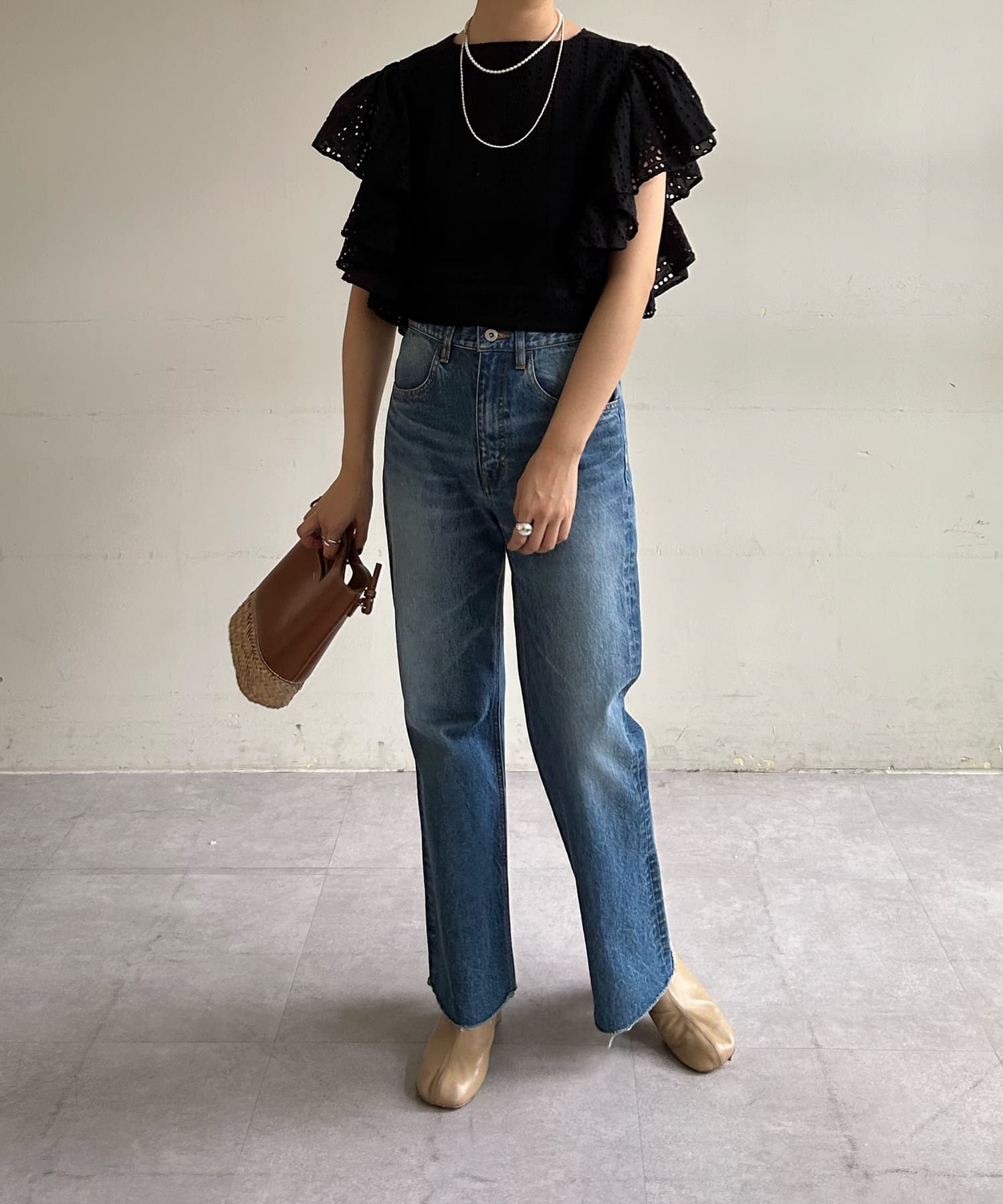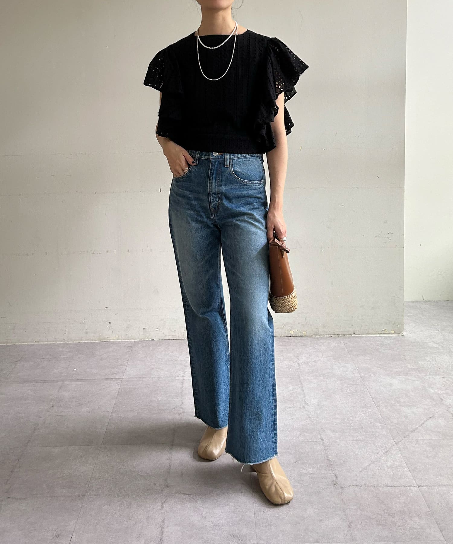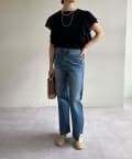 クロップド丈なので、ハイウエストボトムやサロペットとのコーディネートがおすすめです。