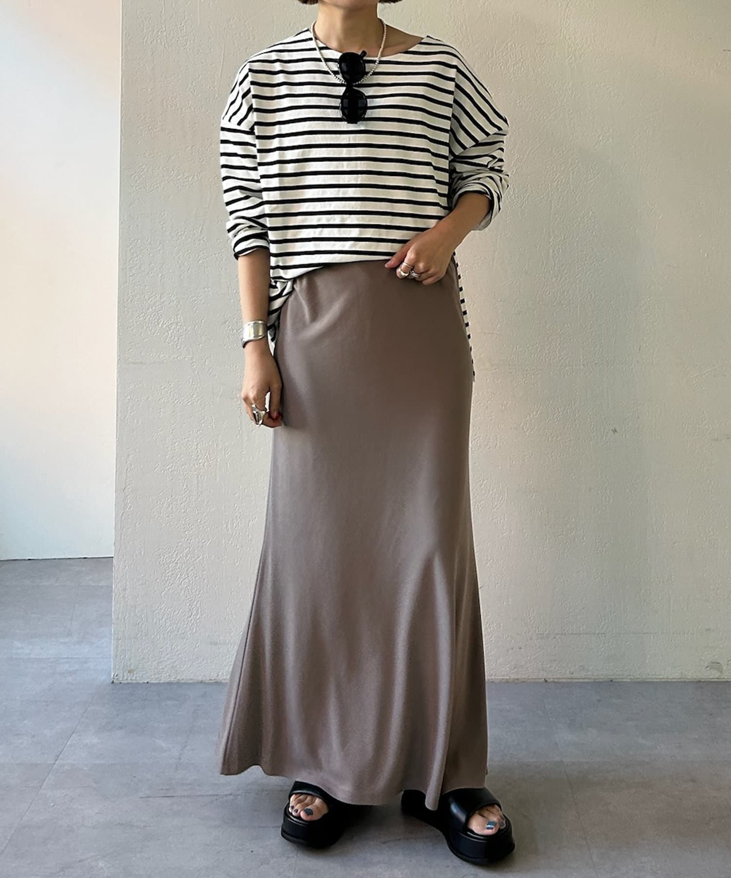※生地をバイヤスに取っている為、着丈に若干の個体差が生じることがあります。ハンガーで吊った状態で保管すると伸びる可能性もありますので、ご注意ください。