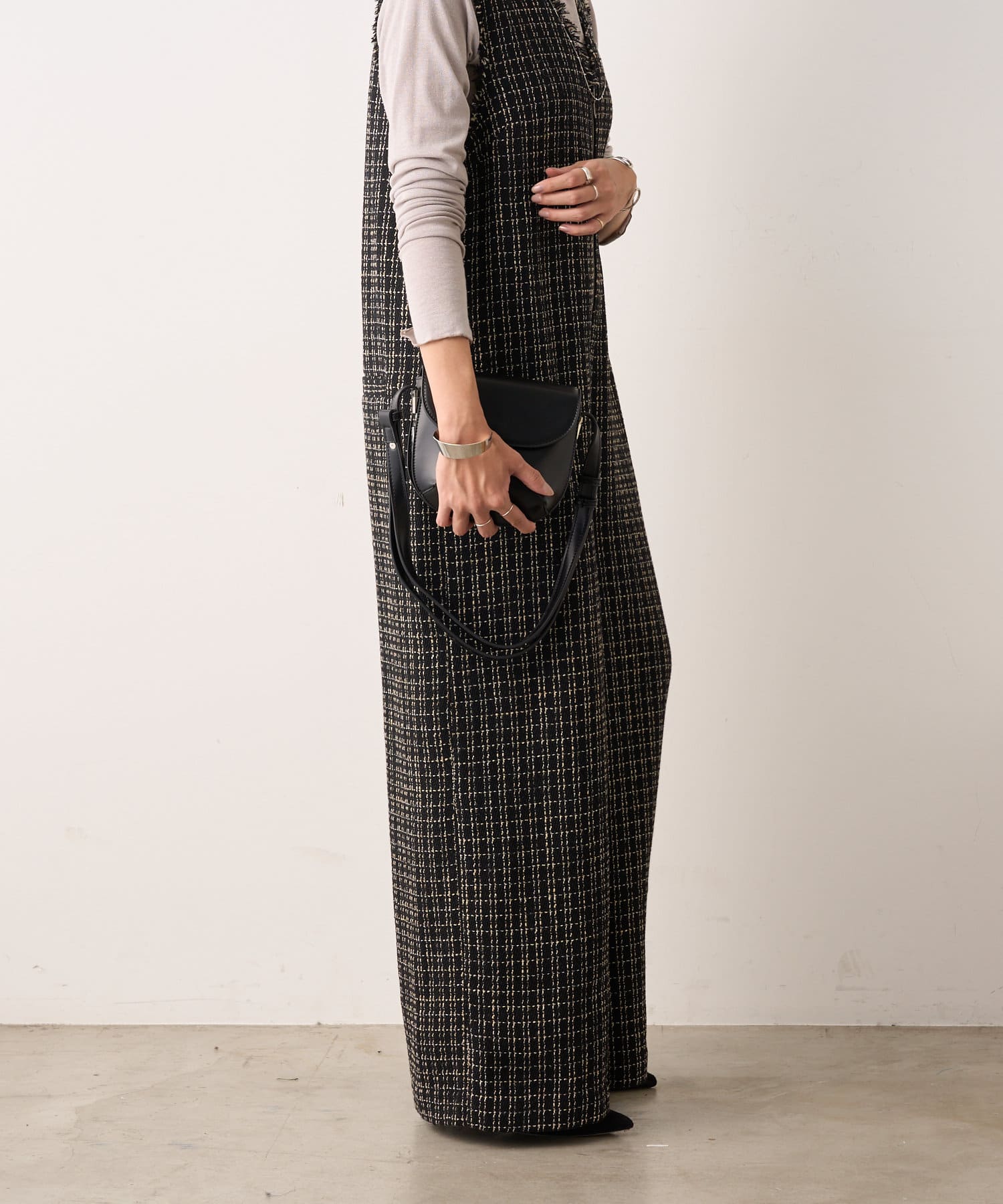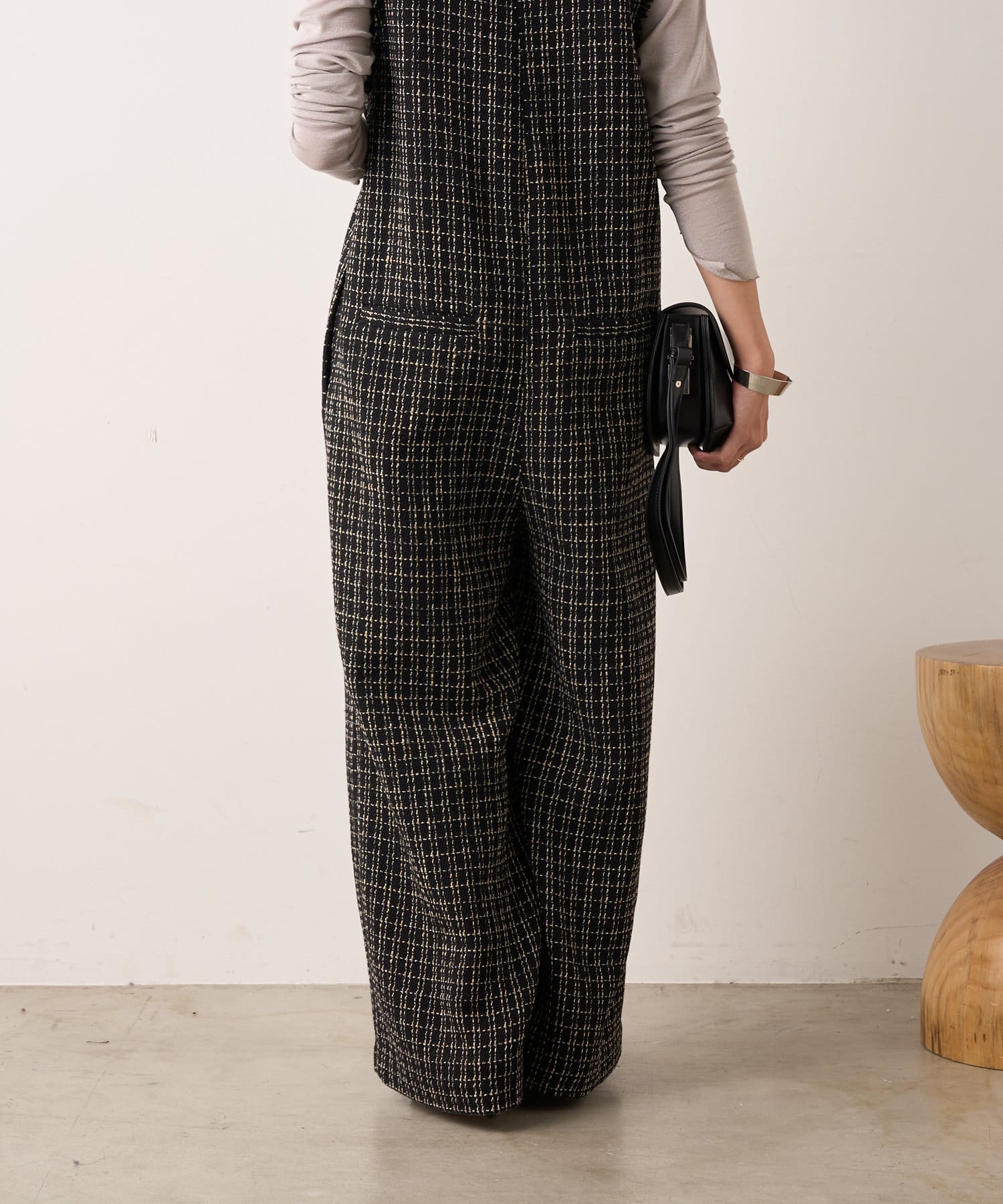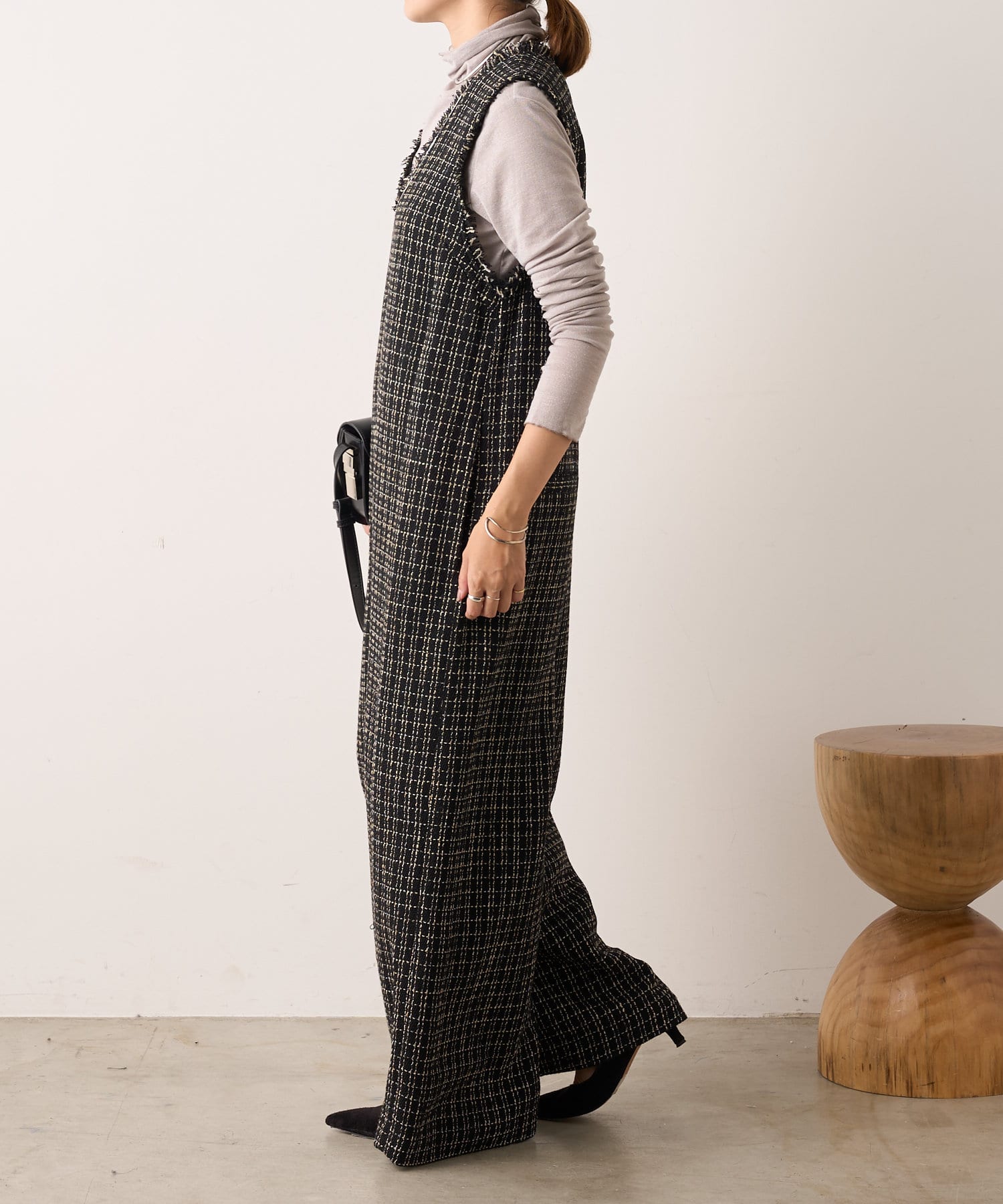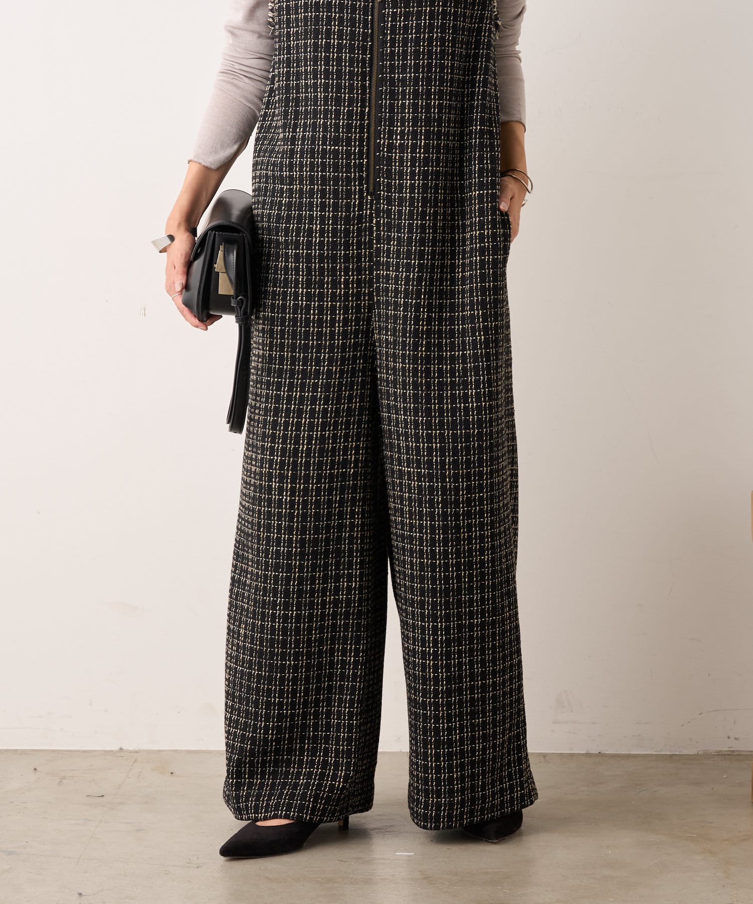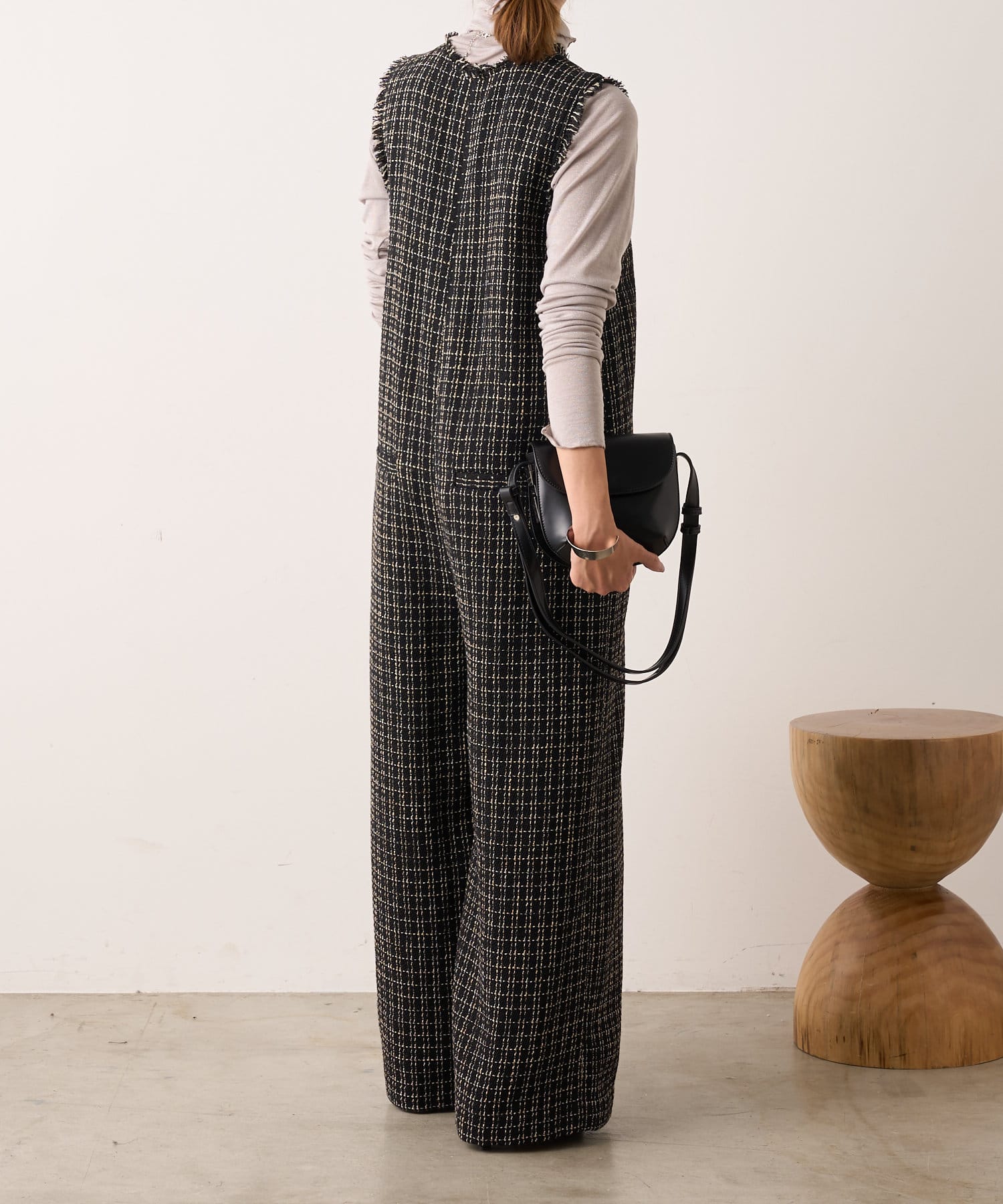 ・表面感のかわいいツイード生地を使用したルーズシルエットのサロペット