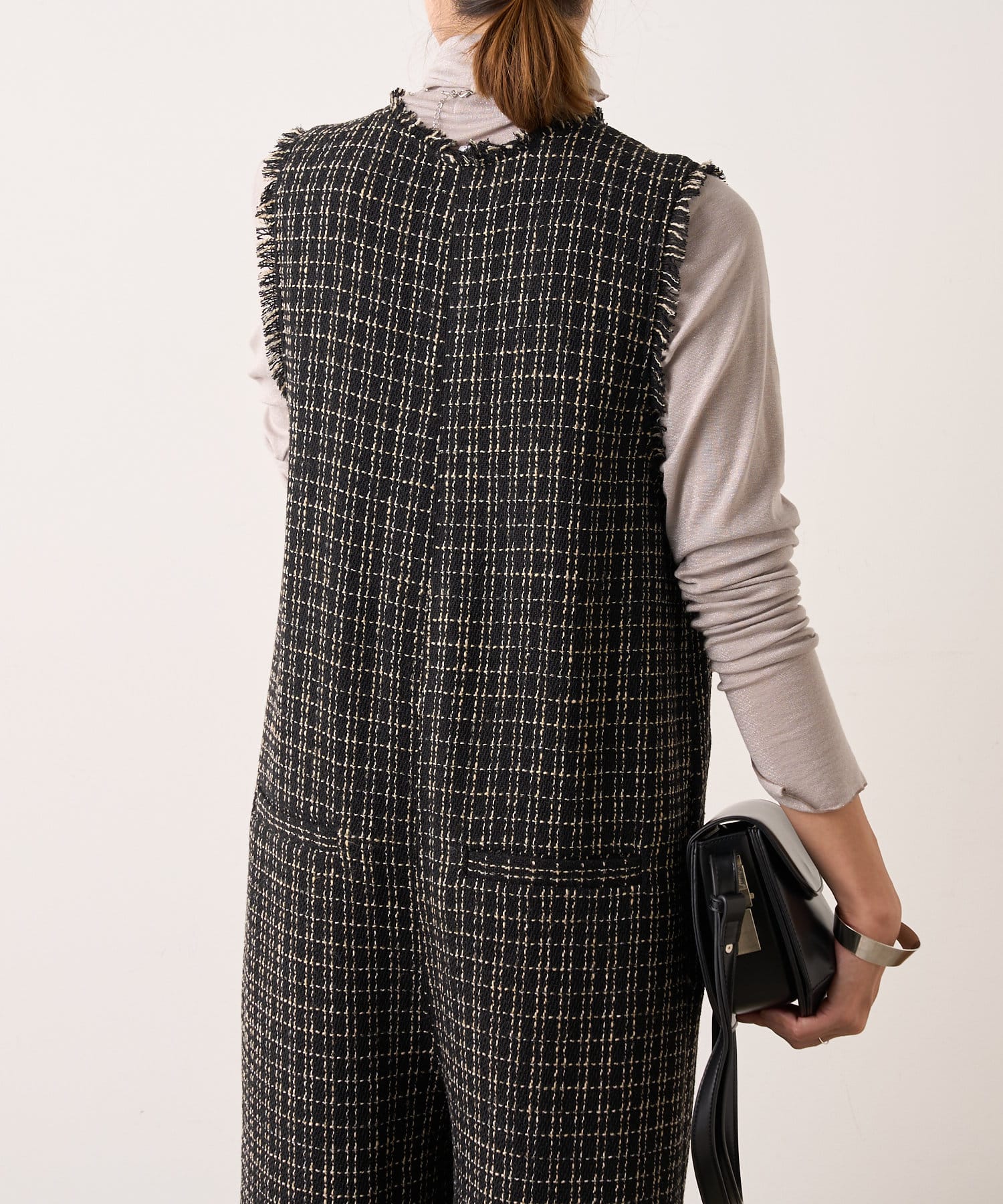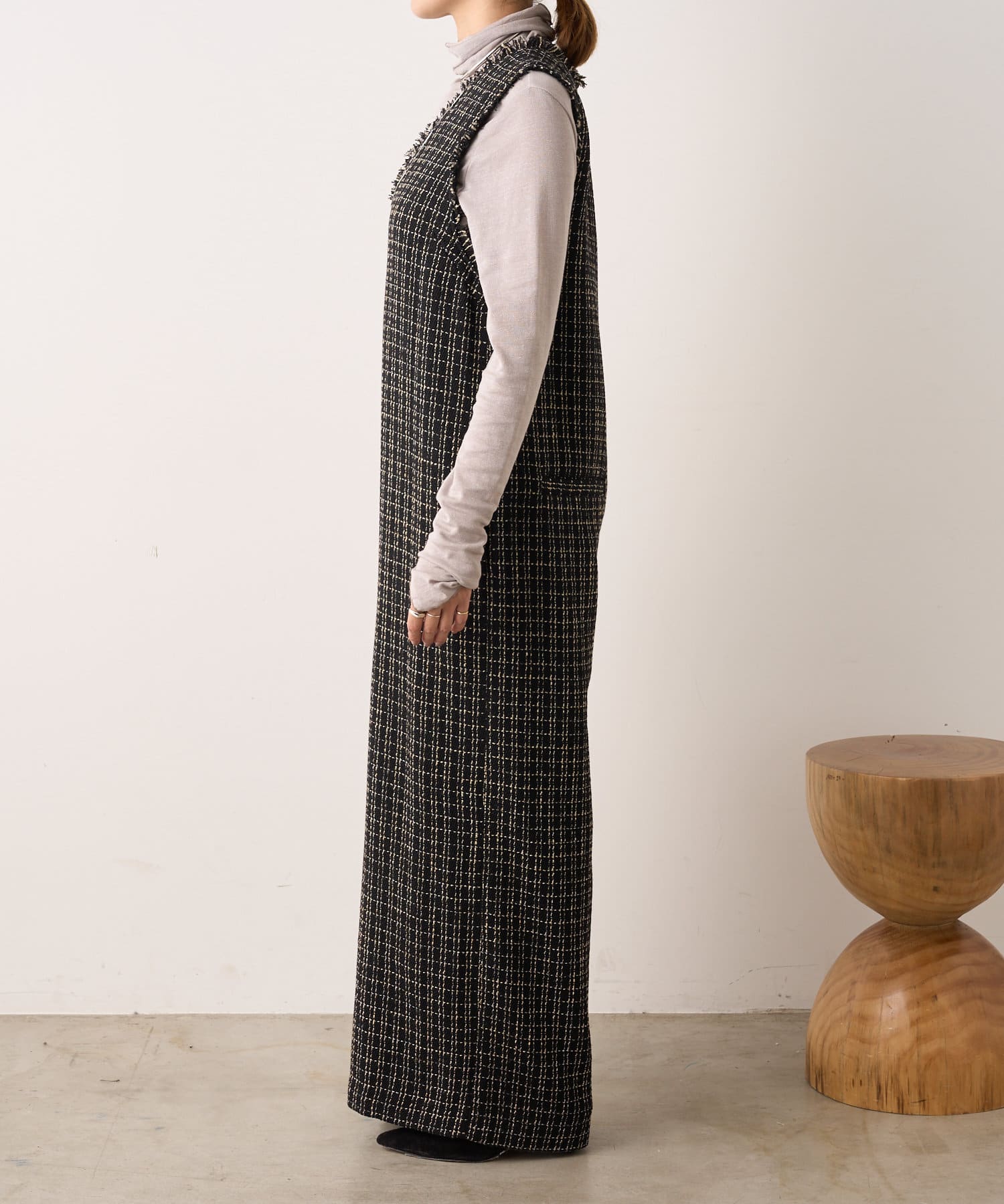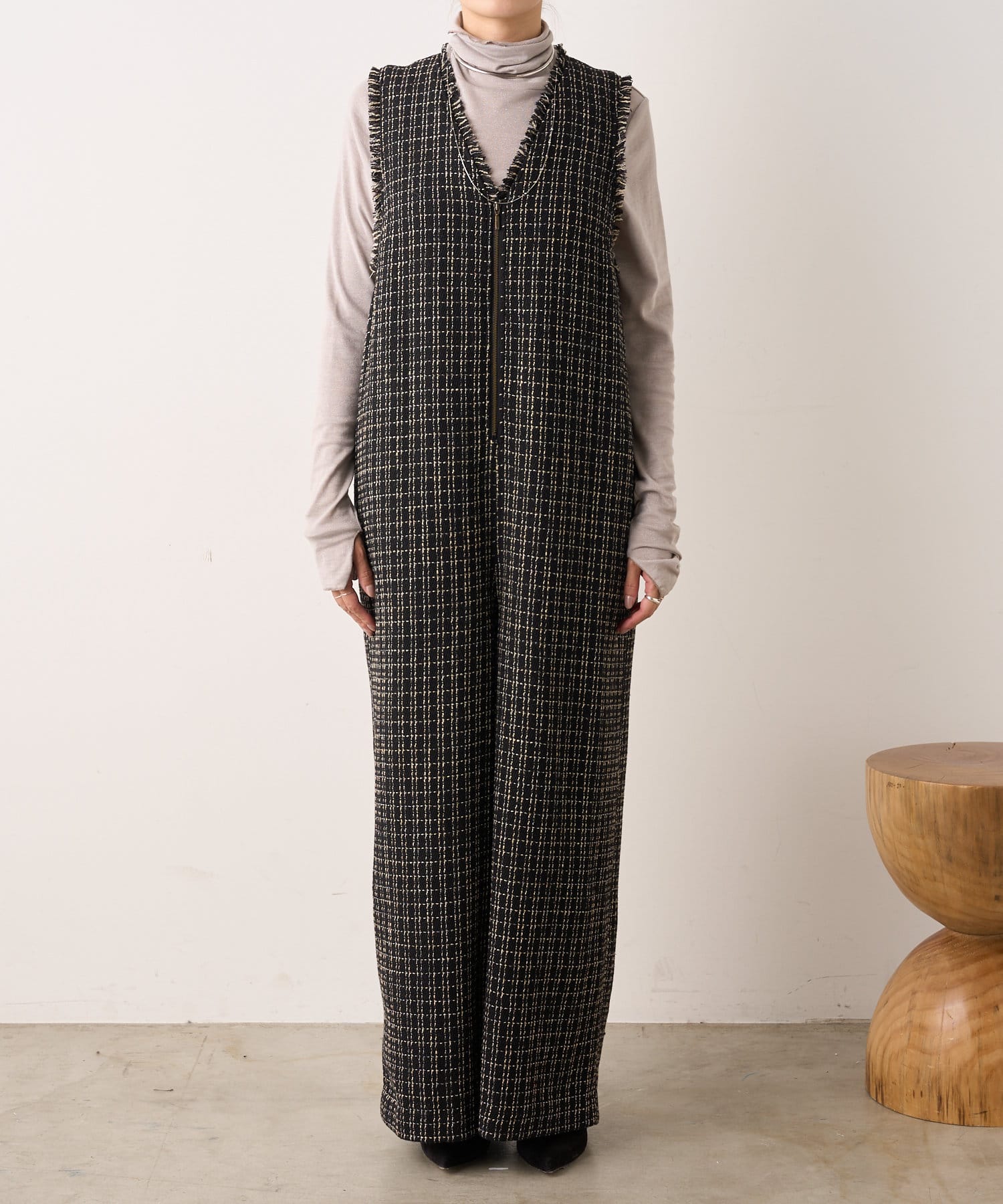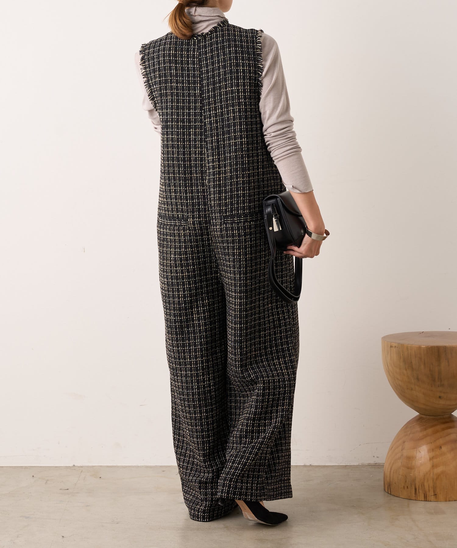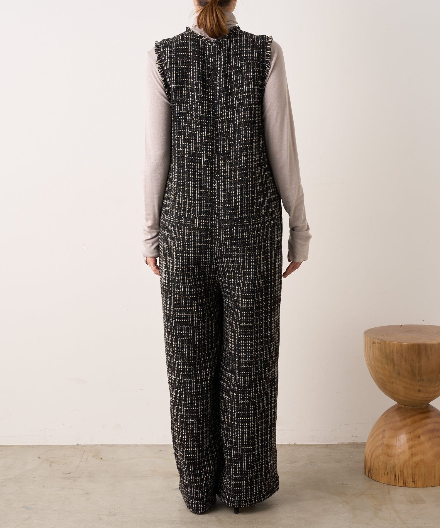・表面感のかわいいツイード生地を使用したルーズシルエットのサロペット