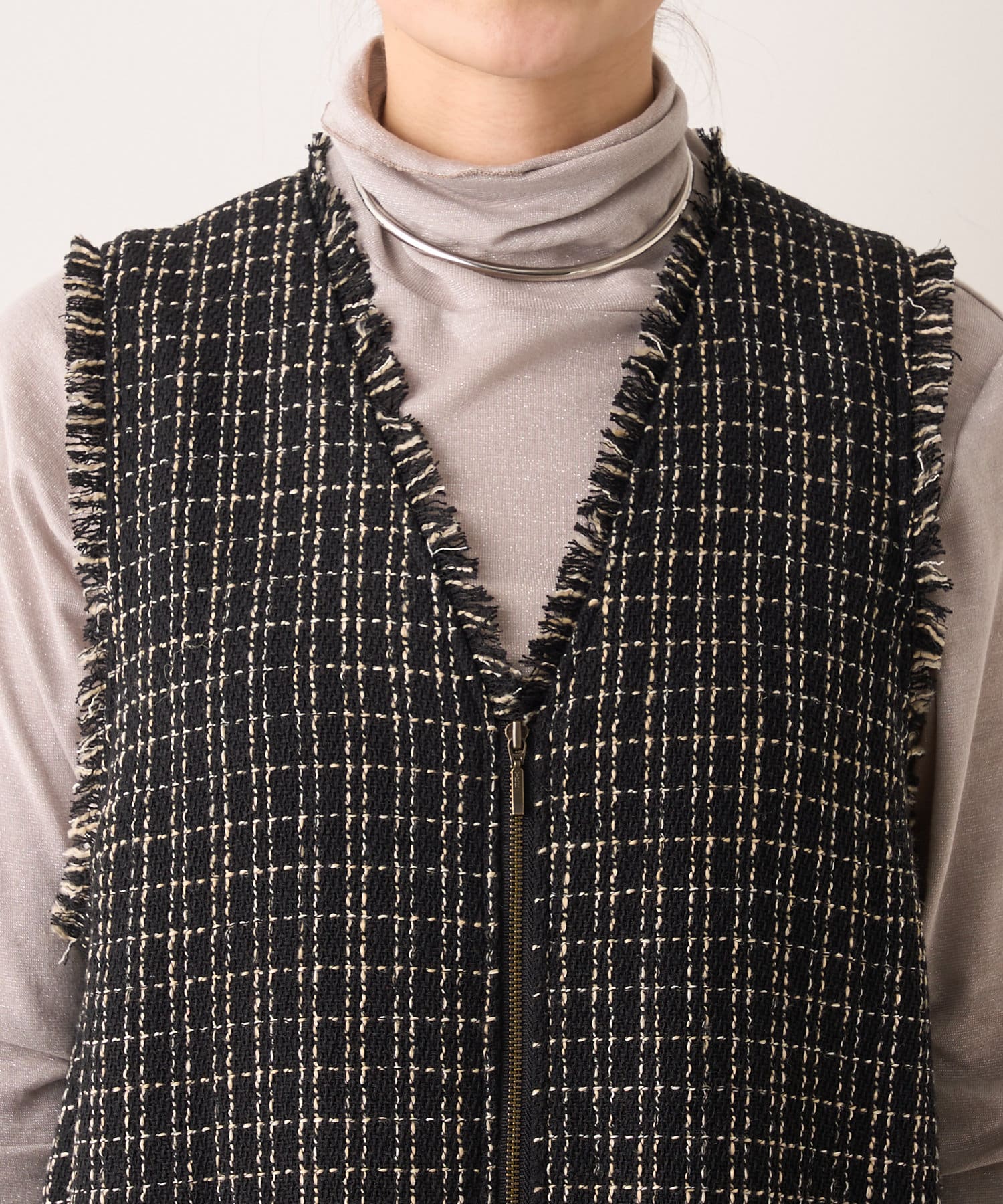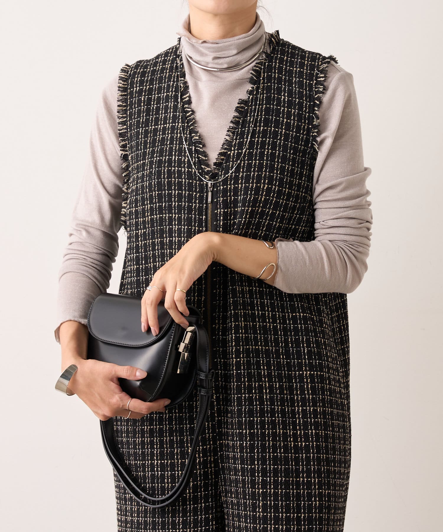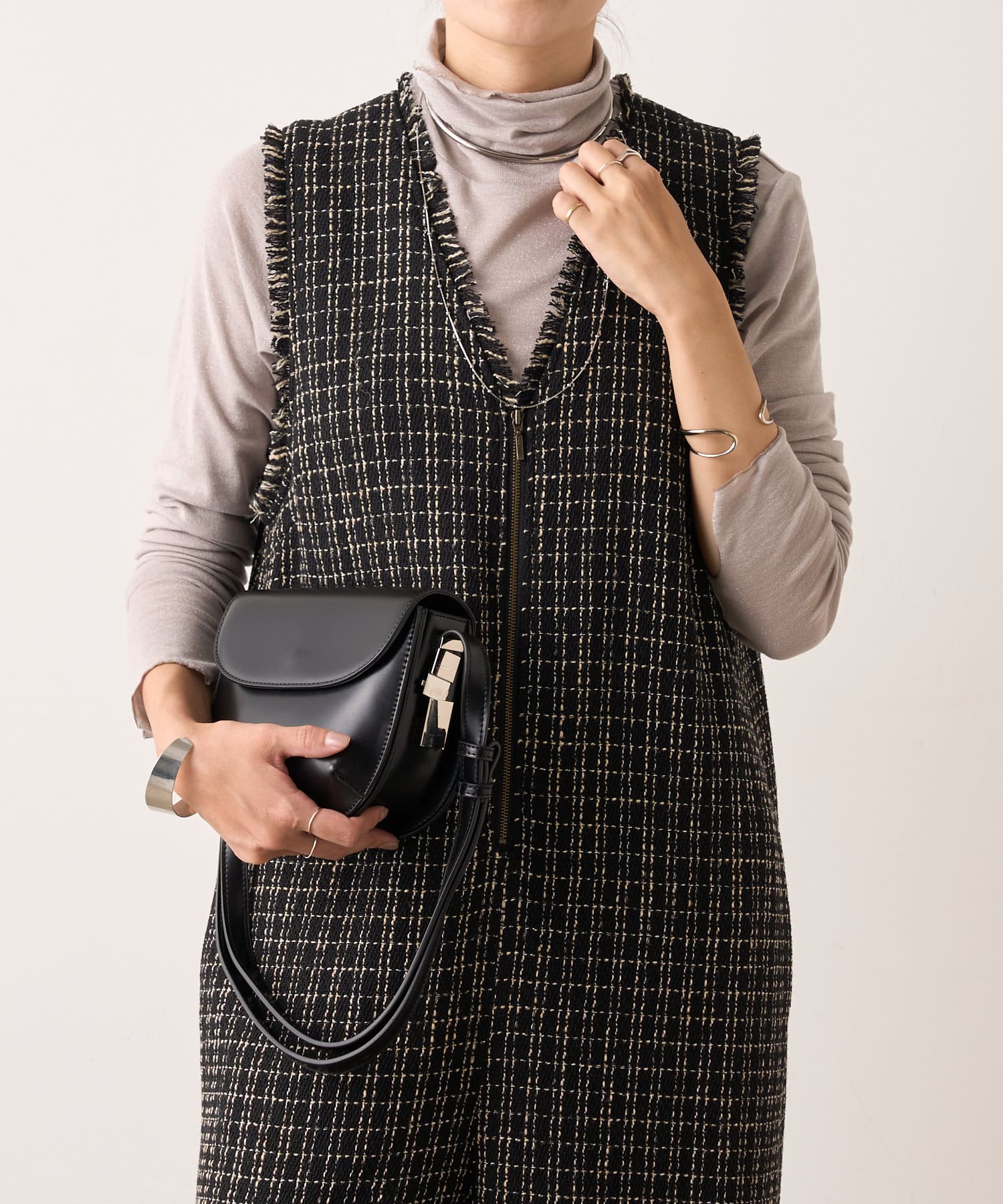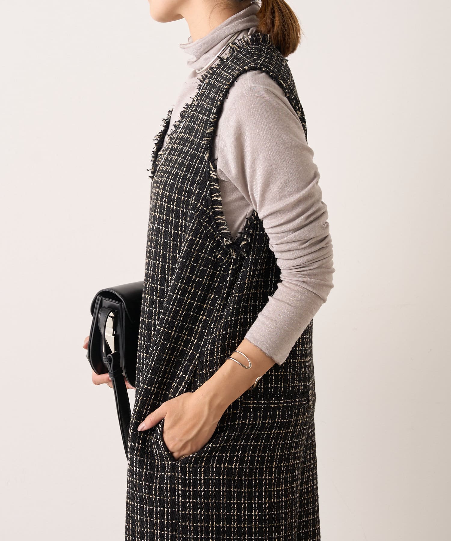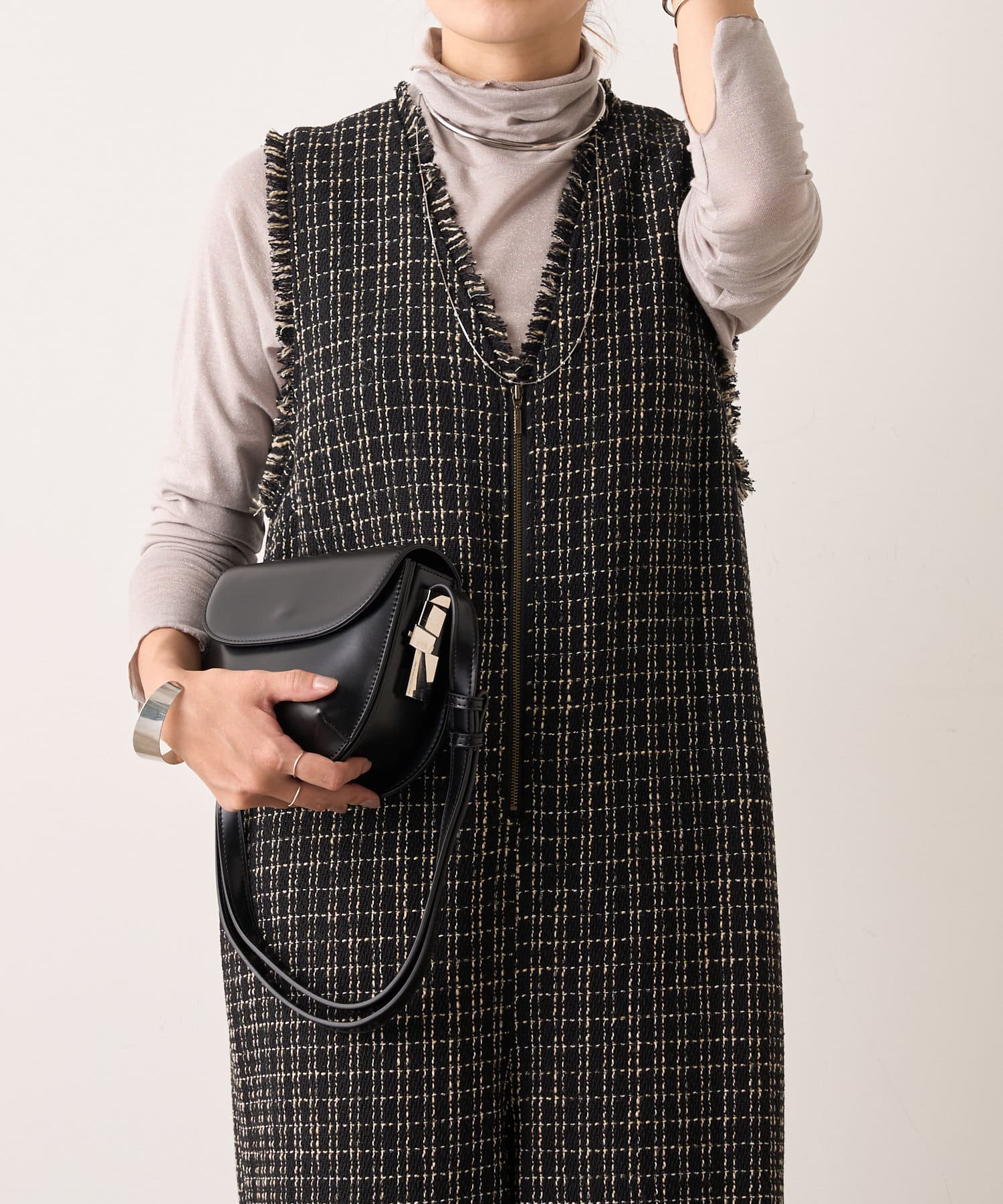 ・表面感のかわいいツイード生地を使用したルーズシルエットのサロペット