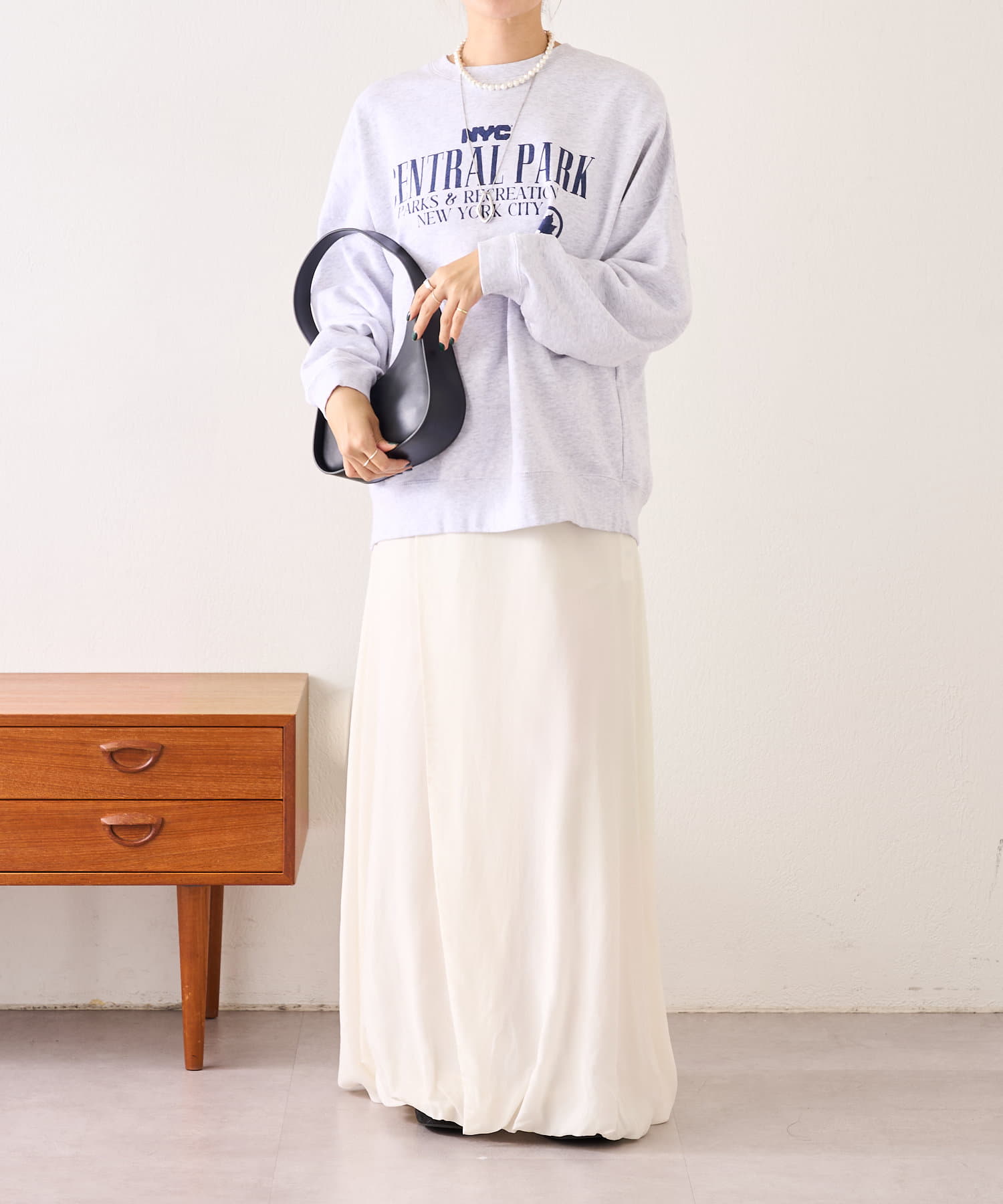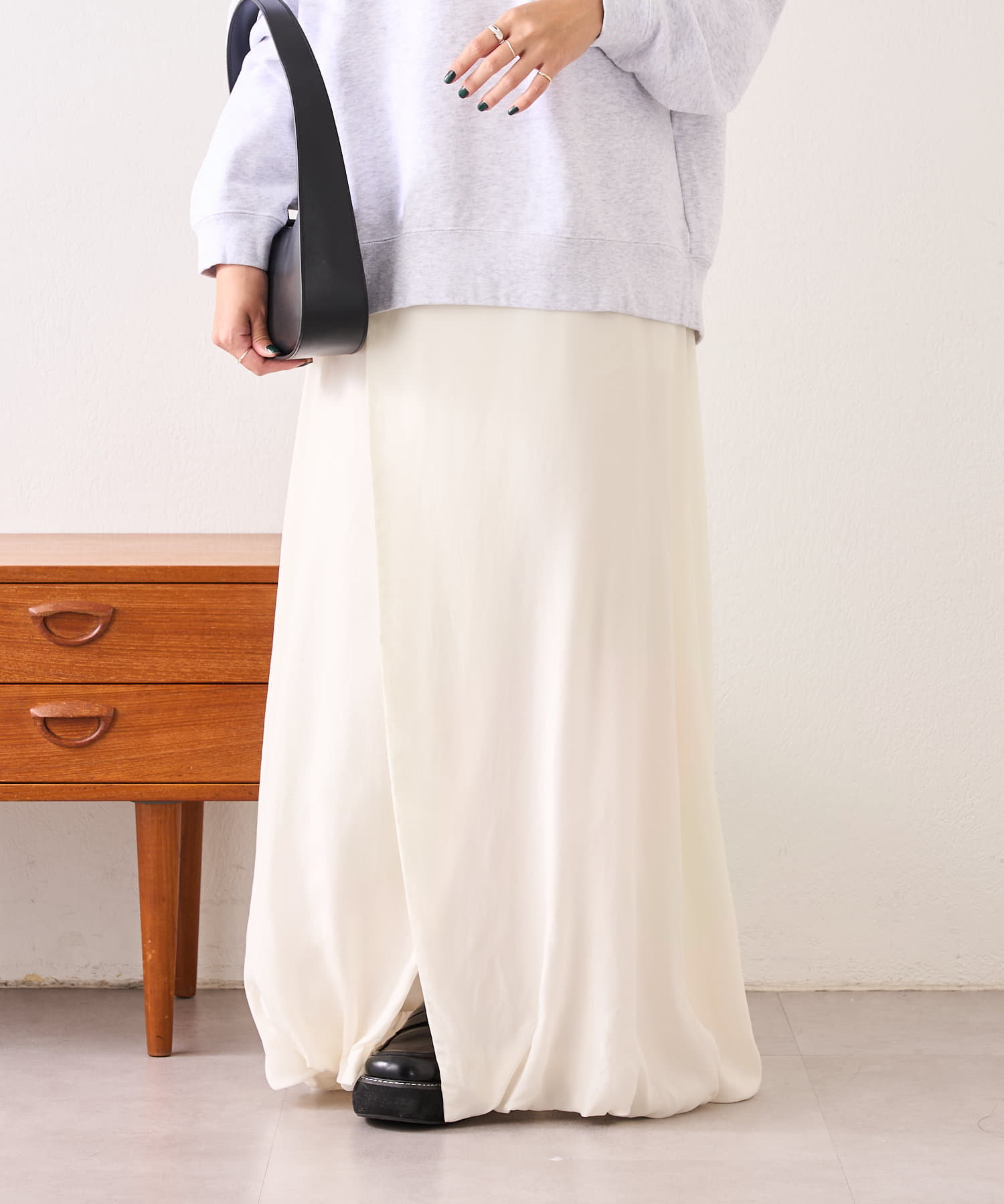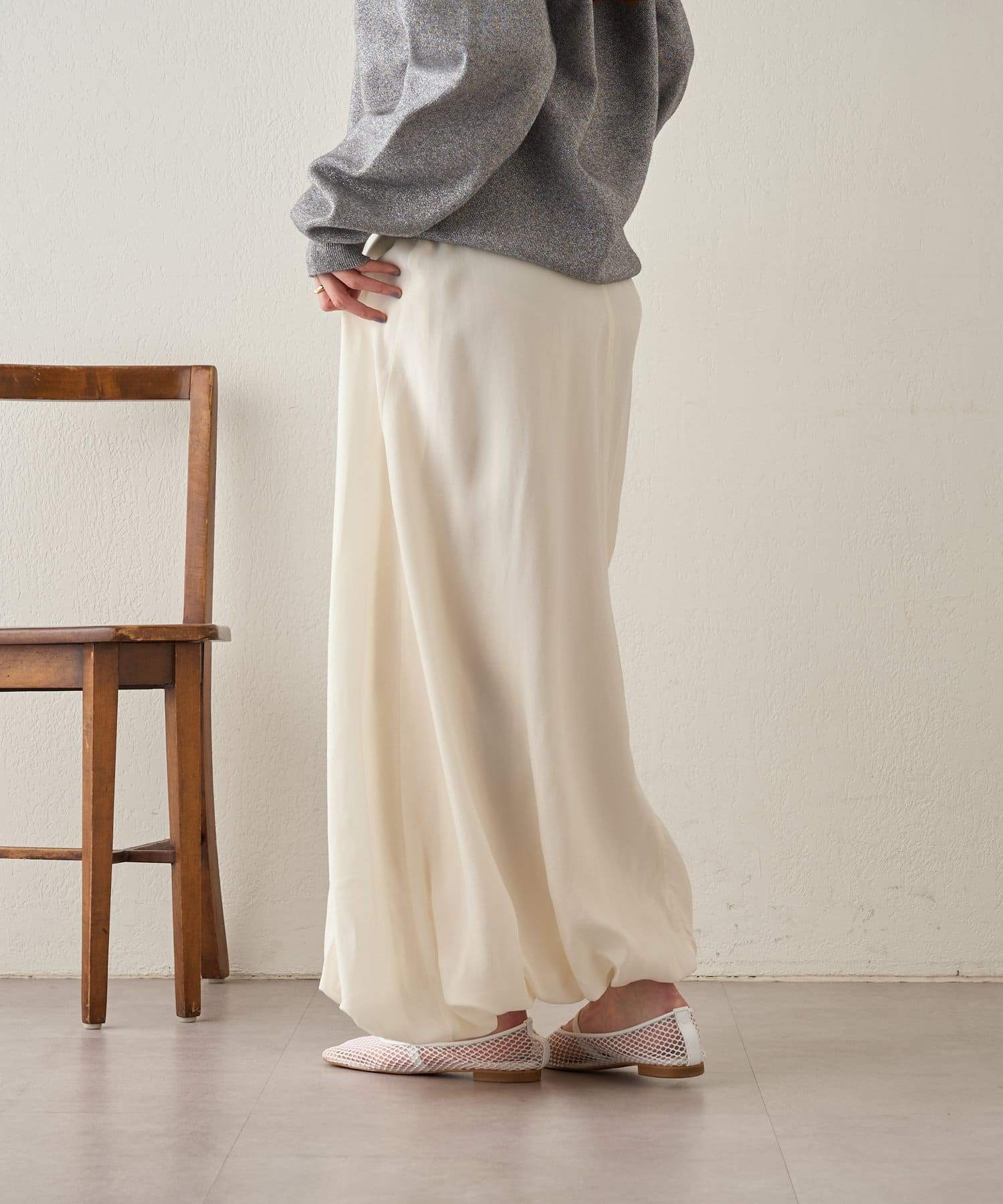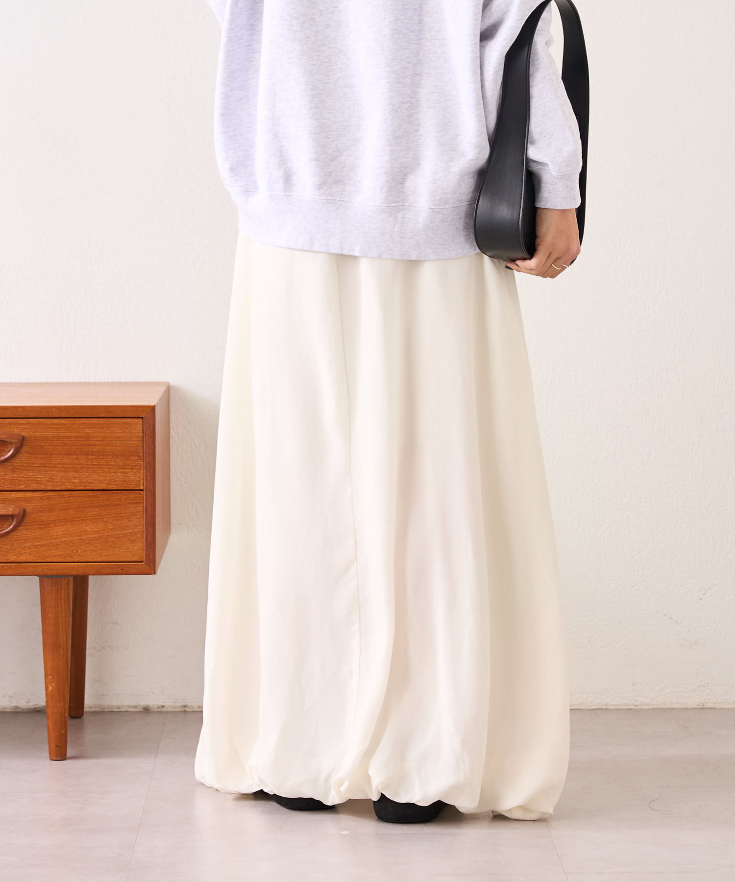 トレンドだから取り入れてみたい!と思いつつ、ボリュームが出すぎるとうまくコーディネートが出来ない。。。なんてお悩みの方も多いはず! 落ち感がありストレートシルエットのバルーンスカートが登場です。