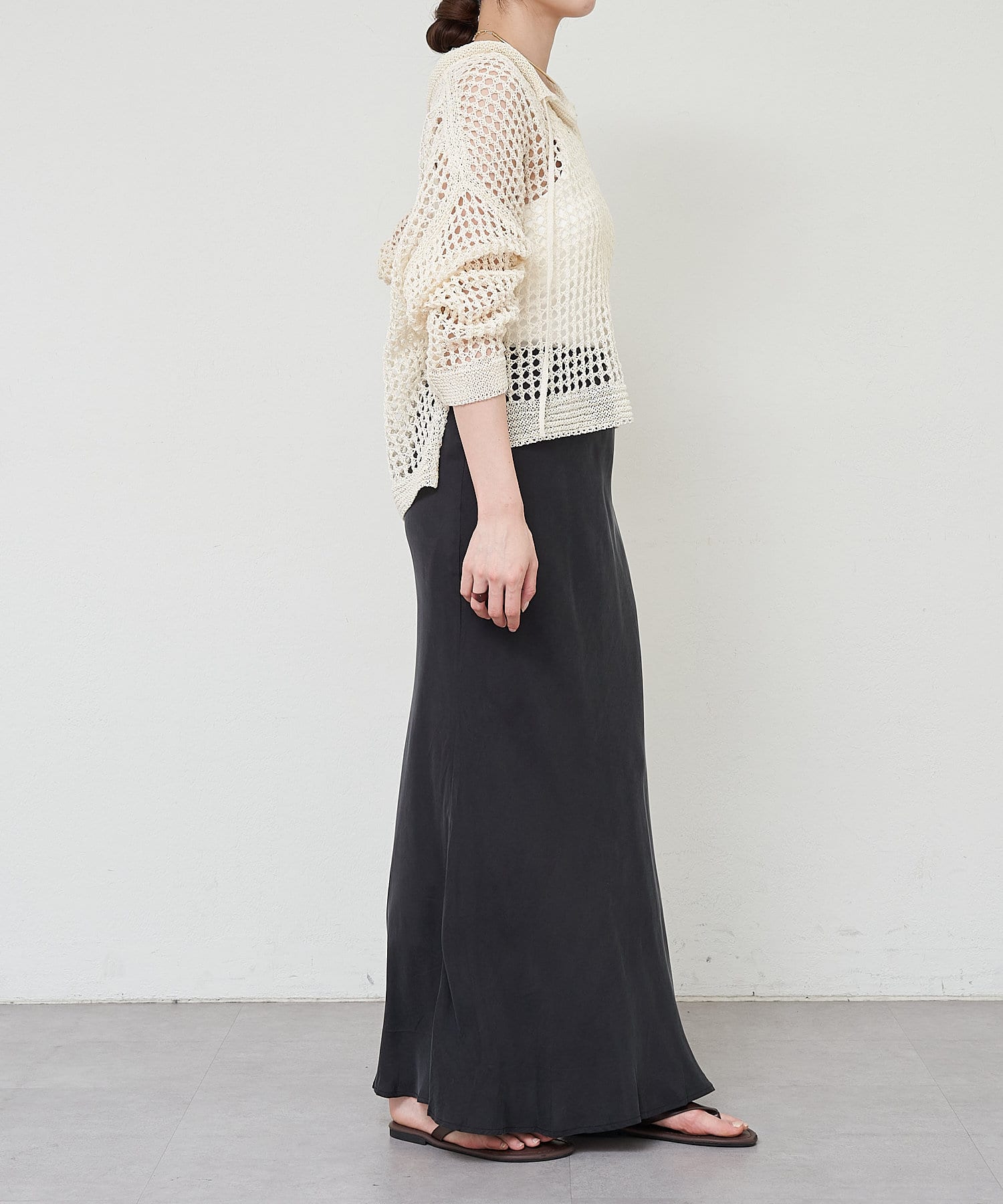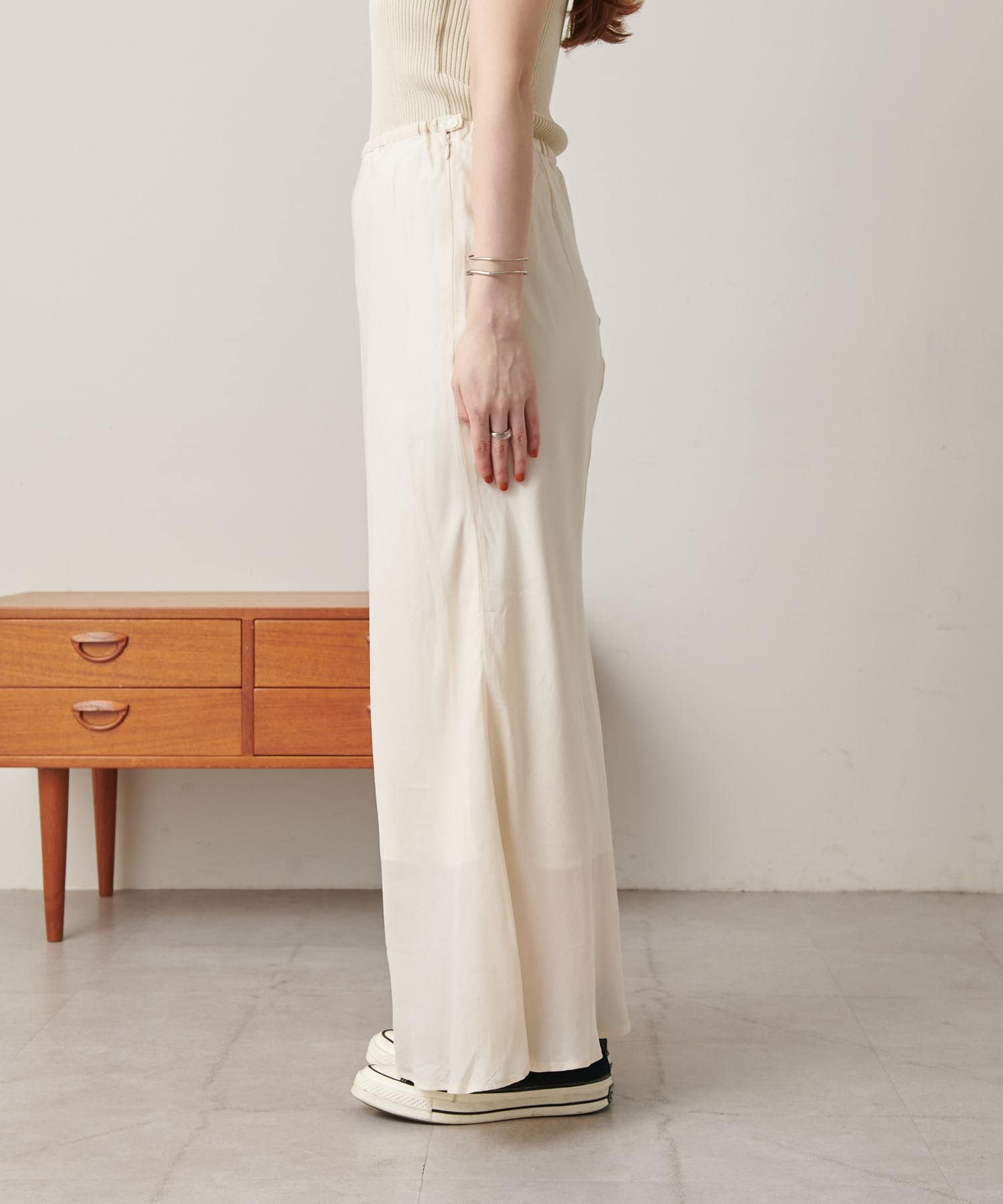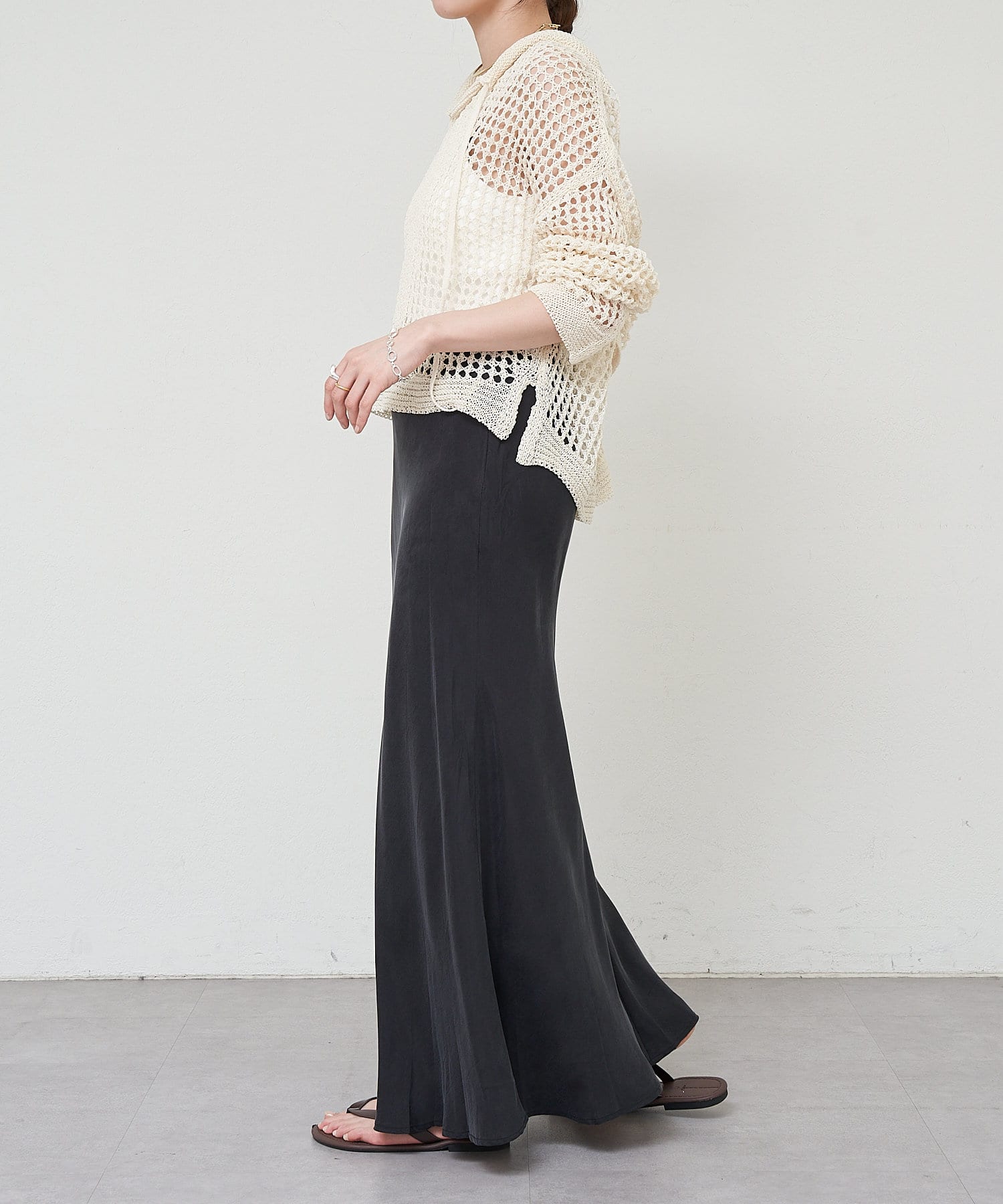 ほんのりとしたマーメードラインが下半身を綺麗に見せてくれるミニマルな一品になっています。