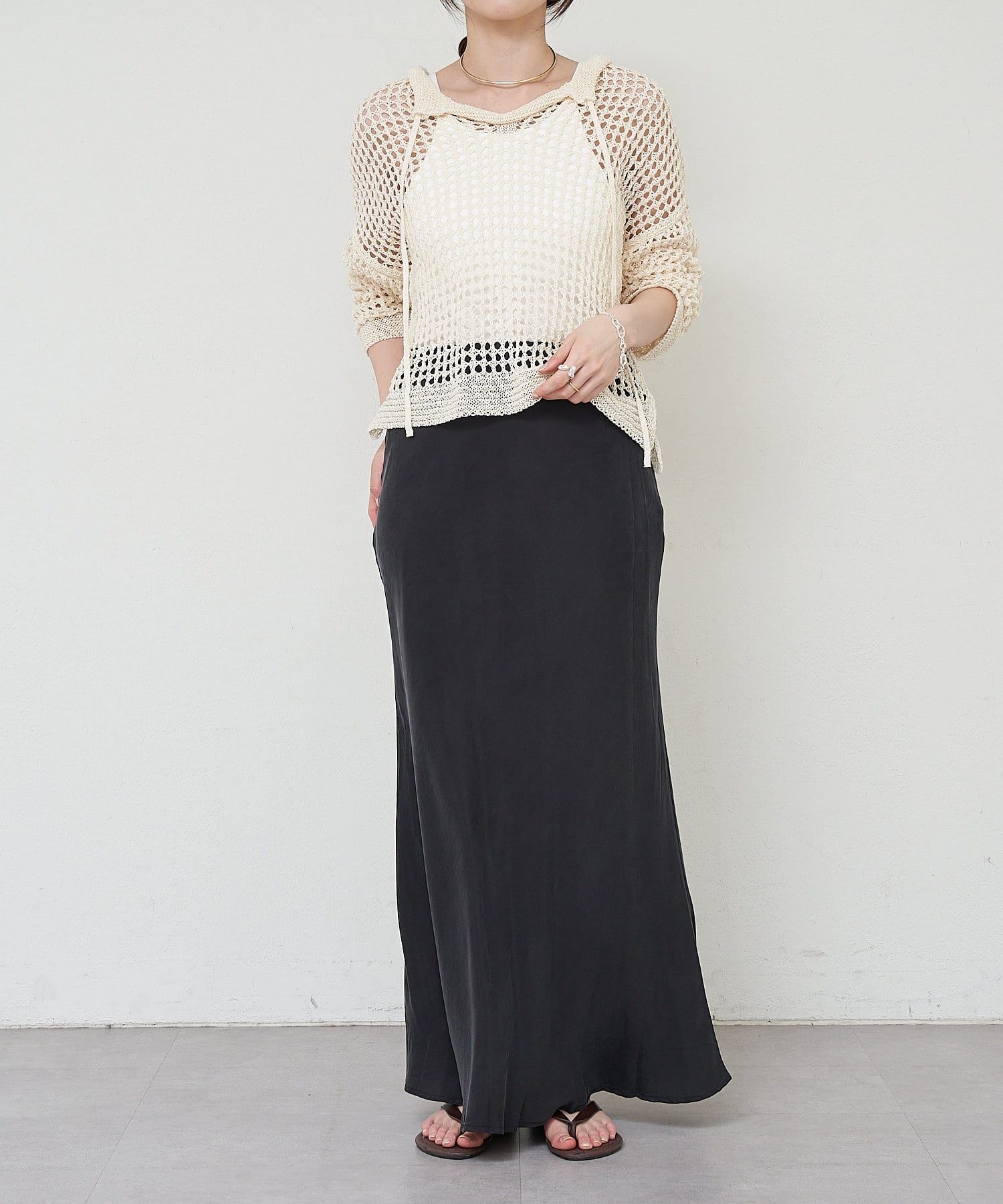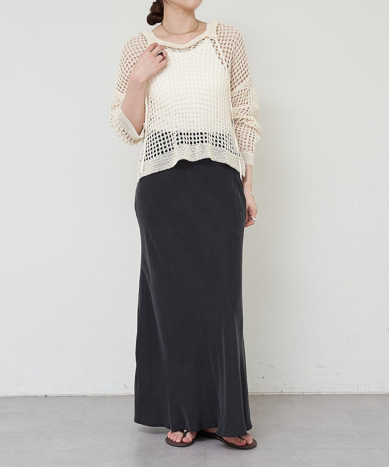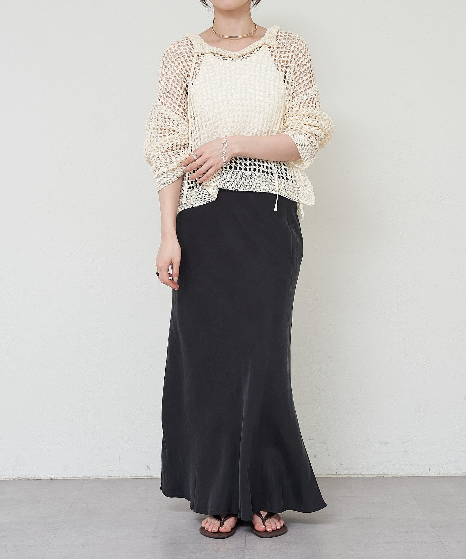 ほんのりとしたマーメードラインが下半身を綺麗に見せてくれるミニマルな一品になっています。