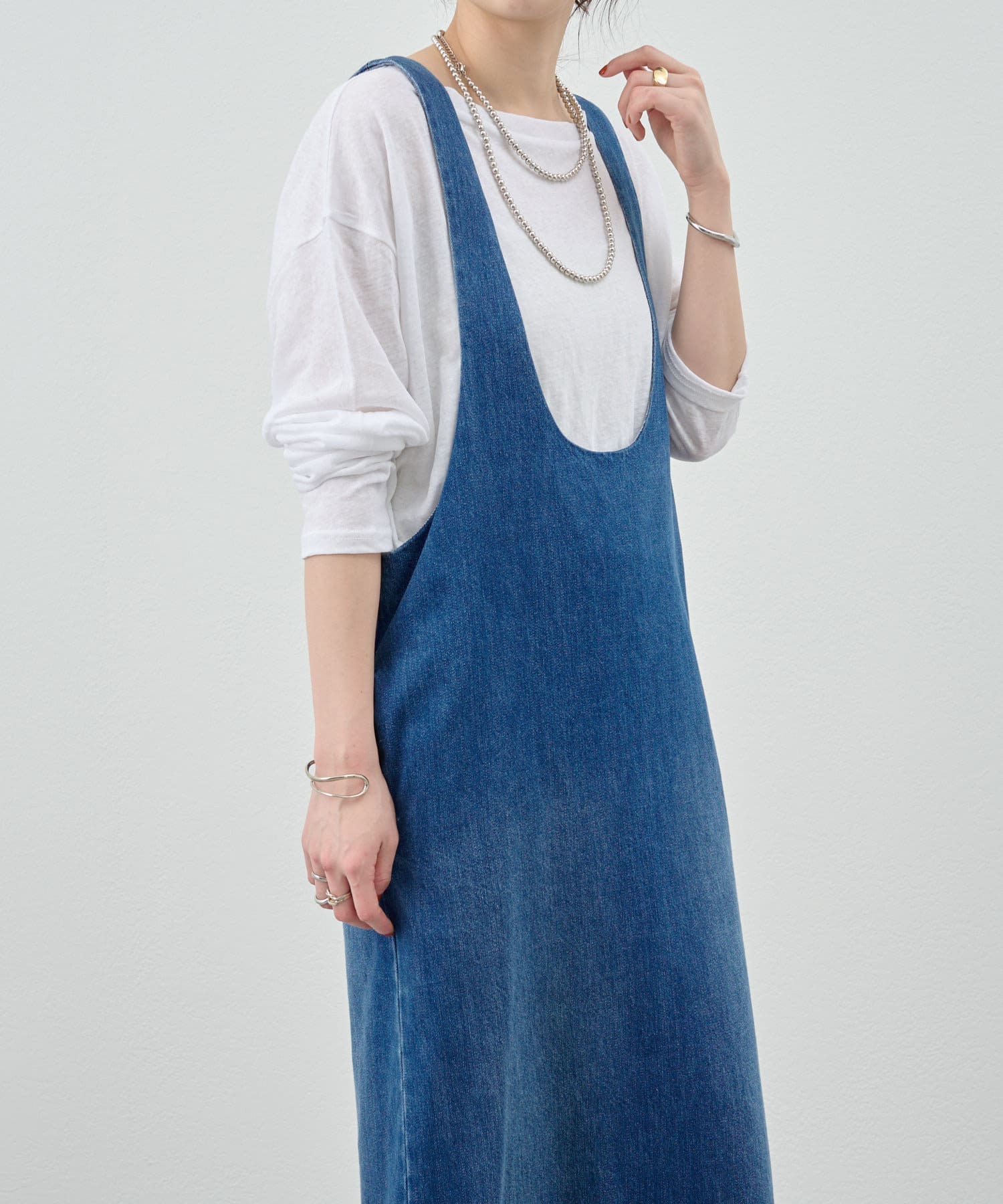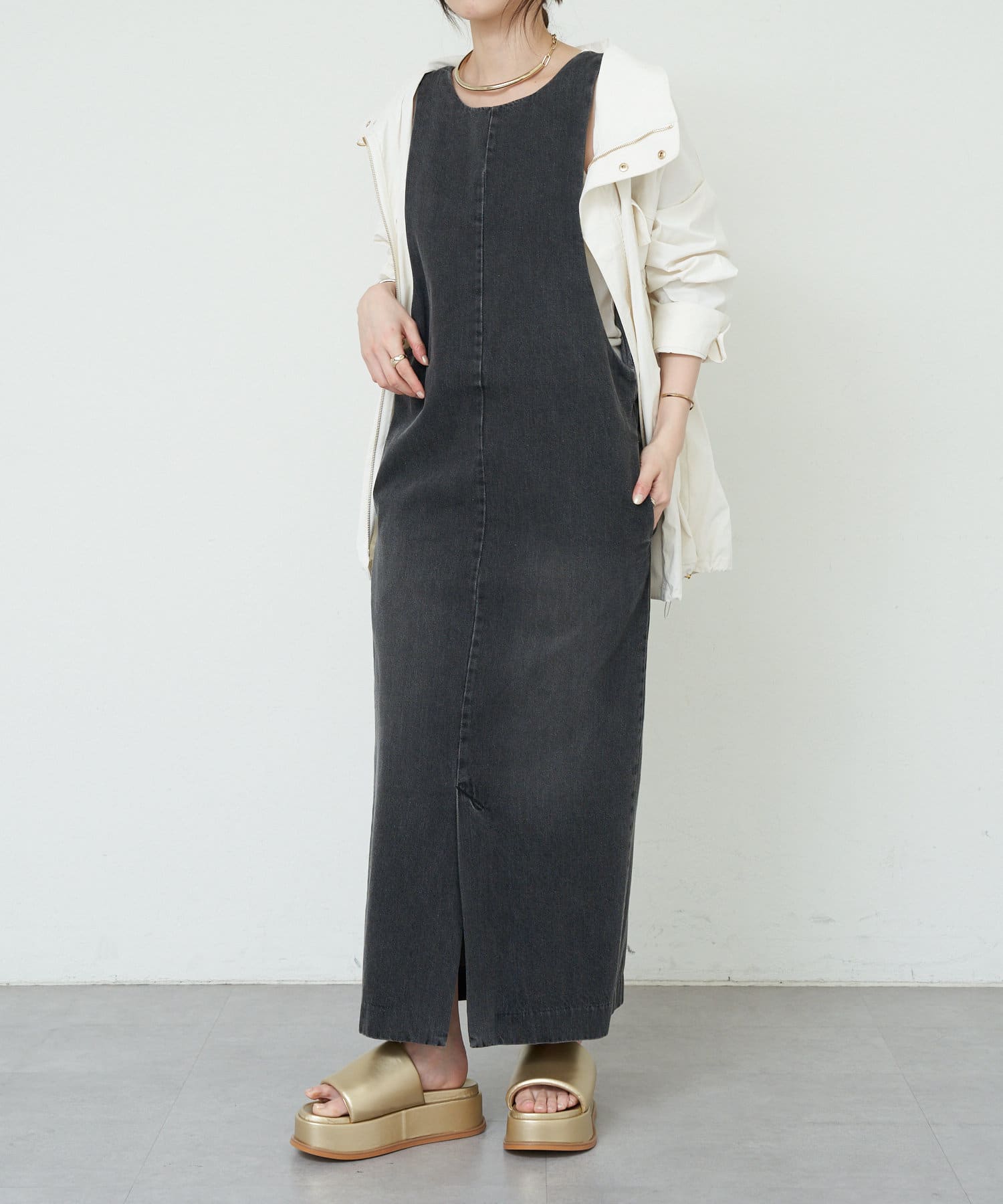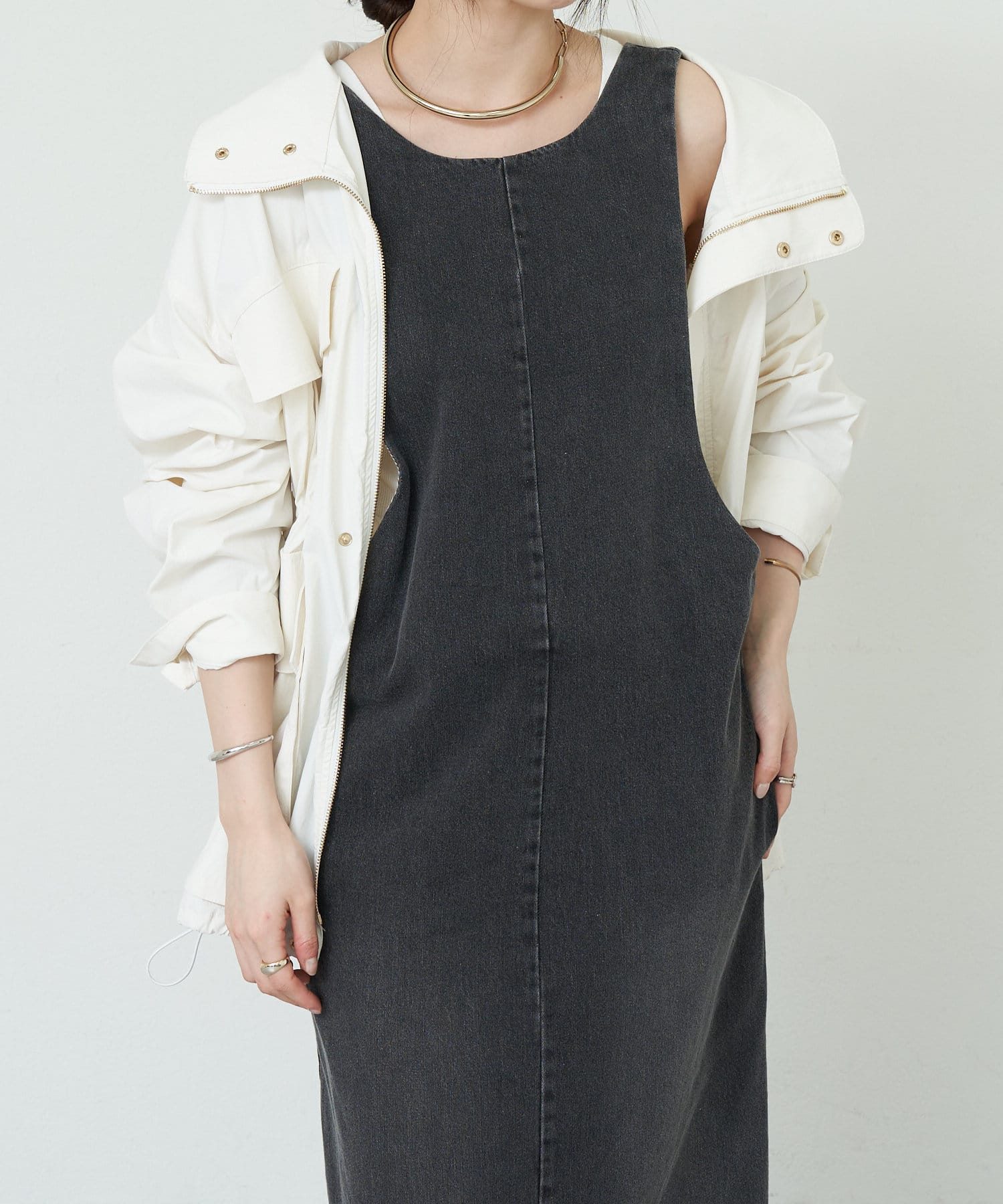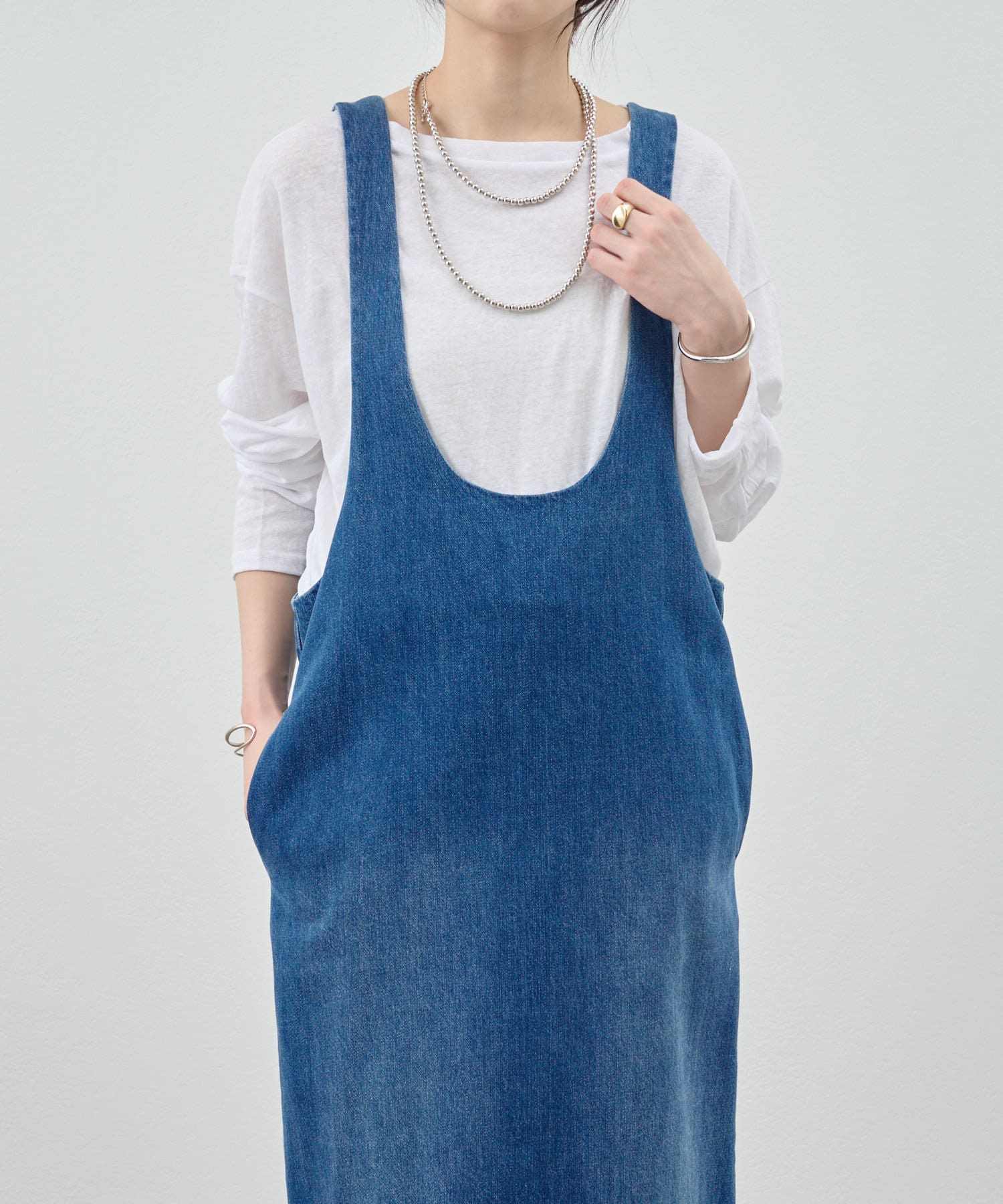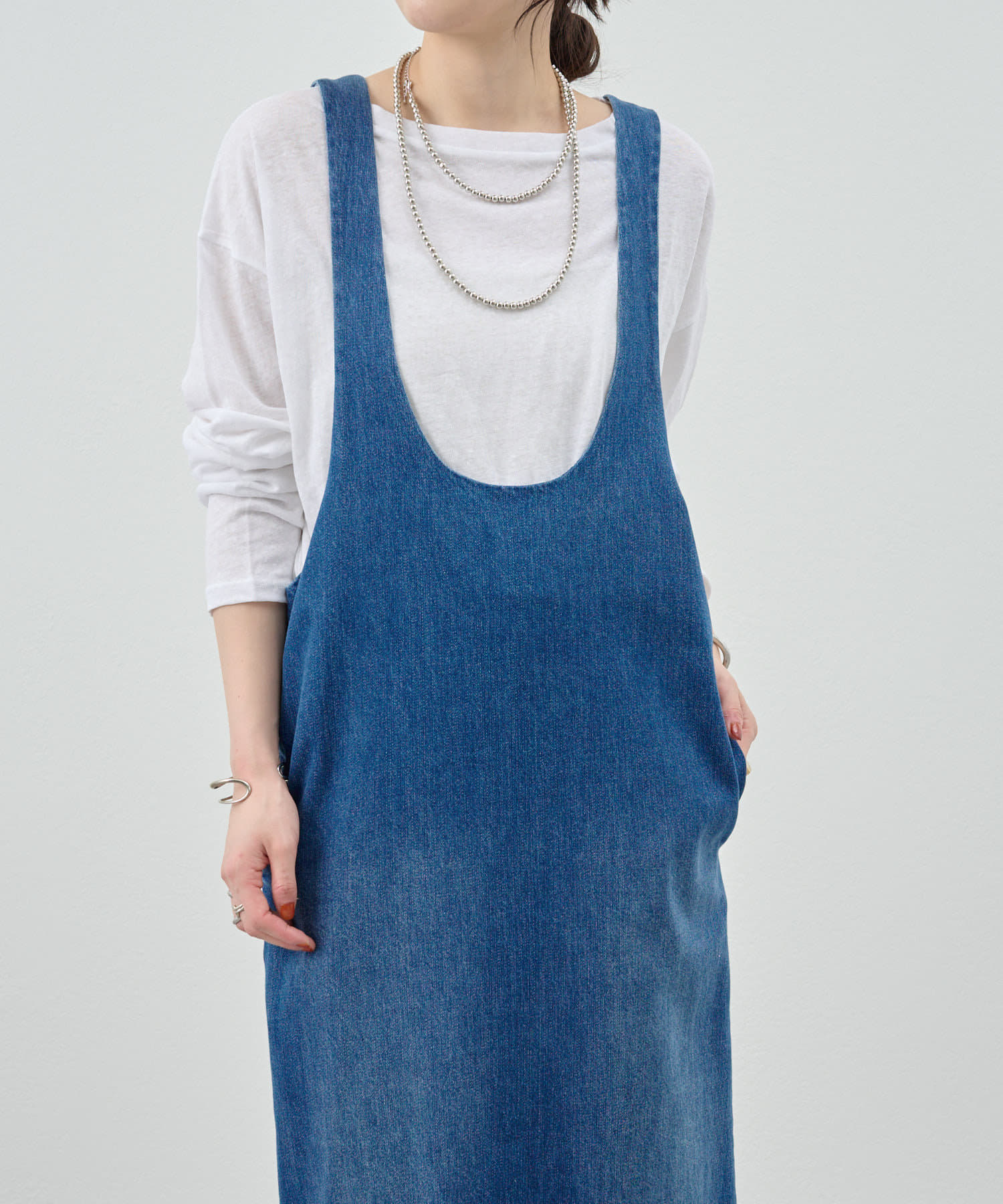 中に合わせるインナーによってさまざまなスタイリングができる万能ワンピース。