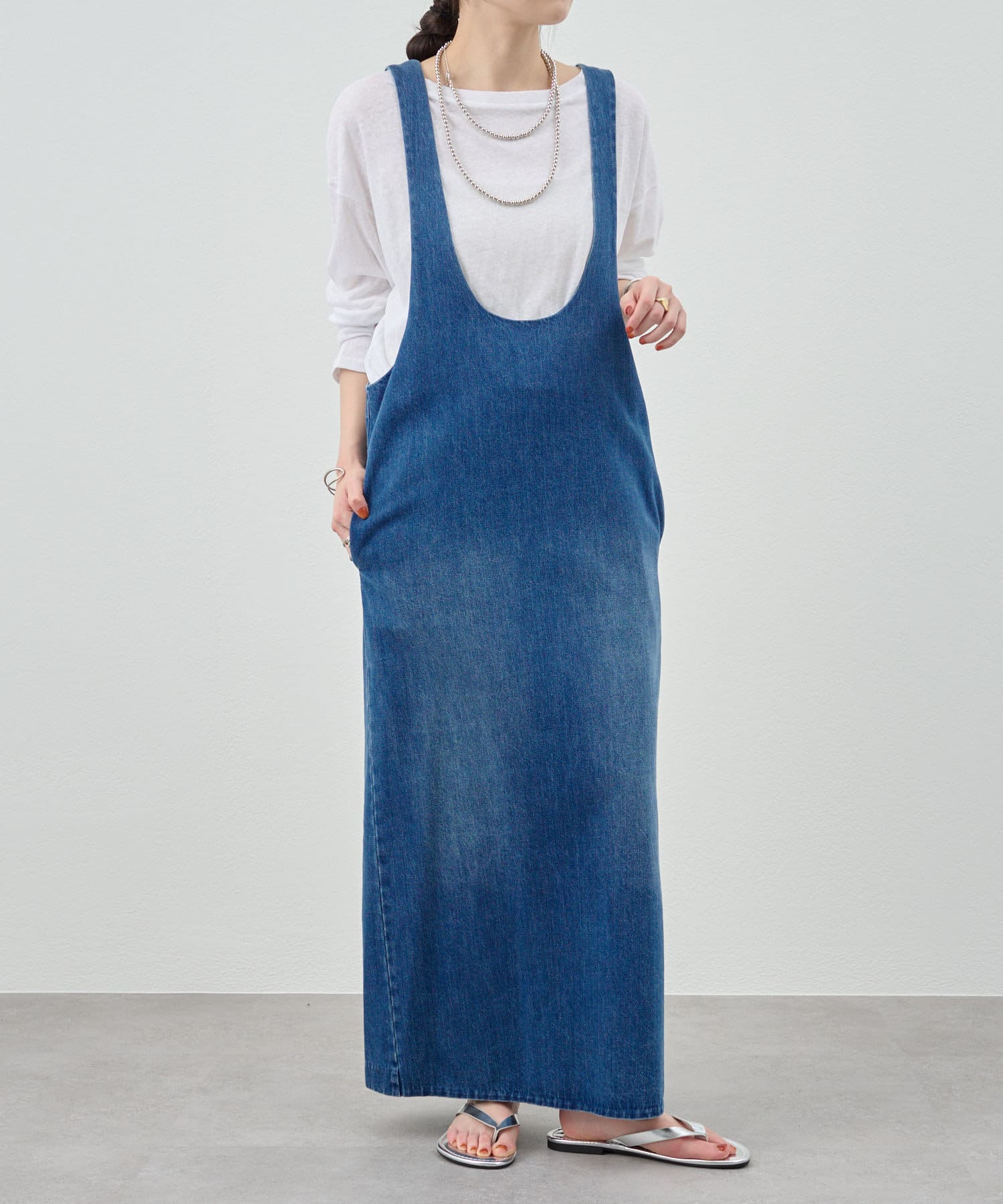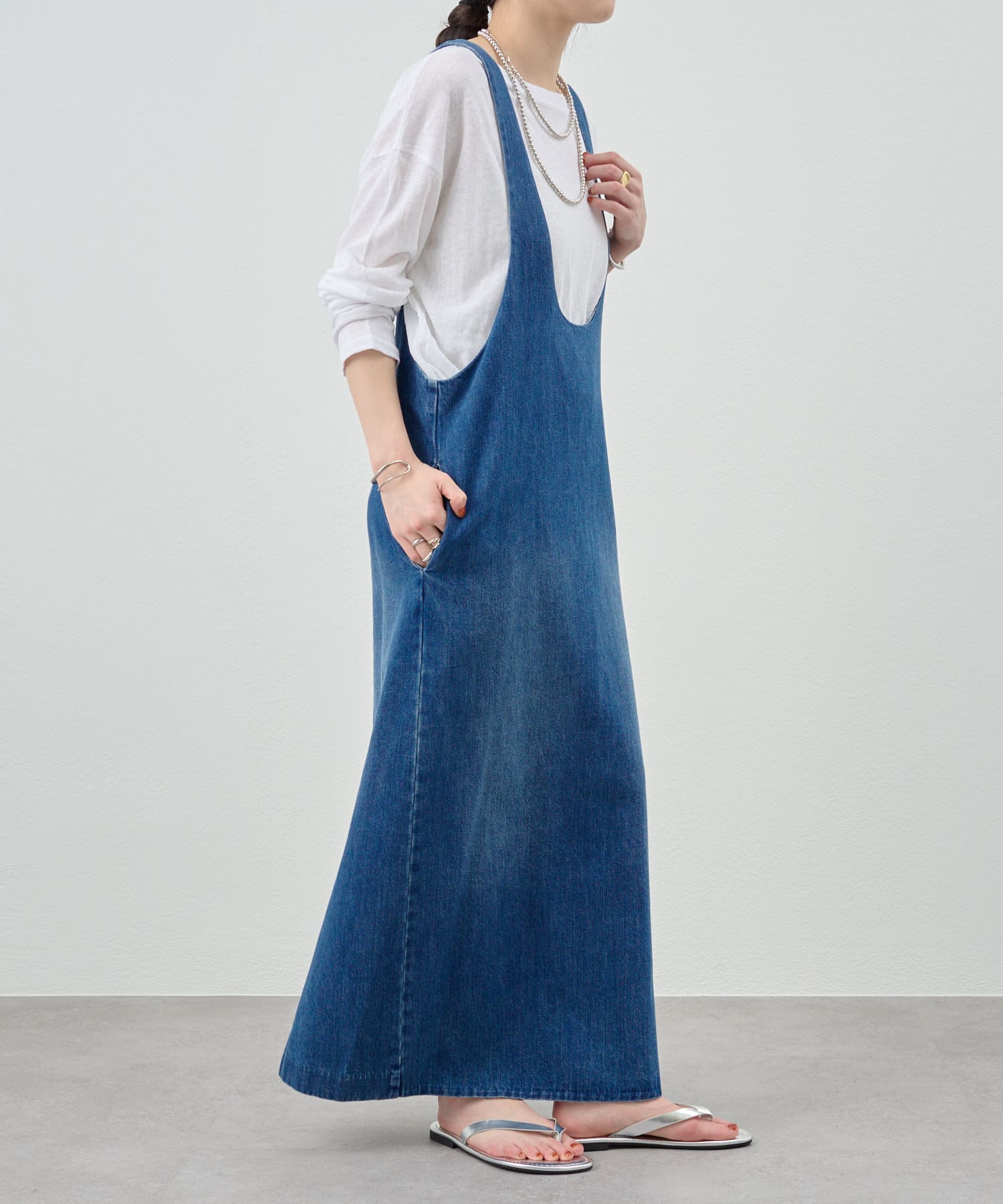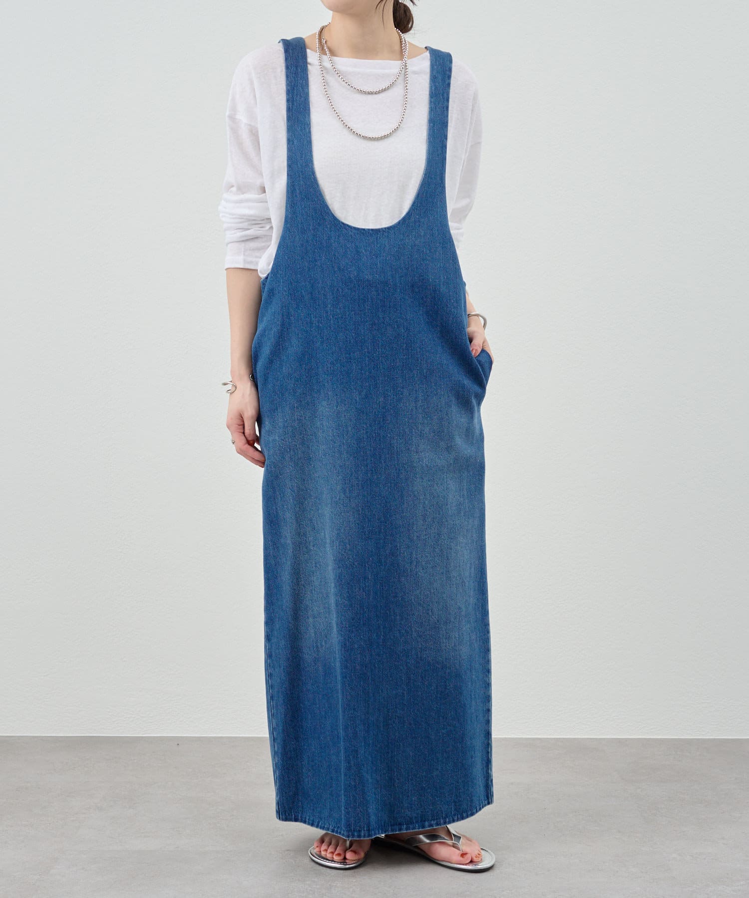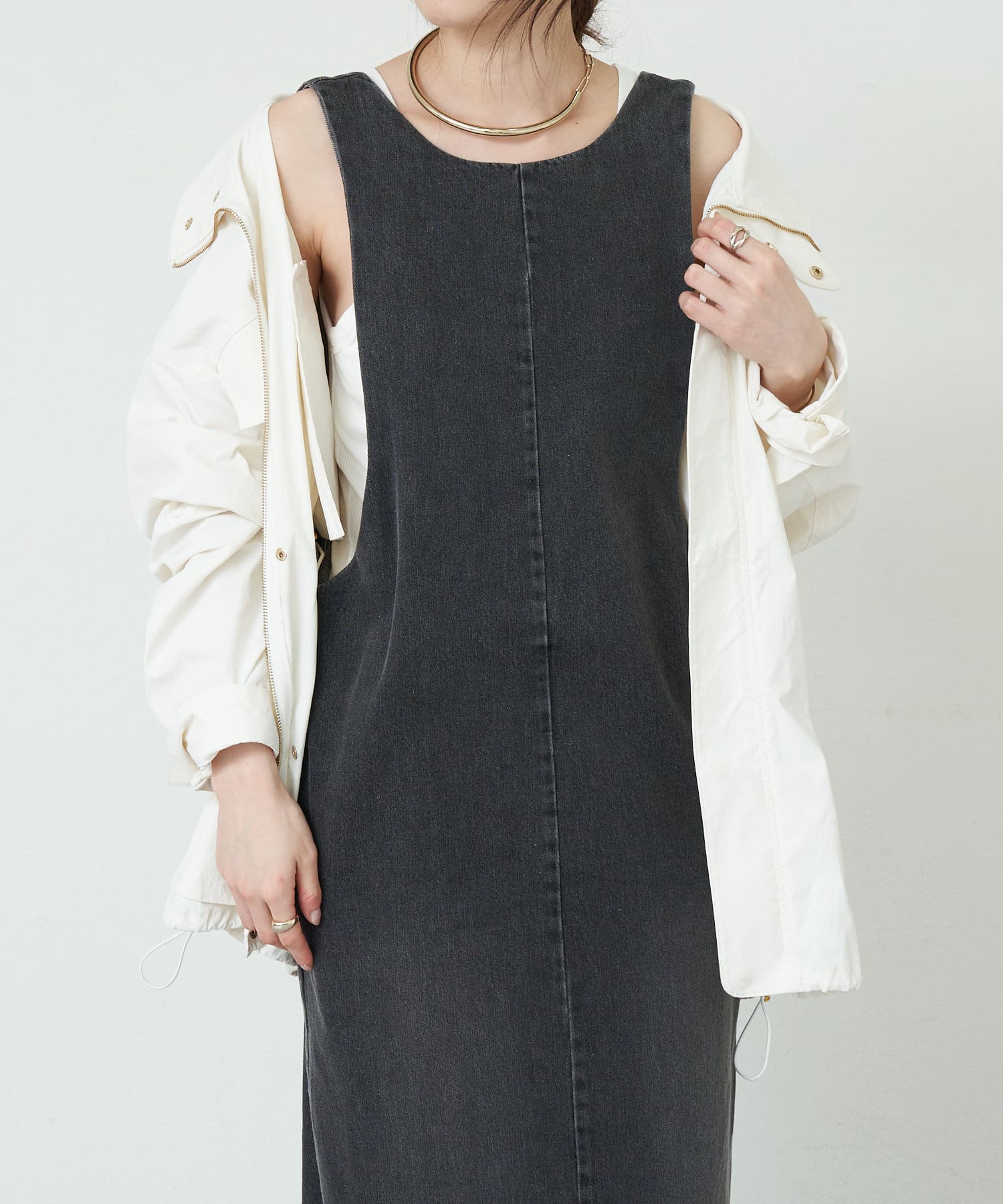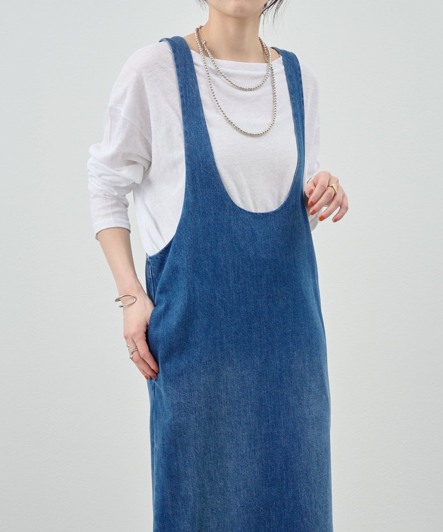 中に合わせるインナーによってさまざまなスタイリングができる万能ワンピース。