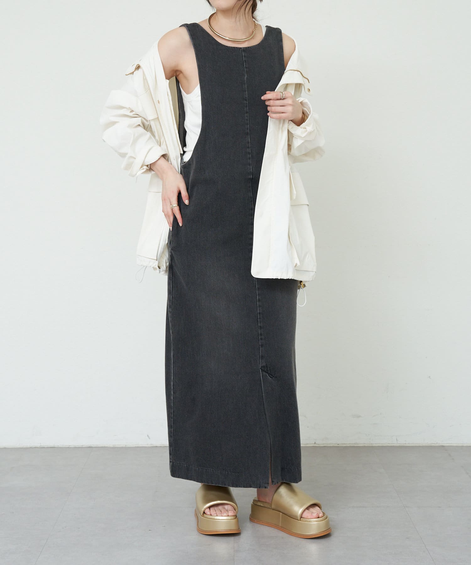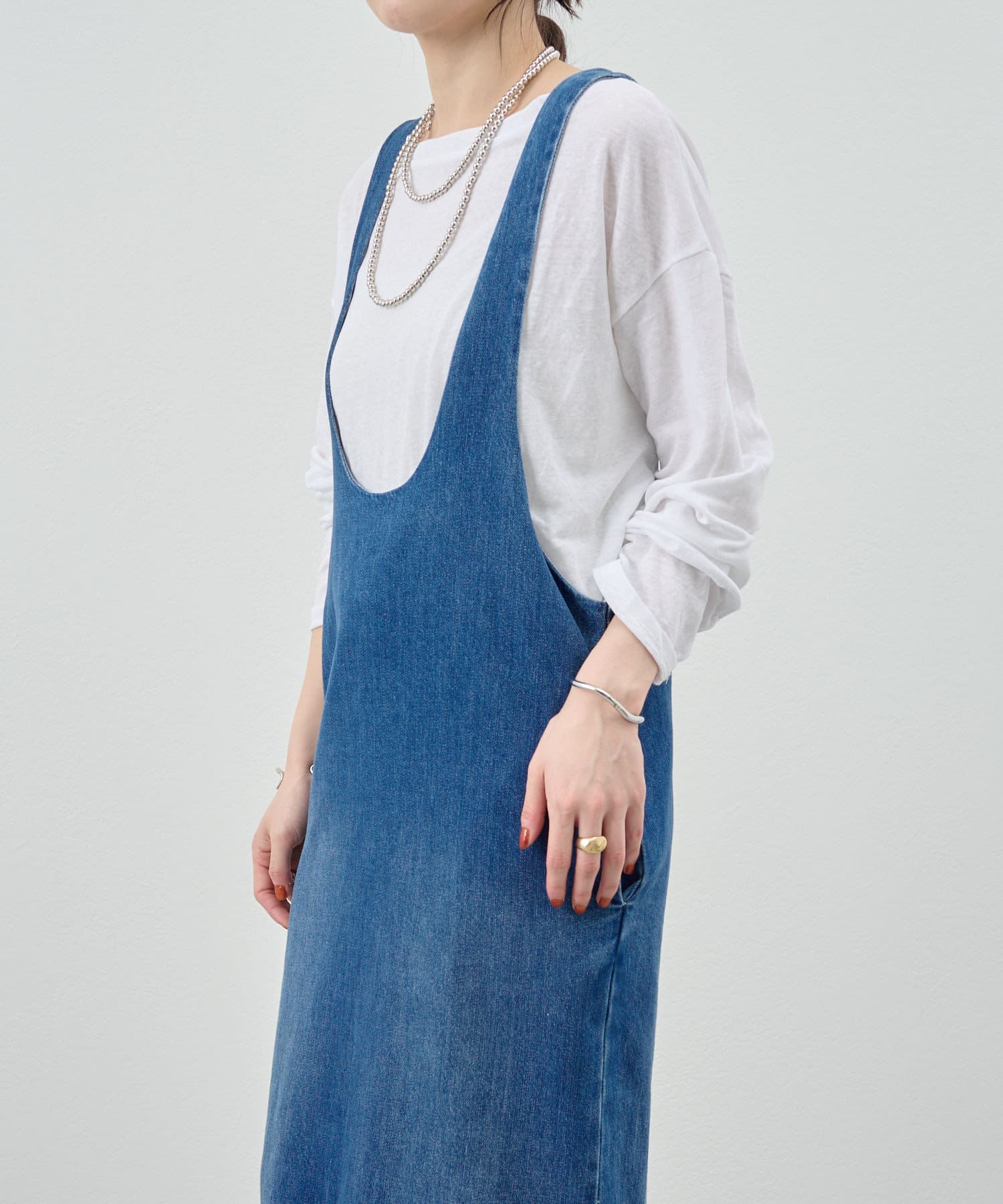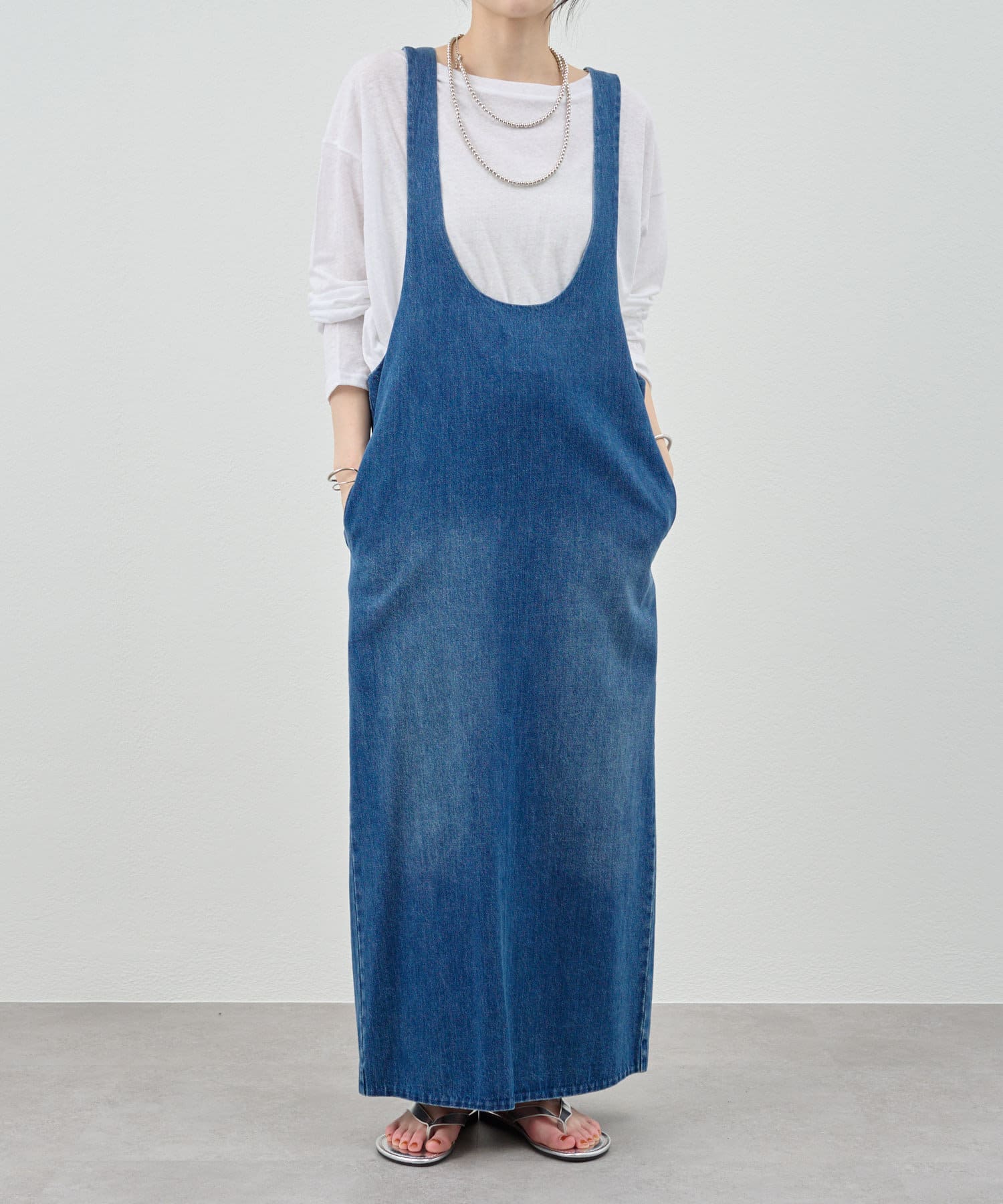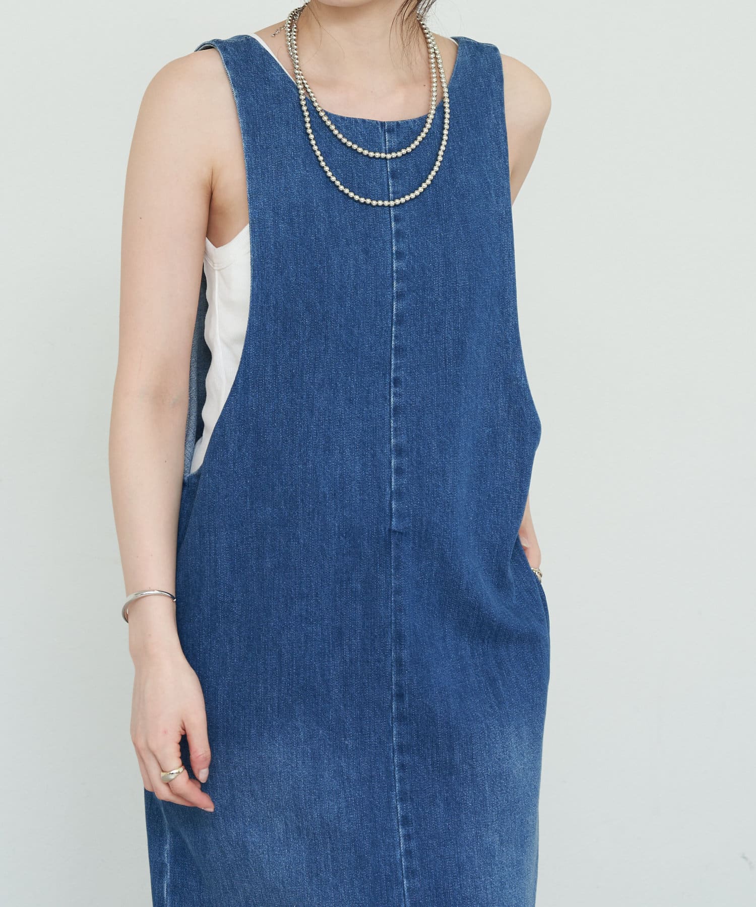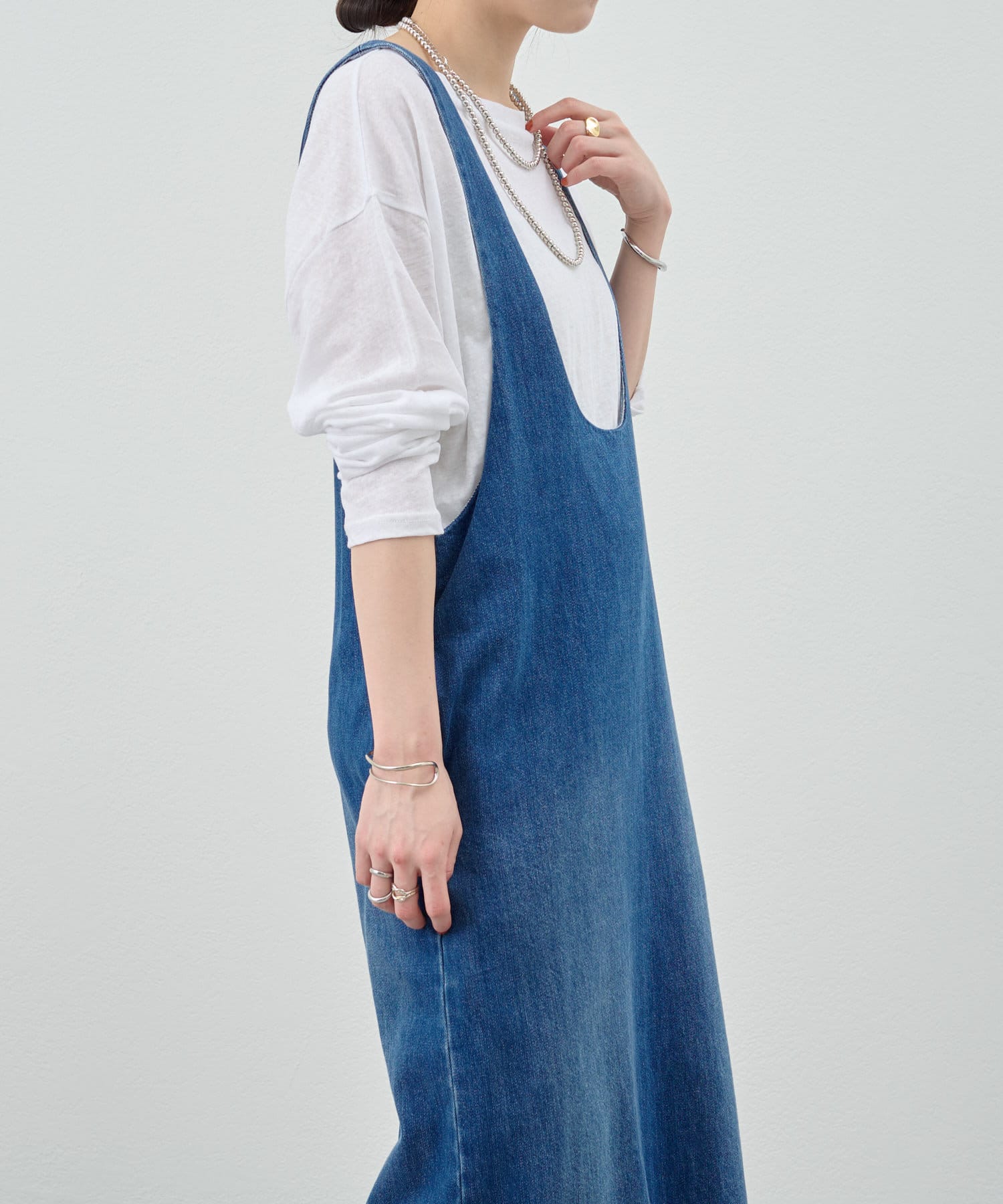 中に合わせるインナーによってさまざまなスタイリングができる万能ワンピース。