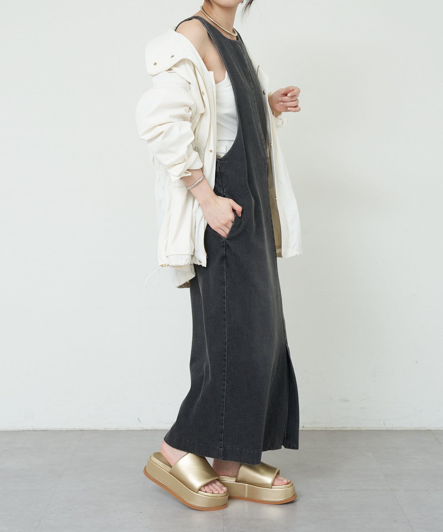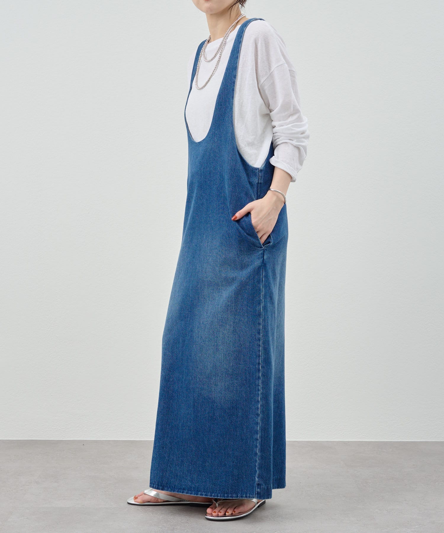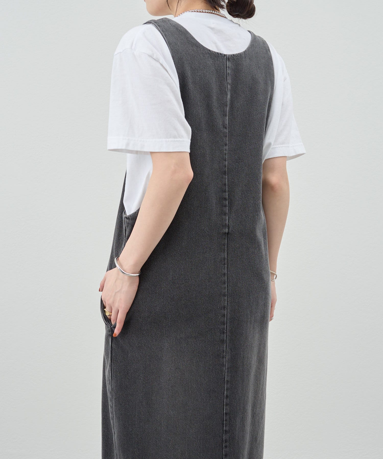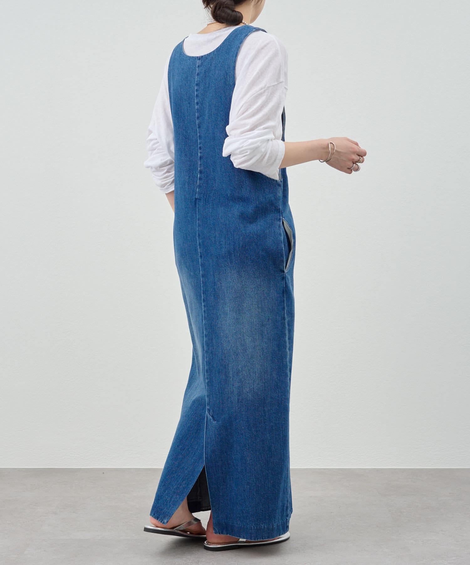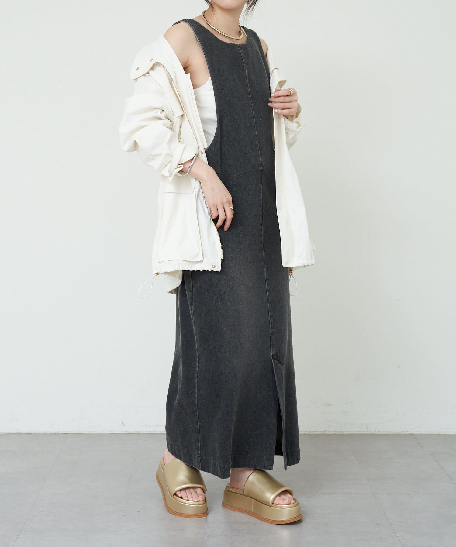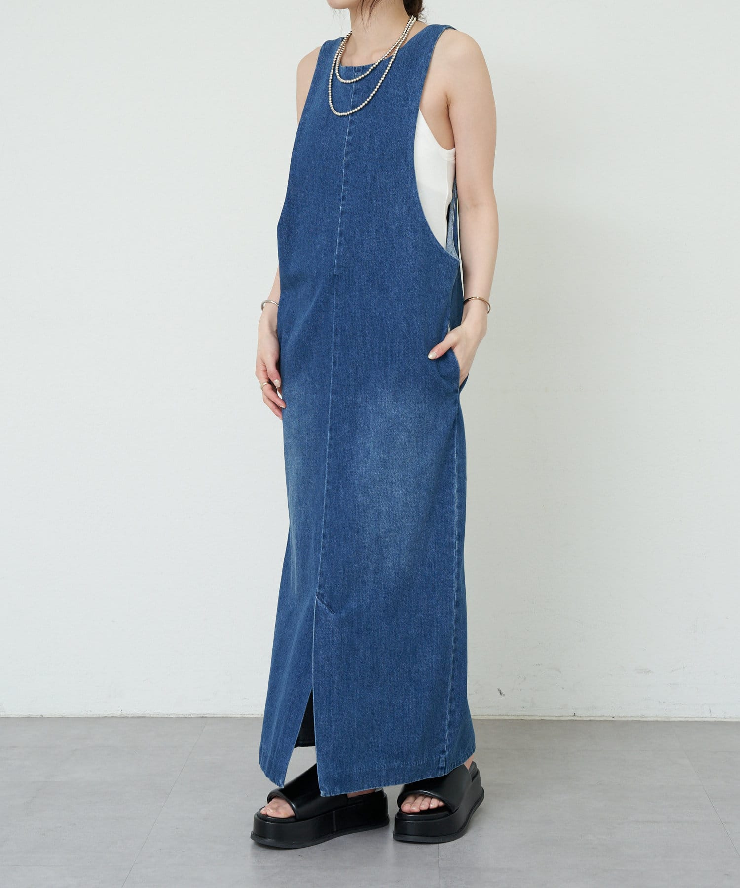 中に合わせるインナーによってさまざまなスタイリングができる万能ワンピース。
