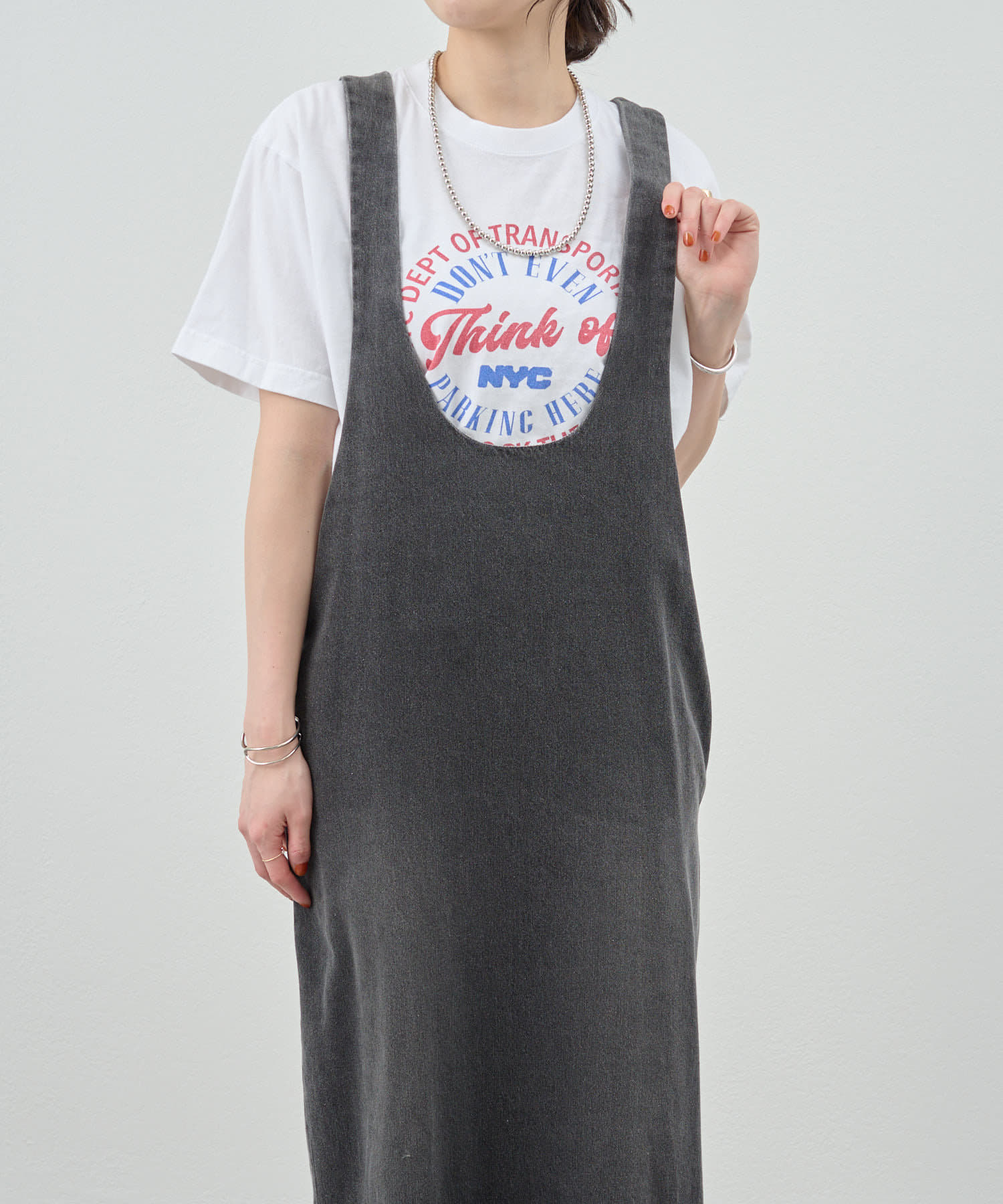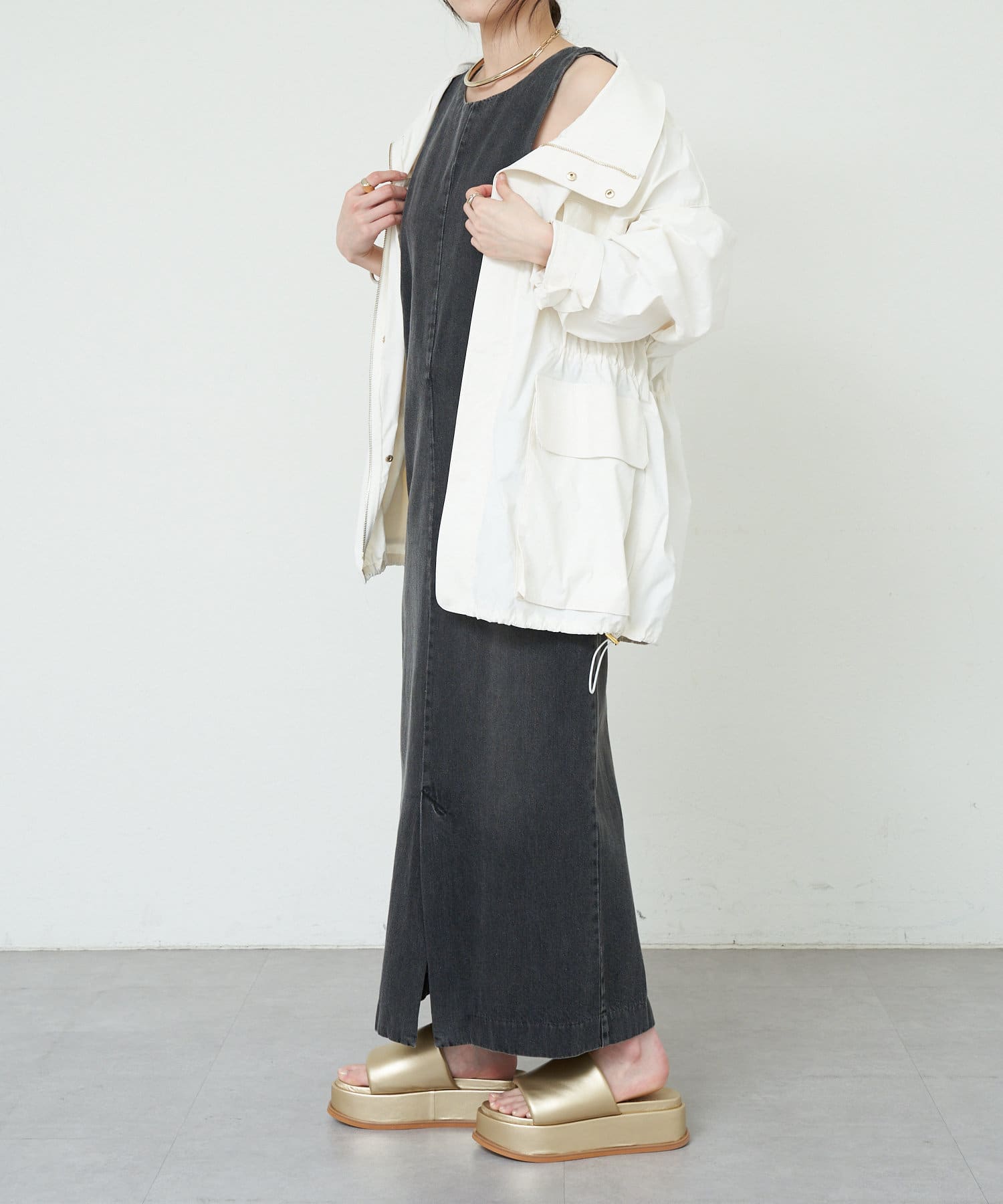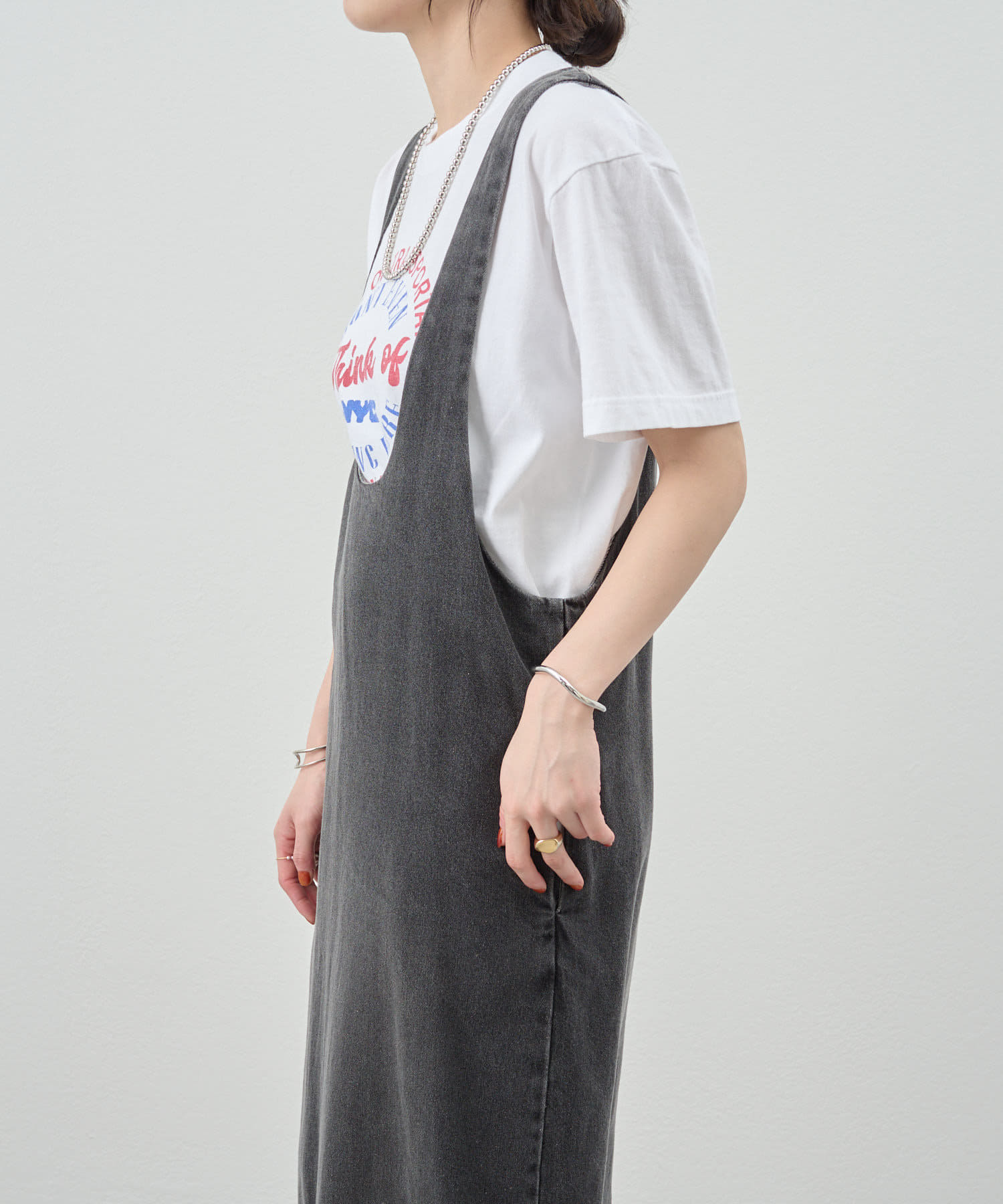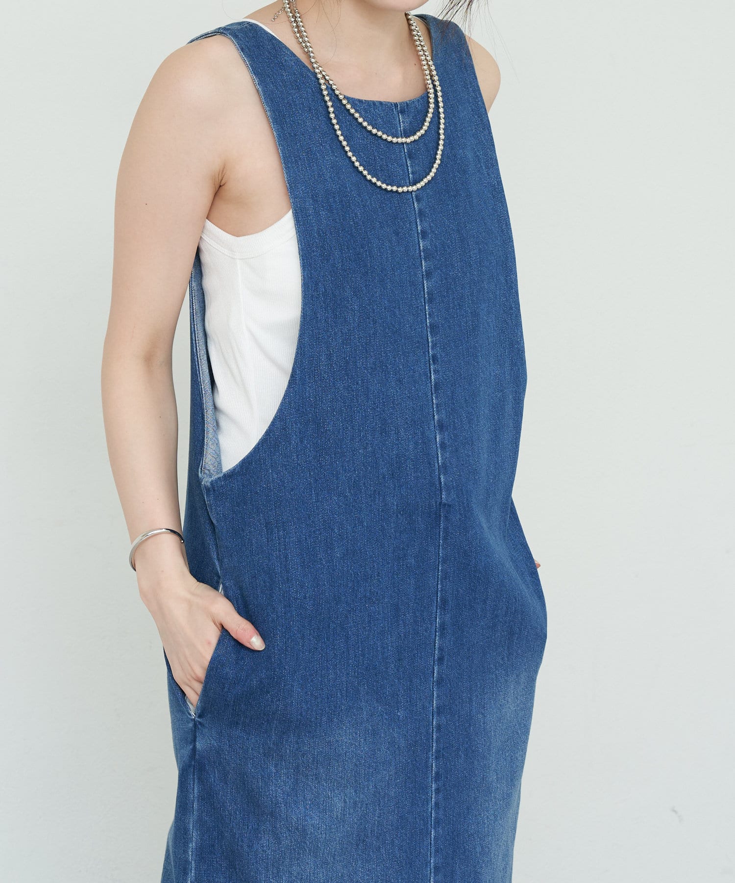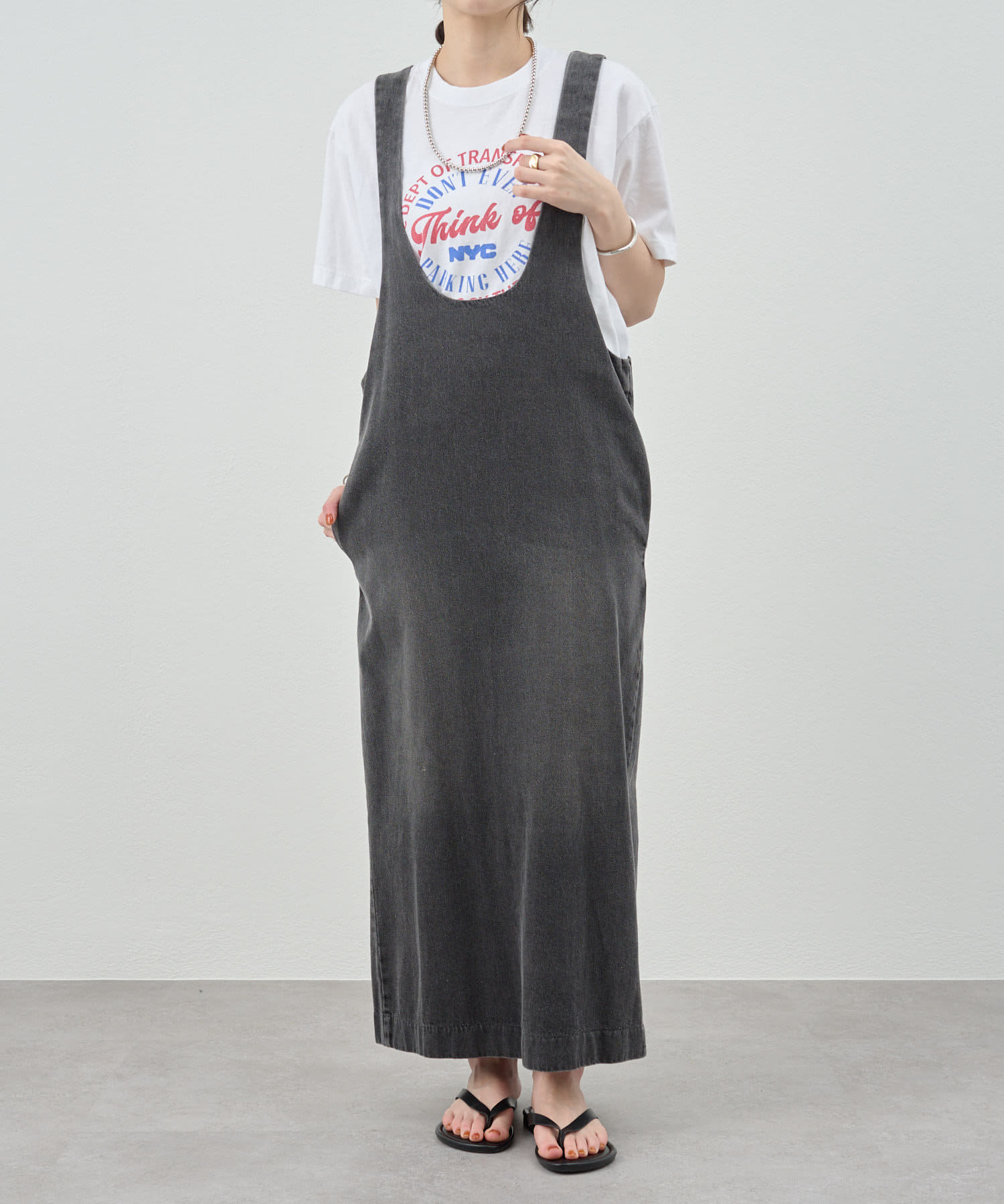 中に合わせるインナーによってさまざまなスタイリングができる万能ワンピース。