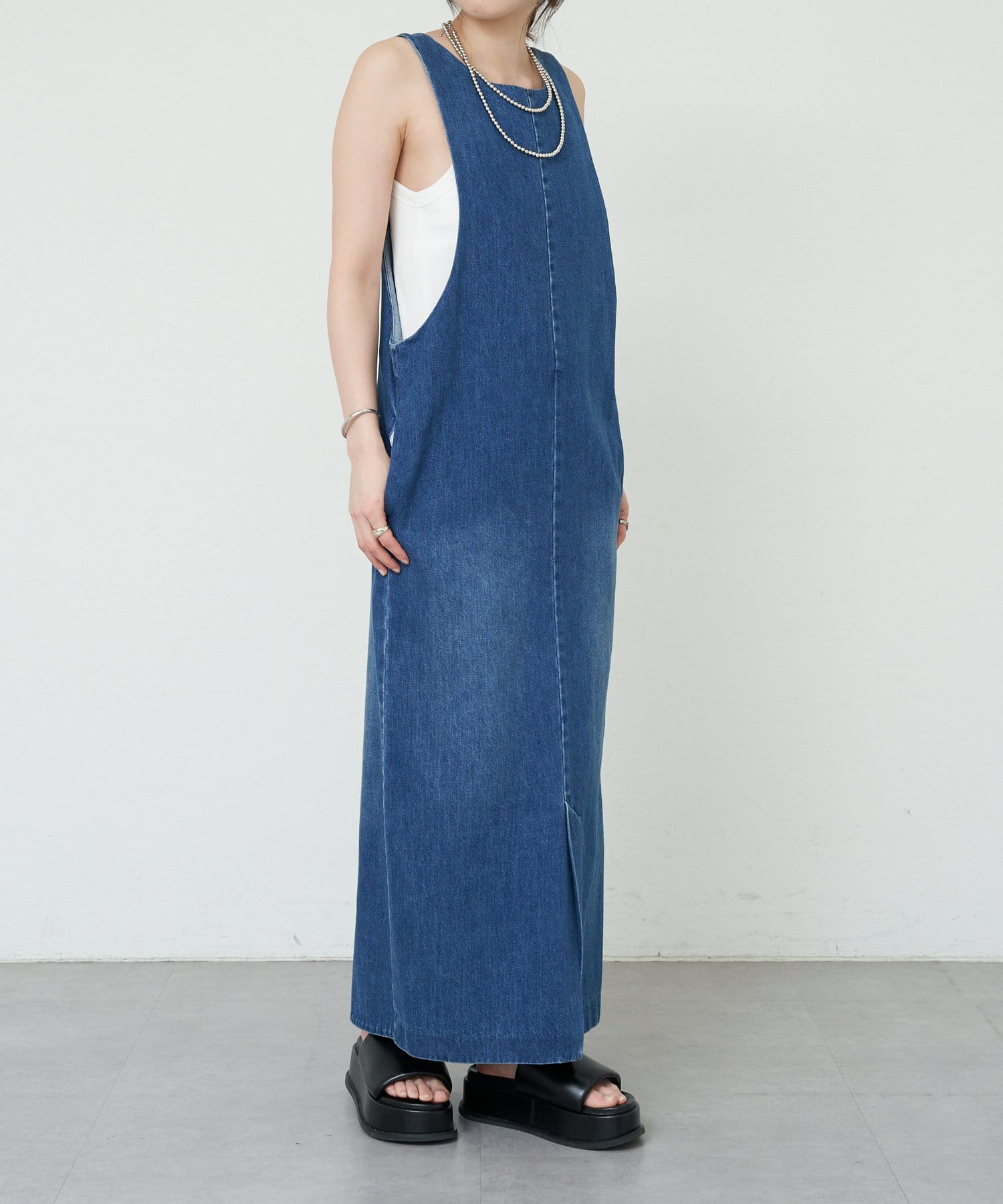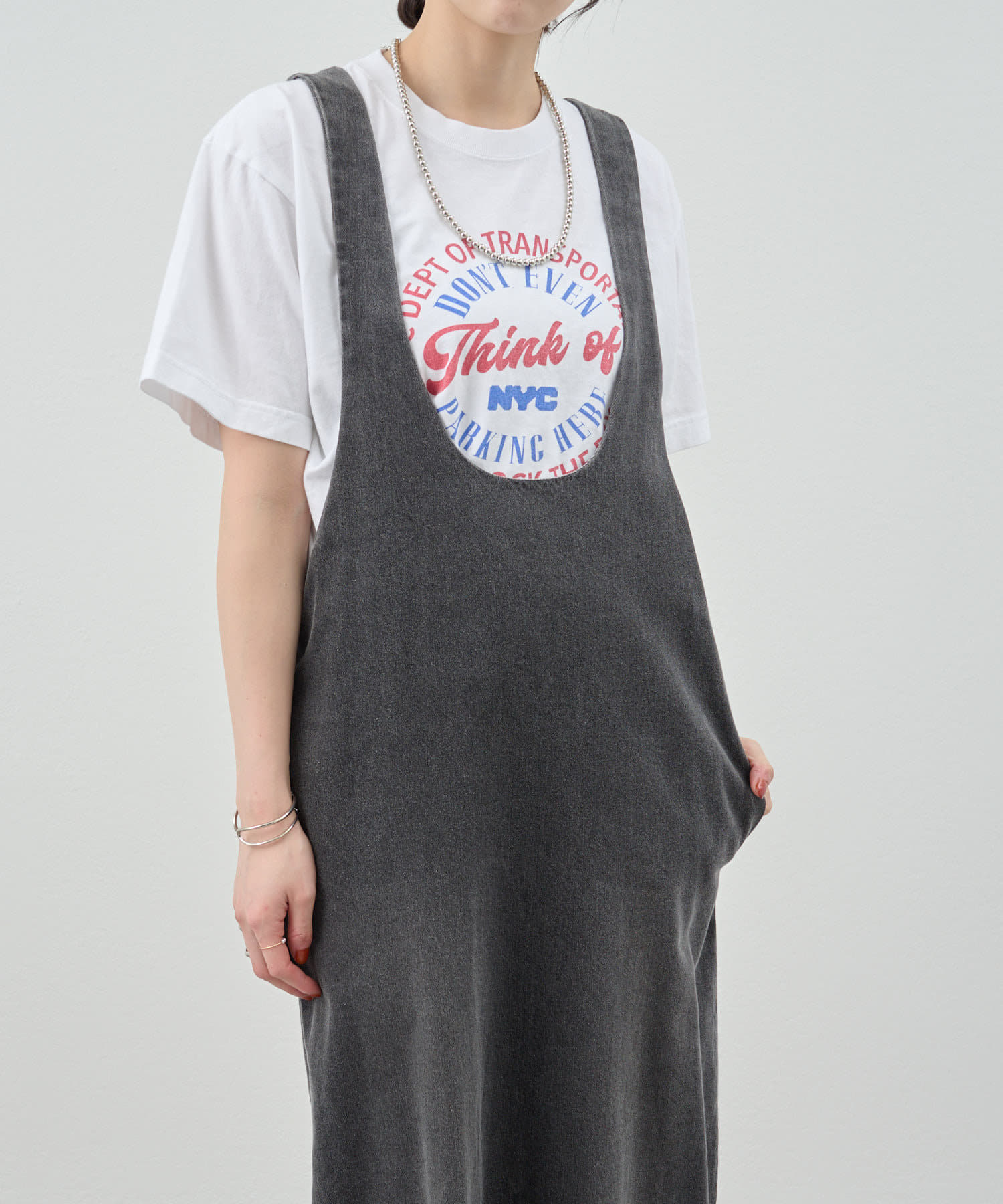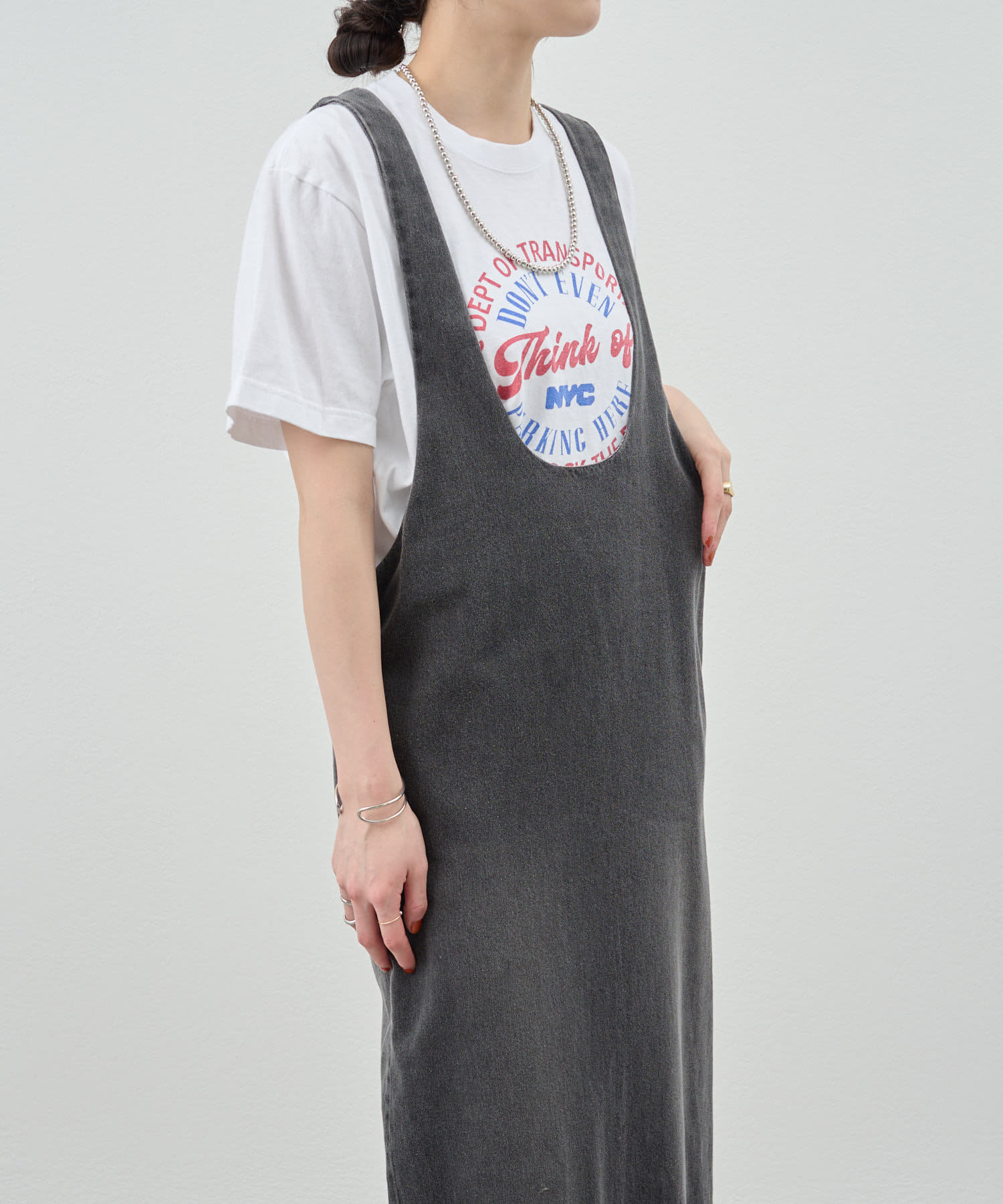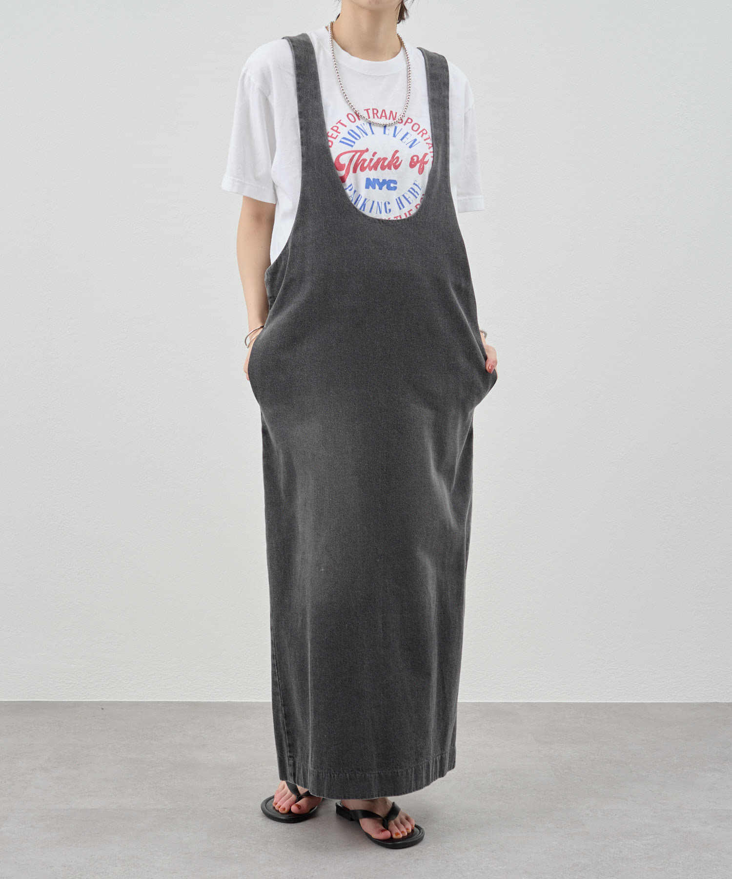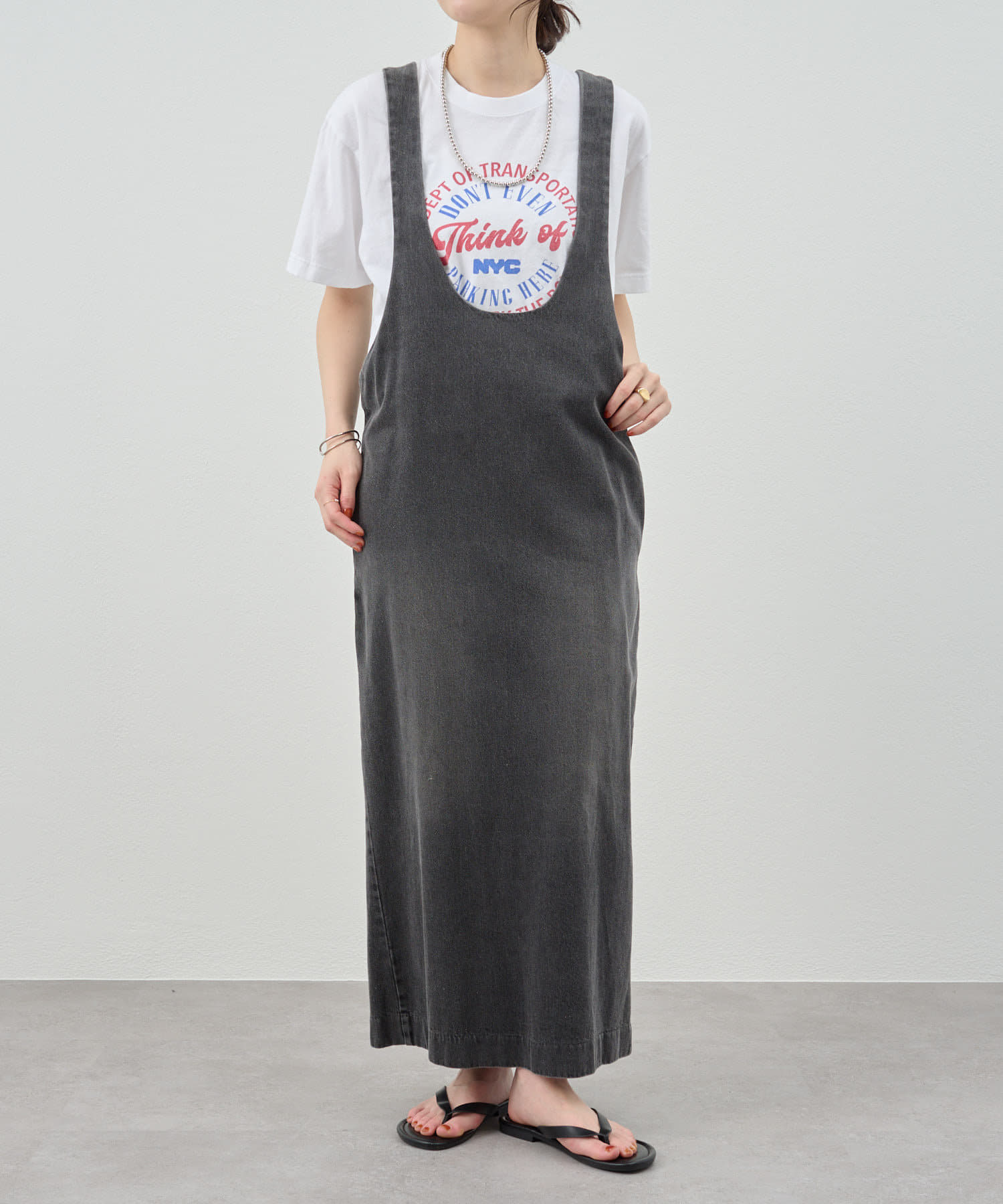 中に合わせるインナーによってさまざまなスタイリングができる万能ワンピース。