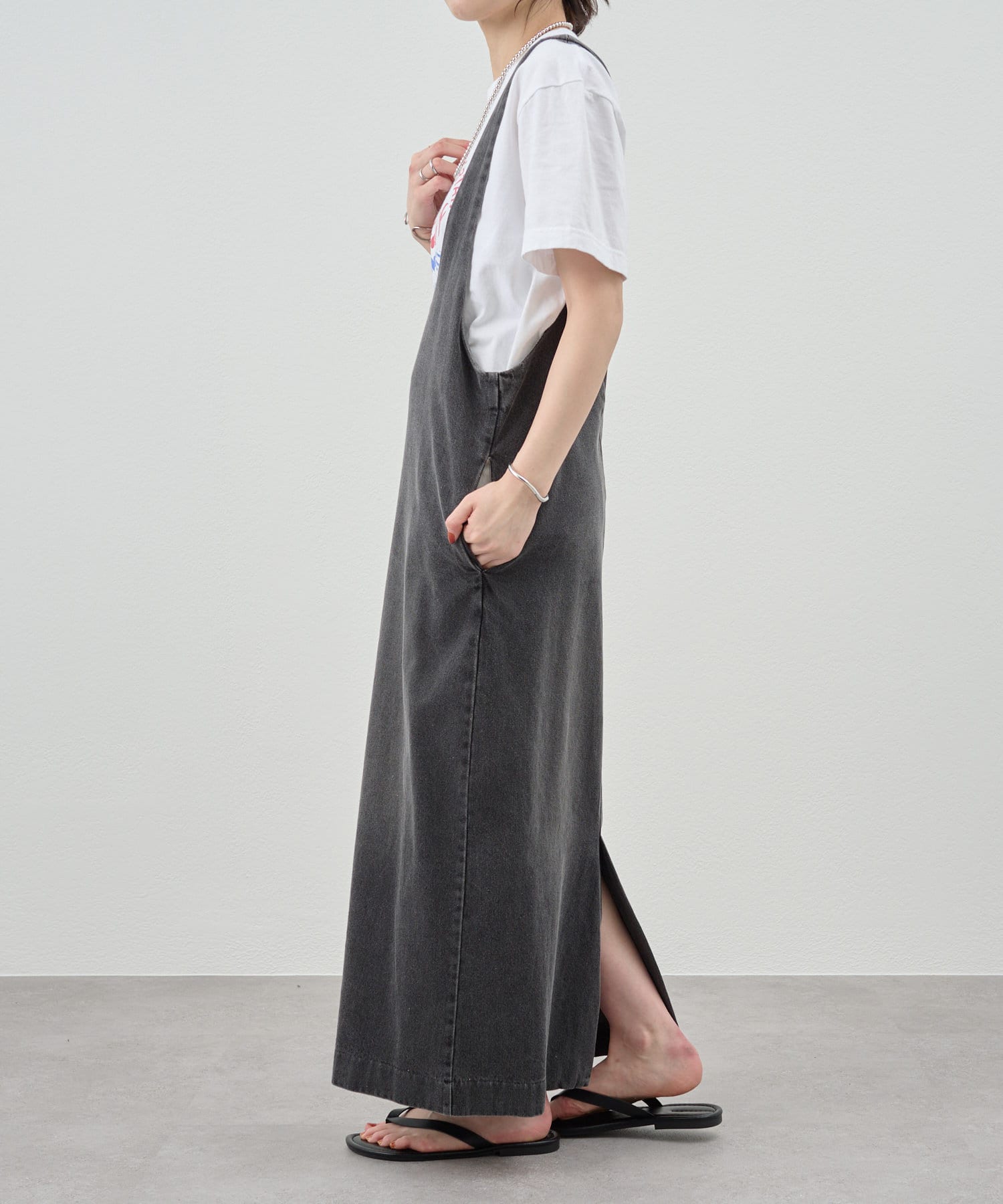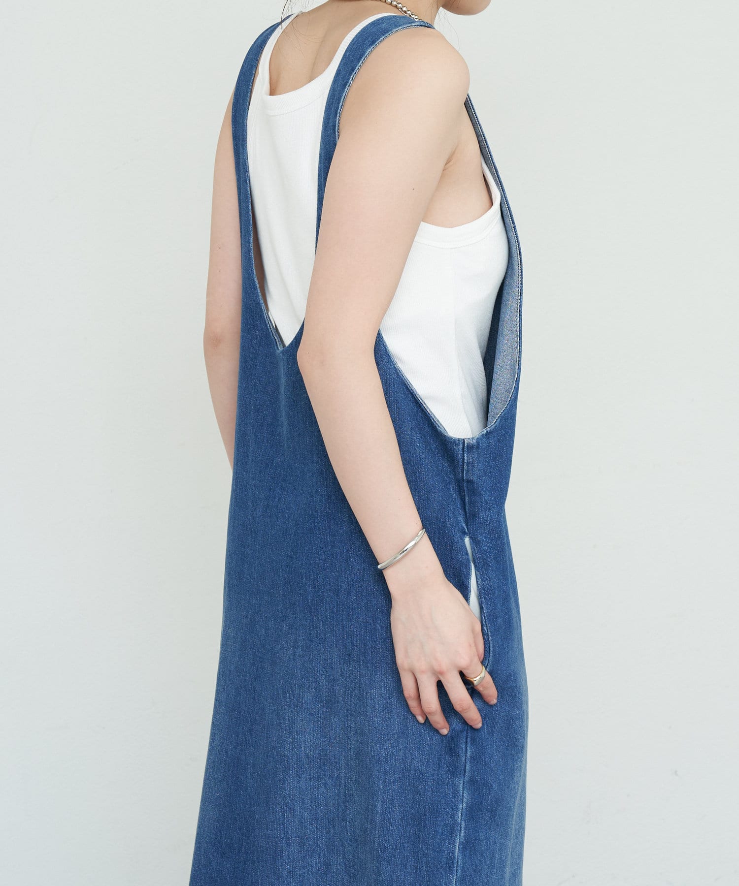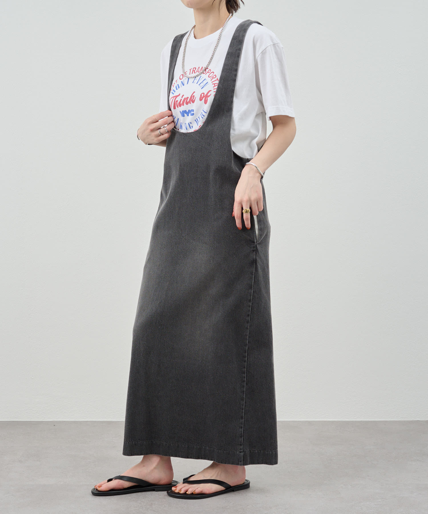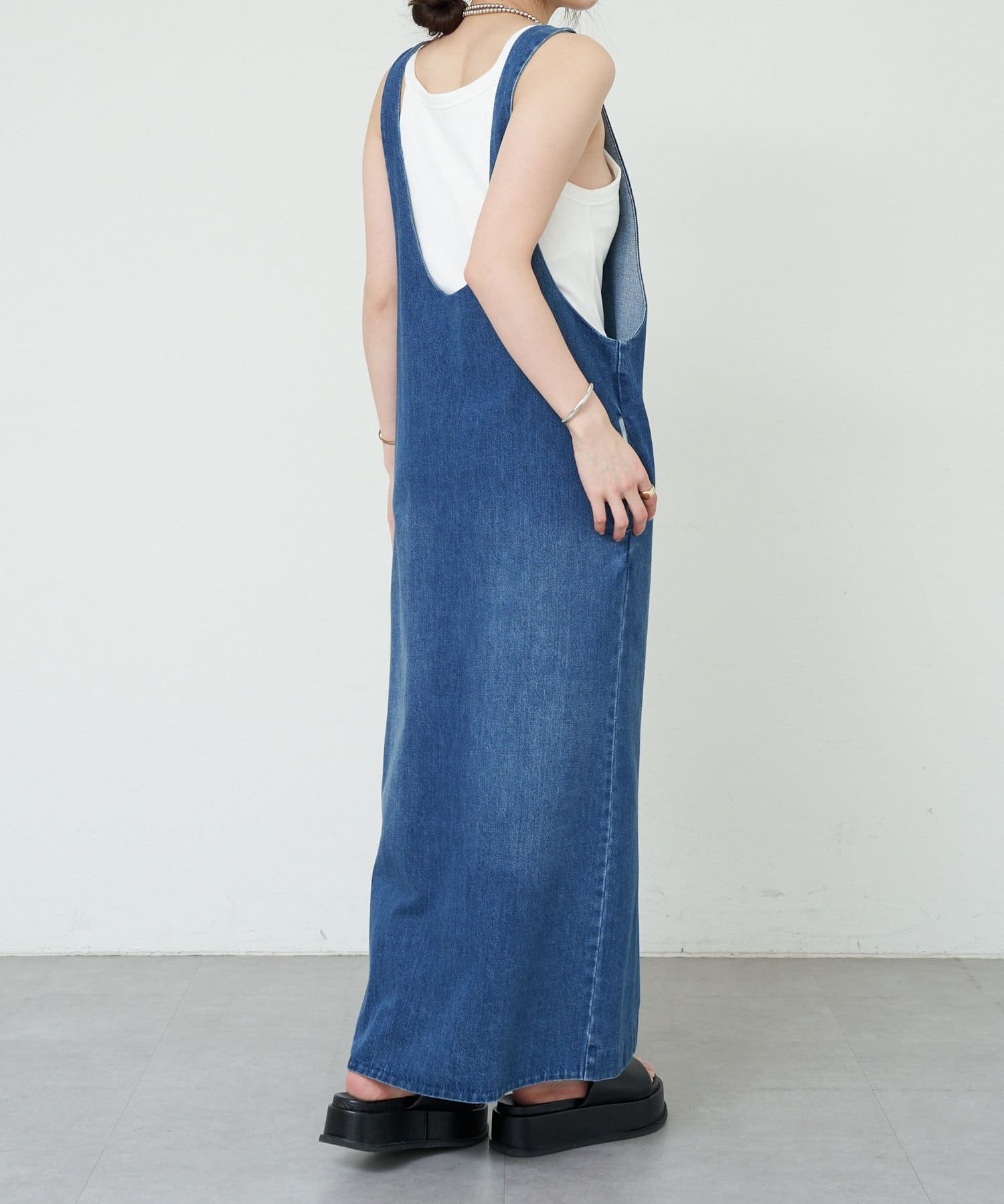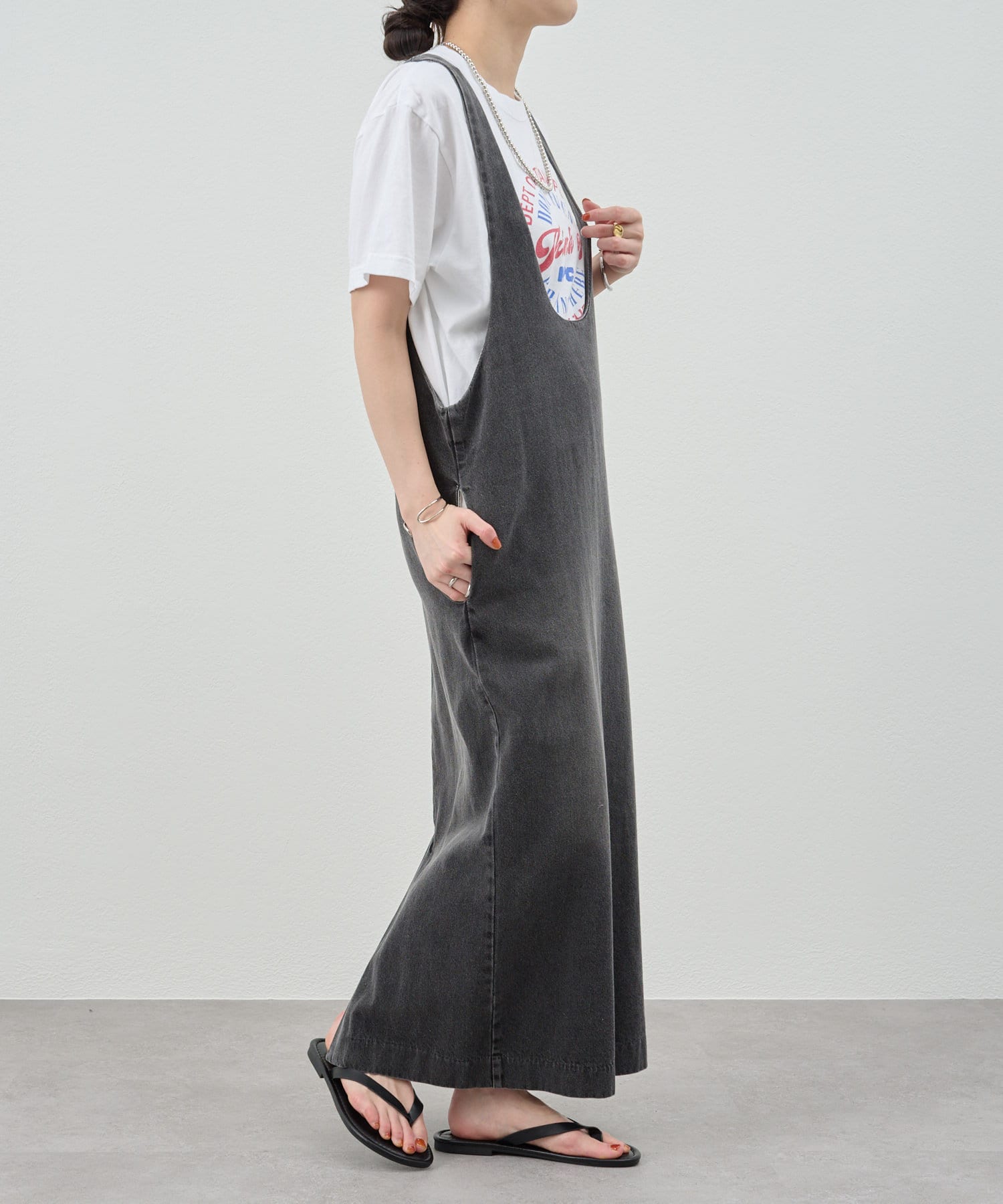 中に合わせるインナーによってさまざまなスタイリングができる万能ワンピース。
