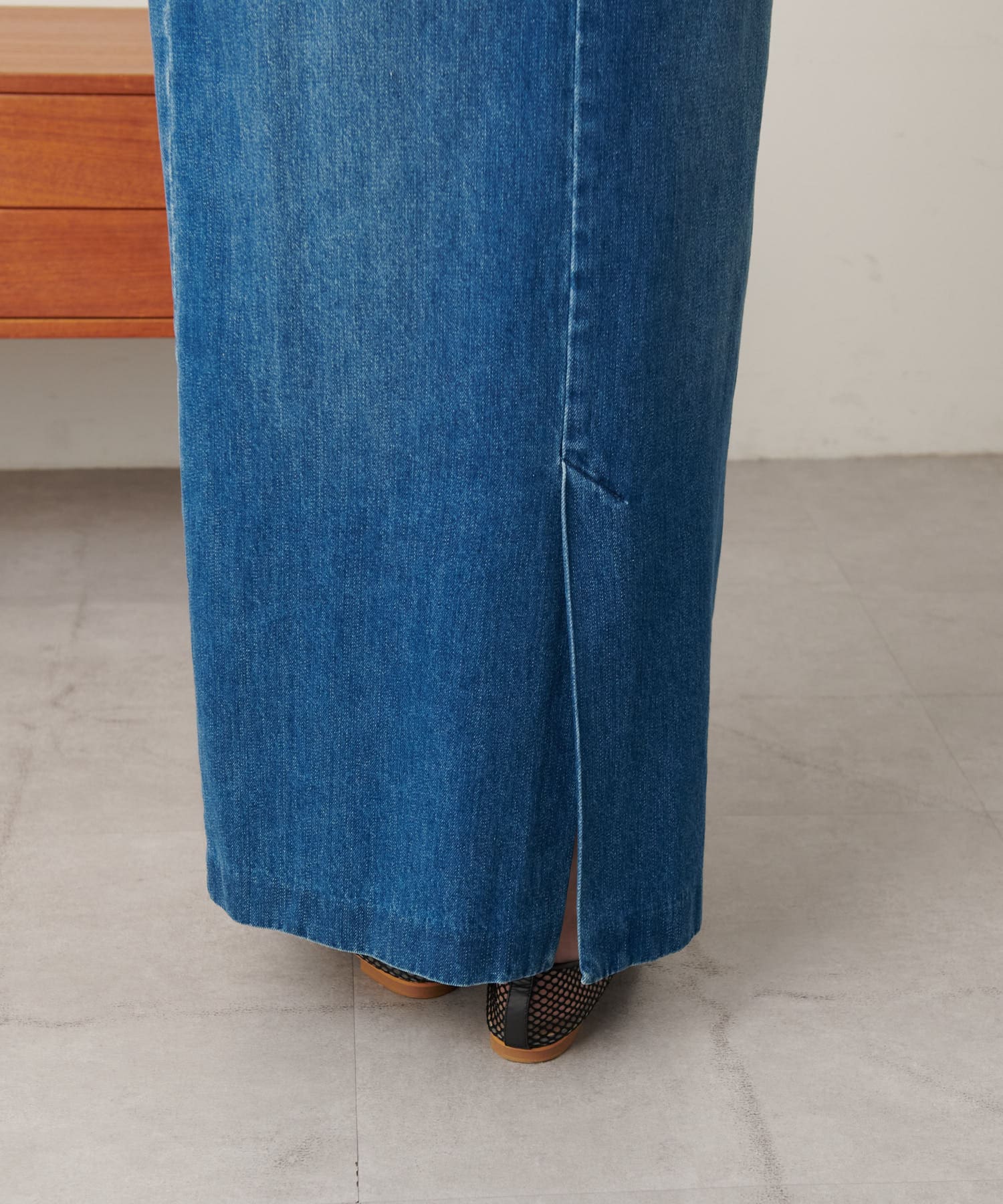 長めに設定された丈とタイトなシルエットが子供っぽさを抑え、大人カジュアルな雰囲気を演出。