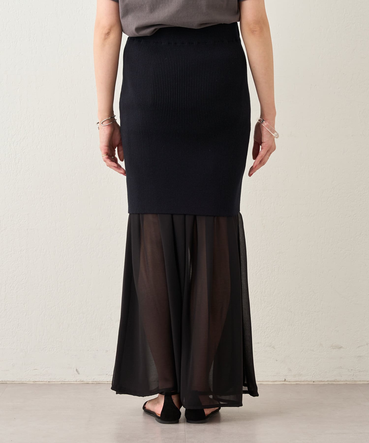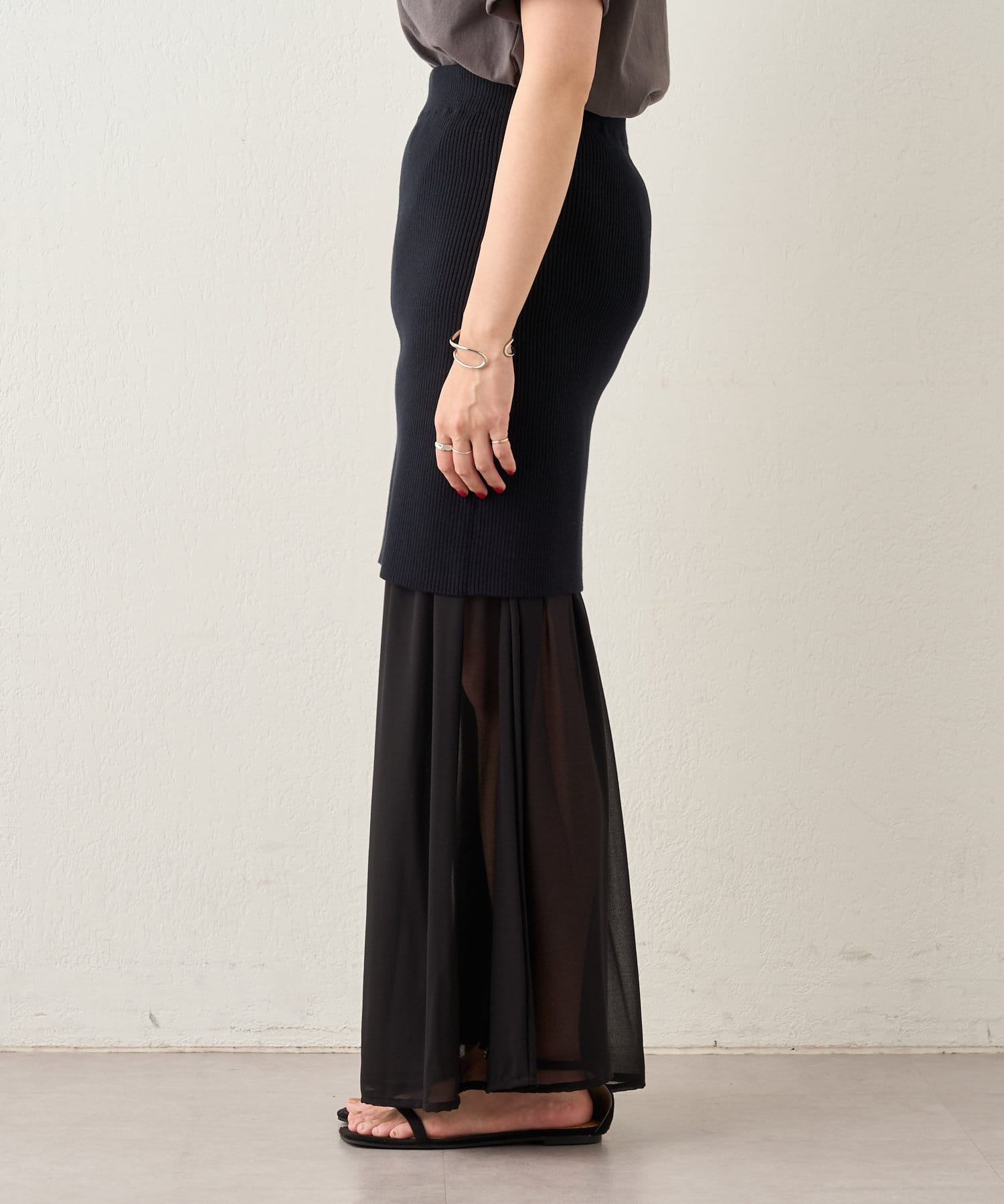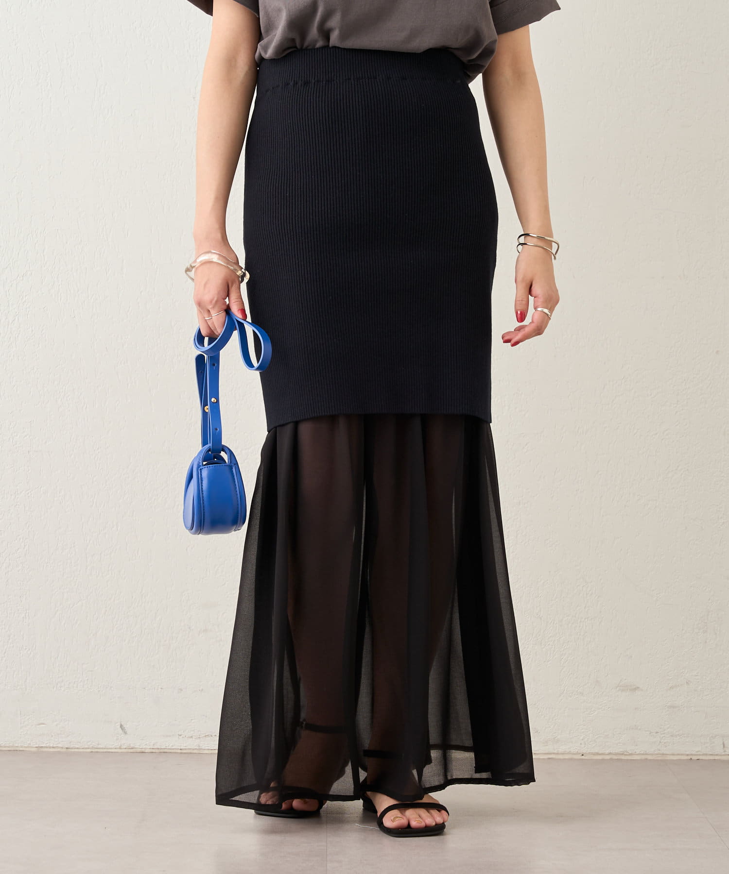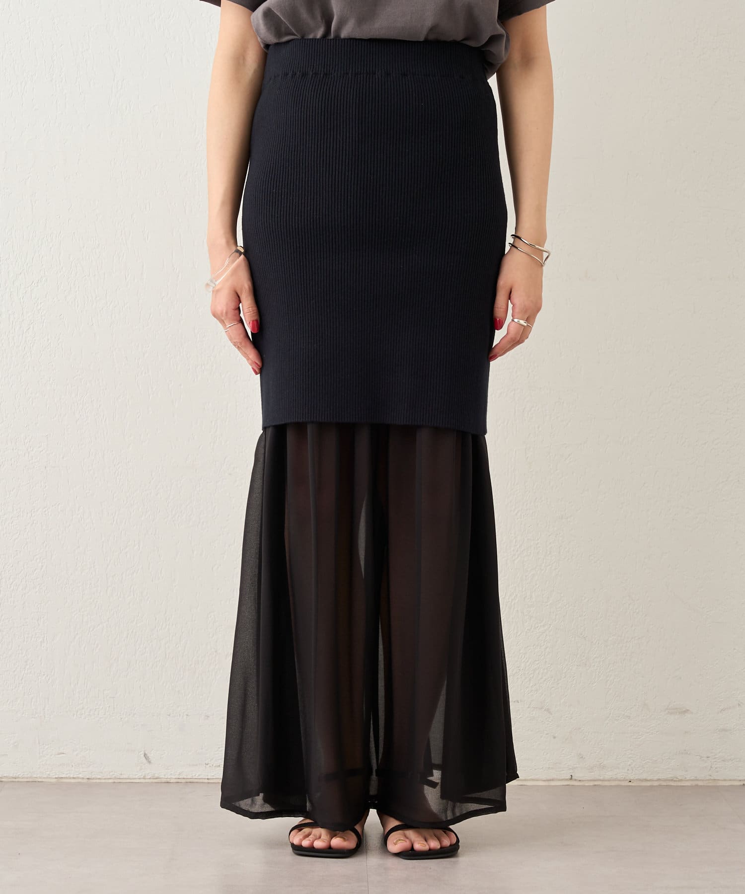 ・シフォンスカートとニットスカートを一緒に履いてレイヤード風に。