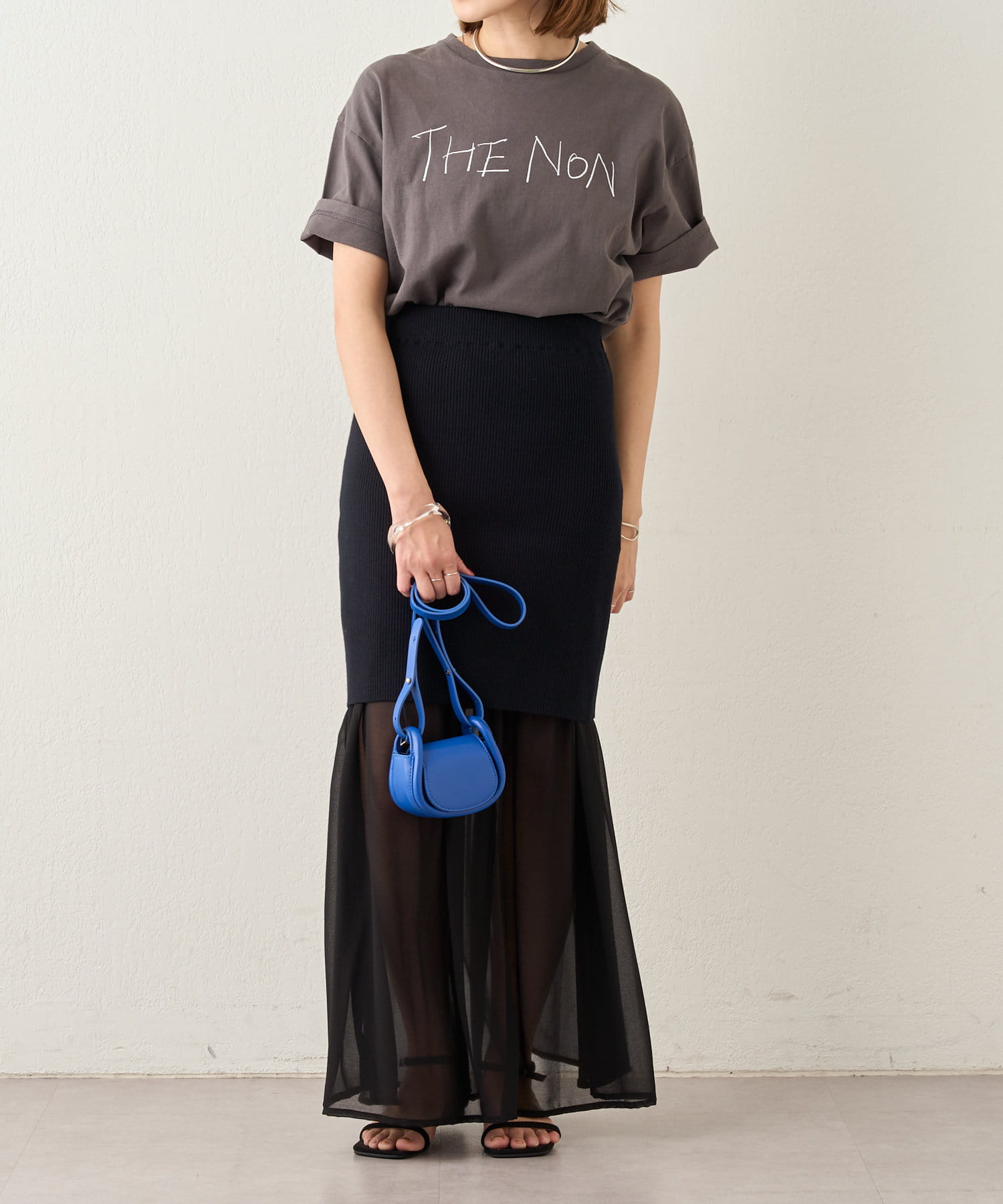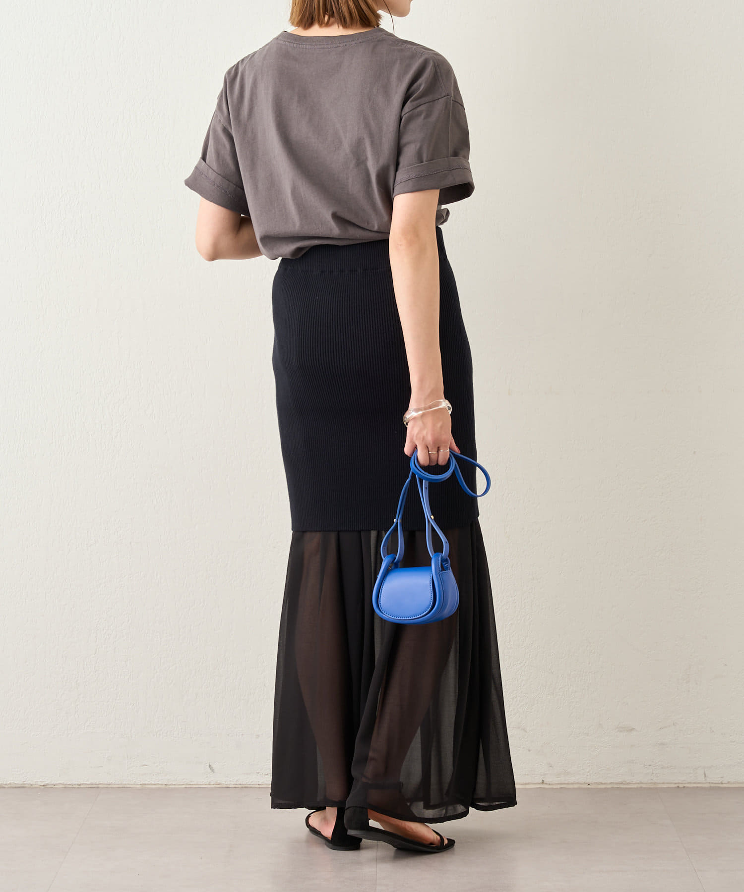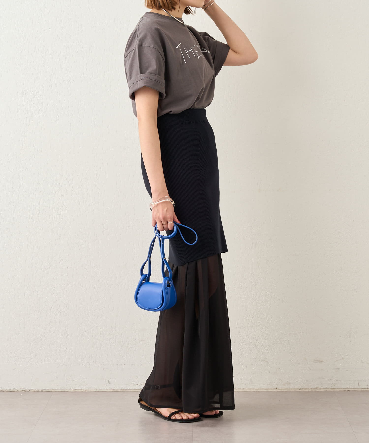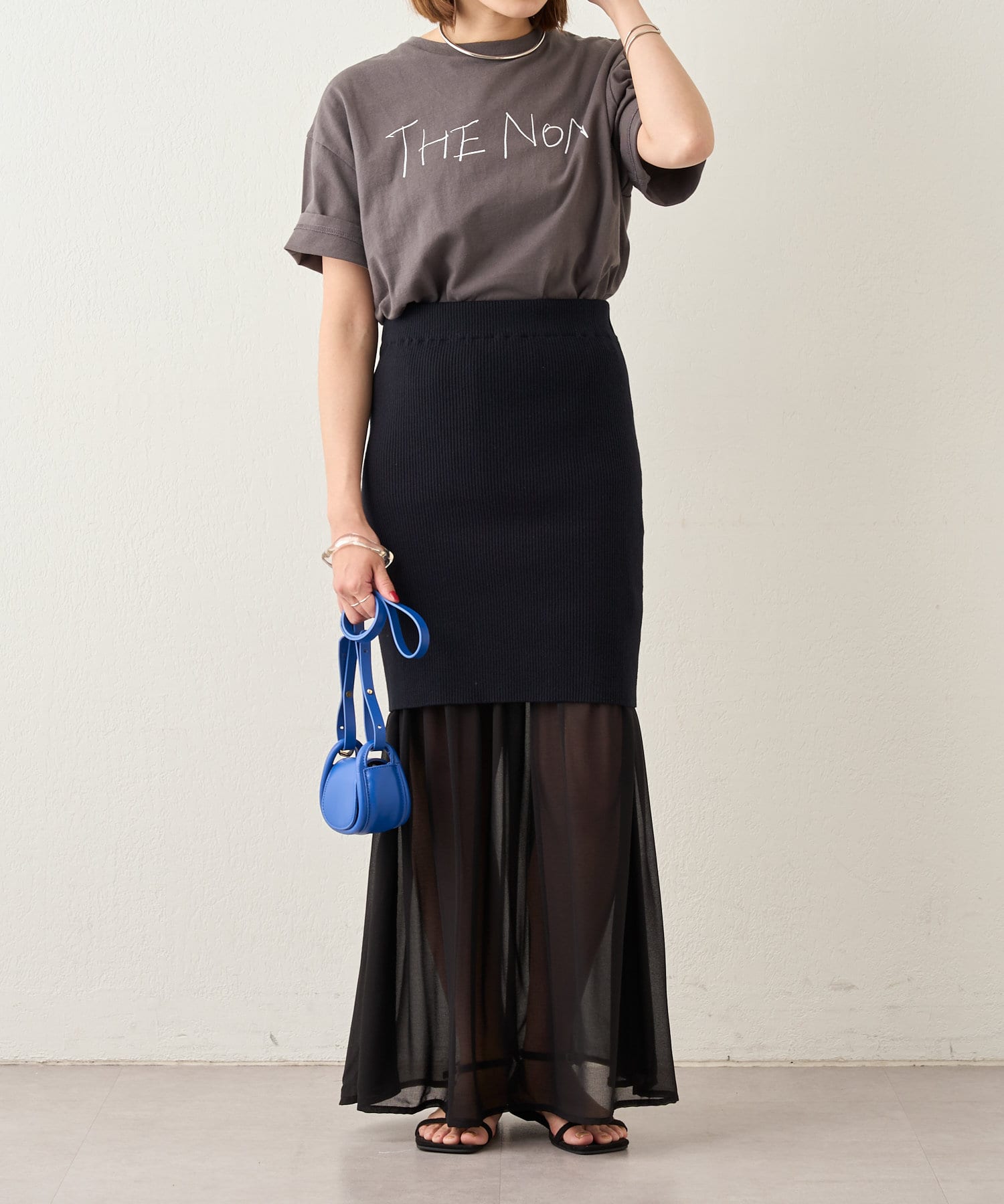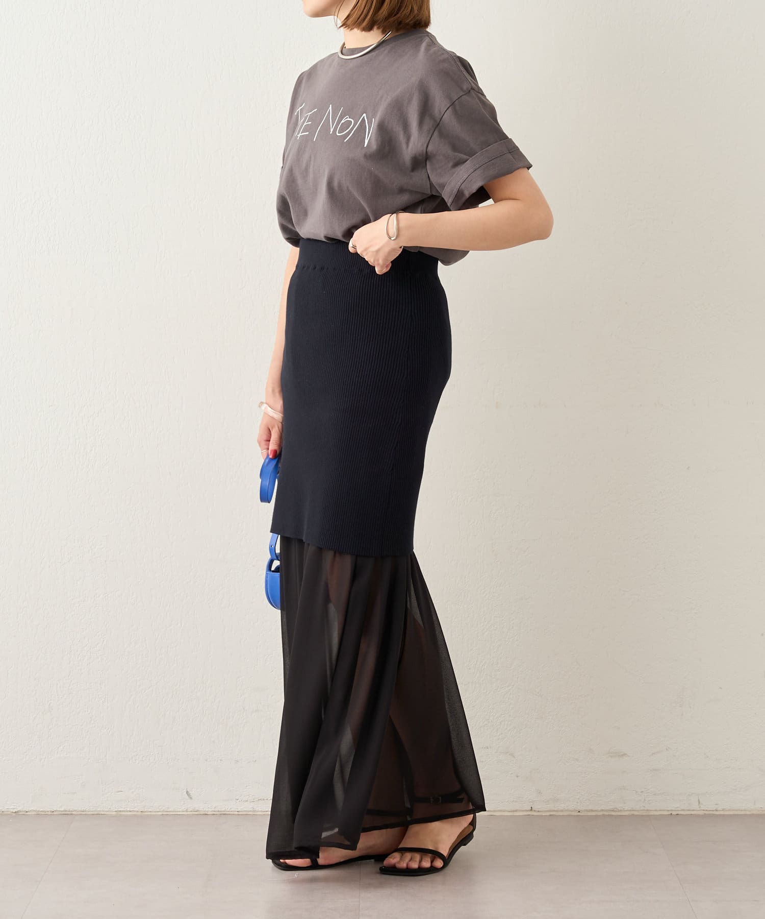 ・シフォンスカートとニットスカートを一緒に履いてレイヤード風に。