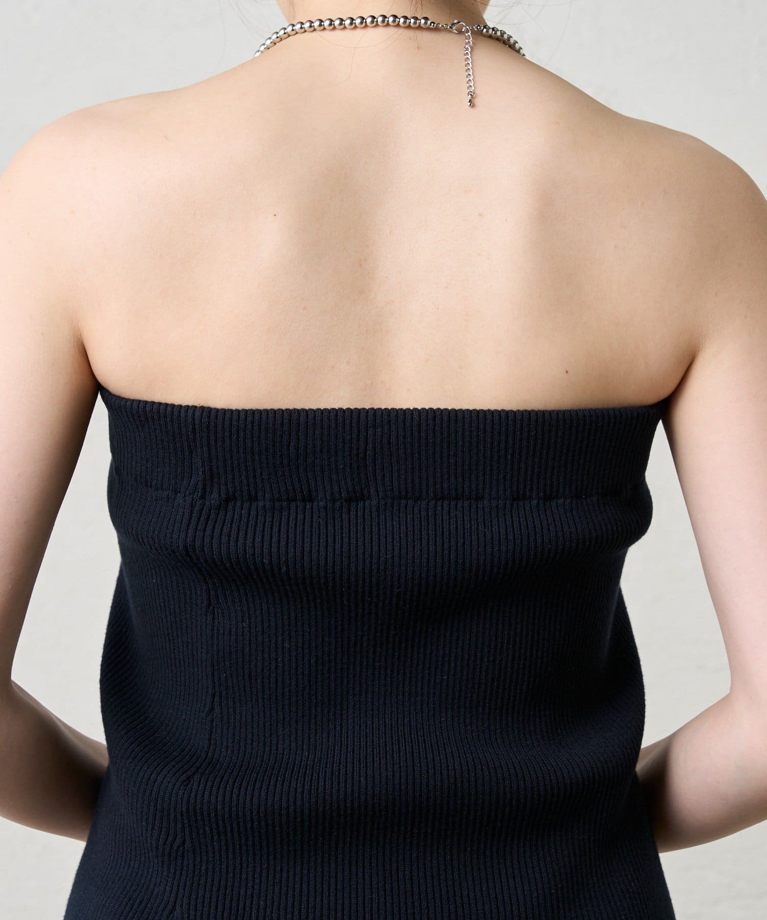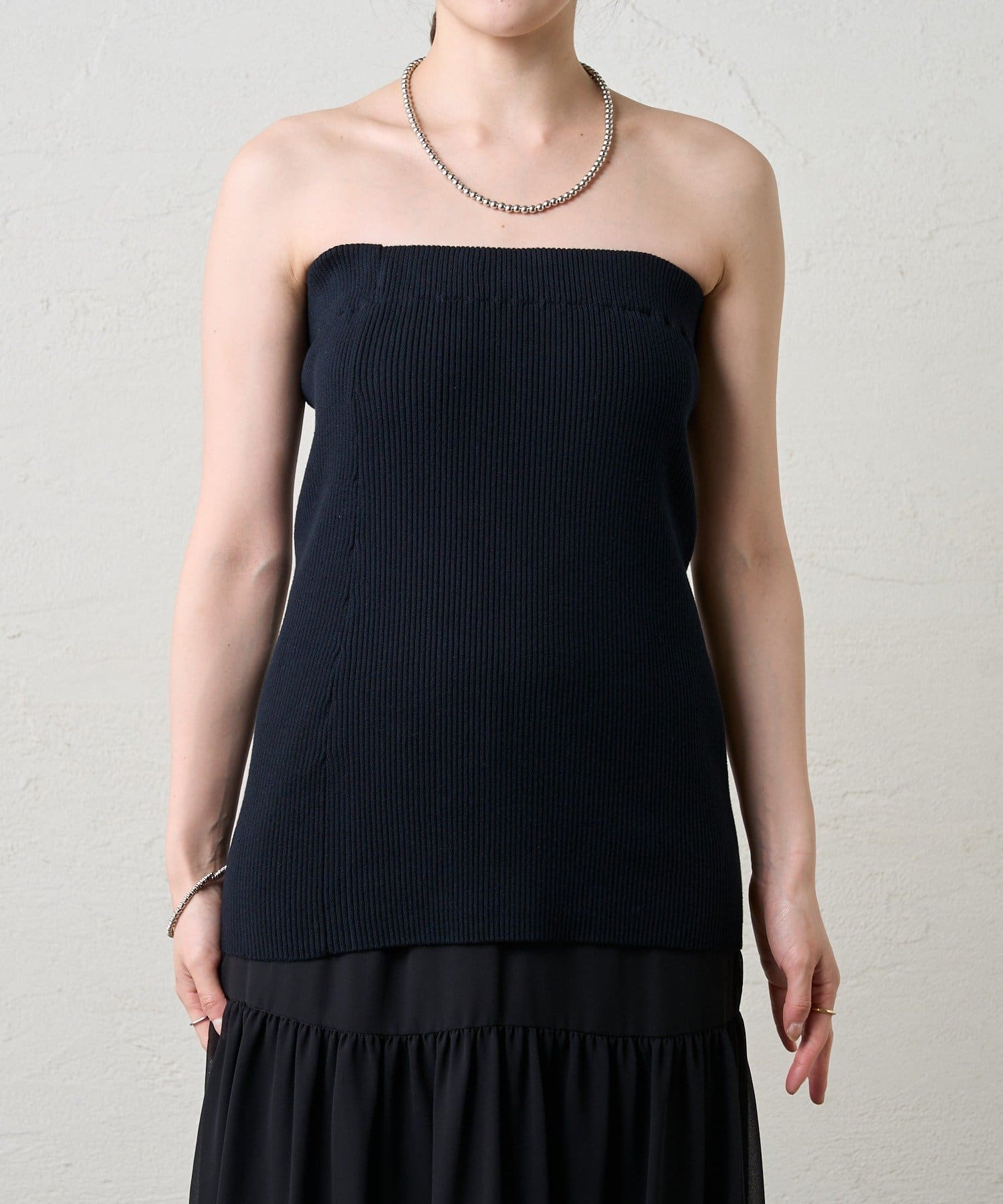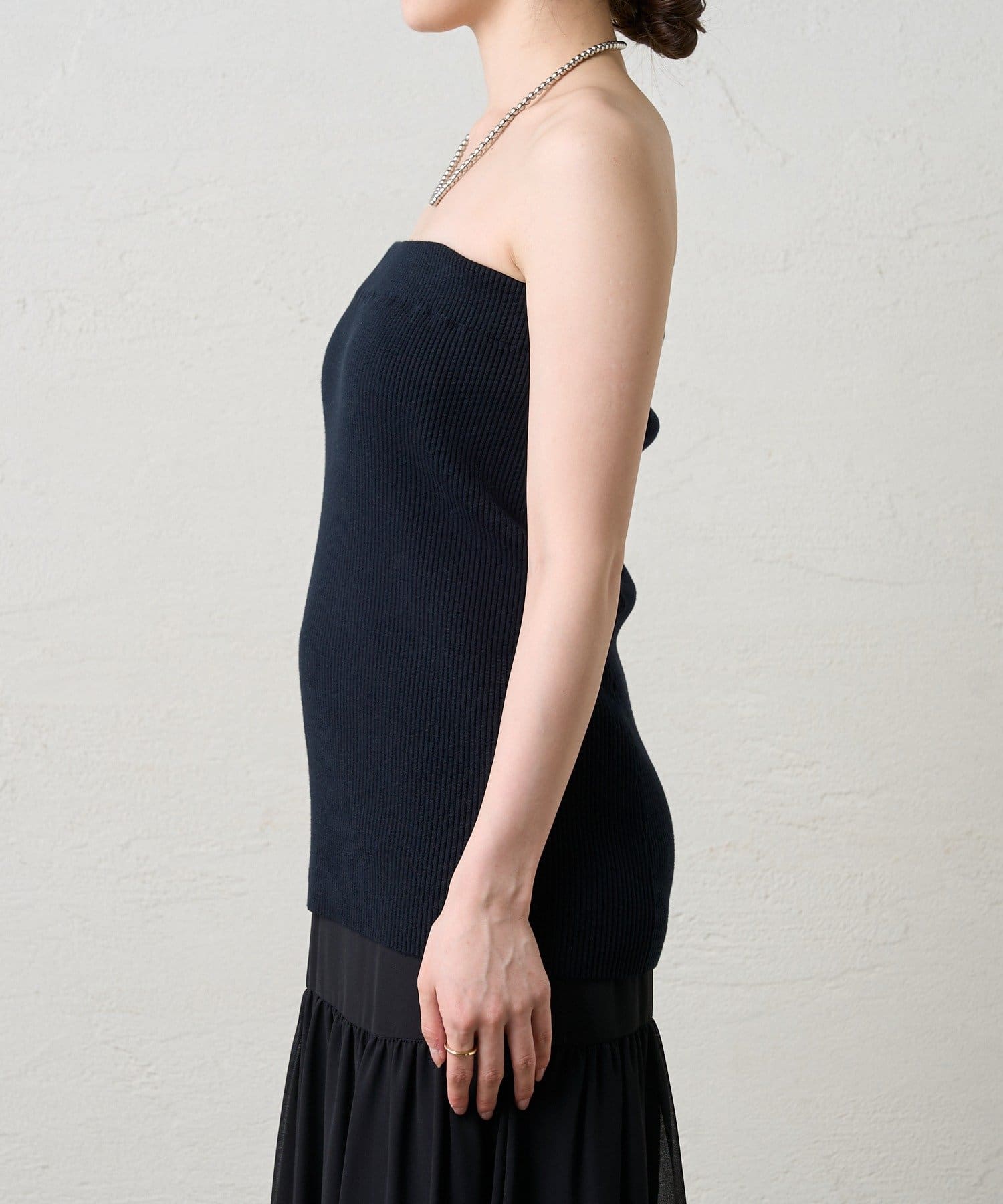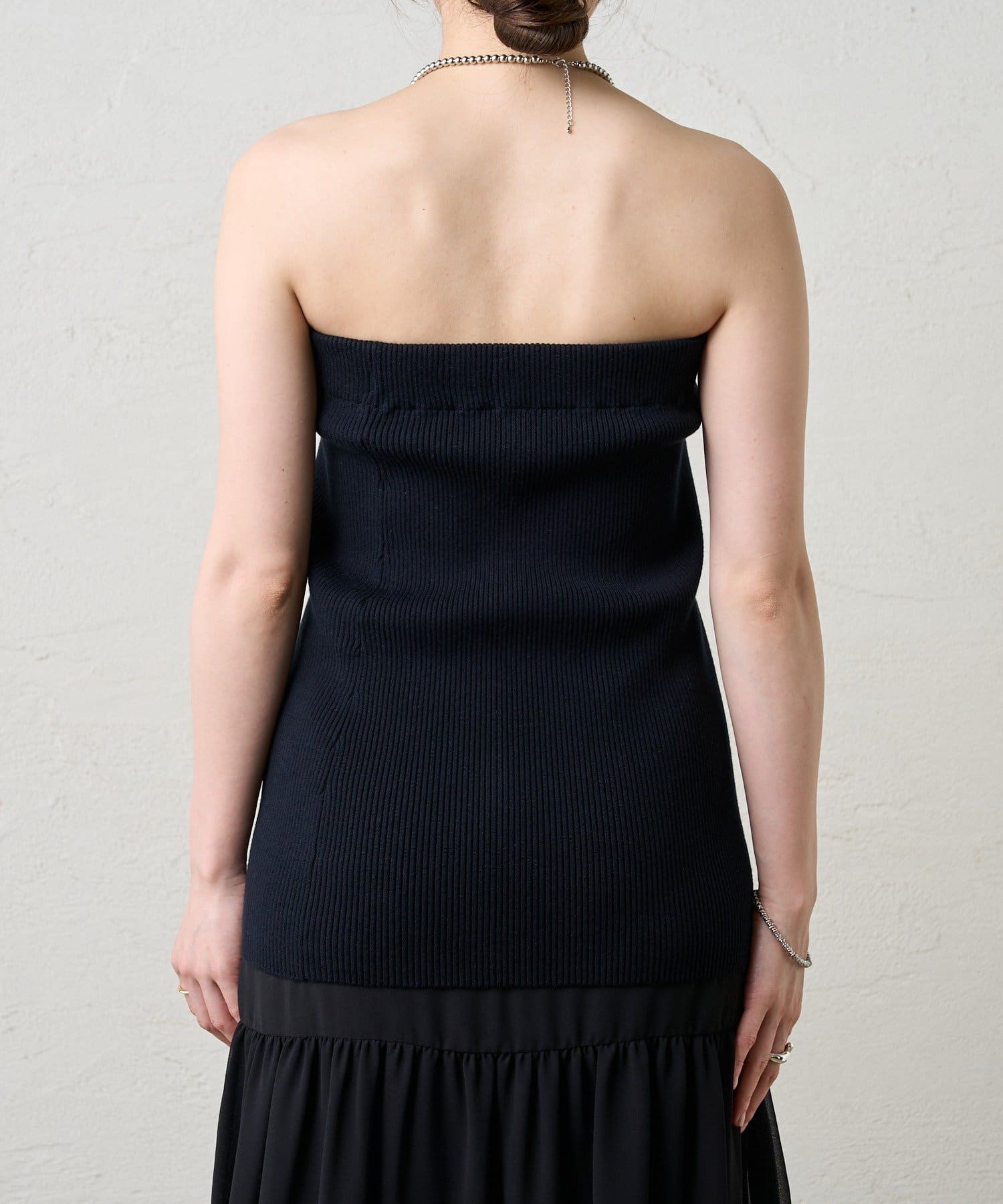 ・ニットスカートは胸元まで上げてビスチェにも。