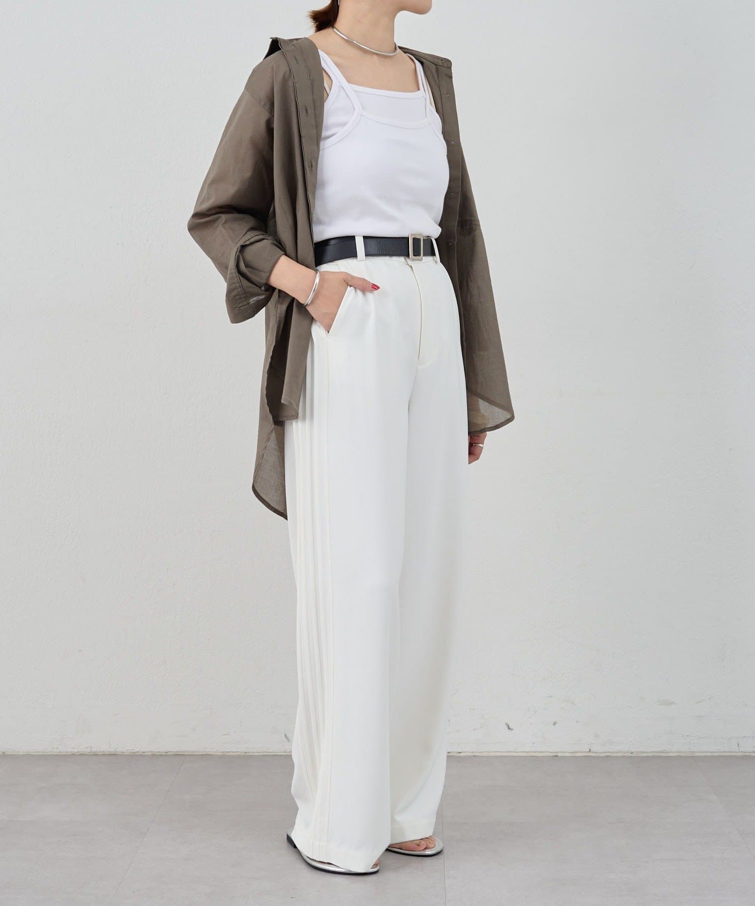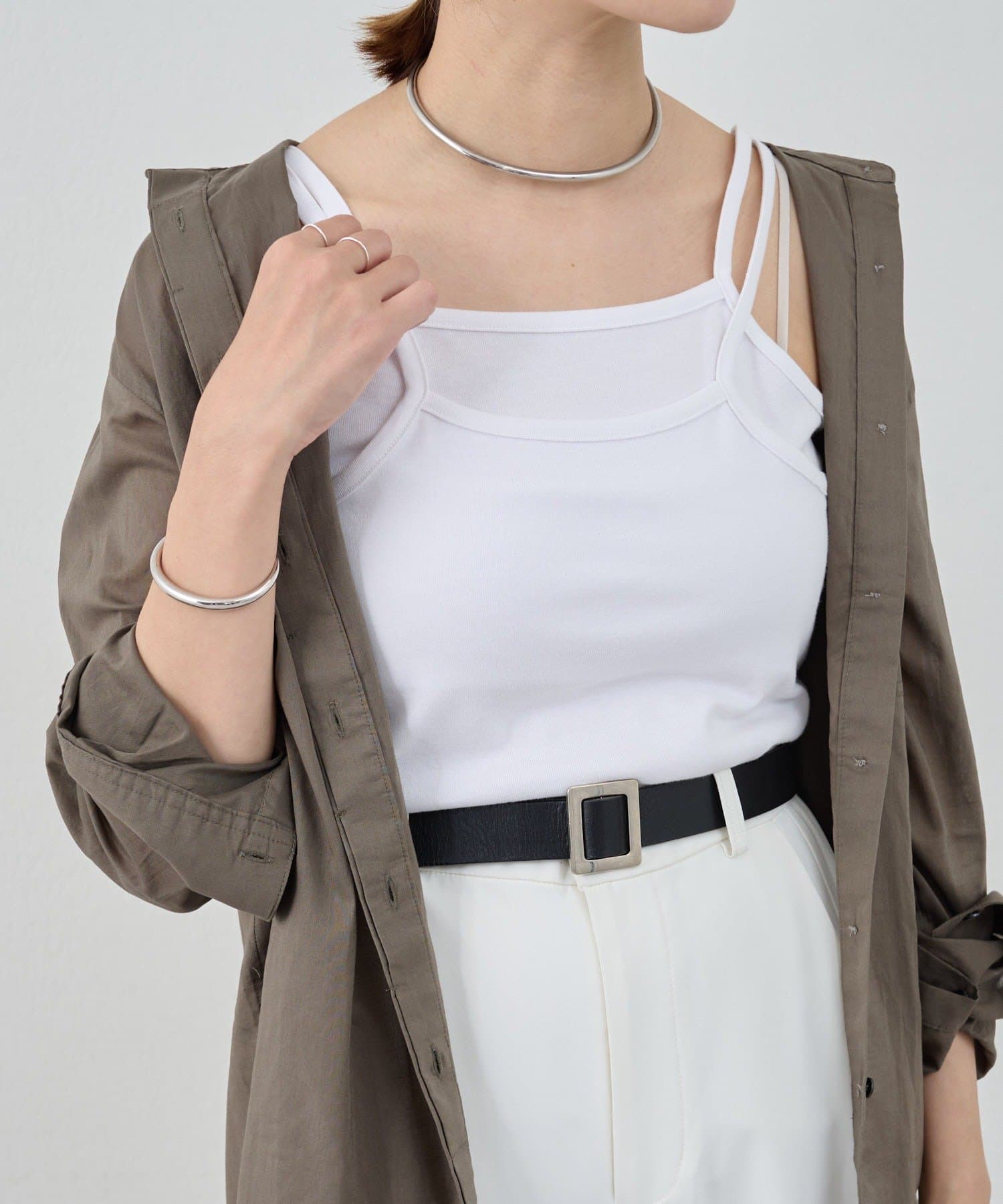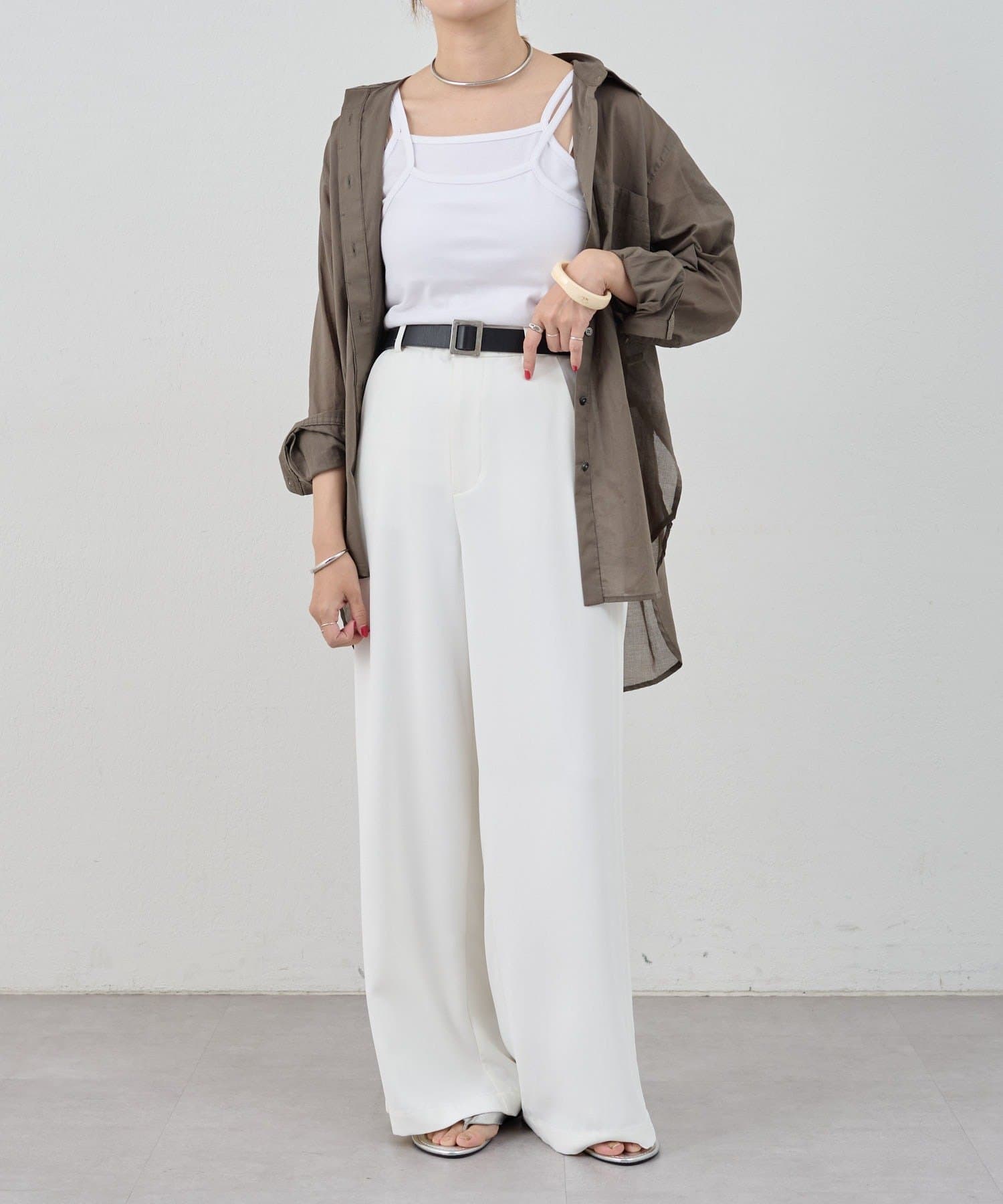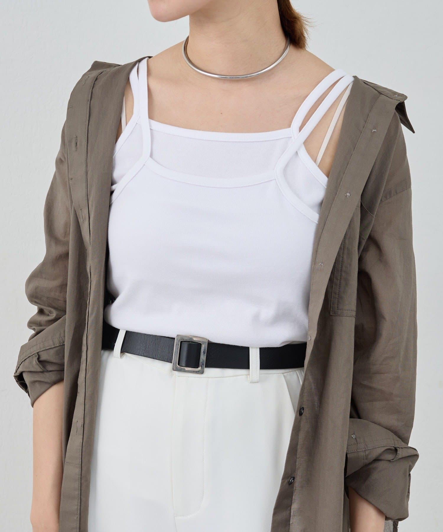 デザイン性のあるキャミソールなので、シャツやジャケットのインナーとしてはもちろん、夏はトップスとして一枚で着ても◎