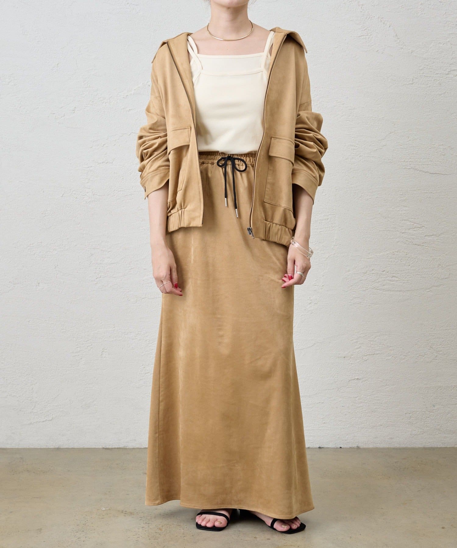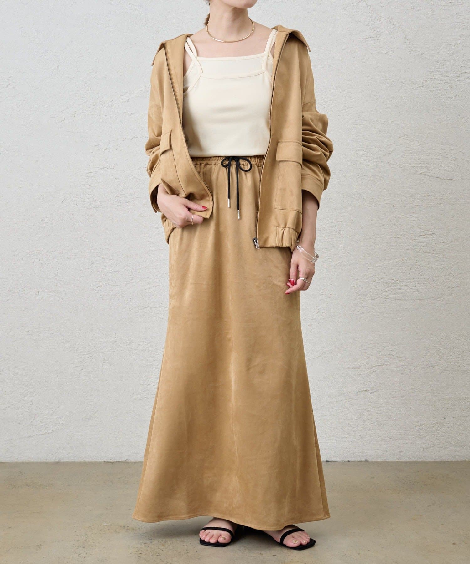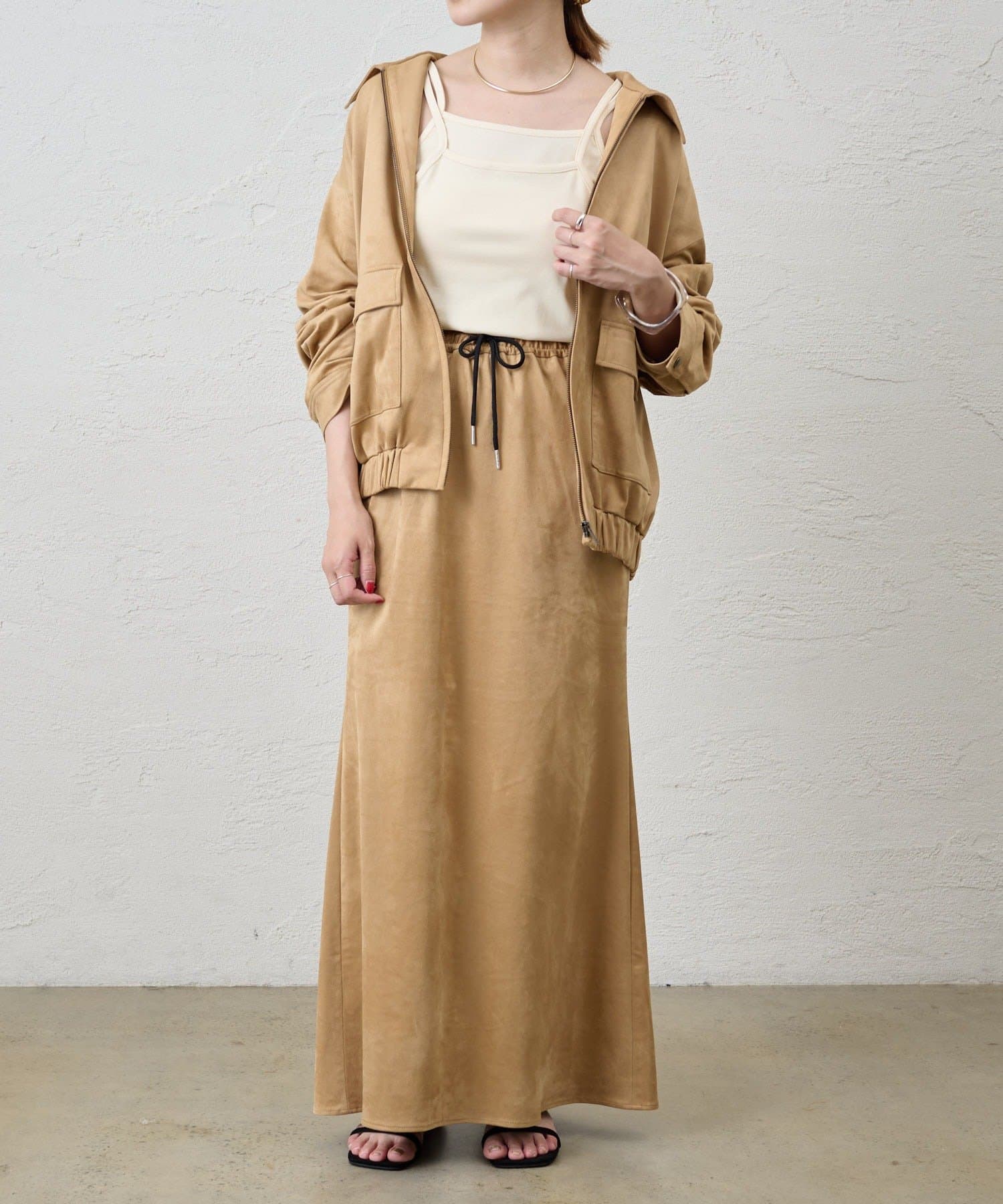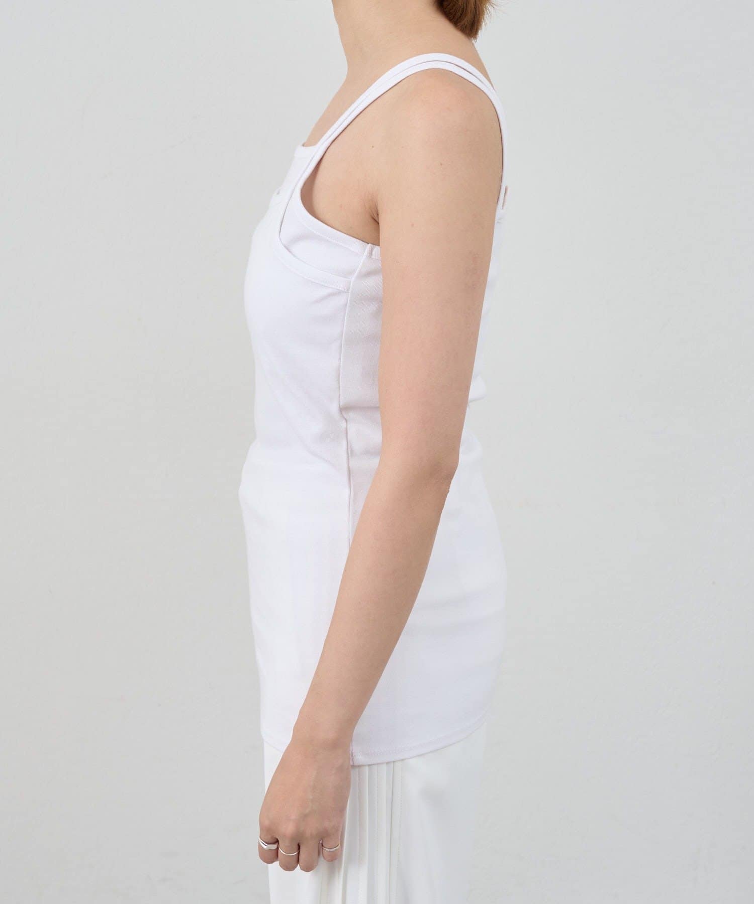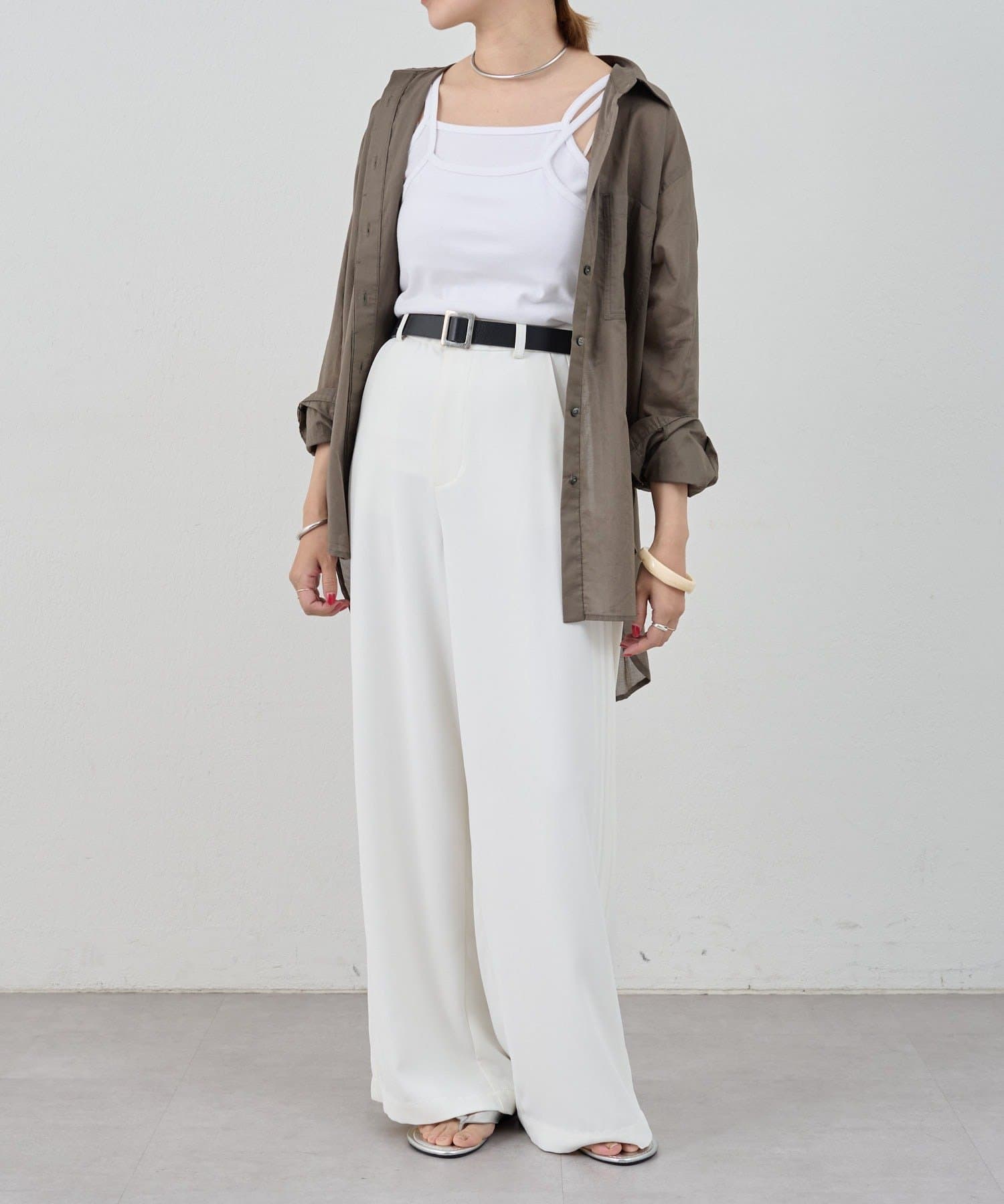 デザイン性のあるキャミソールなので、シャツやジャケットのインナーとしてはもちろん、夏はトップスとして一枚で着ても◎