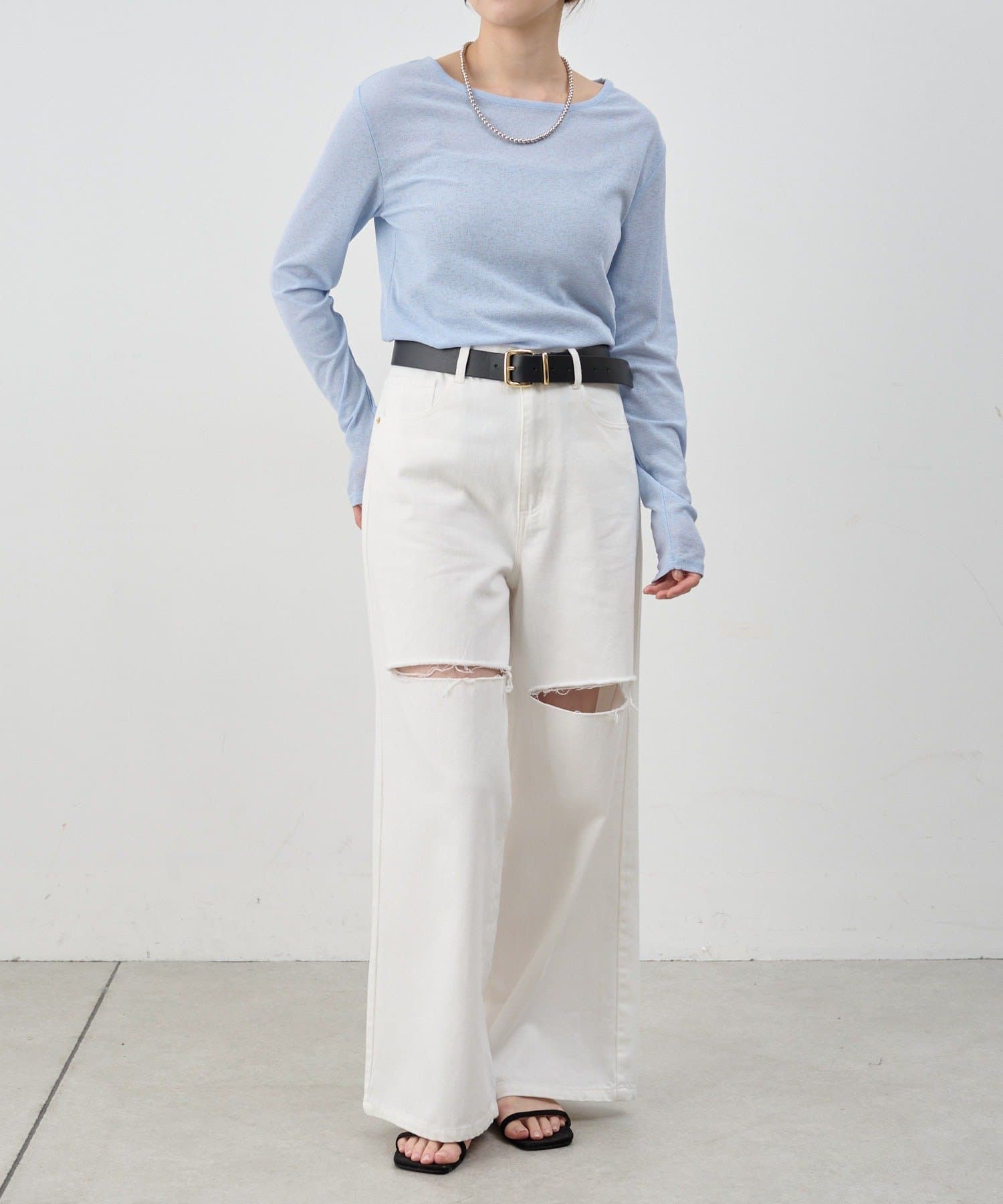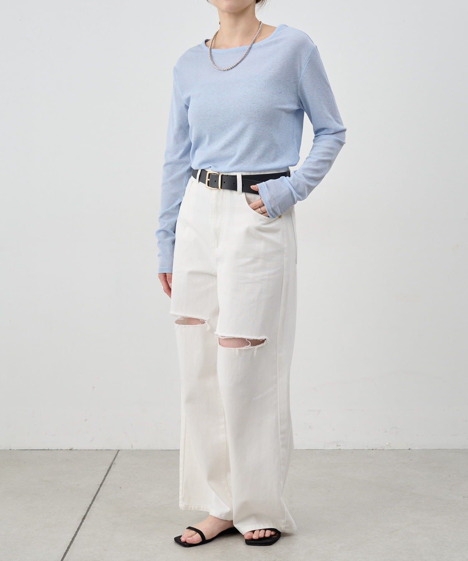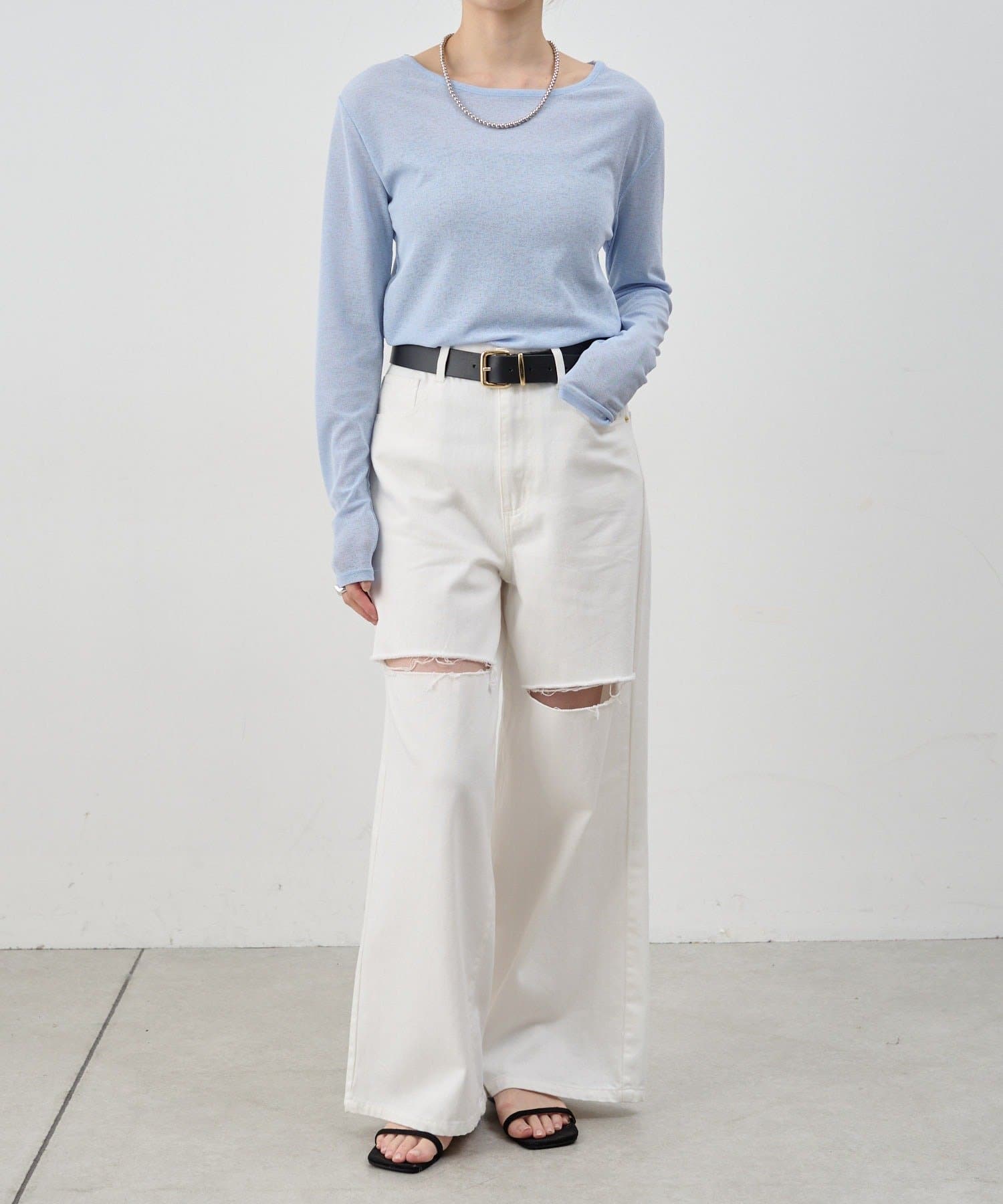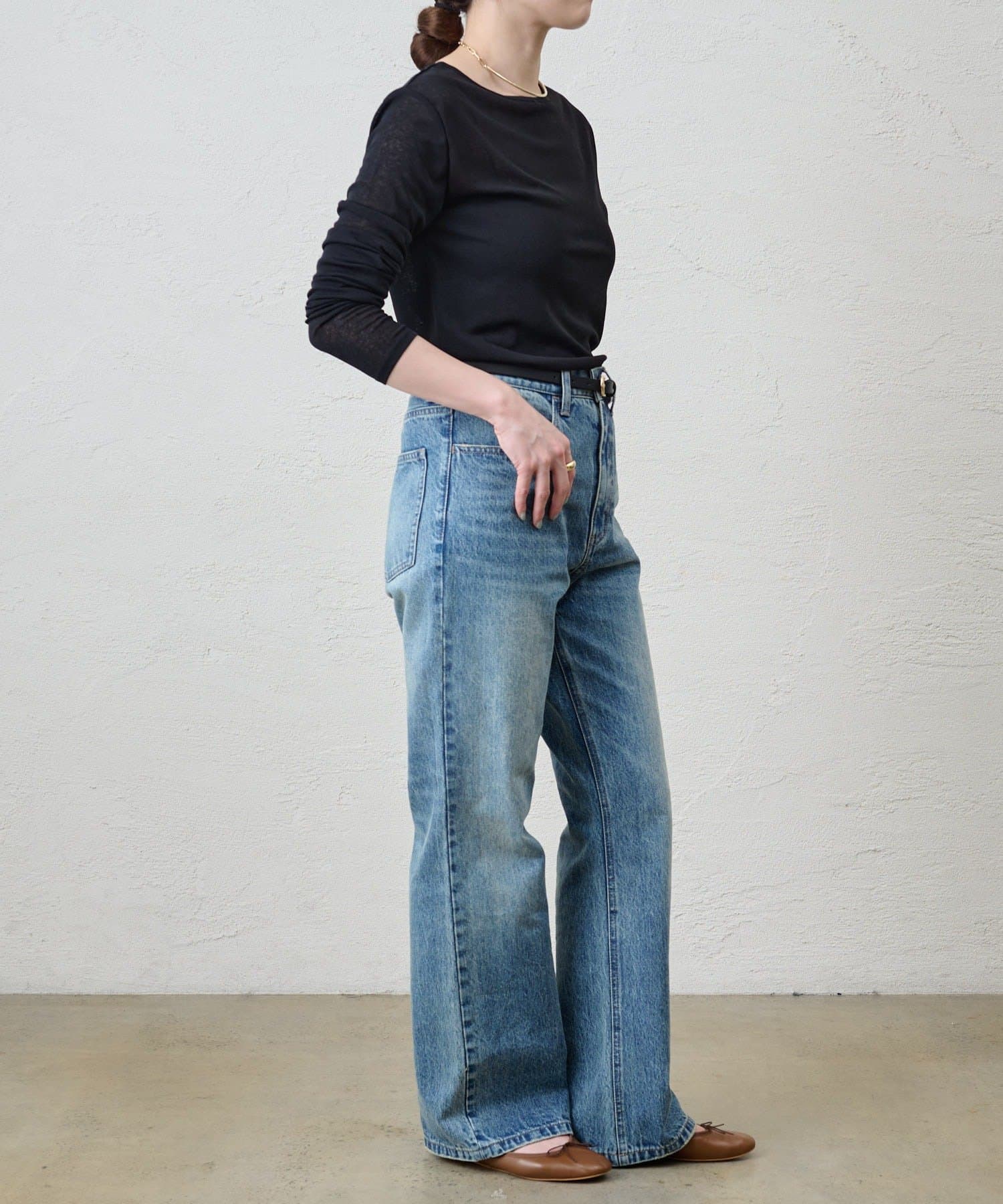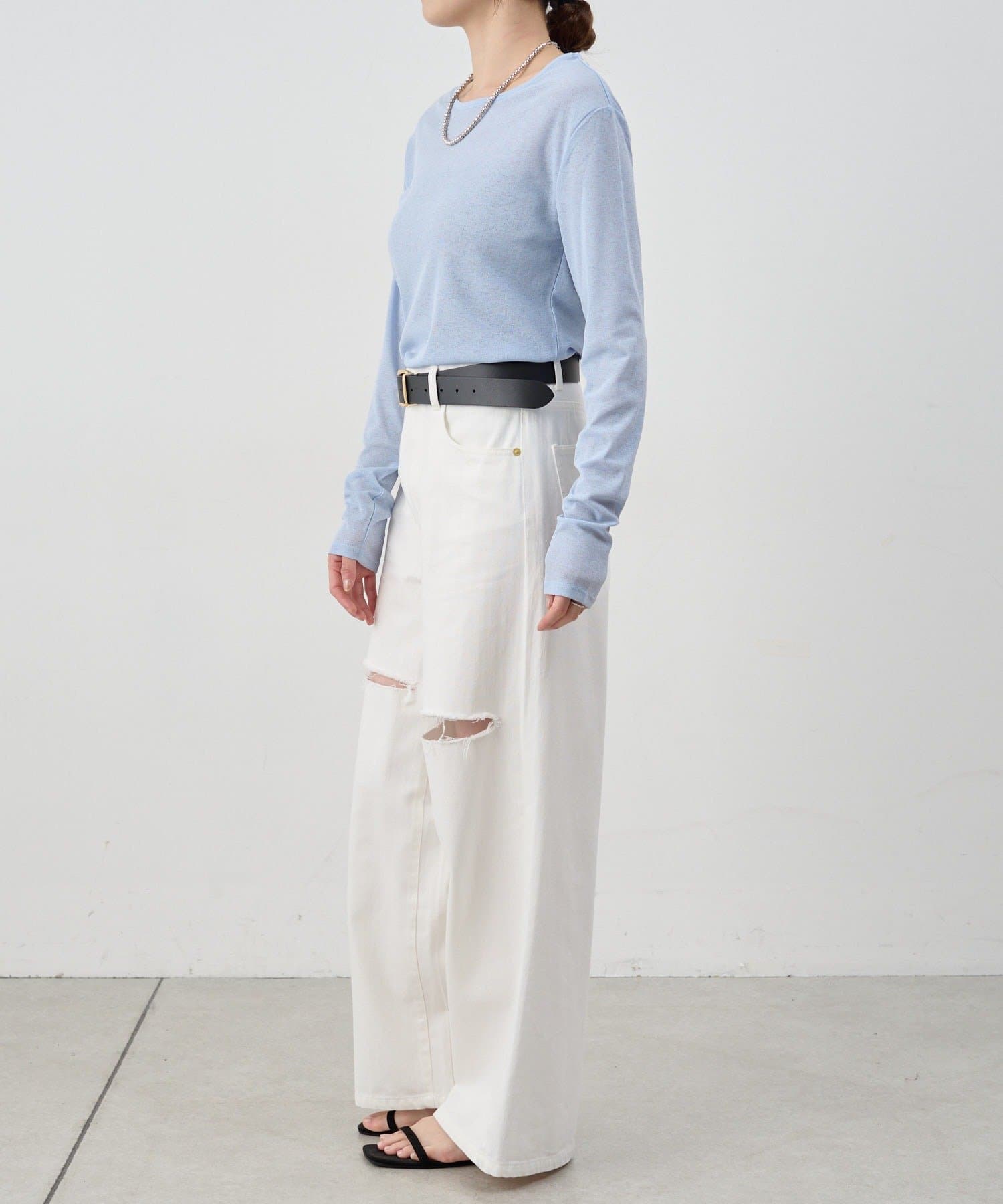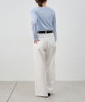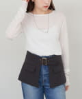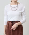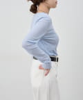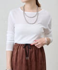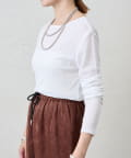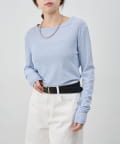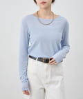 つまり過ぎないクルーネックはデコルテがきれいに見え、合わせやすいデザイン。