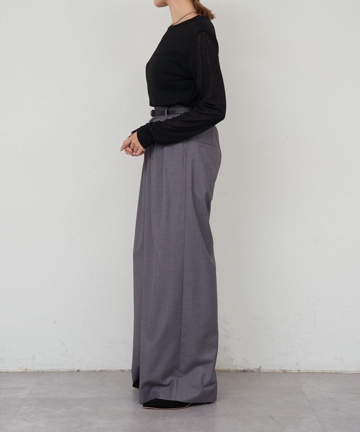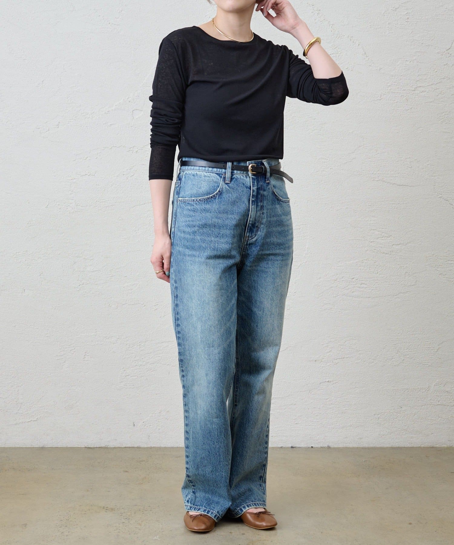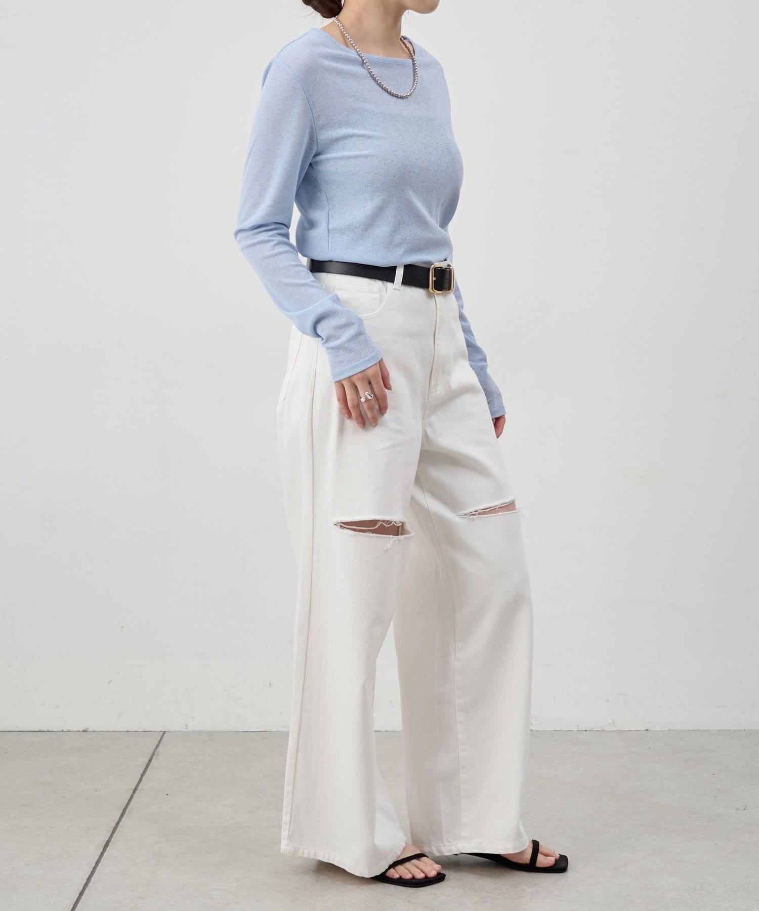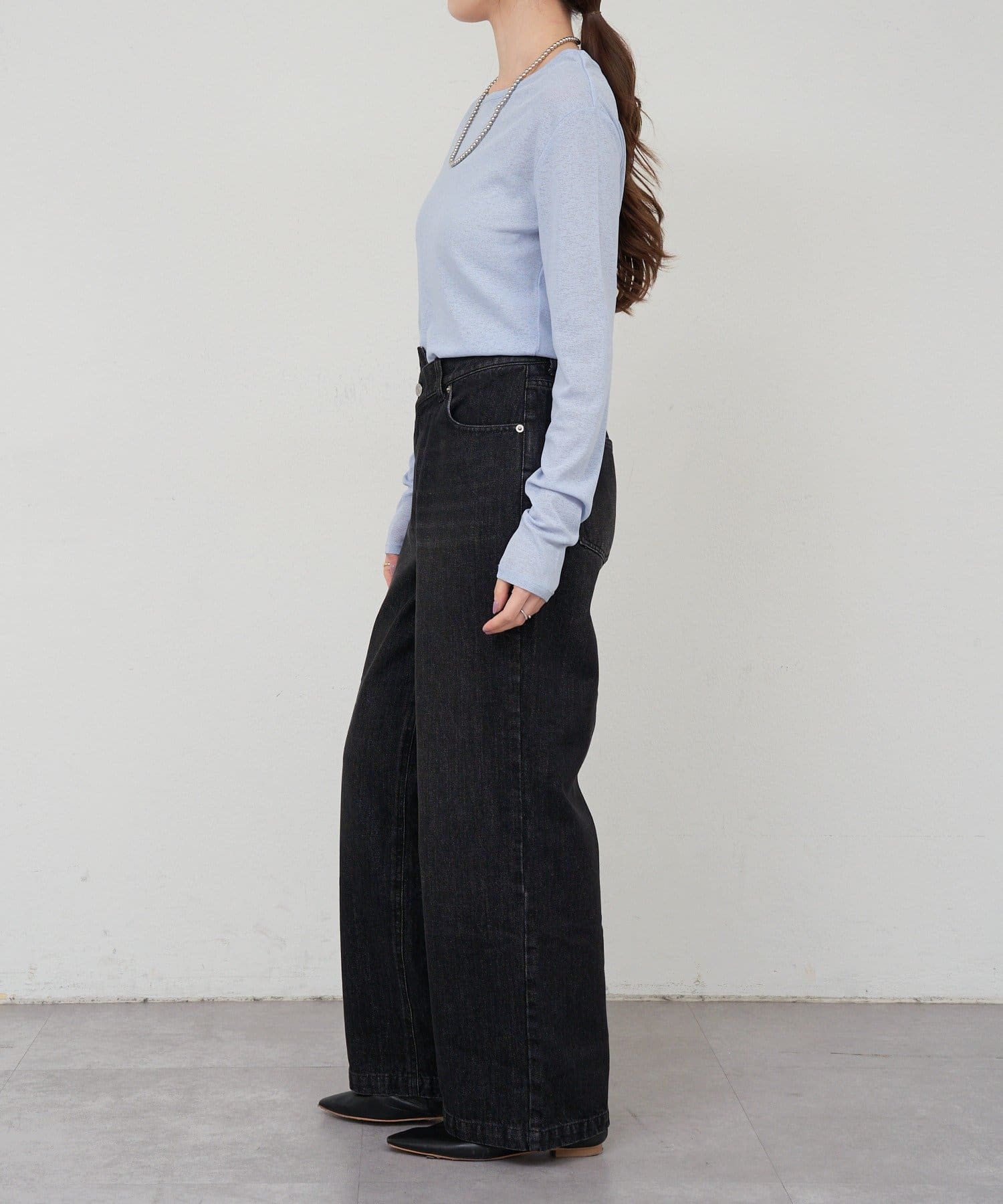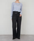 つまり過ぎないクルーネックはデコルテがきれいに見え、合わせやすいデザイン。