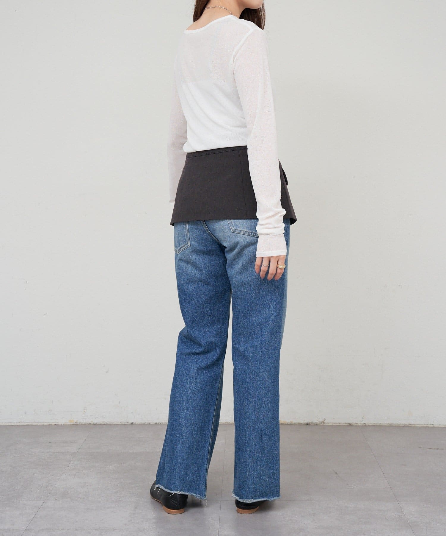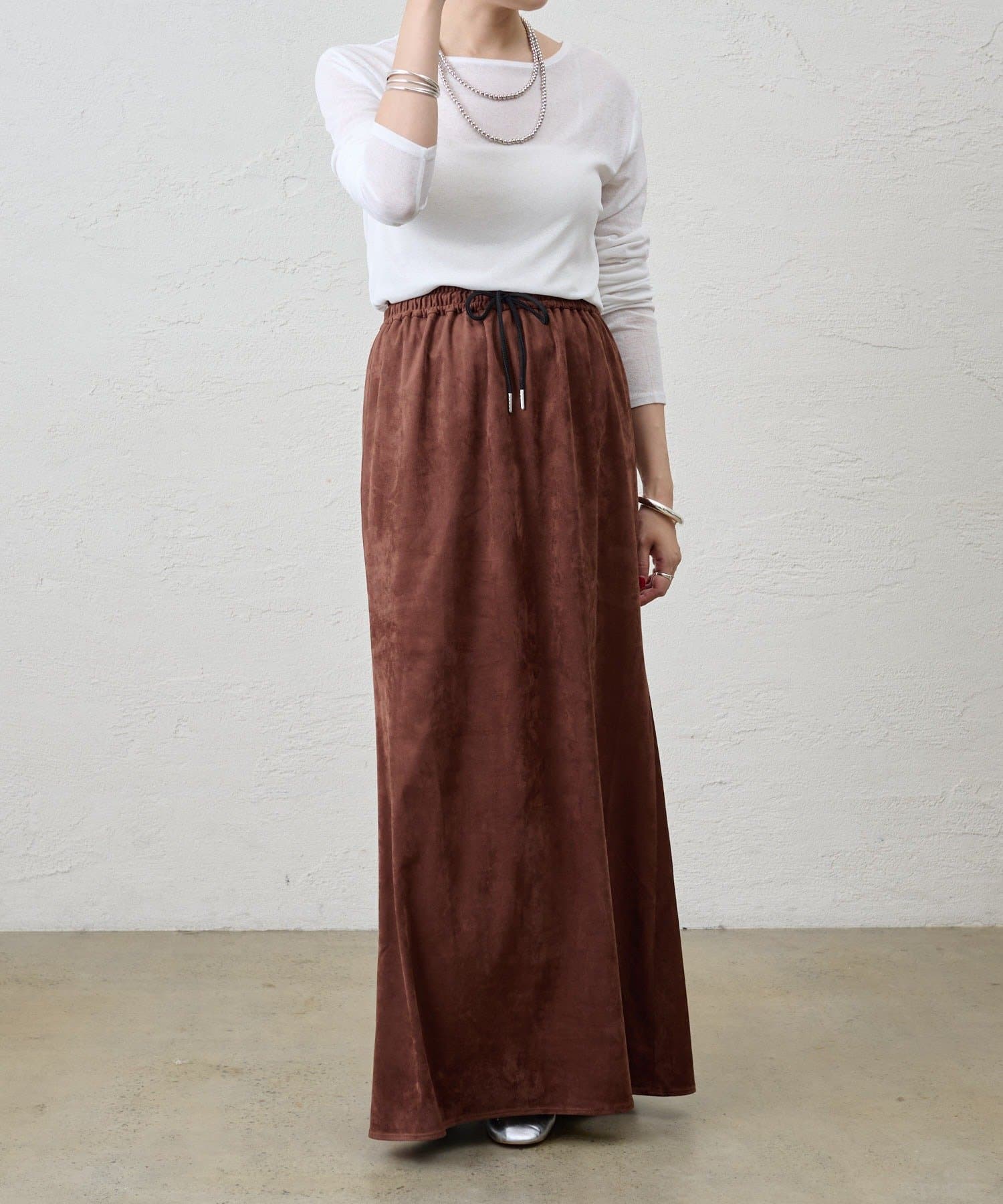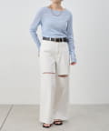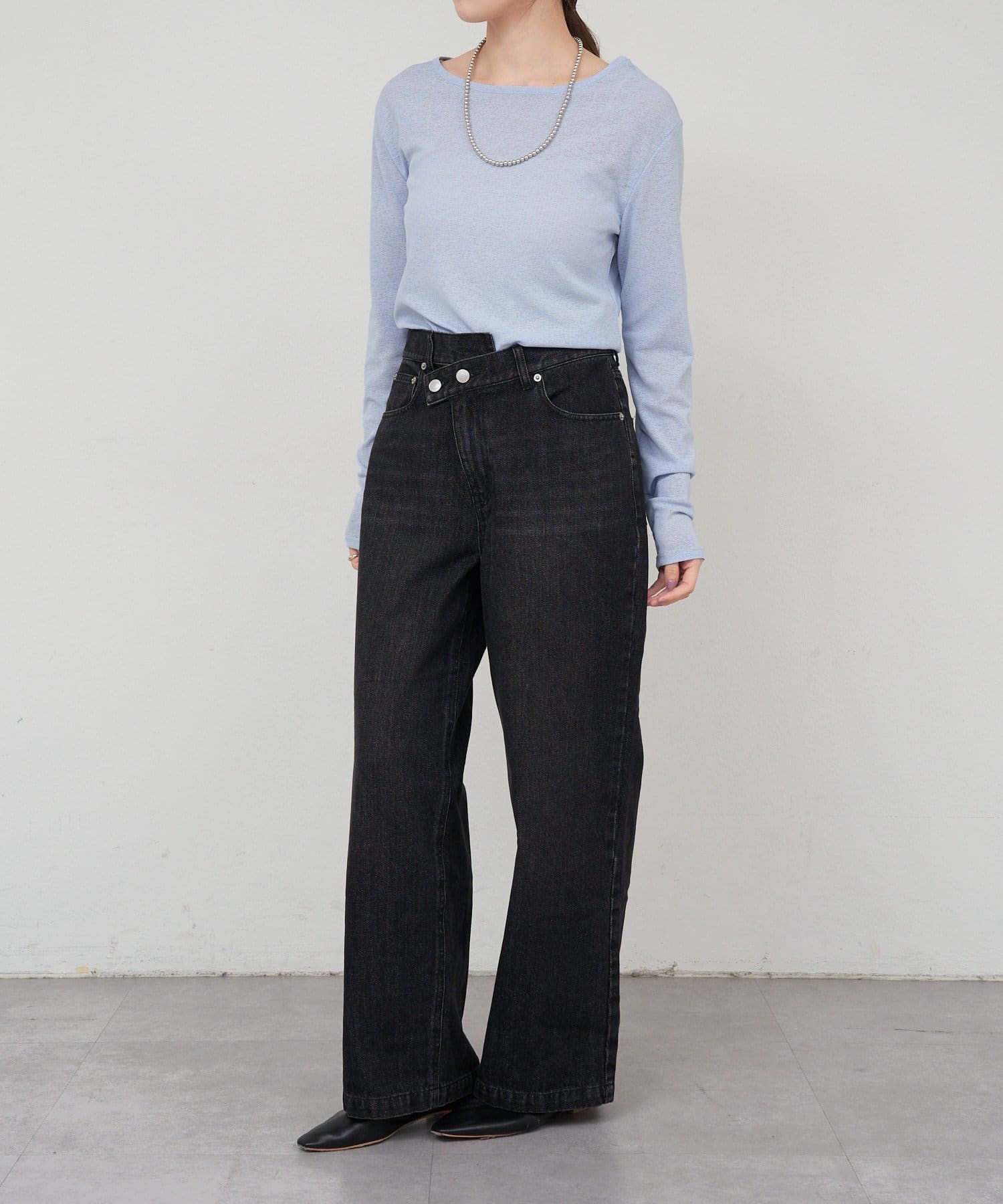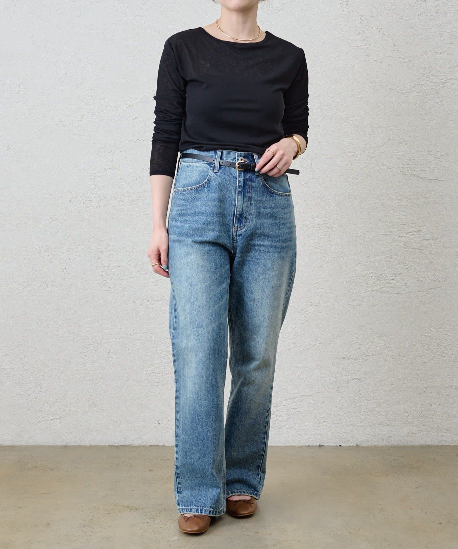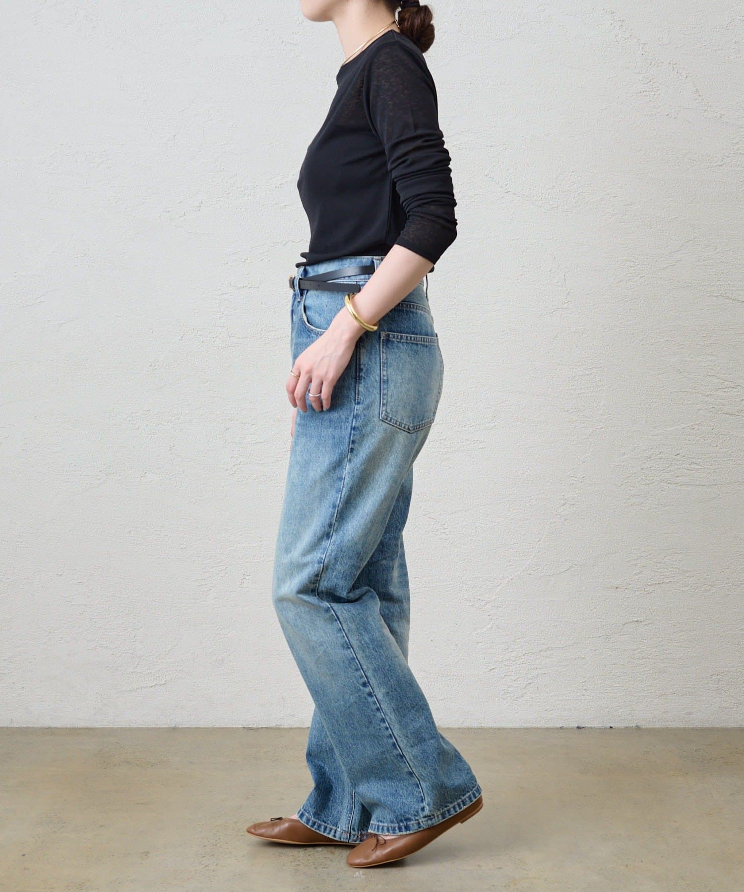 つまり過ぎないクルーネックはデコルテがきれいに見え、合わせやすいデザイン。