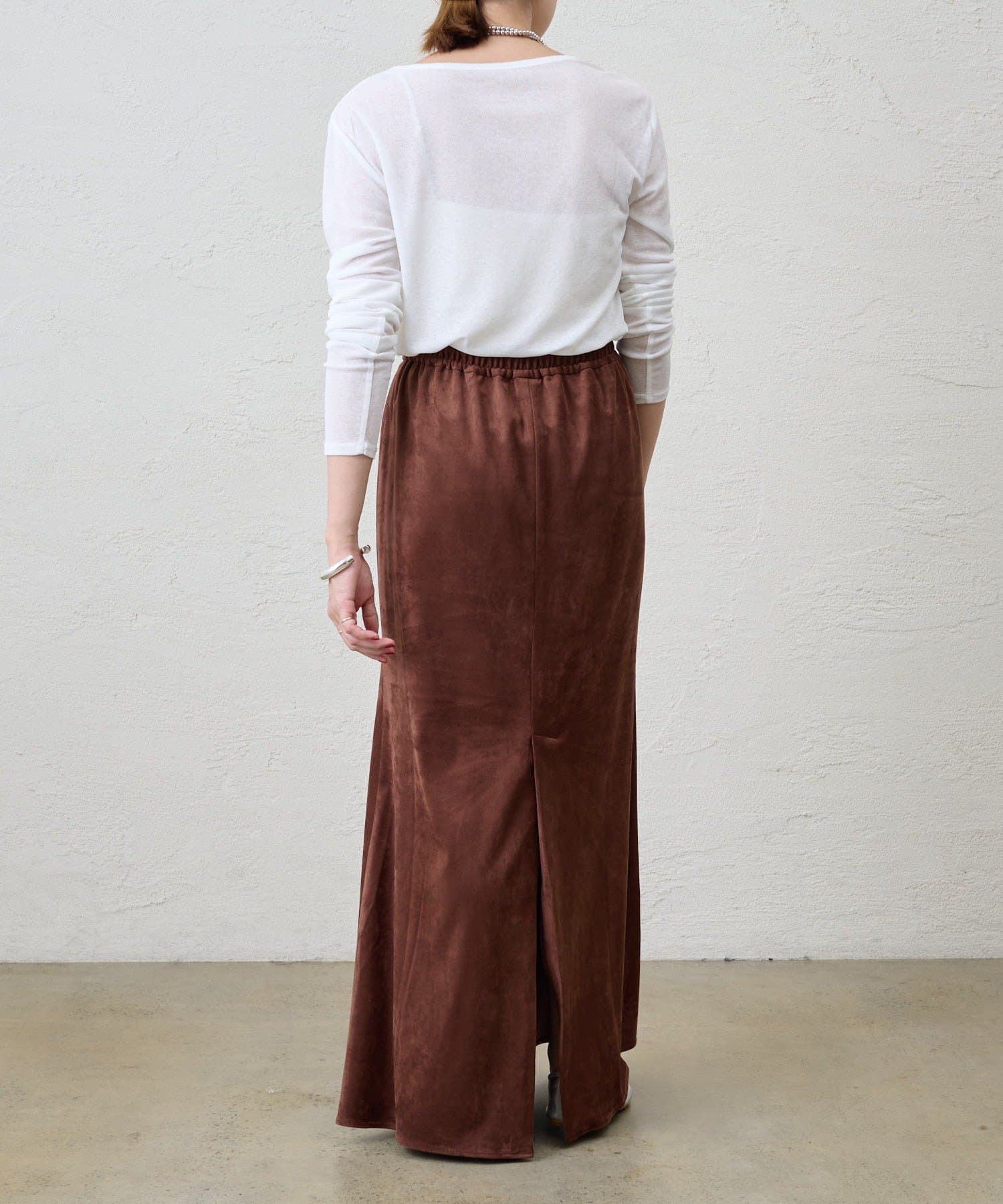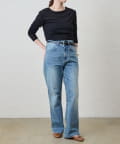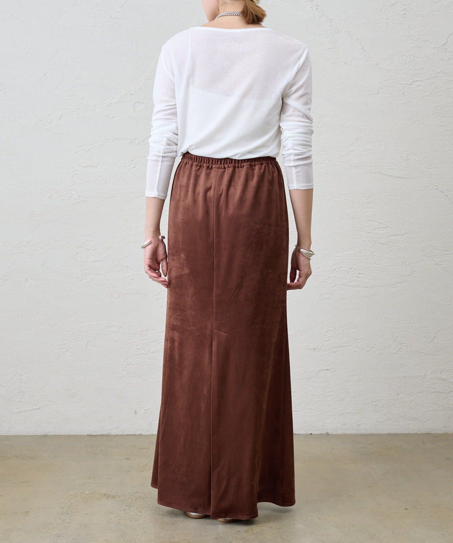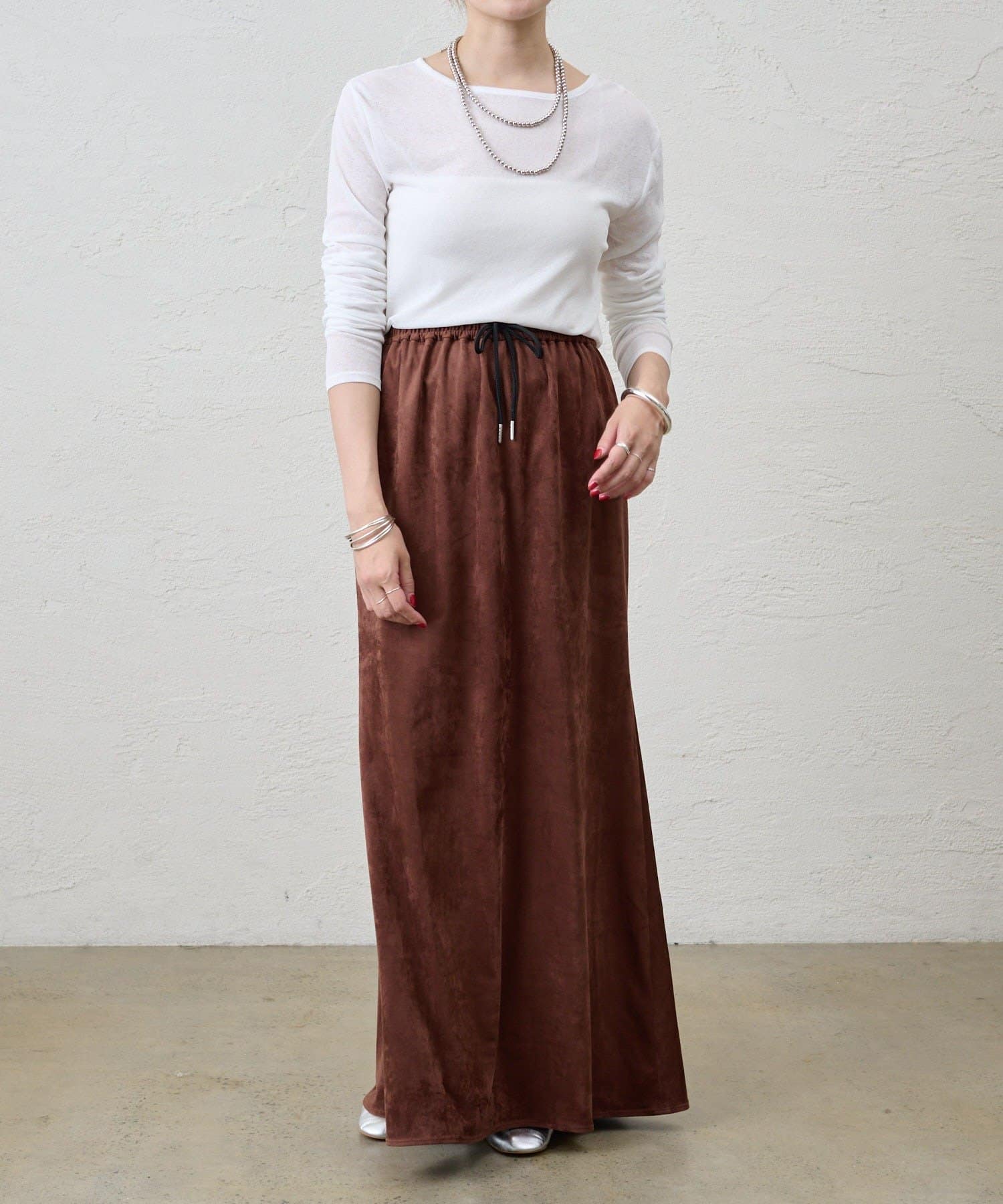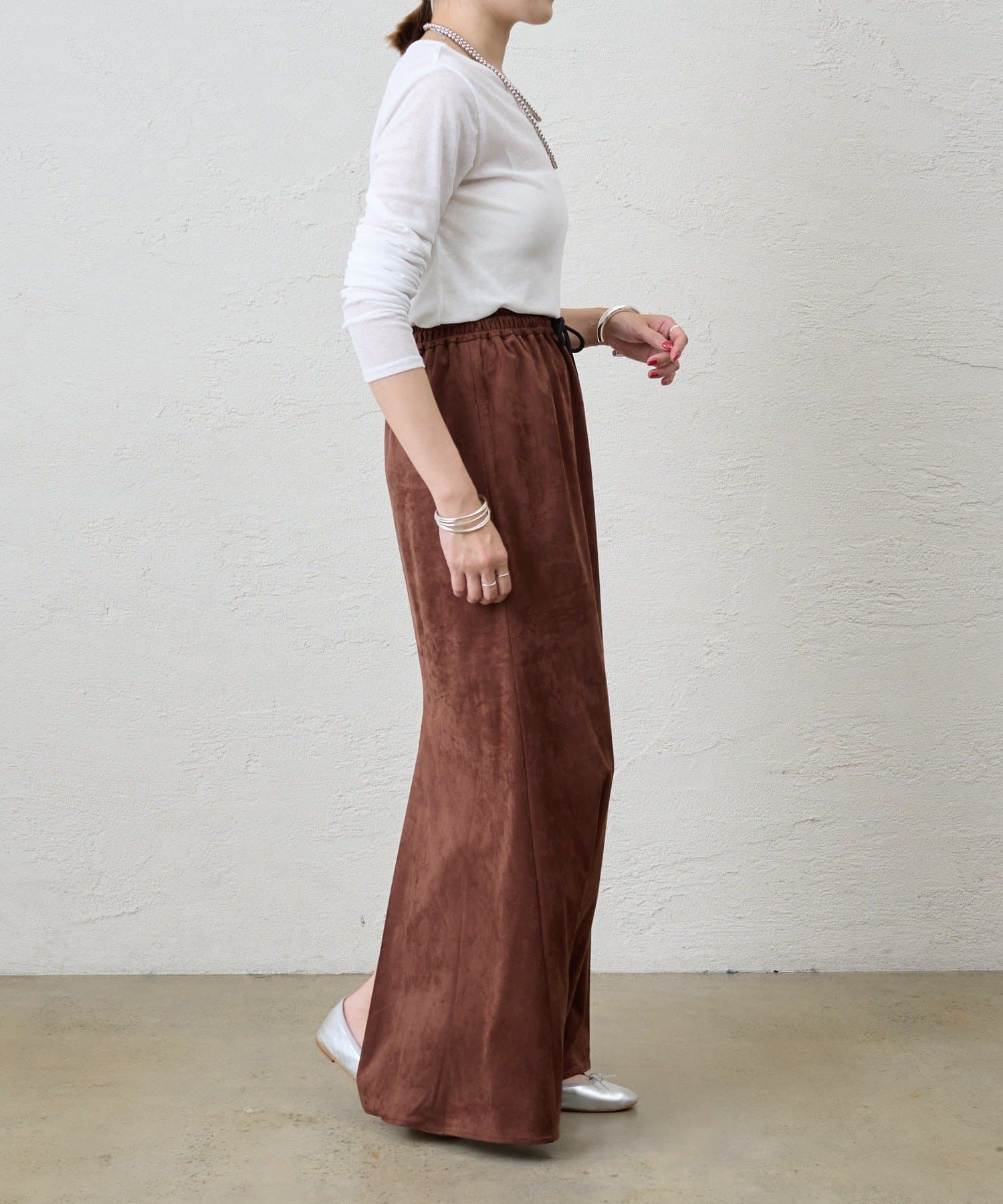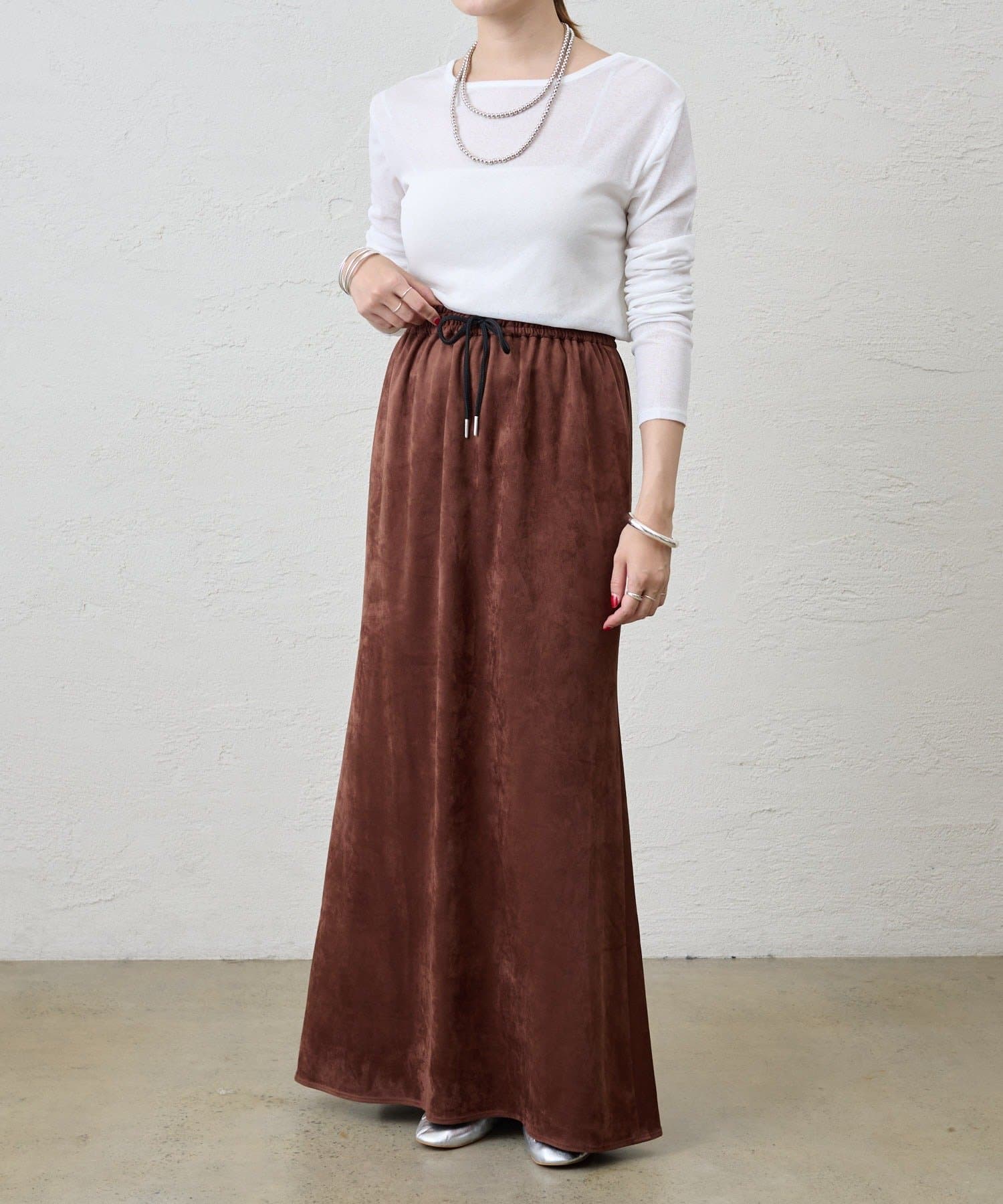 つまり過ぎないクルーネックはデコルテがきれいに見え、合わせやすいデザイン。