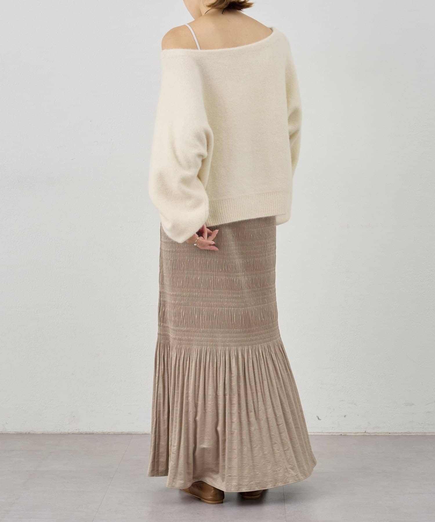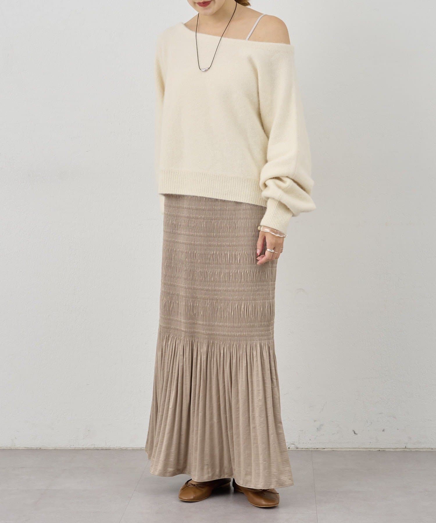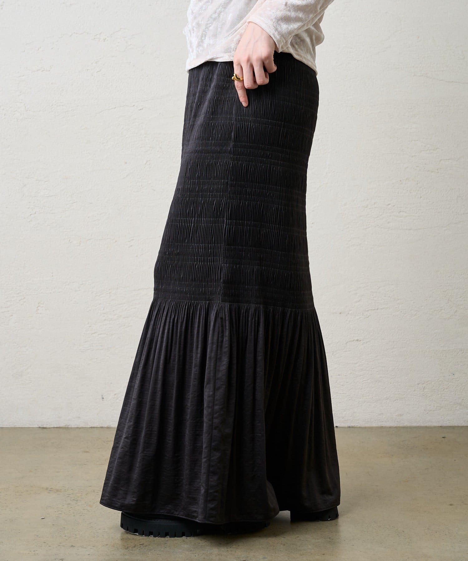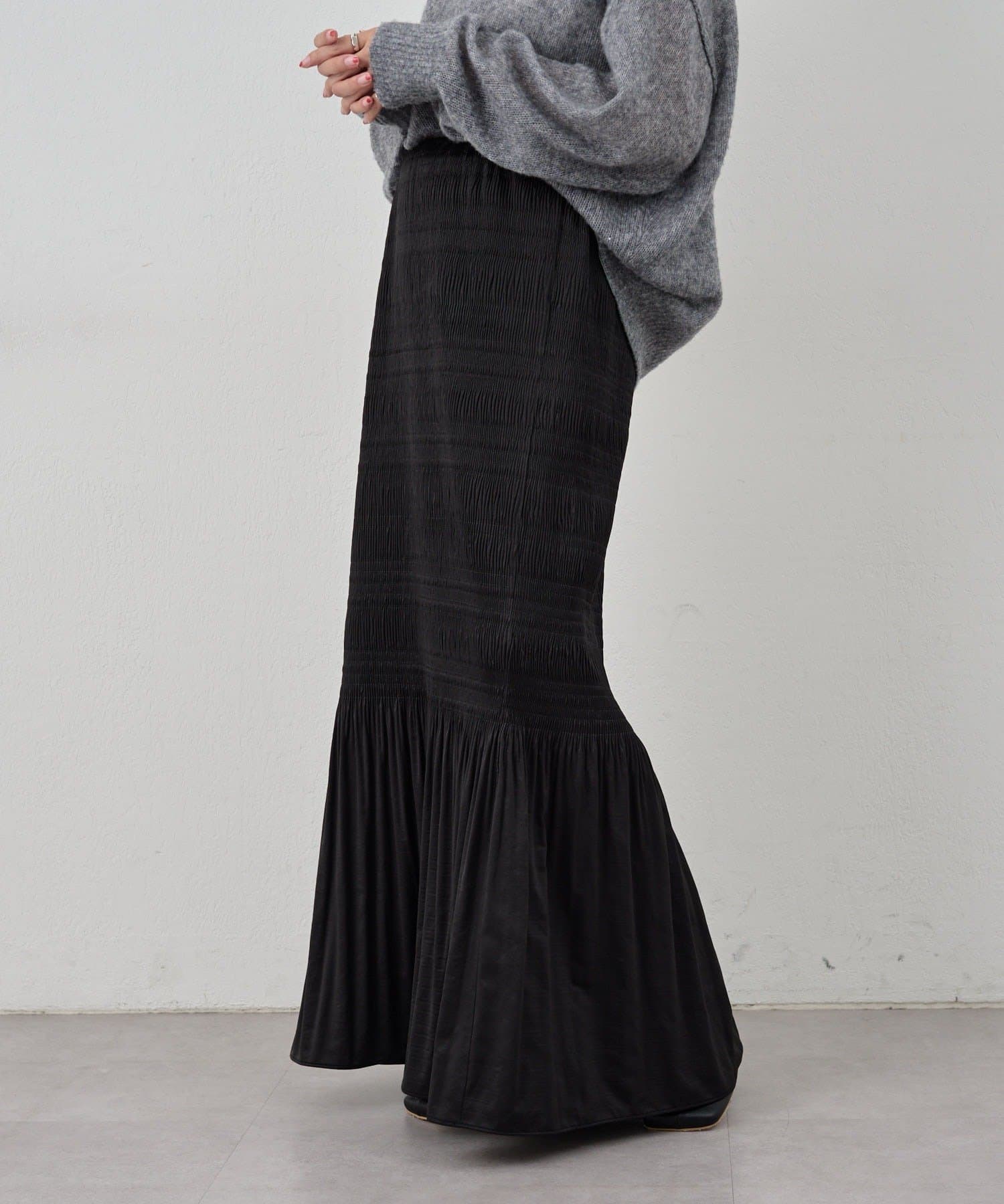 マーメイドスカートが定番でしたが、AWは細かいプリーツにしコーディネートにメリハリがでるようにしております。