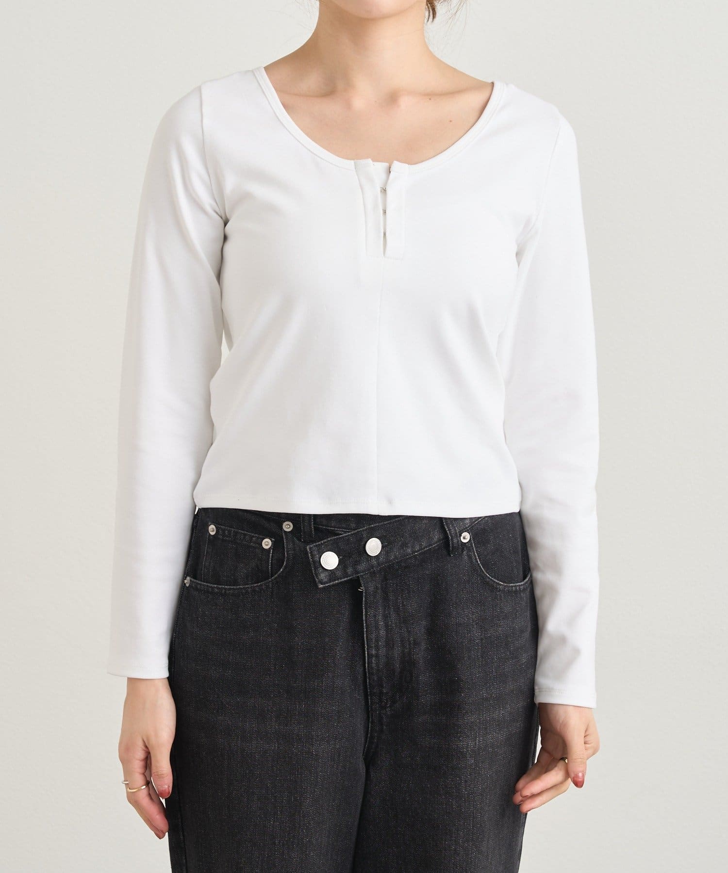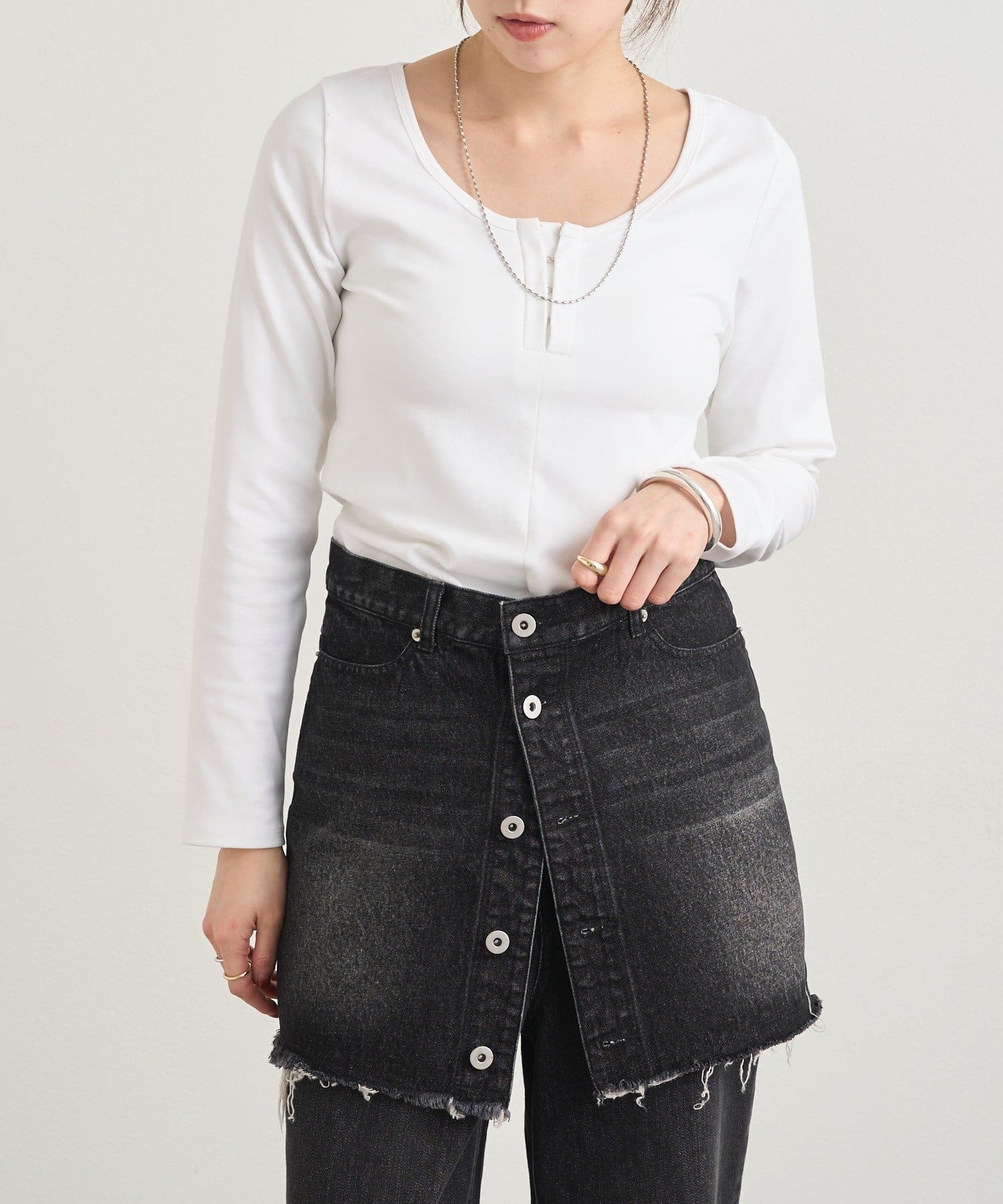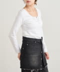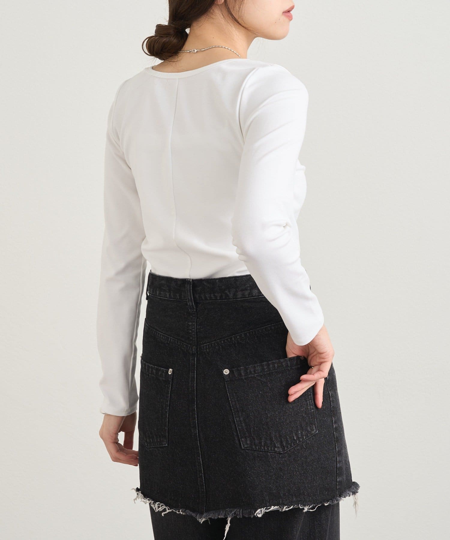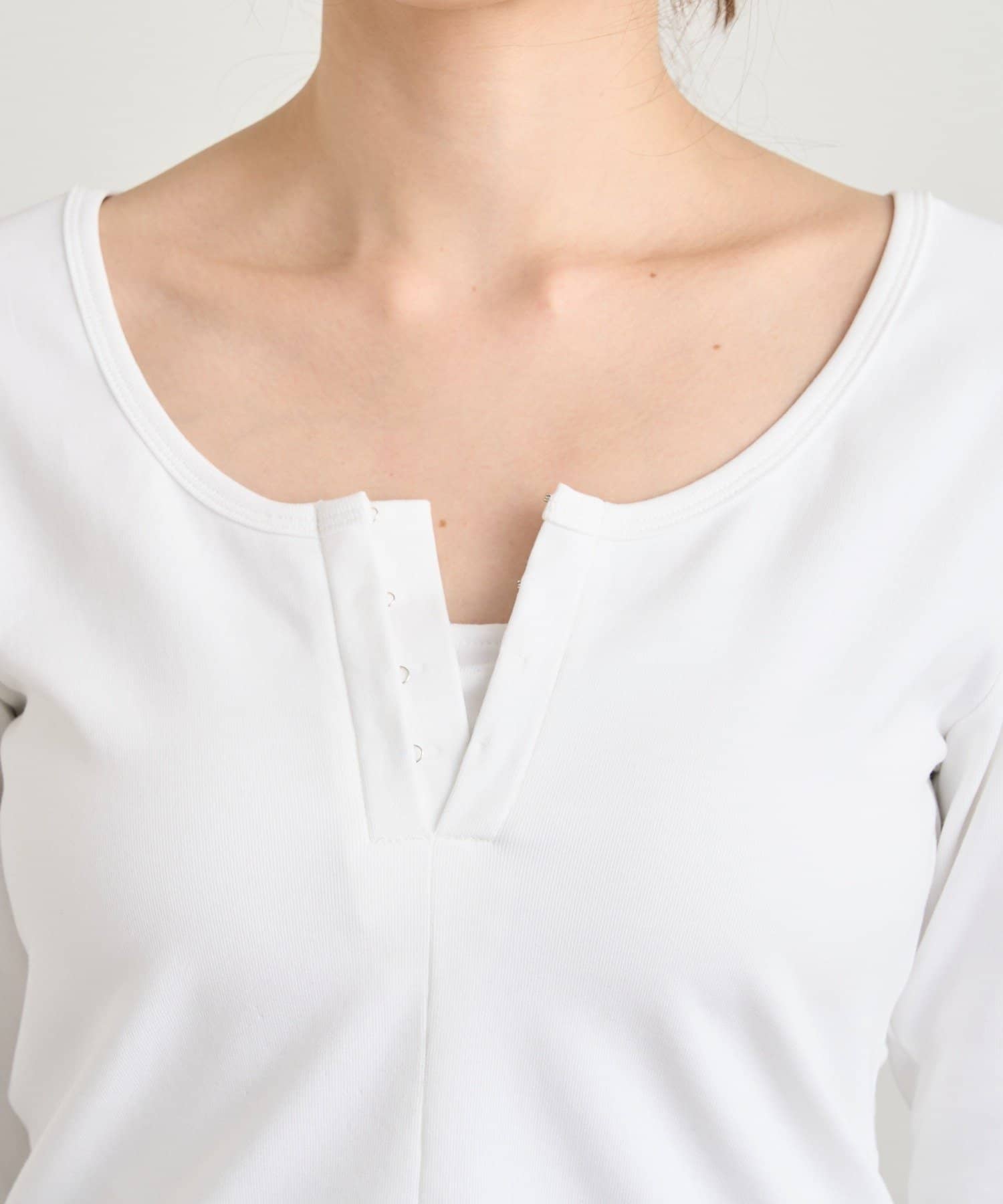 フロントのホックがアクセントになり、カジュアルな中にも大人っぽい雰囲気をプラスしてくれます。