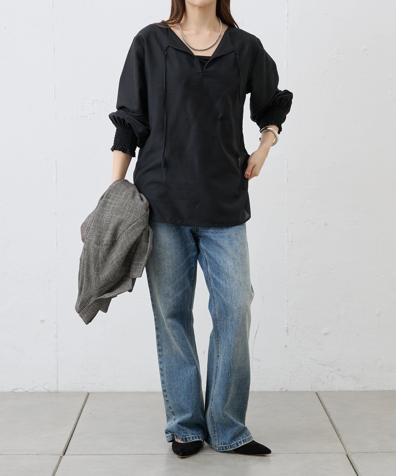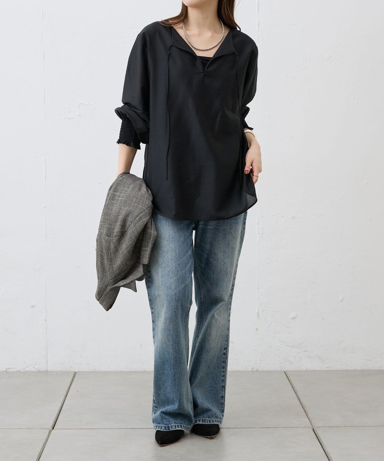 Vネックの一番上をリボンにし、より抜け感を演出。